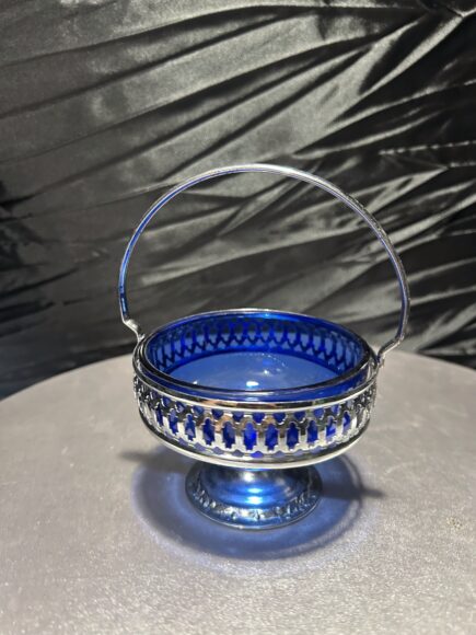 Cukiernica z niebieskiego szkła w srebrnym ażurowym stelażu – styl vintage – 15 cm