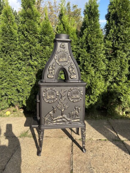 Piec żeliwny Jotul Kvarner Ovnstøperi – monumentalny model z płaskorzeźbą wiewiórek
