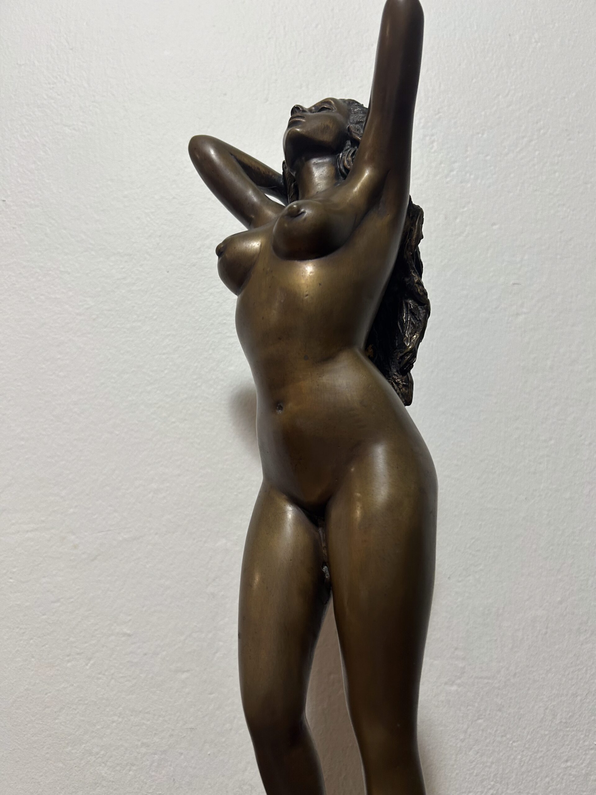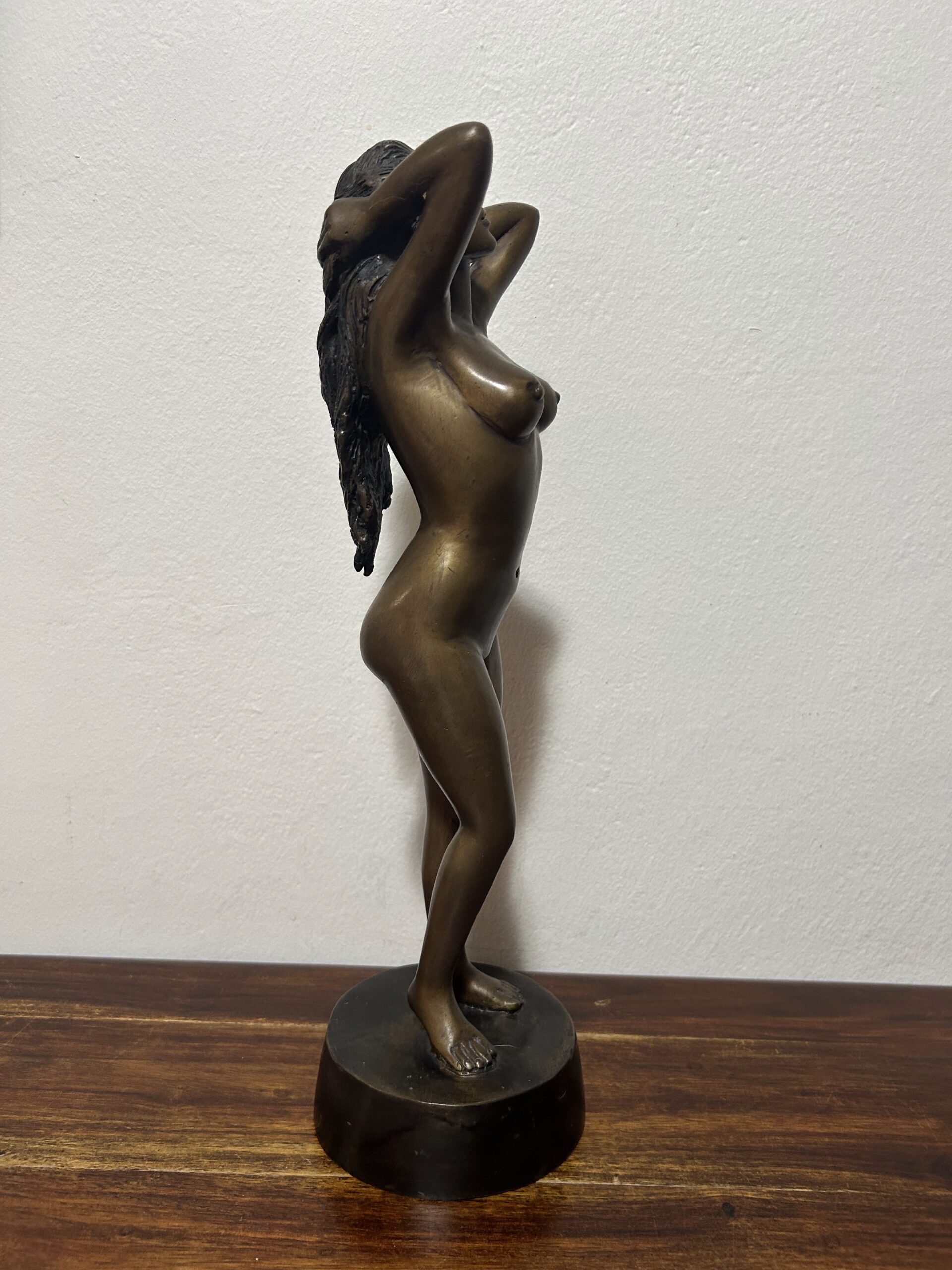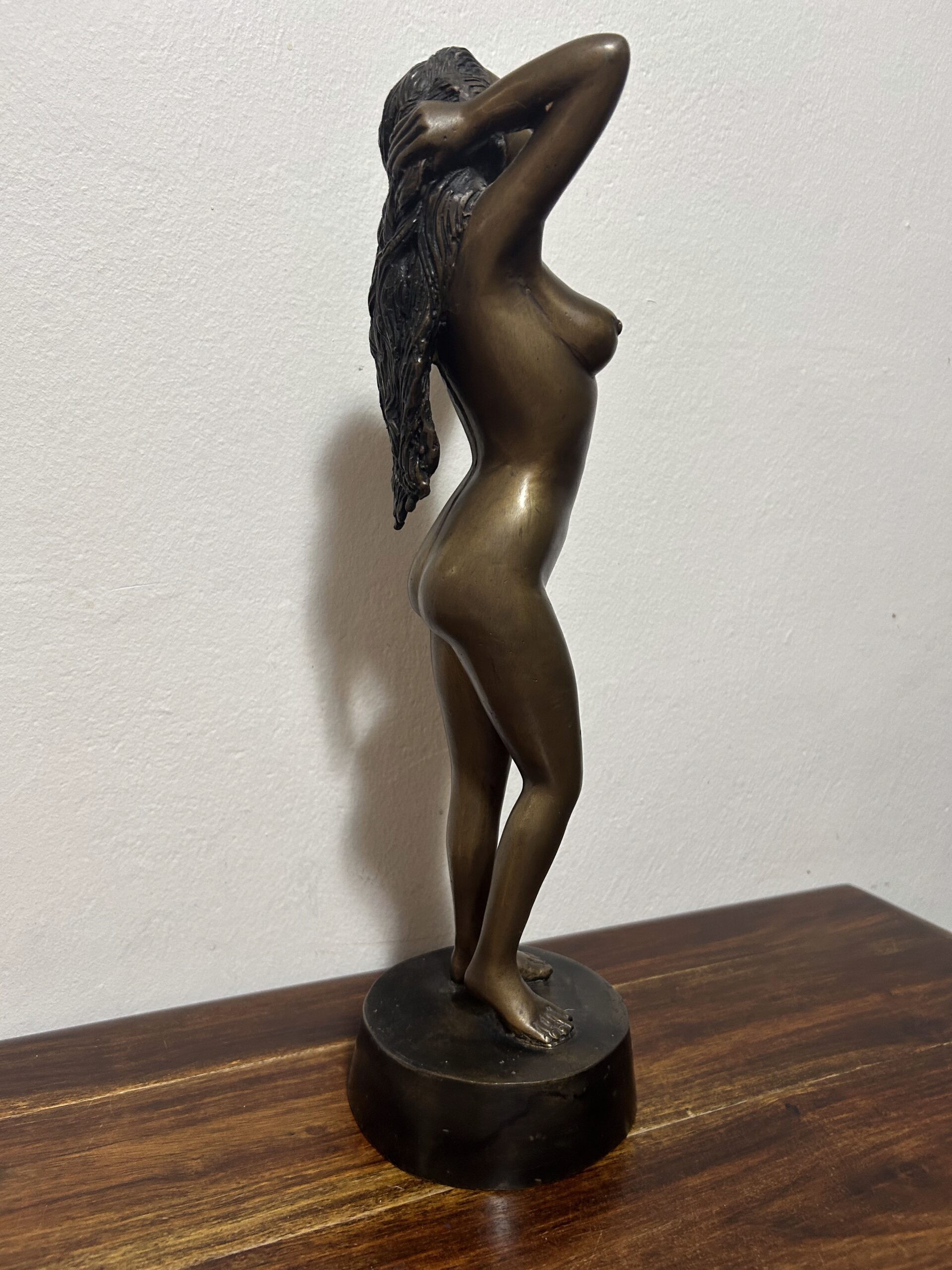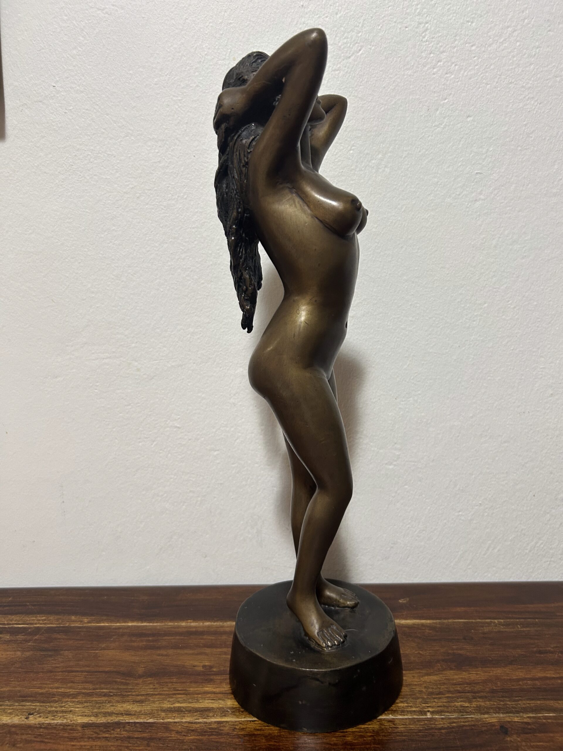Piękna i wyjątkowa rzeźba z brązu przedstawiająca nagą kobietę, będąca hołdem dla klasycznego piękna i wyrafinowanego kunsztu artystycznego. Według informacji od poprzedniego właściciela dzieło ma ponad 100 lat, co czyni je nie tylko dekoracyjnym przedmiotem, ale także cennym zabytkiem o historycznym znaczeniu.