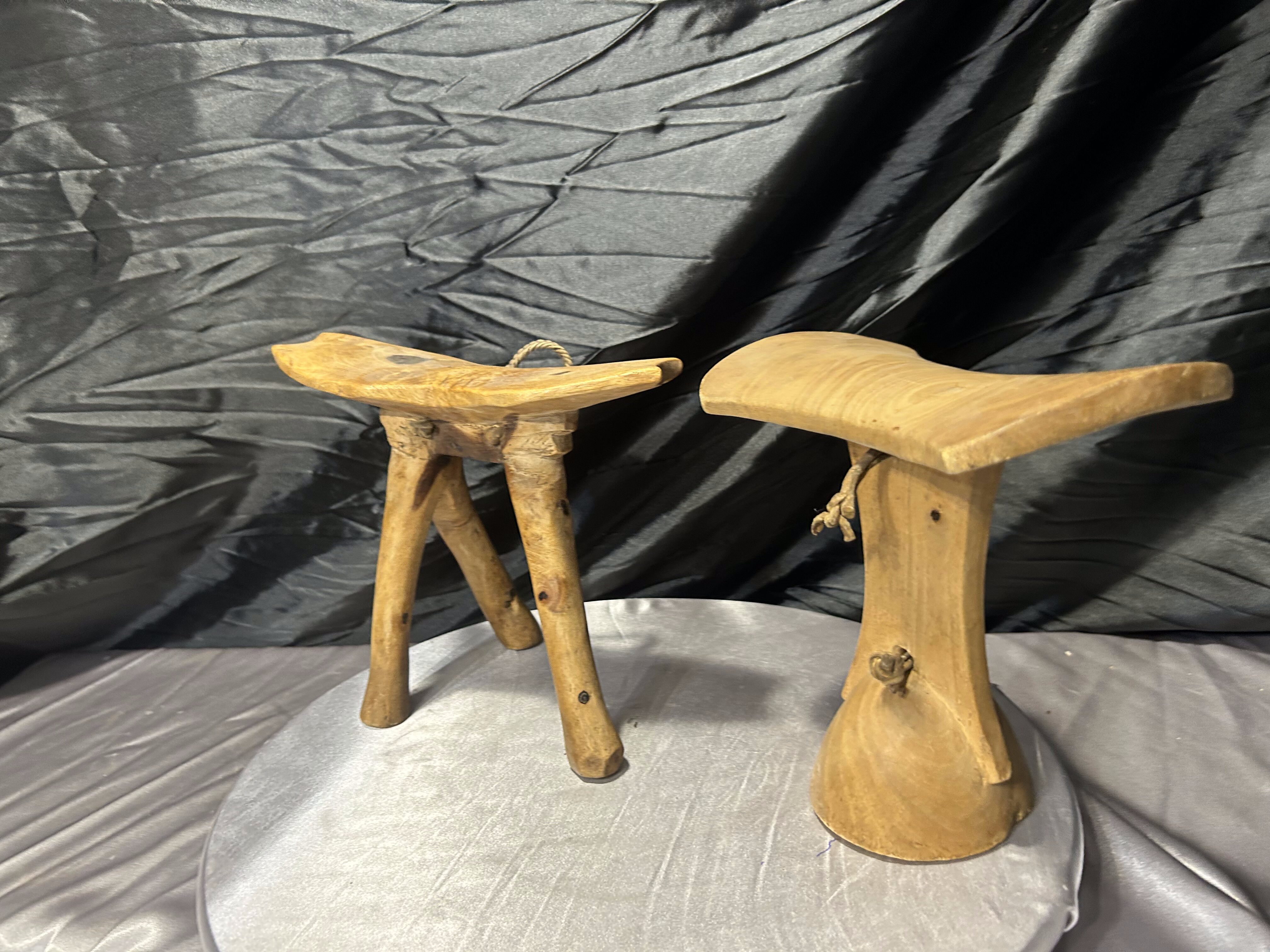 Każdy egzemplarz ukazuje inne podejście do formy – jeden osadzony na pojedynczym, rzeźbionym trzonie, drugi na trzech organicznie wygiętych nóżkach. Widoczne ślady pracy dłuta oraz naturalna faktura drewna nadają im wyjątkowy, kolekcjonerski charakter.