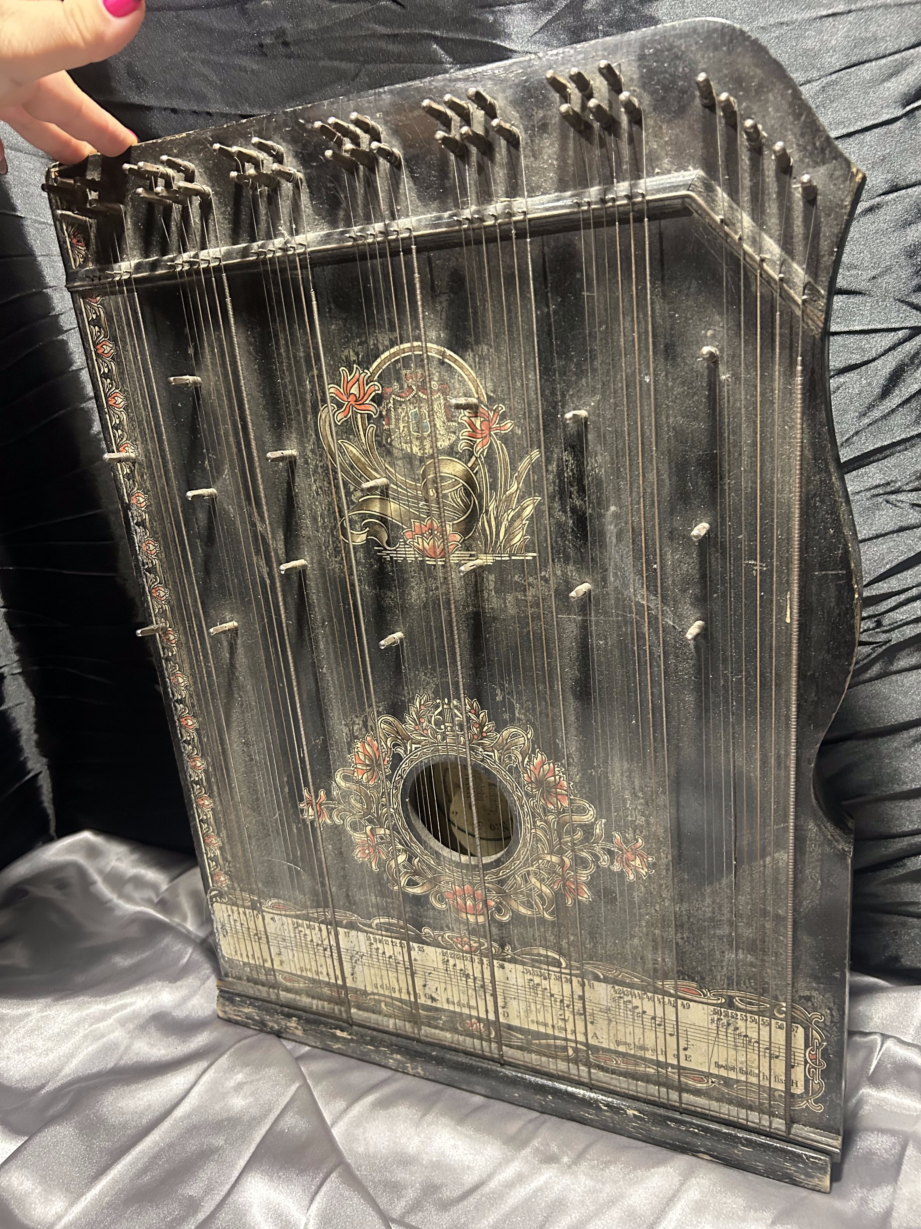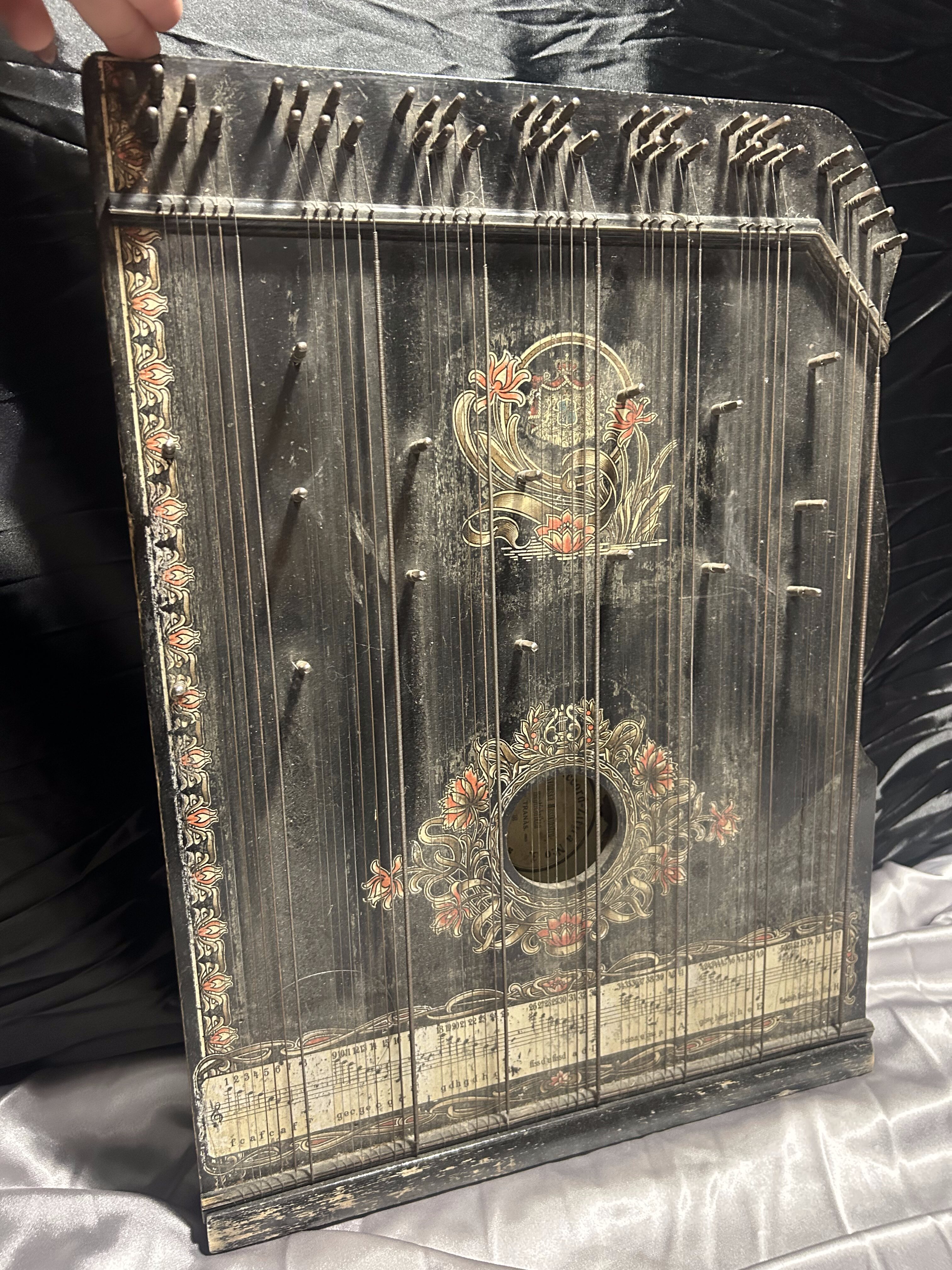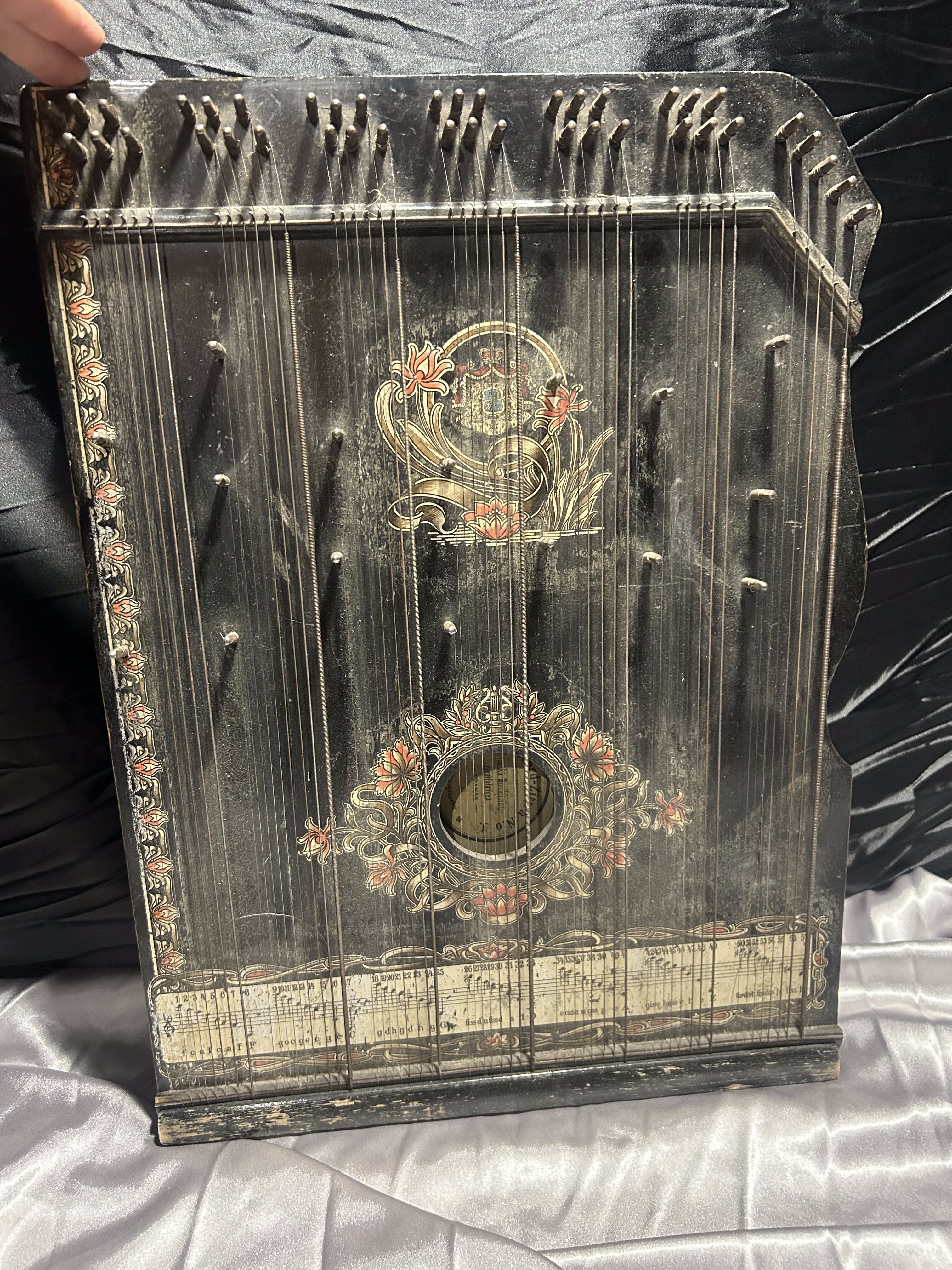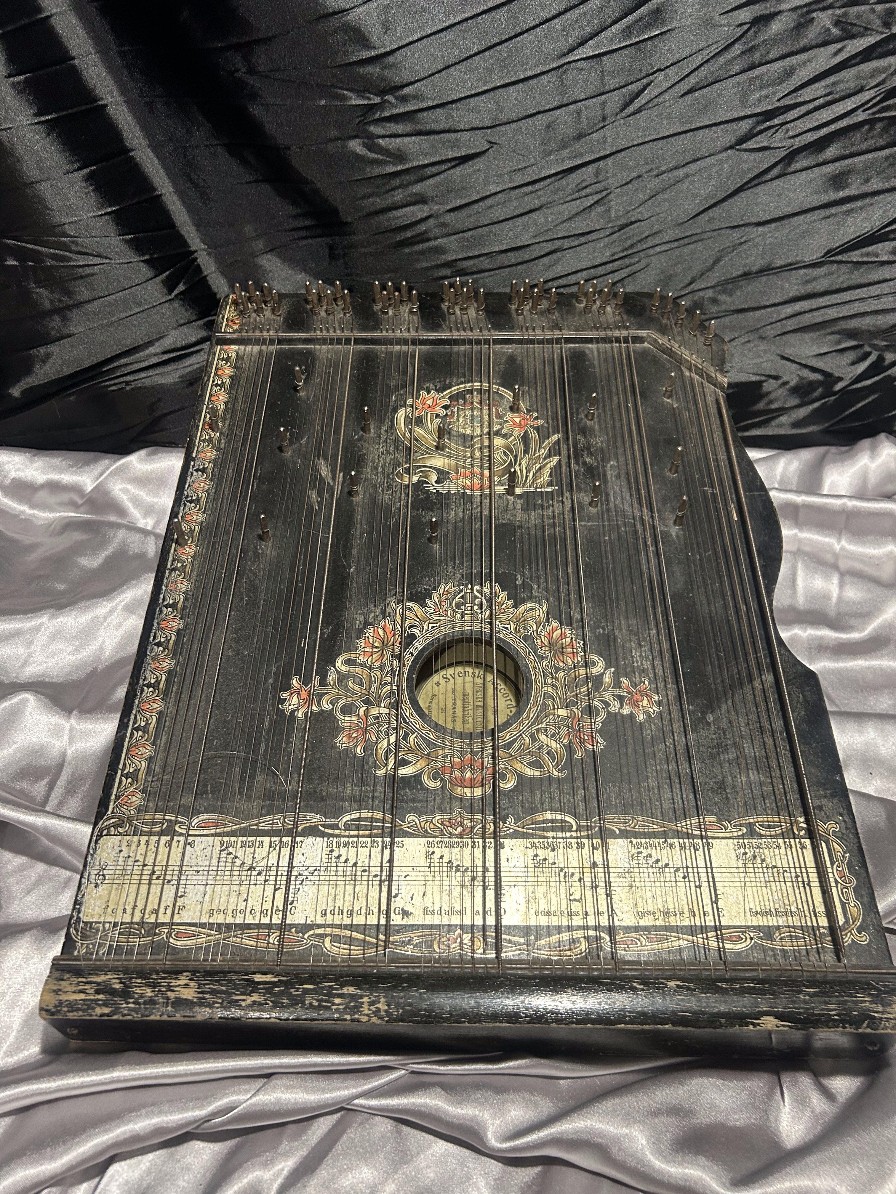 Instrument zachował oryginalne elementy – metalowe struny, bogate zdobienia kwiatowe i stylizowane ornamenty w odcieniach złota i czerwieni. Na płycie wierzchniej widoczny jest kunsztowny motyw florystyczny otaczający otwór rezonansowy z czytelną sygnaturą producenta.