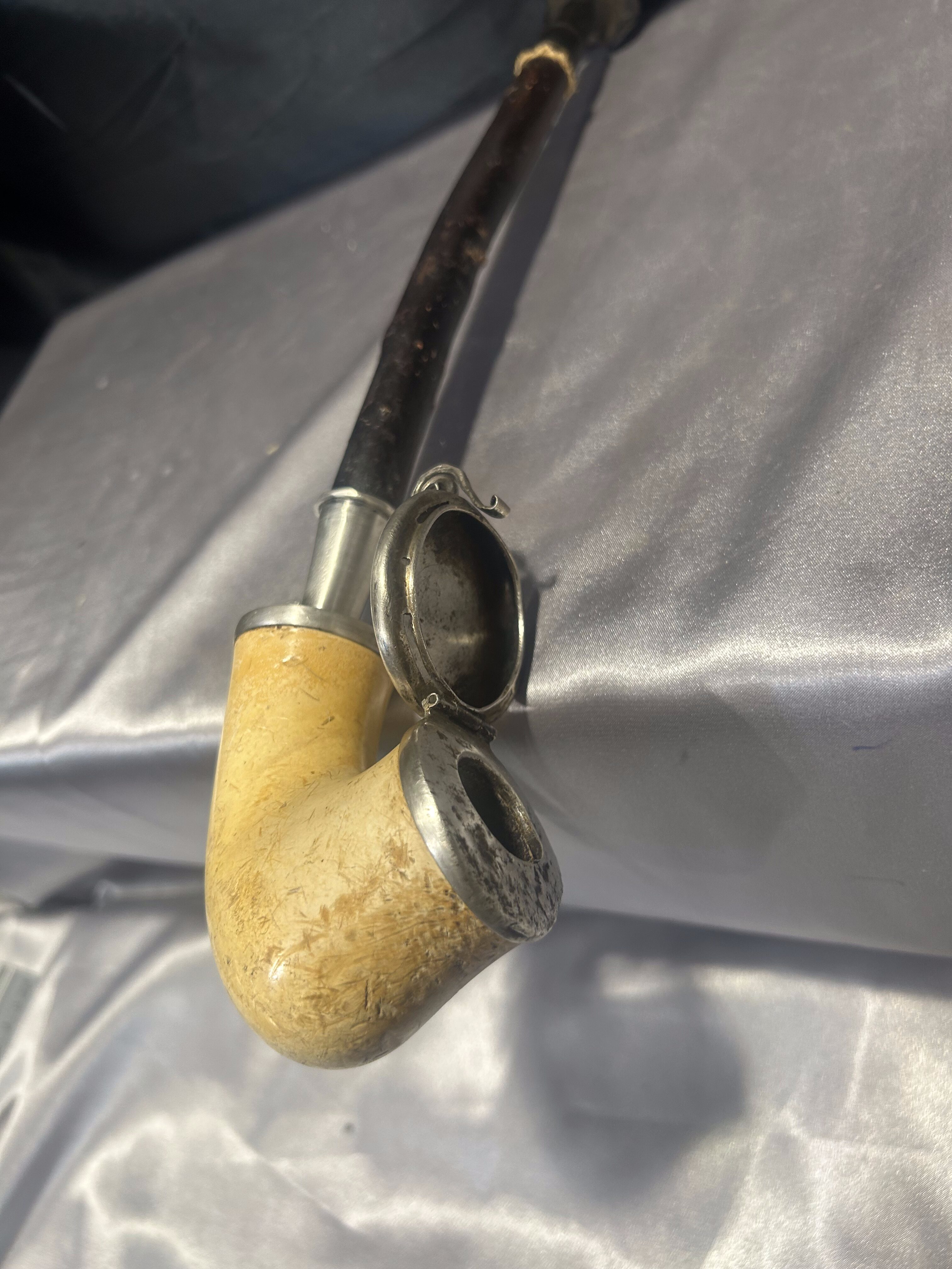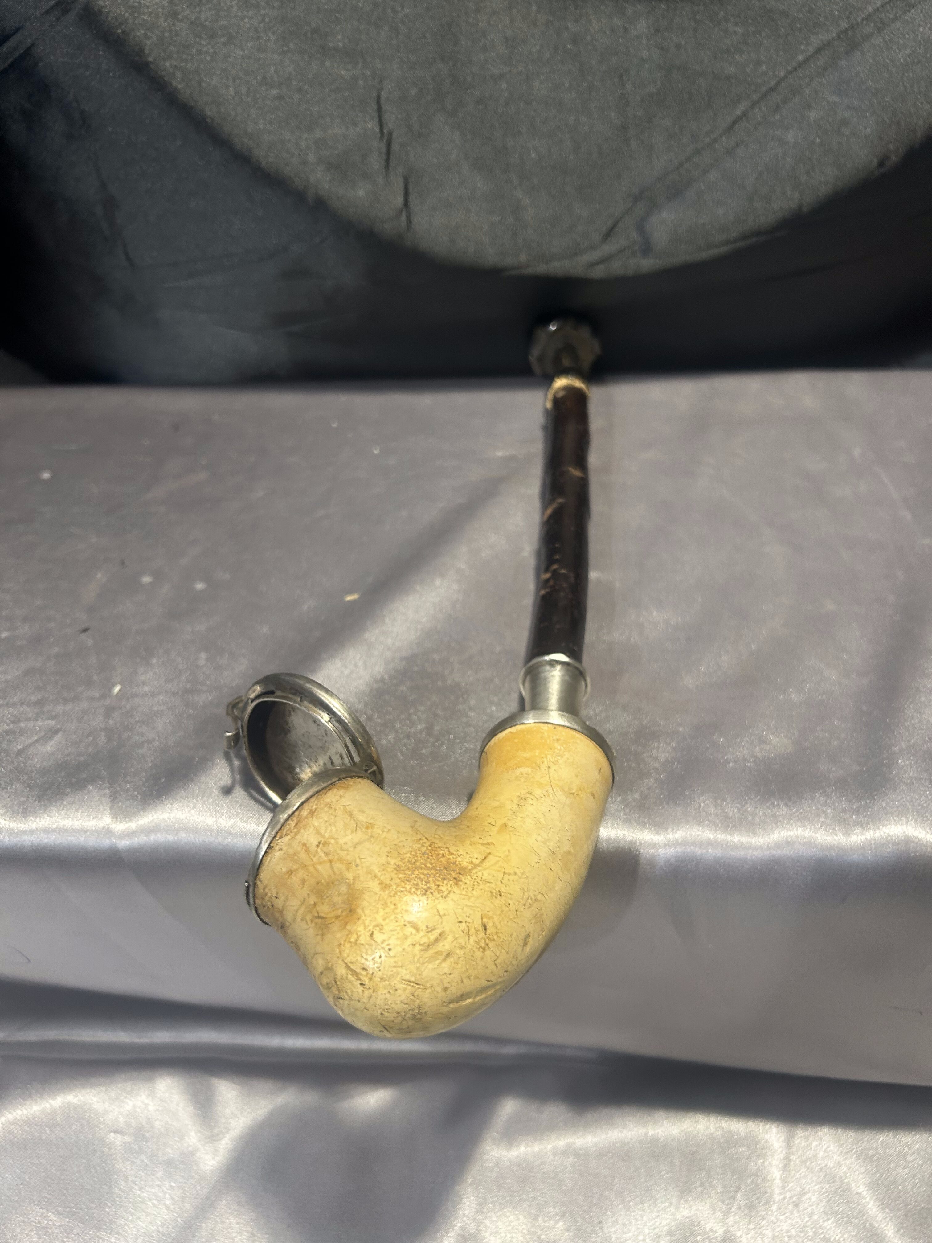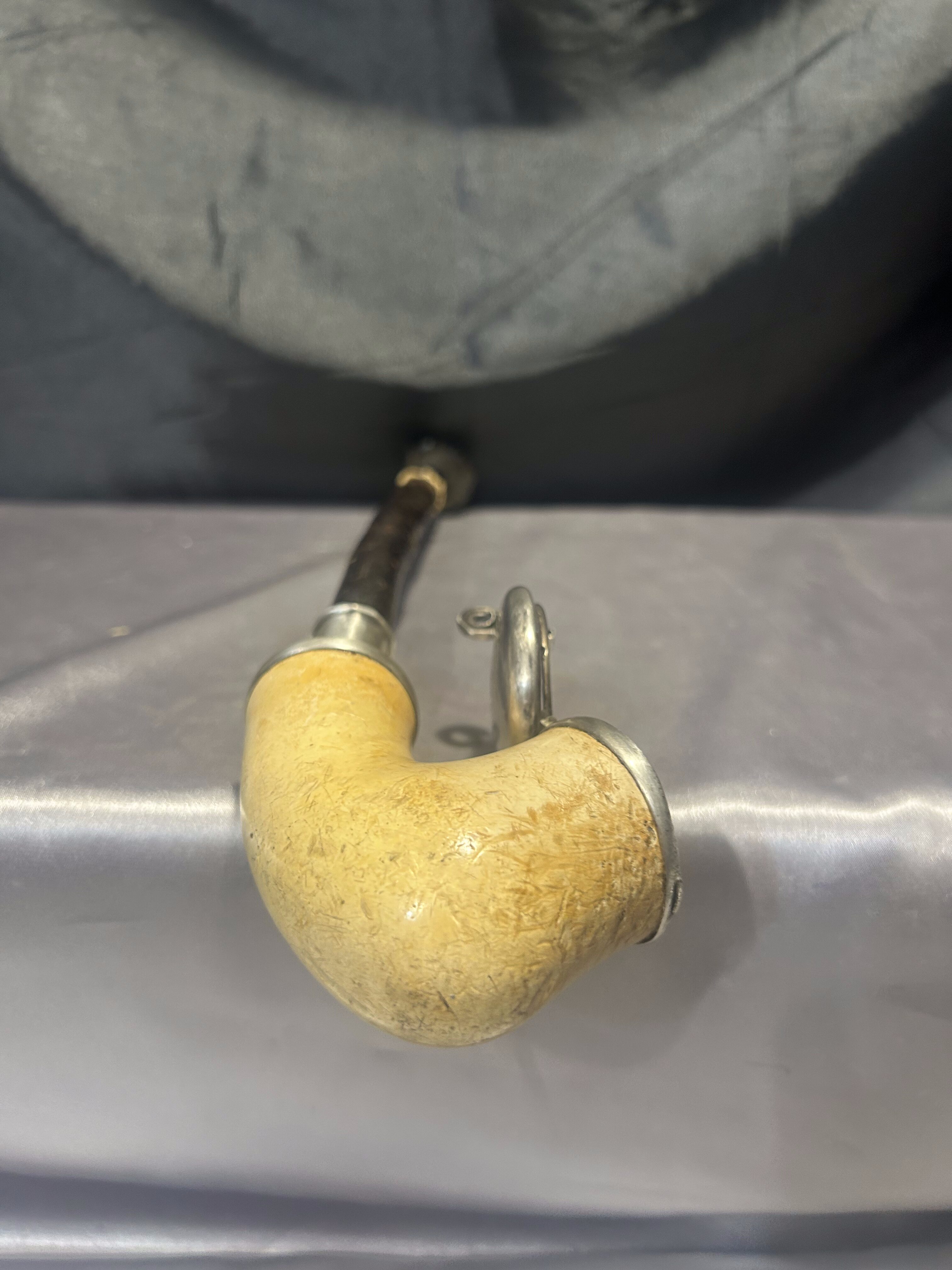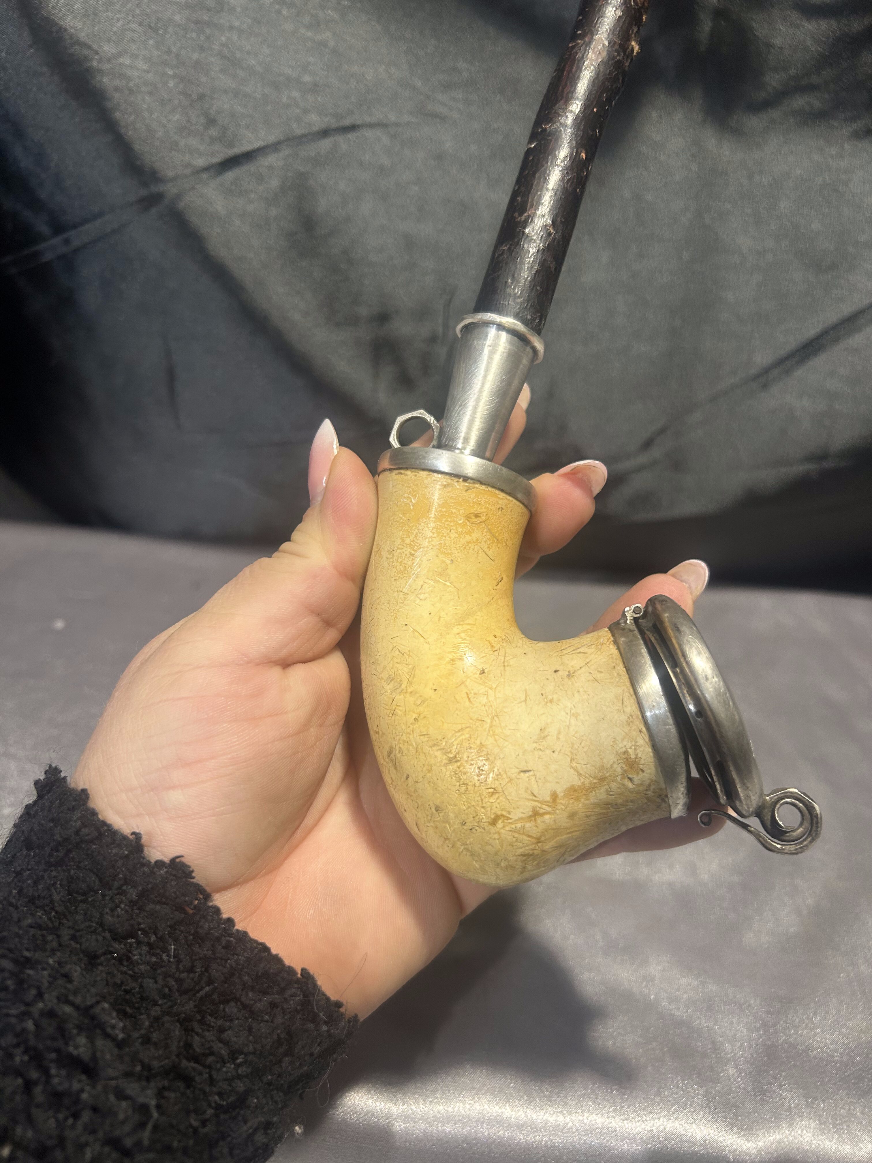 Wyjątkowa, antyczna fajka wykonana z pianki morskiej (meerschaum), z eleganckim, długim ustnikiem z drewna owocowego oraz srebrnymi okuciami, będąca prawdziwą perełką dla kolekcjonerów i pasjonatów dawnego rzemiosła. Ta niezwykła fajka zachwyca zarówno jakością wykonania, jak i bogatą historią, widoczną w każdym detalu.