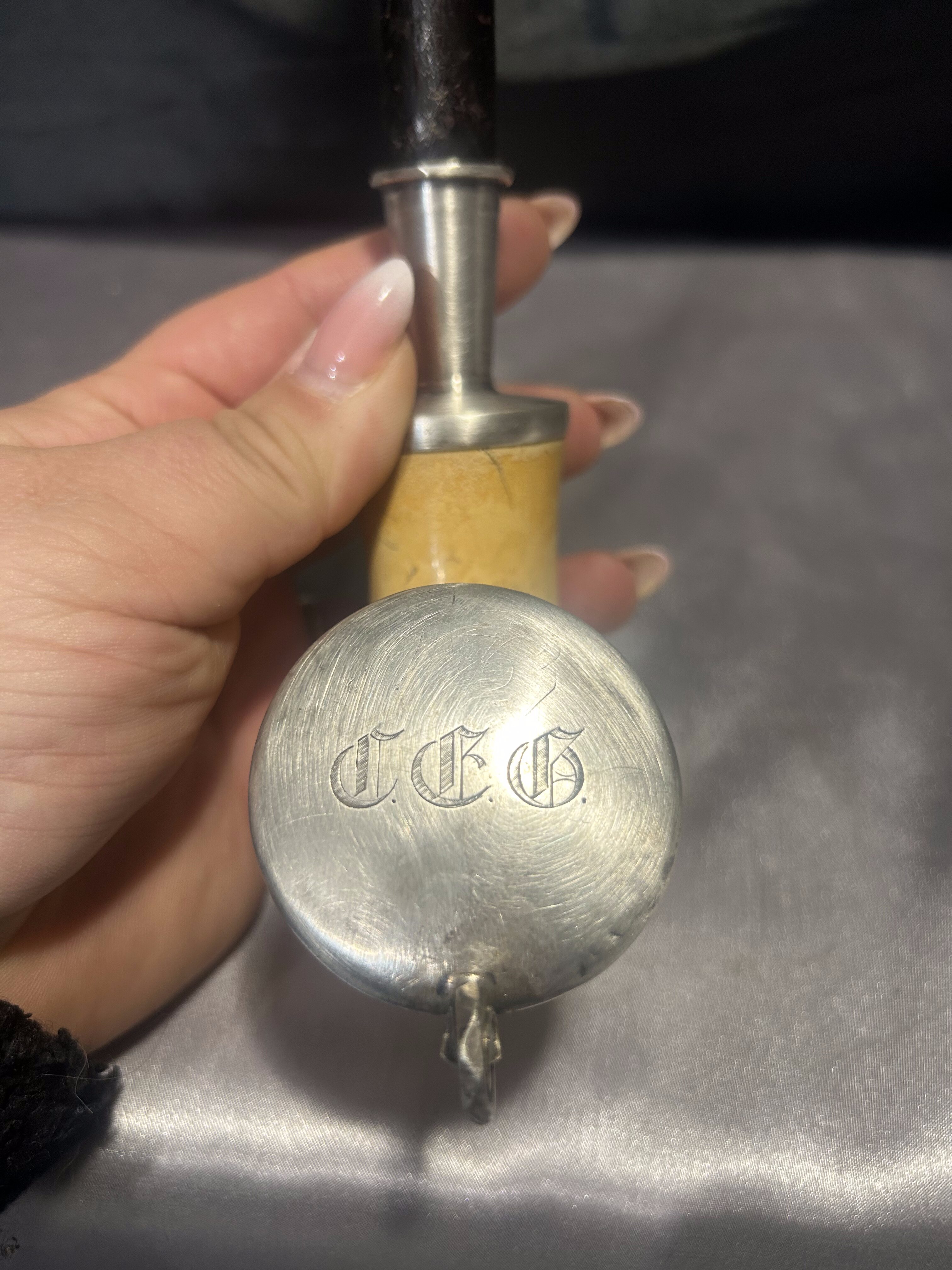 Ta unikatowa fajka z pianki morskiej ze srebrnym wieczkiem to prawdziwy rarytas kolekcjonerski i wyjątkowy przykład dawnego rzemiosła, które zachwyca elegancją i funkcjonalnością. Fajka tego typu mogła być prywatną własnością zamożnej osoby, być może ofiarowana jako prezent pamiątkowy, o czym świadczą precyzyjnie wygrawerowane inicjały „C.E.G.” na srebrnym wieczku.