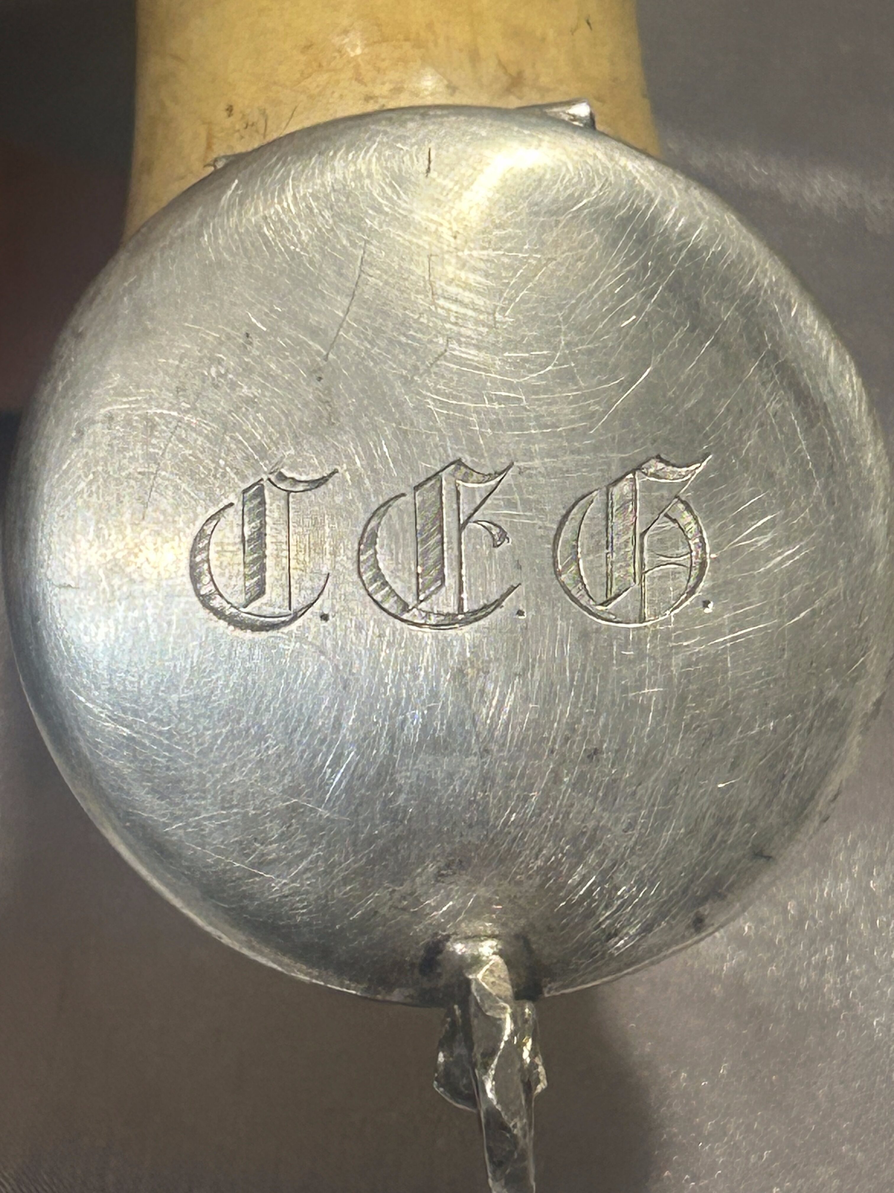 Sygnatura: srebrne wieczko z grawerowanym monogramem „C.E.G.”, czpień z wybitą próbą srebra