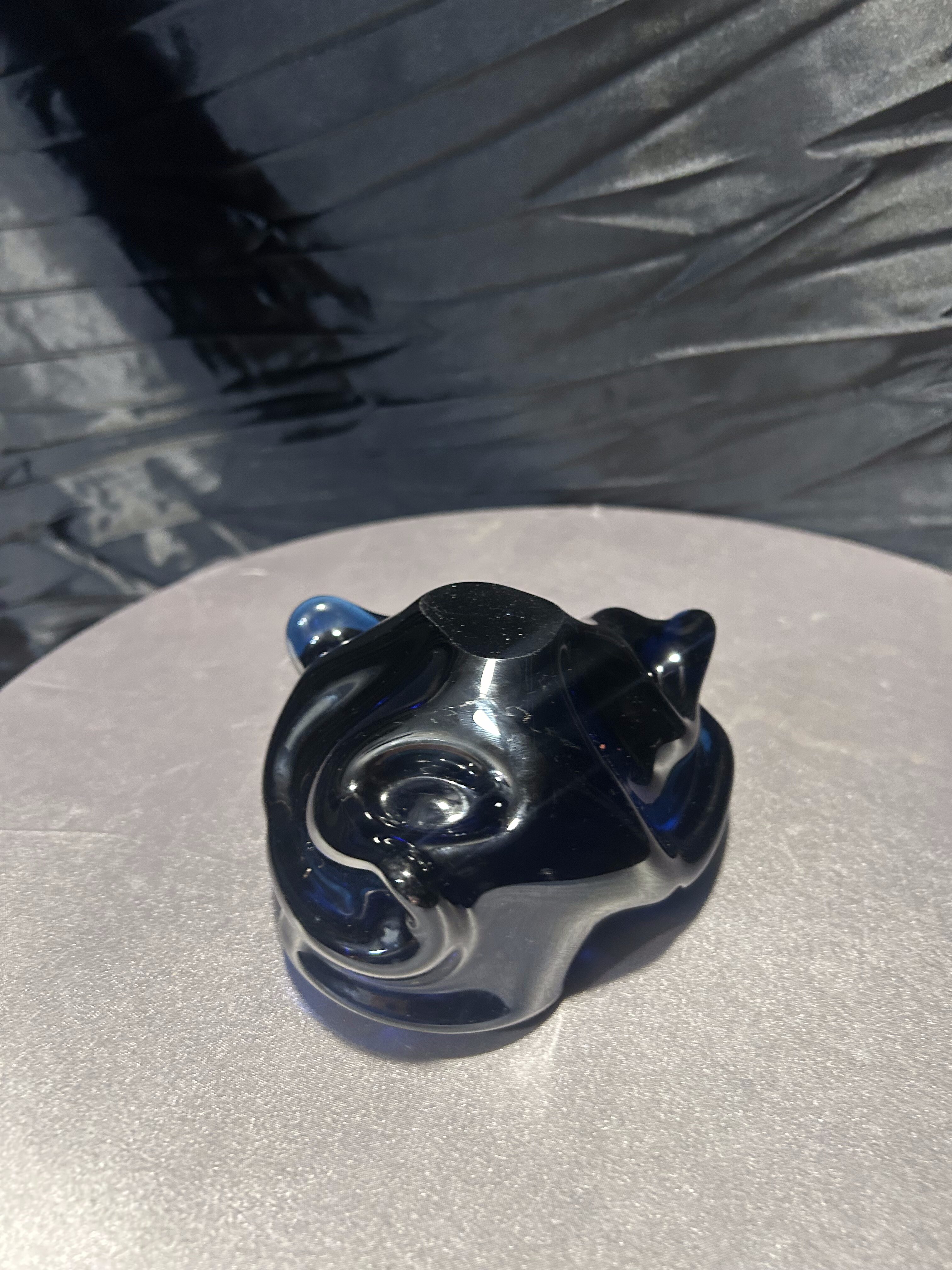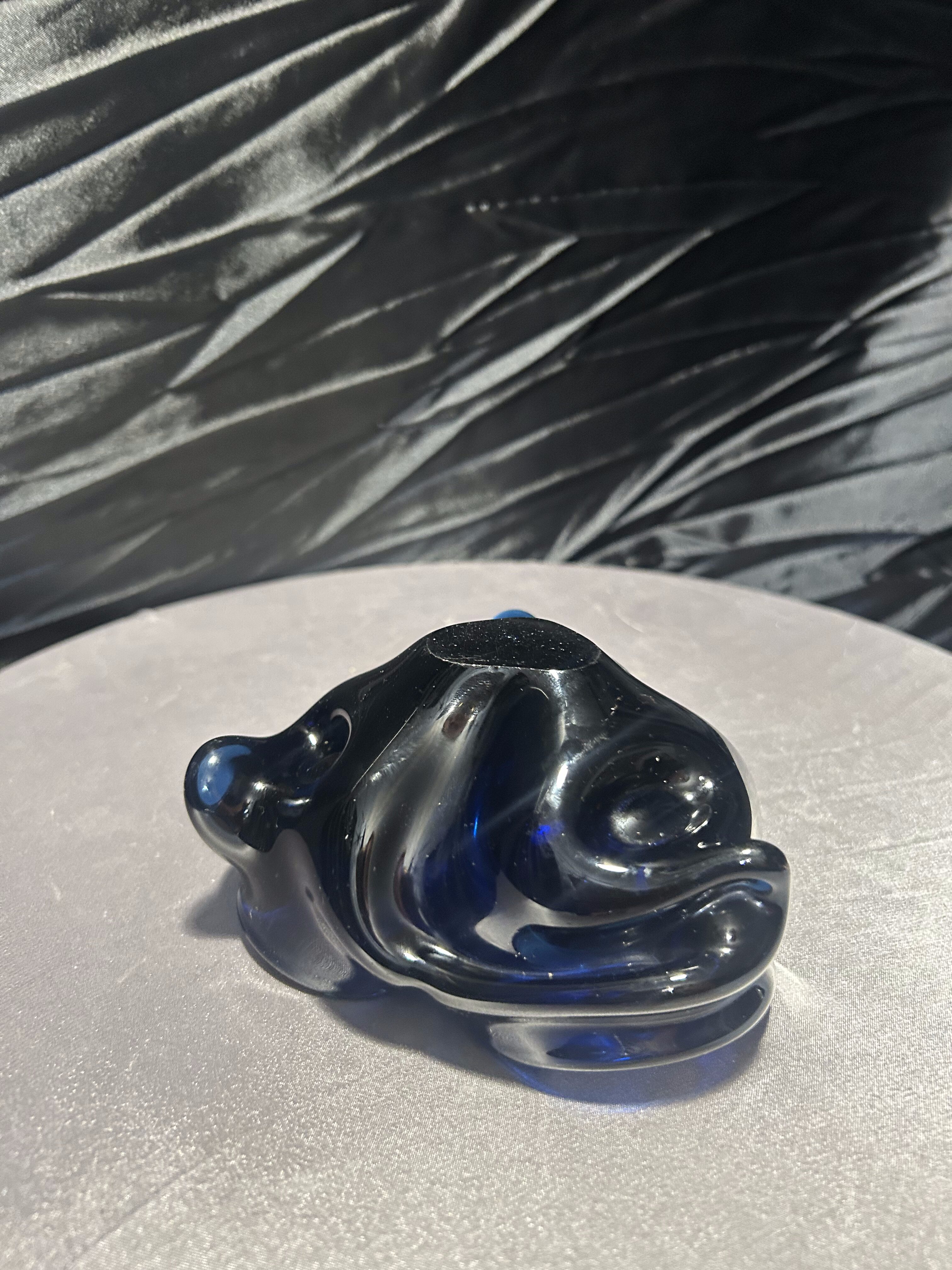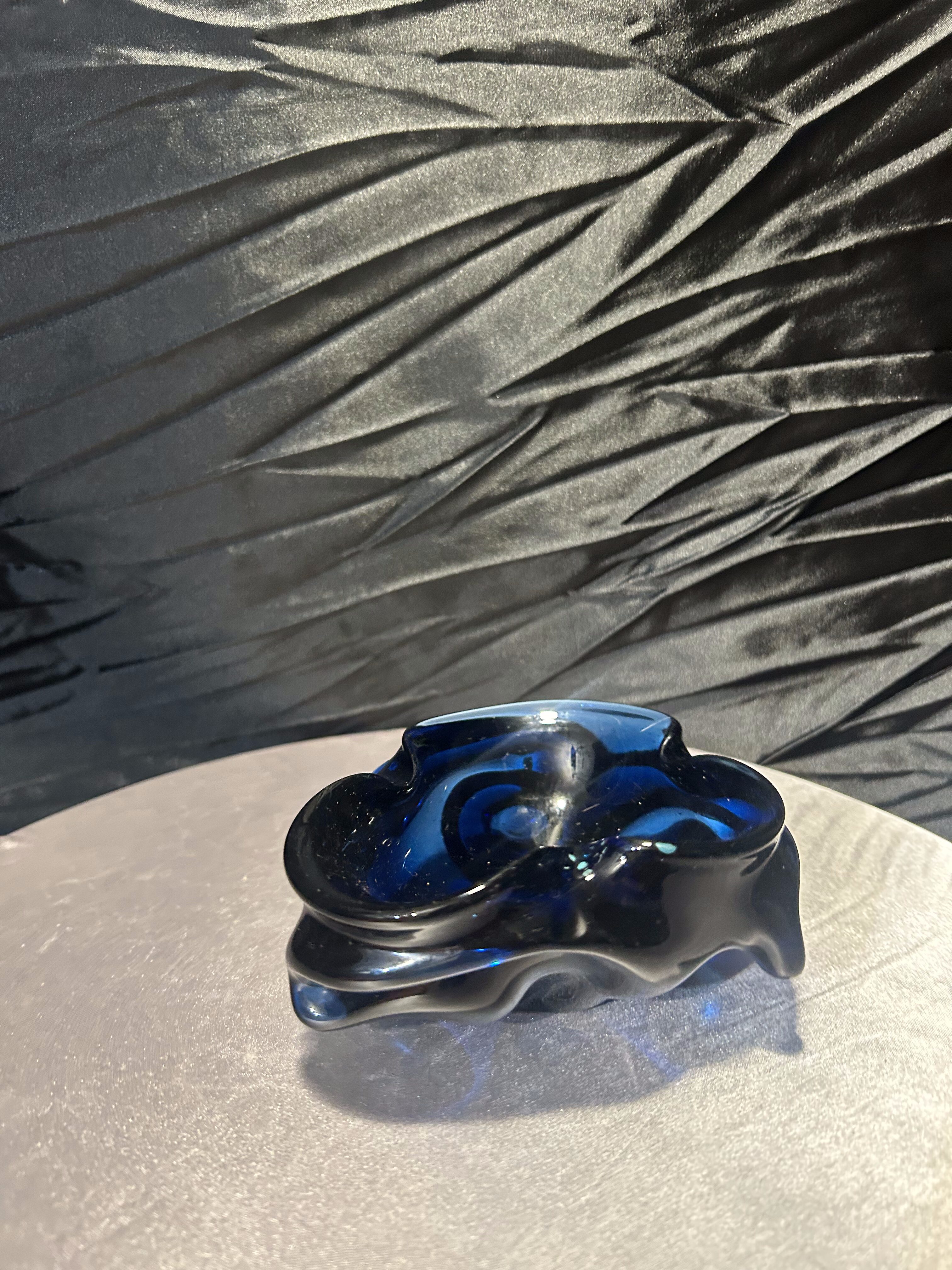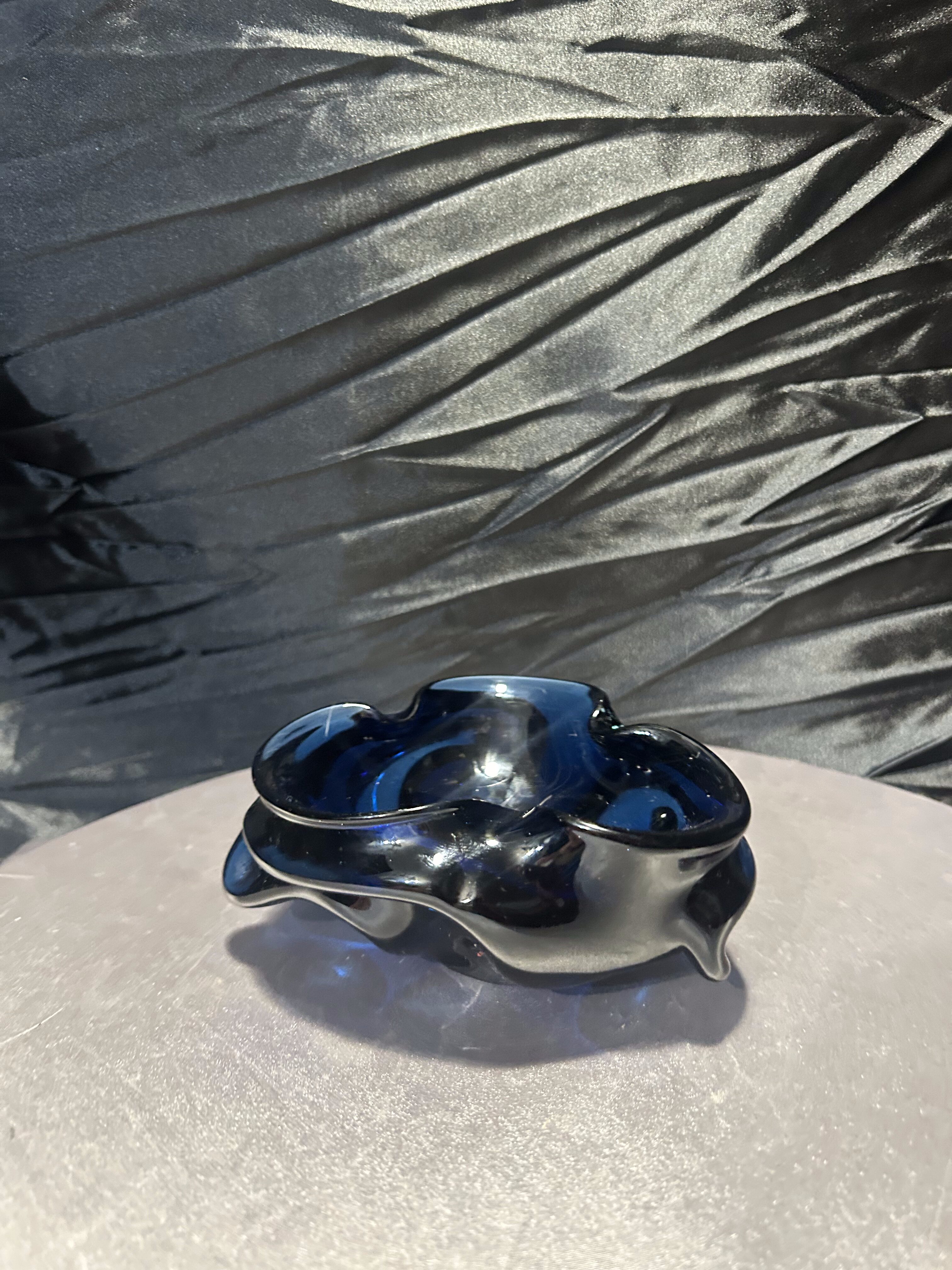 Niezwykła misa ze szkła artystycznego w głębokim kobaltowym odcieniu. Jej organiczna, falista forma przyciąga wzrok i tworzy efekt gry światła w grubym szkle. To wyjątkowy przedmiot dekoracyjny, który łączy w sobie funkcjonalność i sztukę, stanowiąc piękny akcent w każdym wnętrzu.