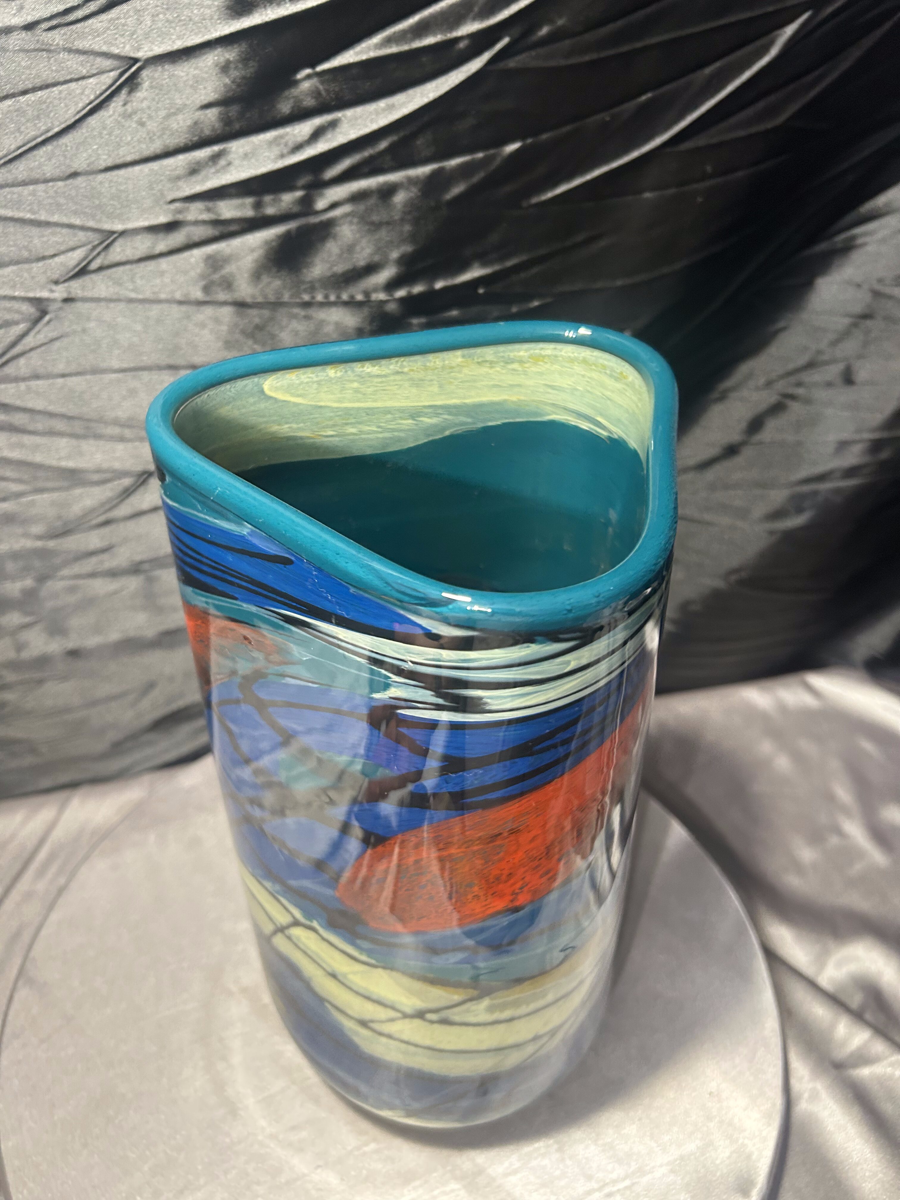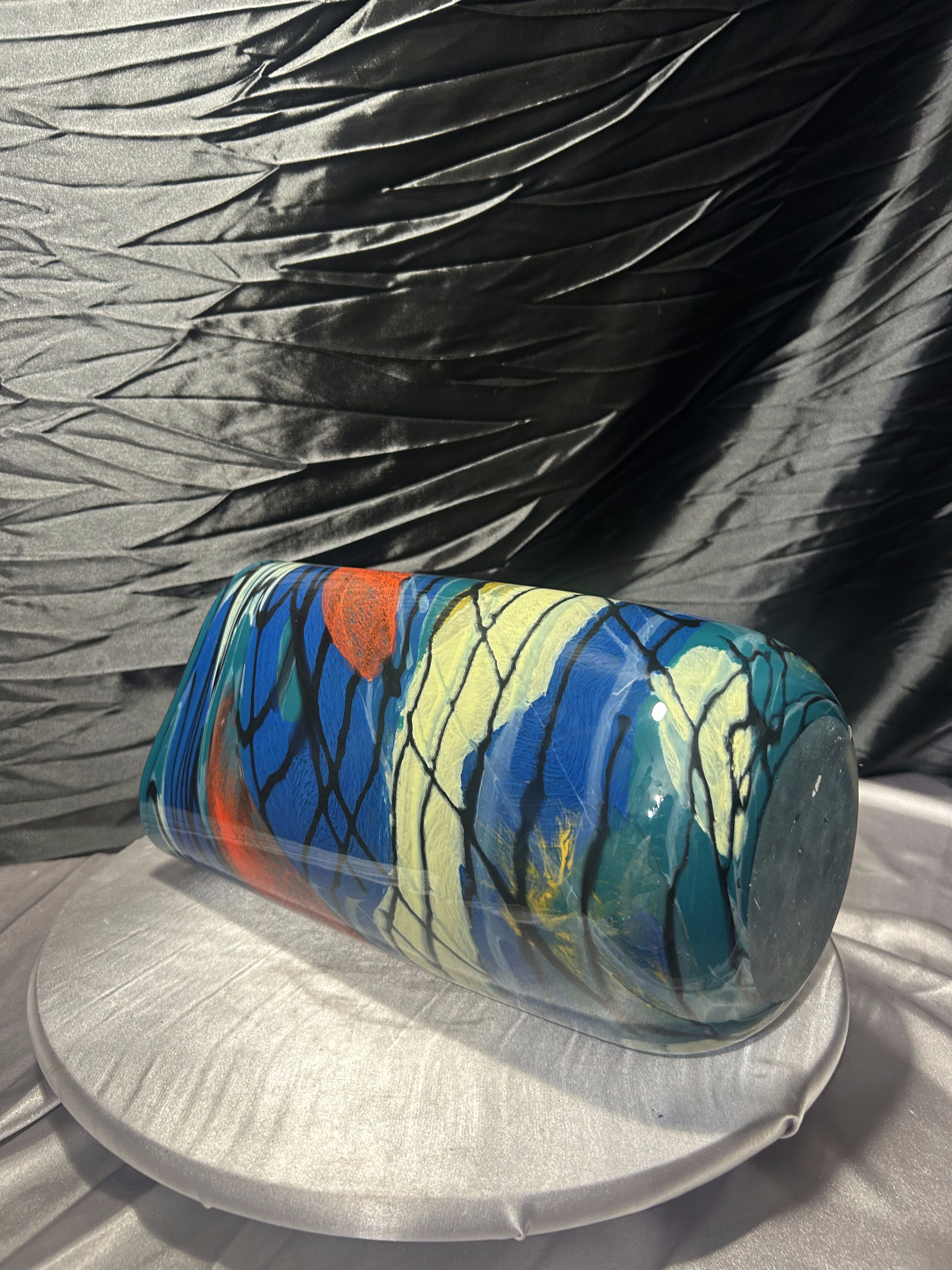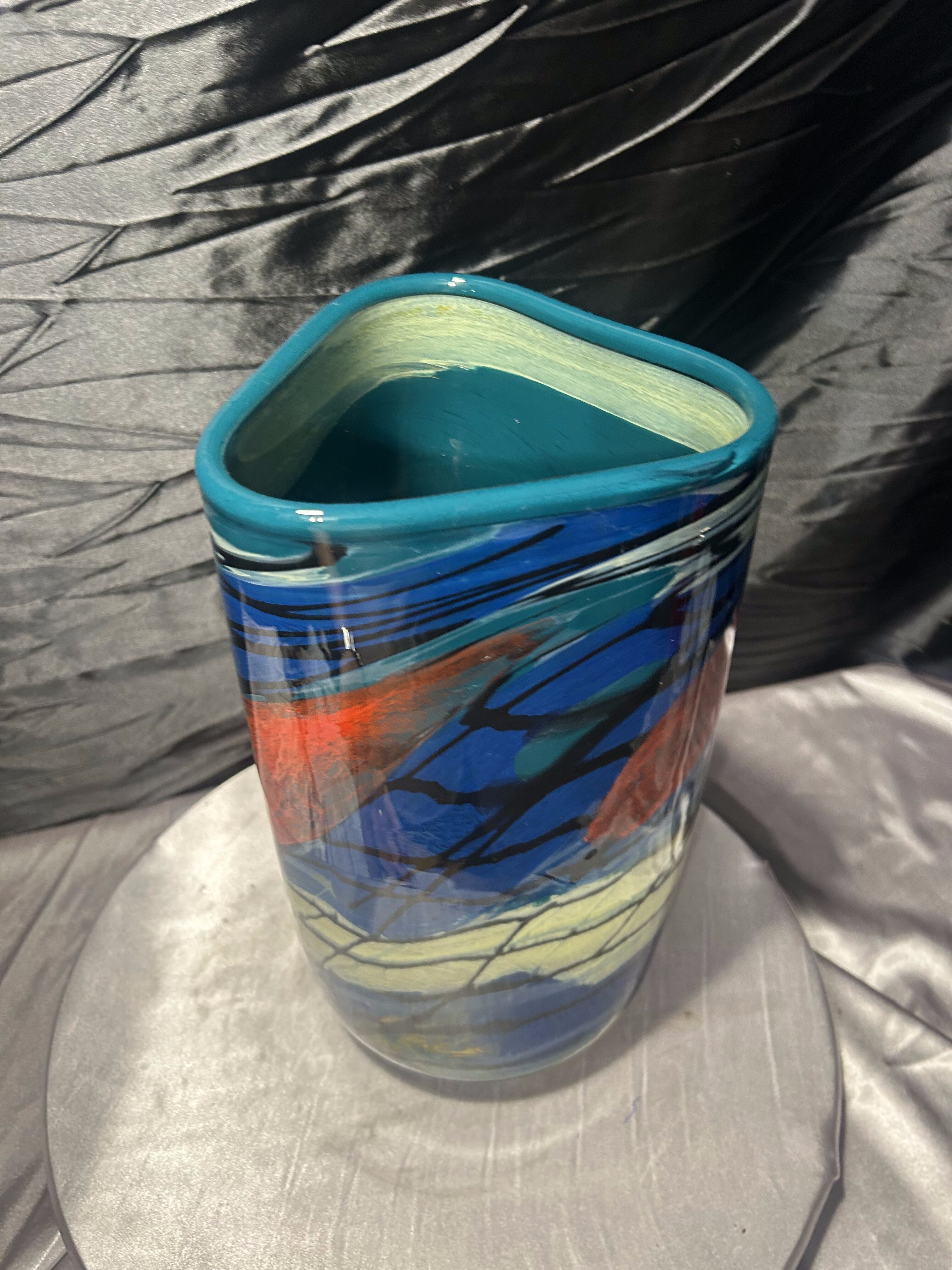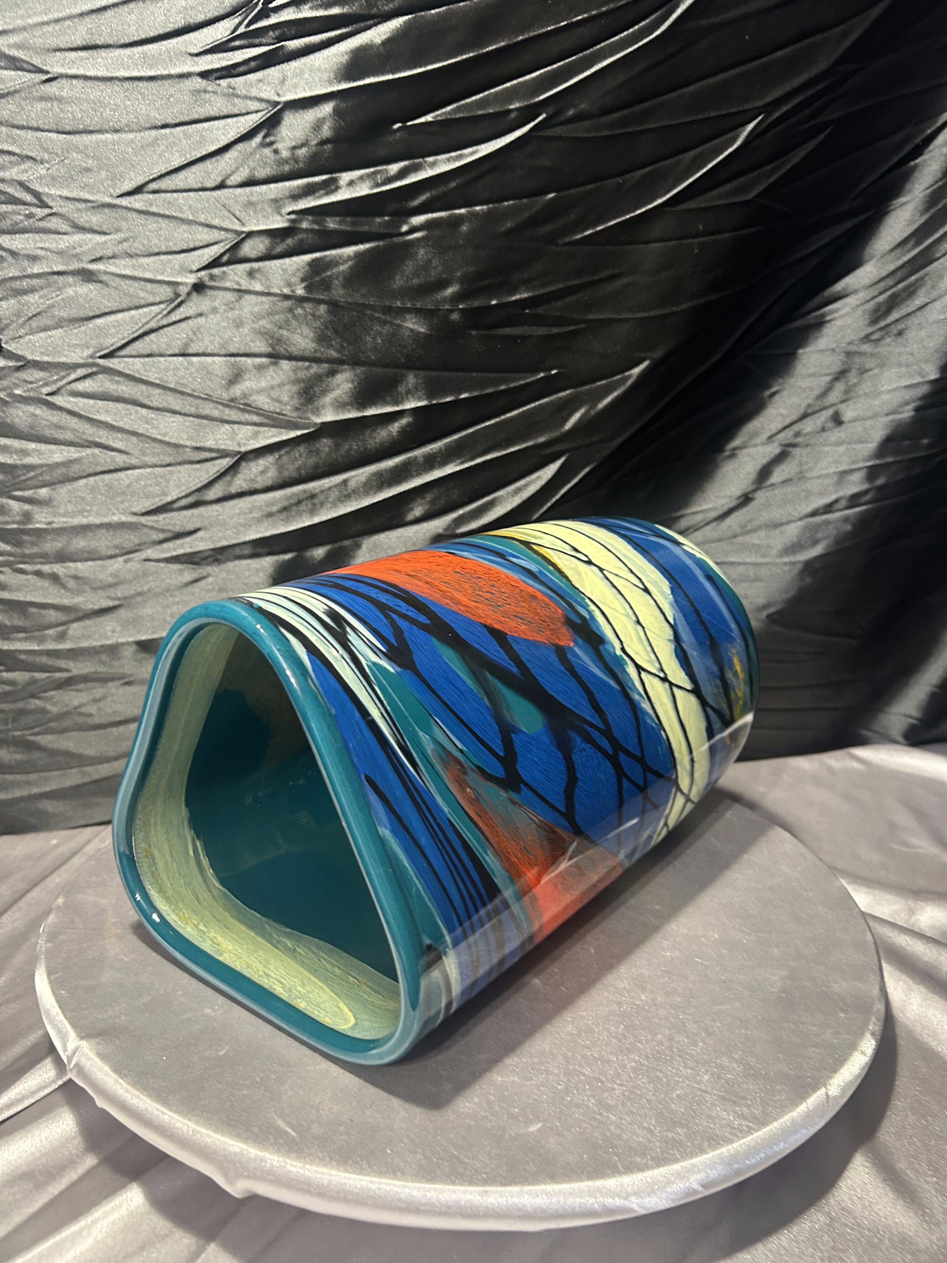 Efektowny wazon flakon wykonany z ciężkiego szkła artystycznego, utrzymany w estetyce Murano. Forma łączy trójkątną górę z okrągłą podstawą, co nadaje całości rzeźbiarski, nowoczesny charakter. Intensywna, wielobarwna kompozycja barw sprawia, że obiekt przyciąga uwagę i staje się dominującym elementem aranżacji wnętrza.