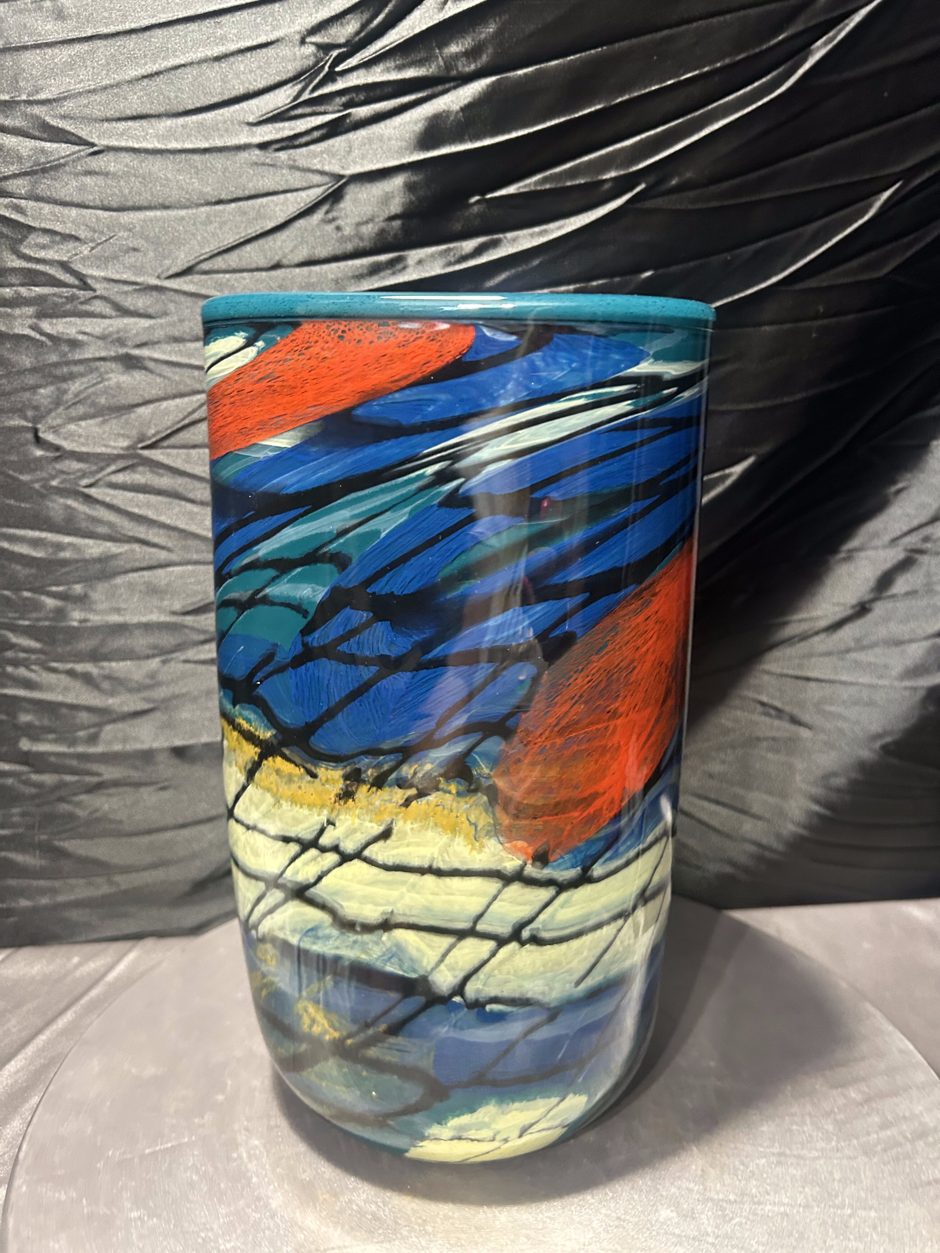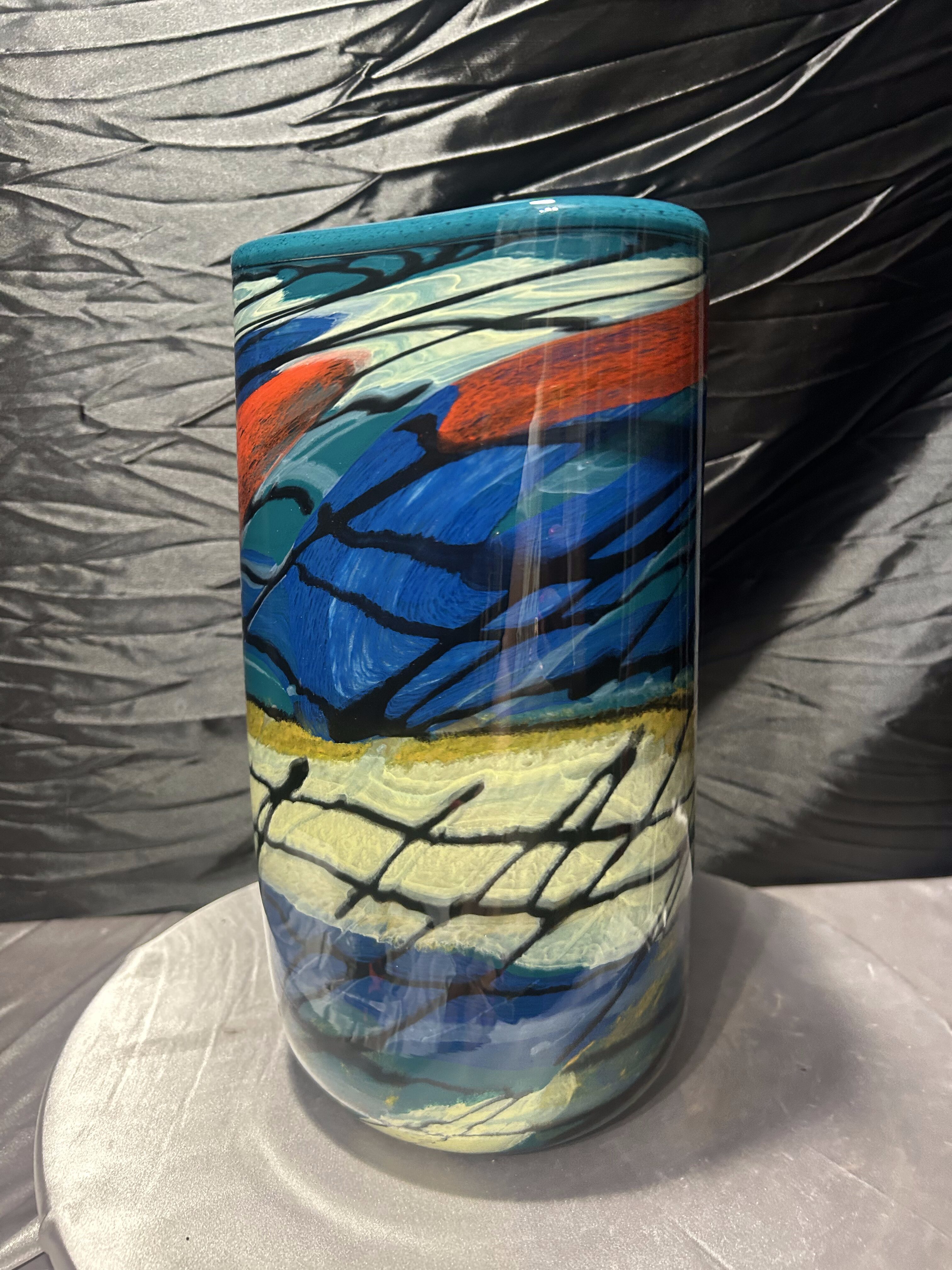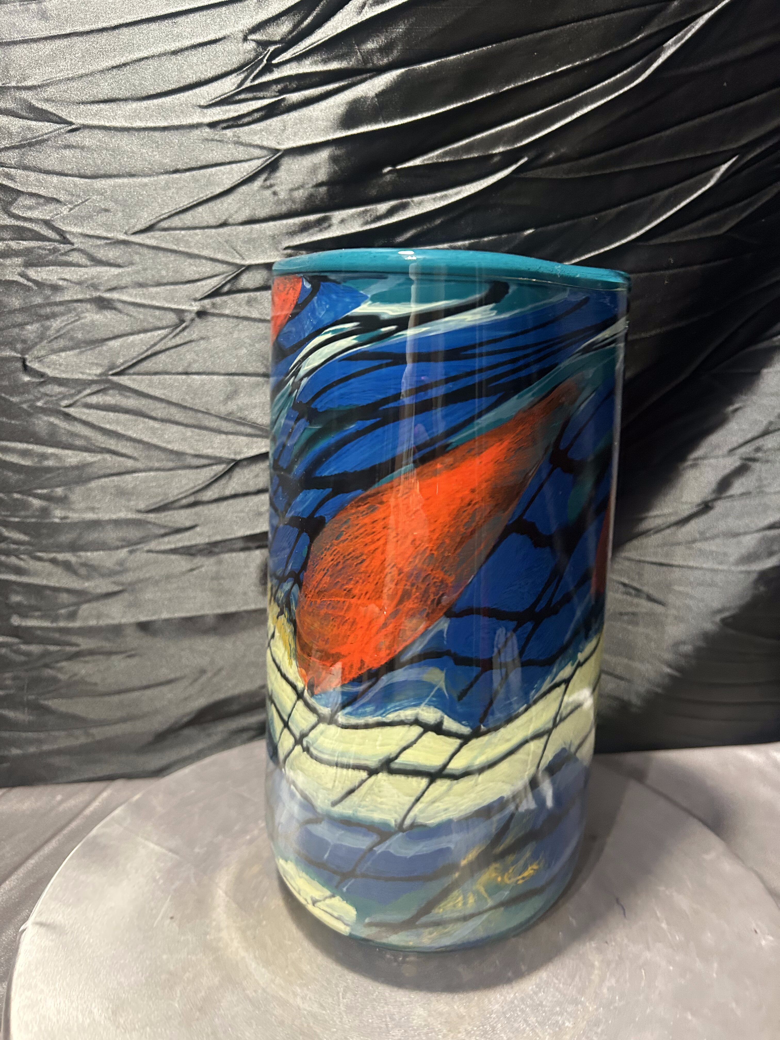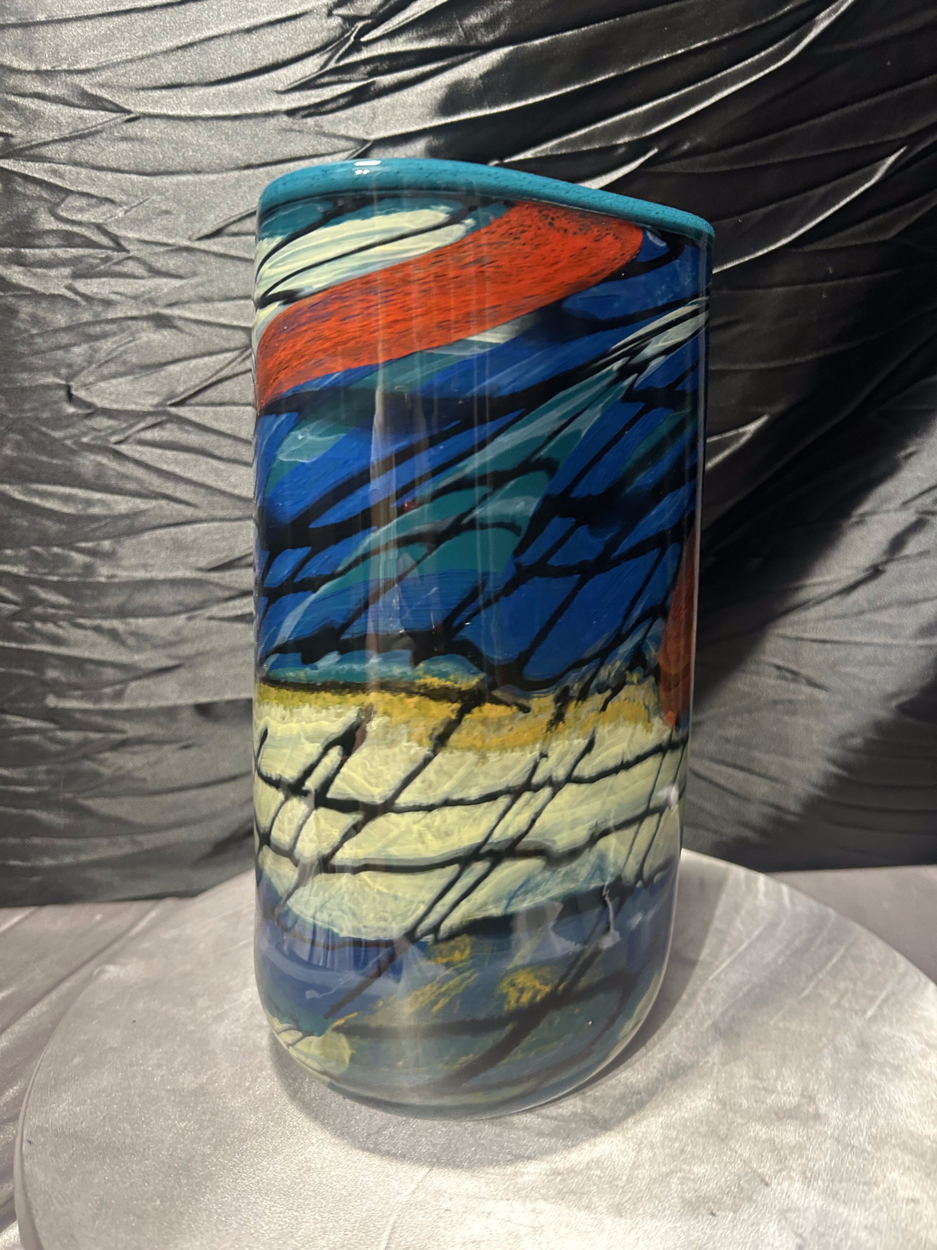 Efektowny wazon flakon wykonany z ciężkiego szkła artystycznego, utrzymany w estetyce Murano. Forma łączy trójkątną górę z okrągłą podstawą, co nadaje całości rzeźbiarski, nowoczesny charakter. Intensywna, wielobarwna kompozycja barw sprawia, że obiekt przyciąga uwagę i staje się dominującym elementem aranżacji wnętrza.