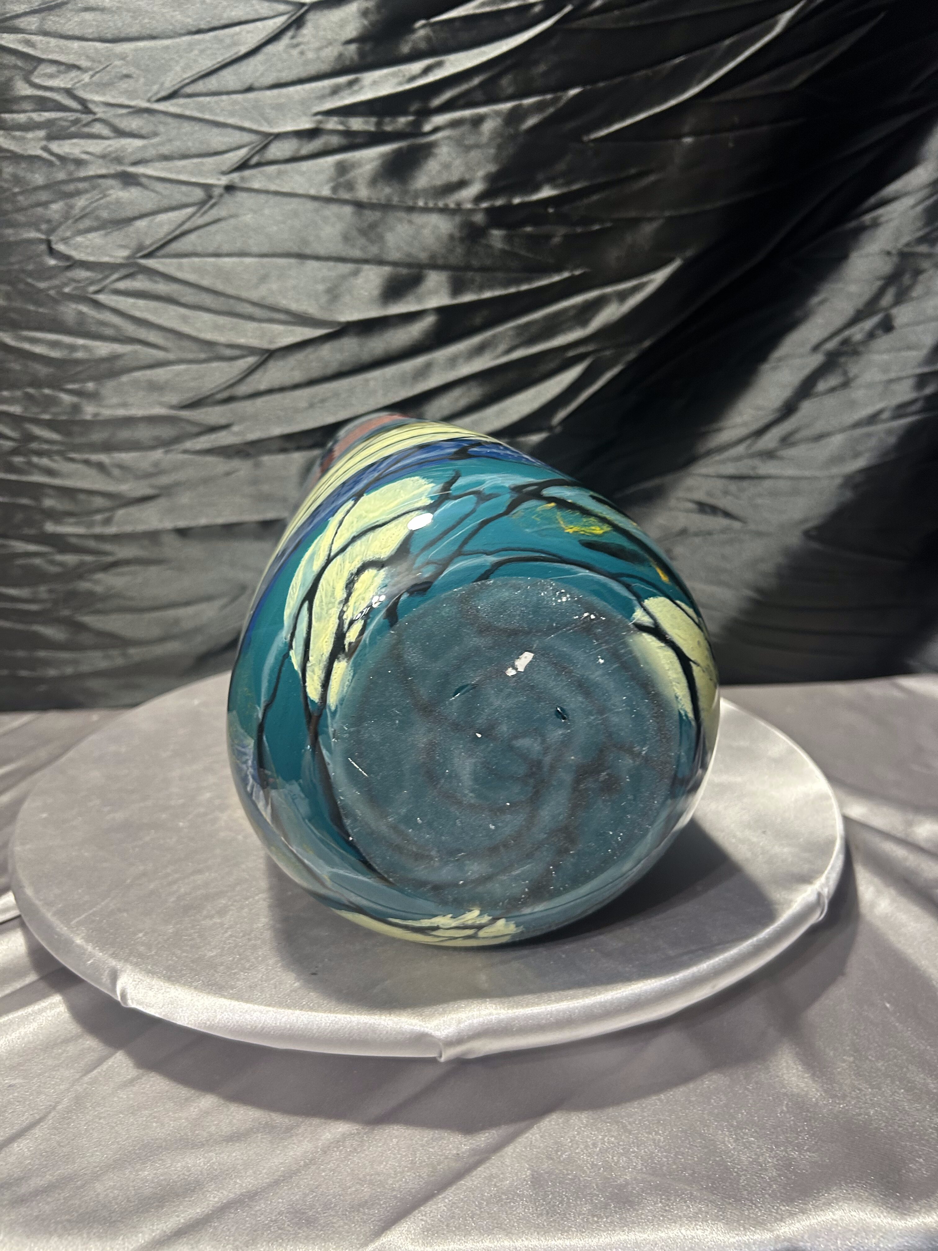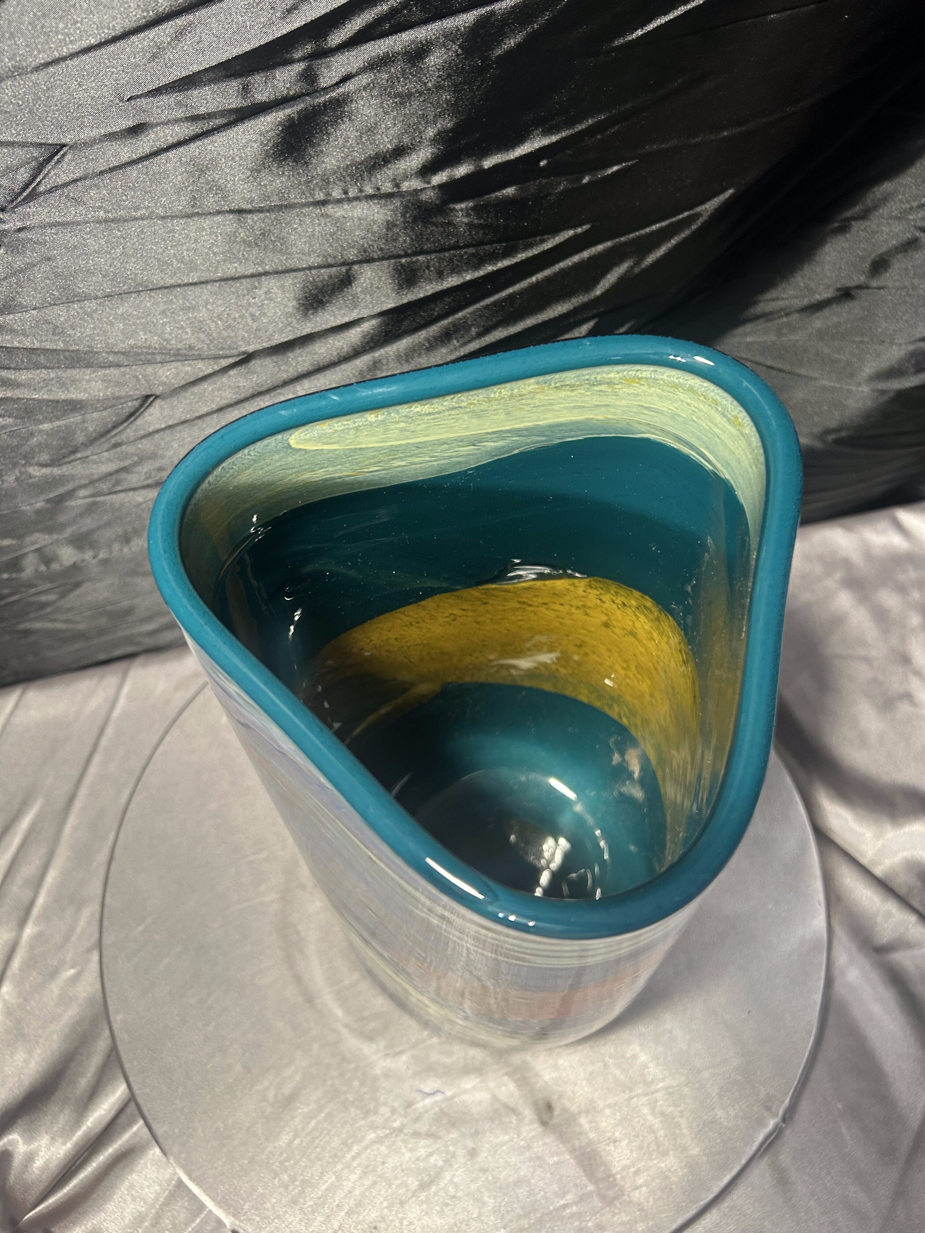Ten wazon flakon to przykład wyrazistego szkła artystycznego, w którym kolor, forma i ciężar materiału tworzą spójną, imponującą całość. Idealny do wnętrz nowoczesnych, artystycznych i kolekcjonerskich, gdzie liczy się unikatowy charakter przedmiotu.
