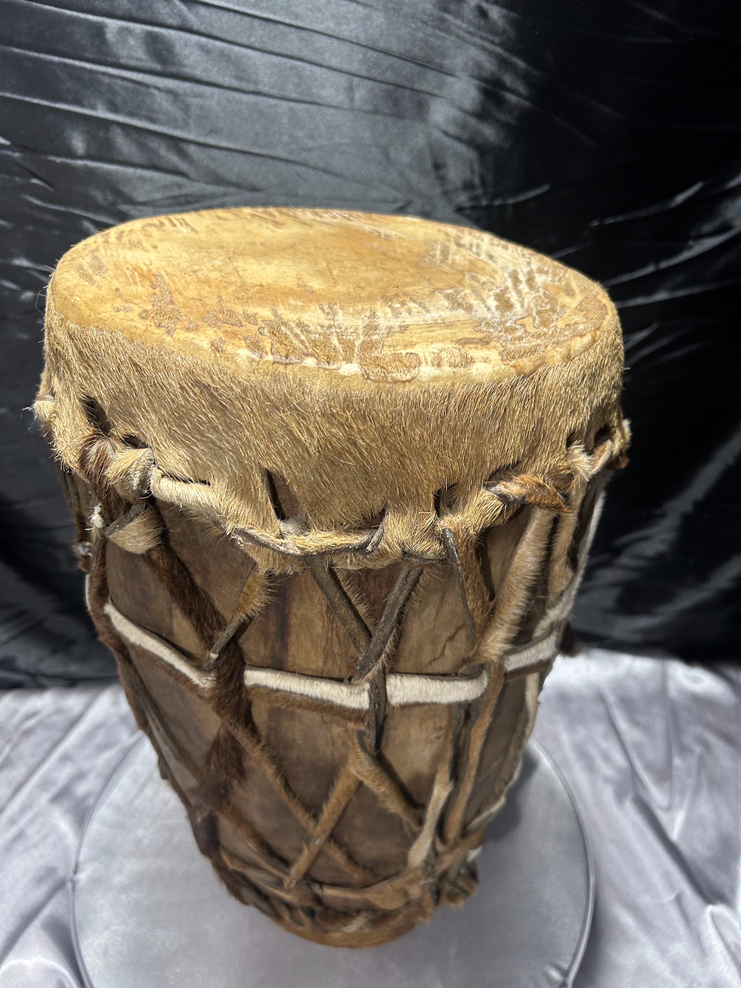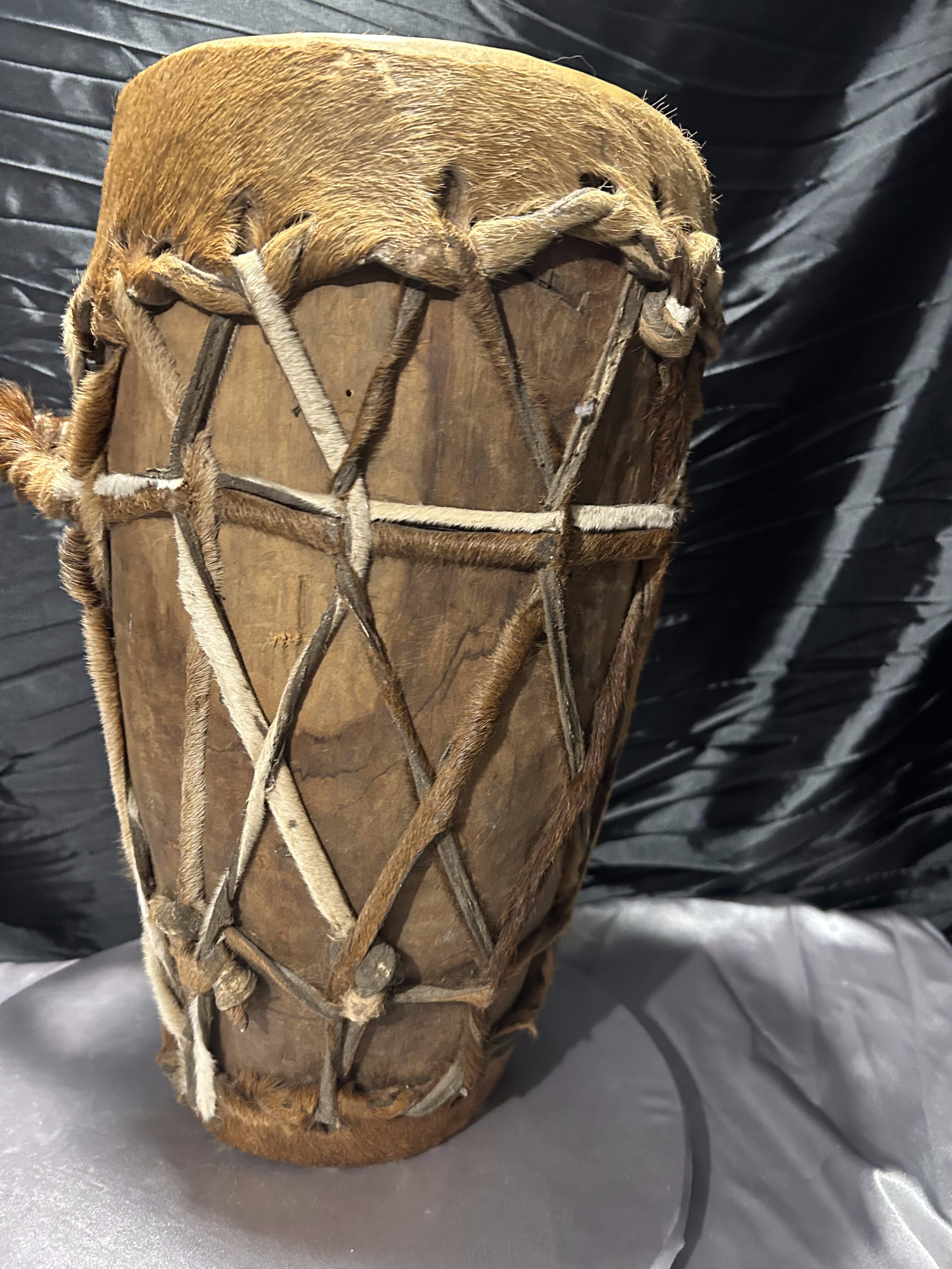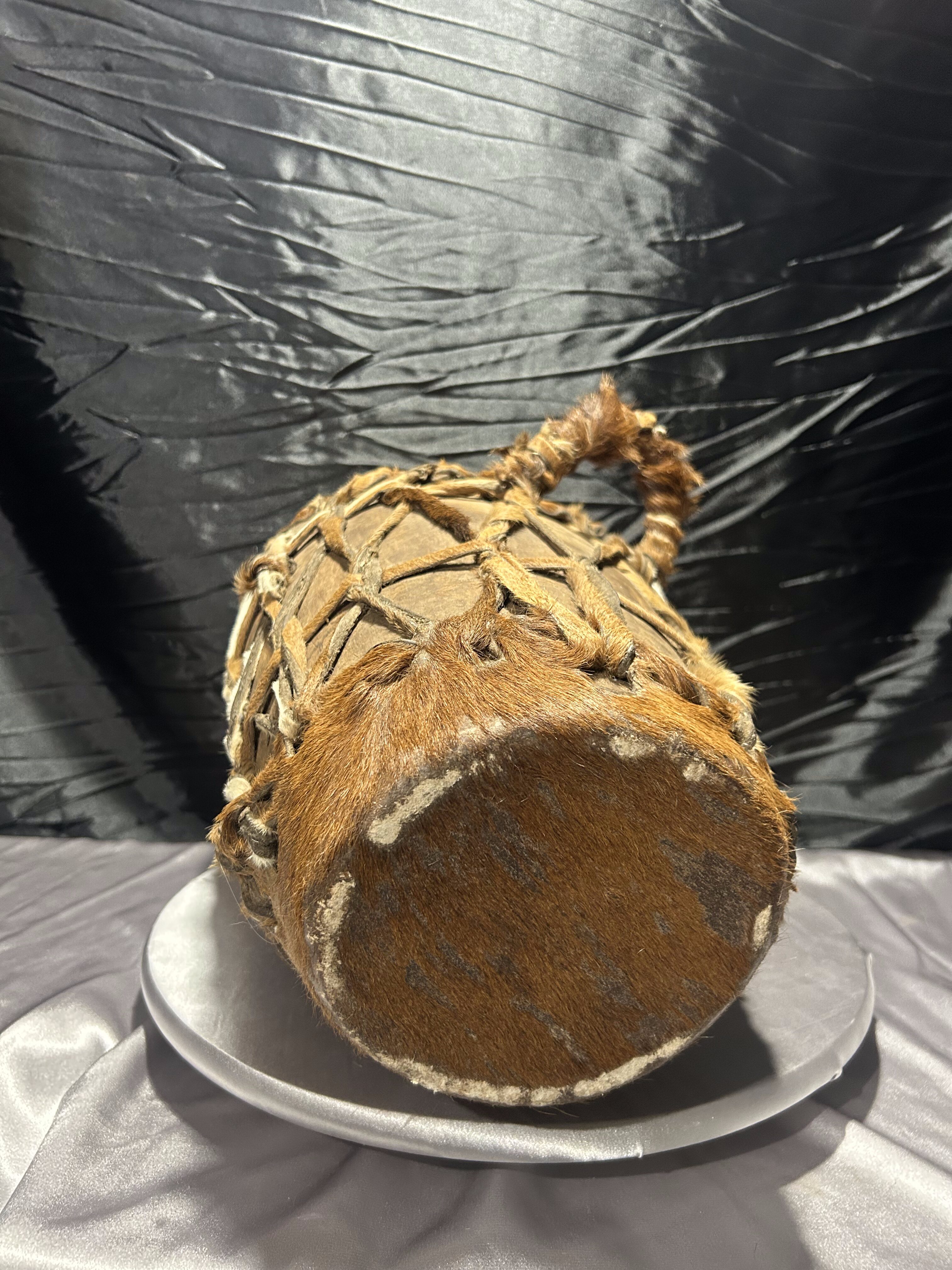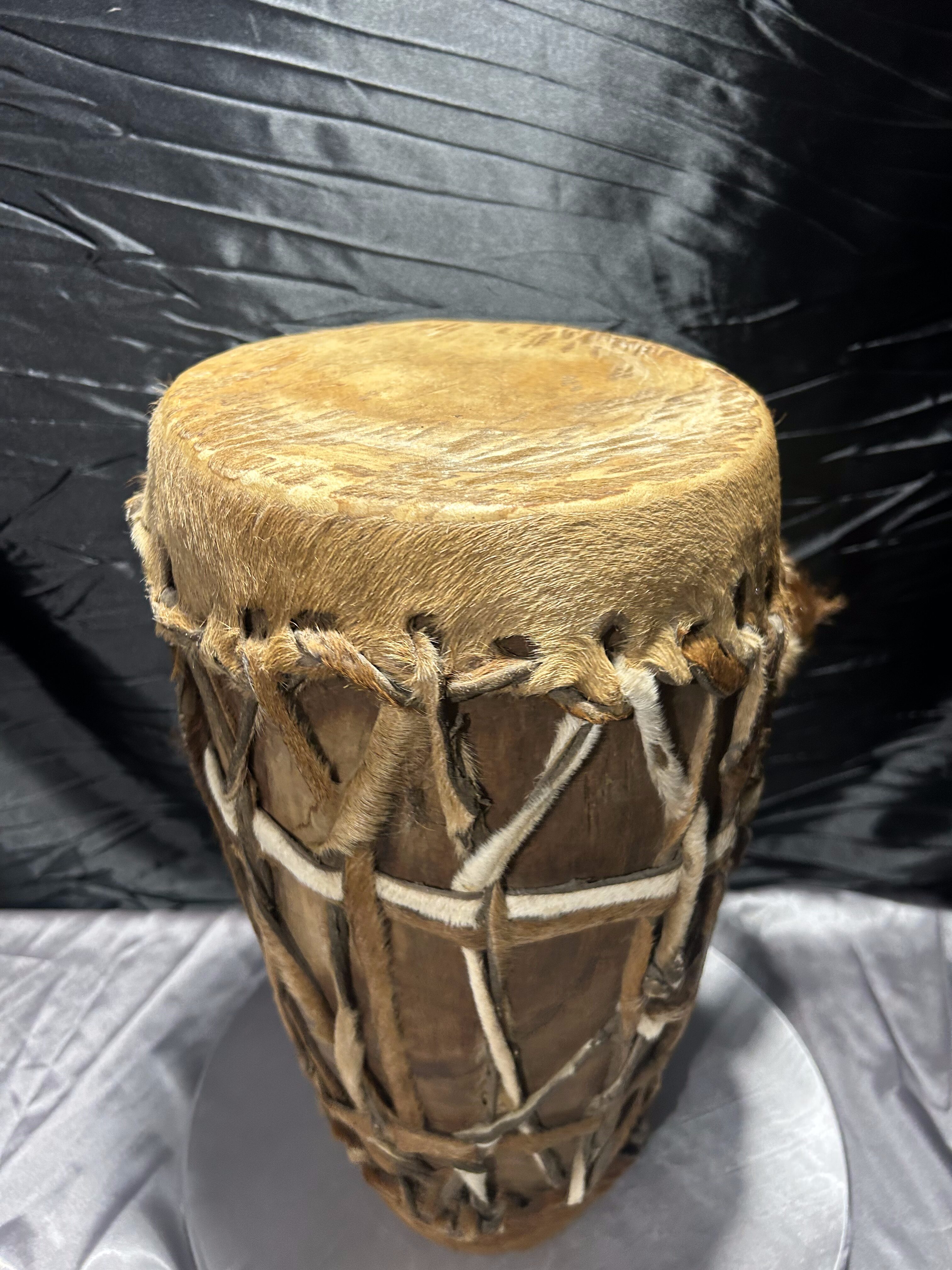 Oryginalny, tradycyjny bęben ngoma/engoma z regionu Wielkich Jezior Afryki (Burundi–Rwanda–Tanzania–Uganda). Korpus został wydrążony z jednego kawałka drewna, tworząc zwartą, beczułkowatą formę charakterystyczną dla autentycznych instrumentów rytualnych. Obie strony zamknięto jednoczęściowymi płatami surowej skóry – górny naciąg wygolony jest w polu gry, natomiast na bokach i przy wiązaniach zachowano naturalne włosie. Spód również wykonano z pełnej skóry, dzięki czemu instrument jest zamknięty i wydaje głębszy, rezonujący dźwięk.