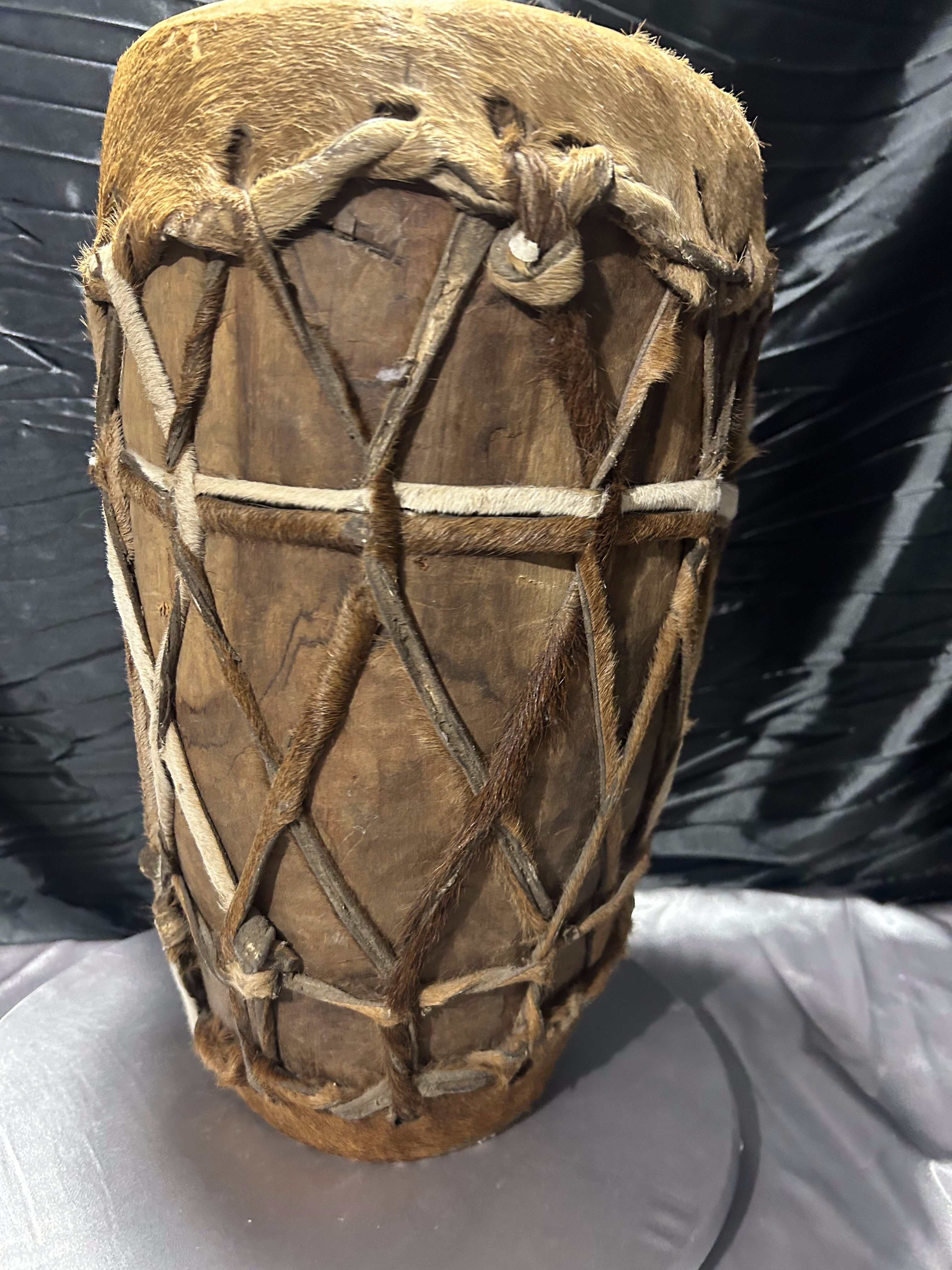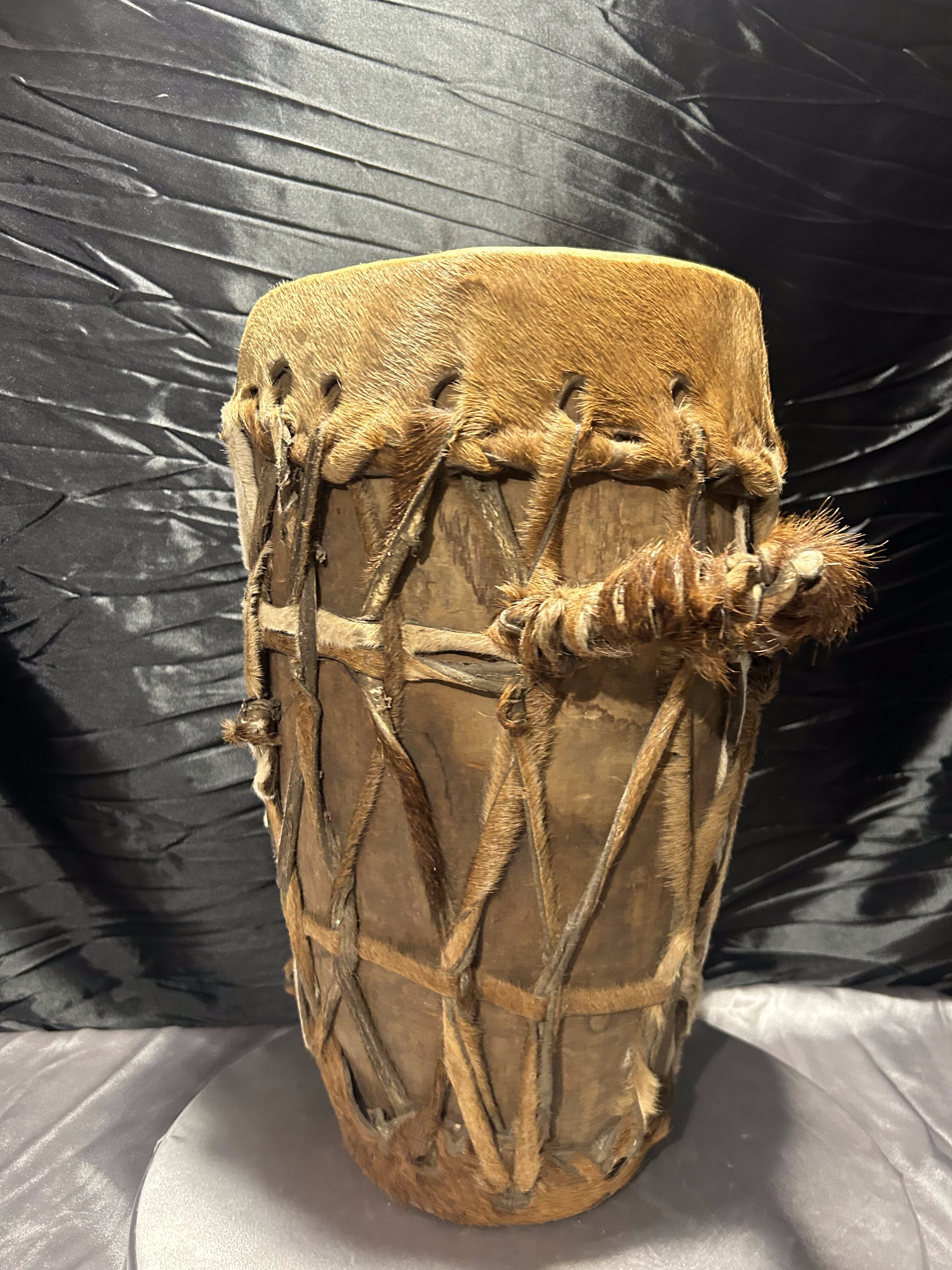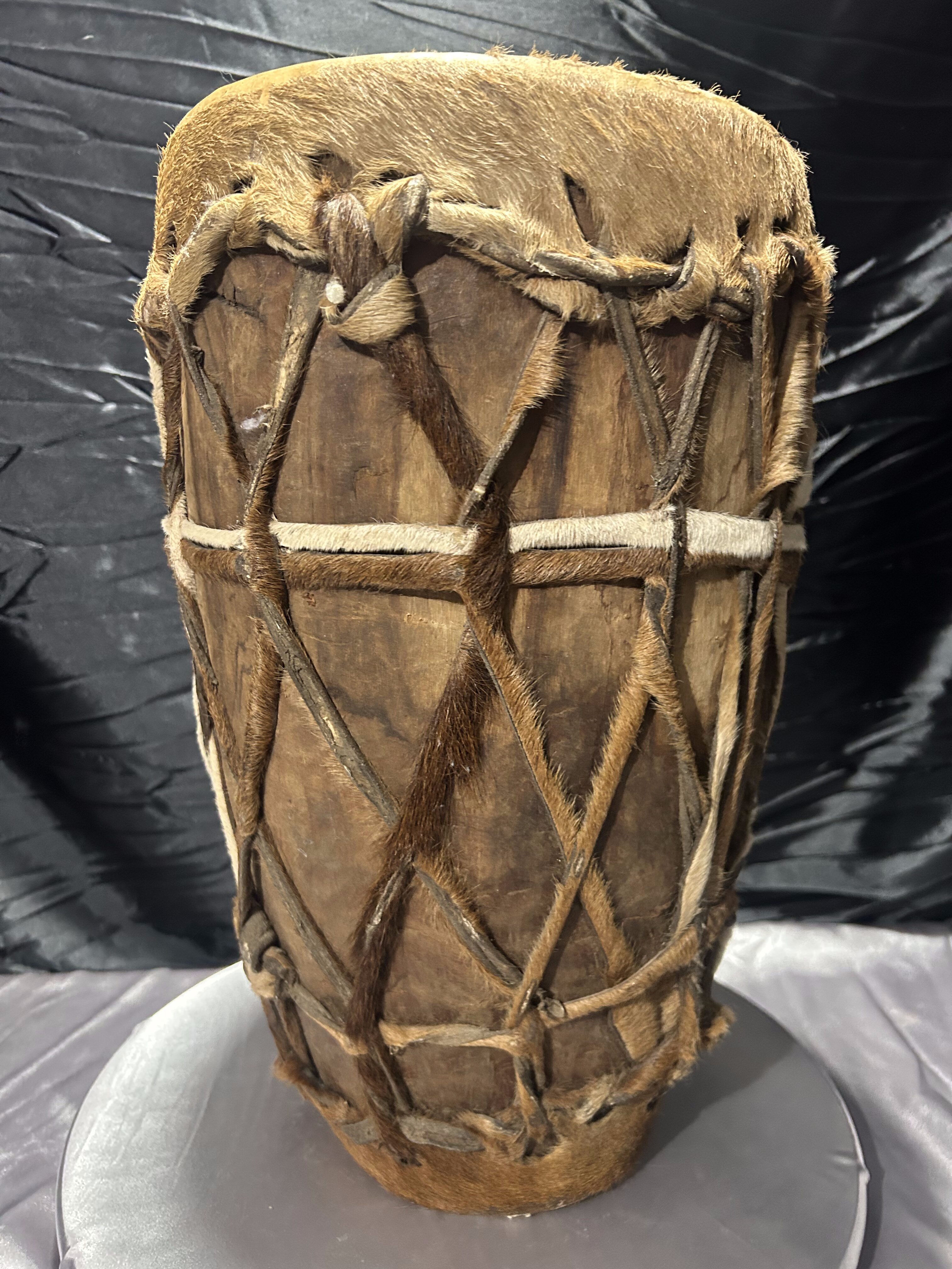 Oryginalny, tradycyjny bęben ngoma/engoma z regionu Wielkich Jezior Afryki (Burundi–Rwanda–Tanzania–Uganda). Korpus został wydrążony z jednego kawałka drewna, tworząc zwartą, beczułkowatą formę charakterystyczną dla autentycznych instrumentów rytualnych. Obie strony zamknięto jednoczęściowymi płatami surowej skóry – górny naciąg wygolony jest w polu gry, natomiast na bokach i przy wiązaniach zachowano naturalne włosie. Spód również wykonano z pełnej skóry, dzięki czemu instrument jest zamknięty i wydaje głębszy, rezonujący dźwięk.