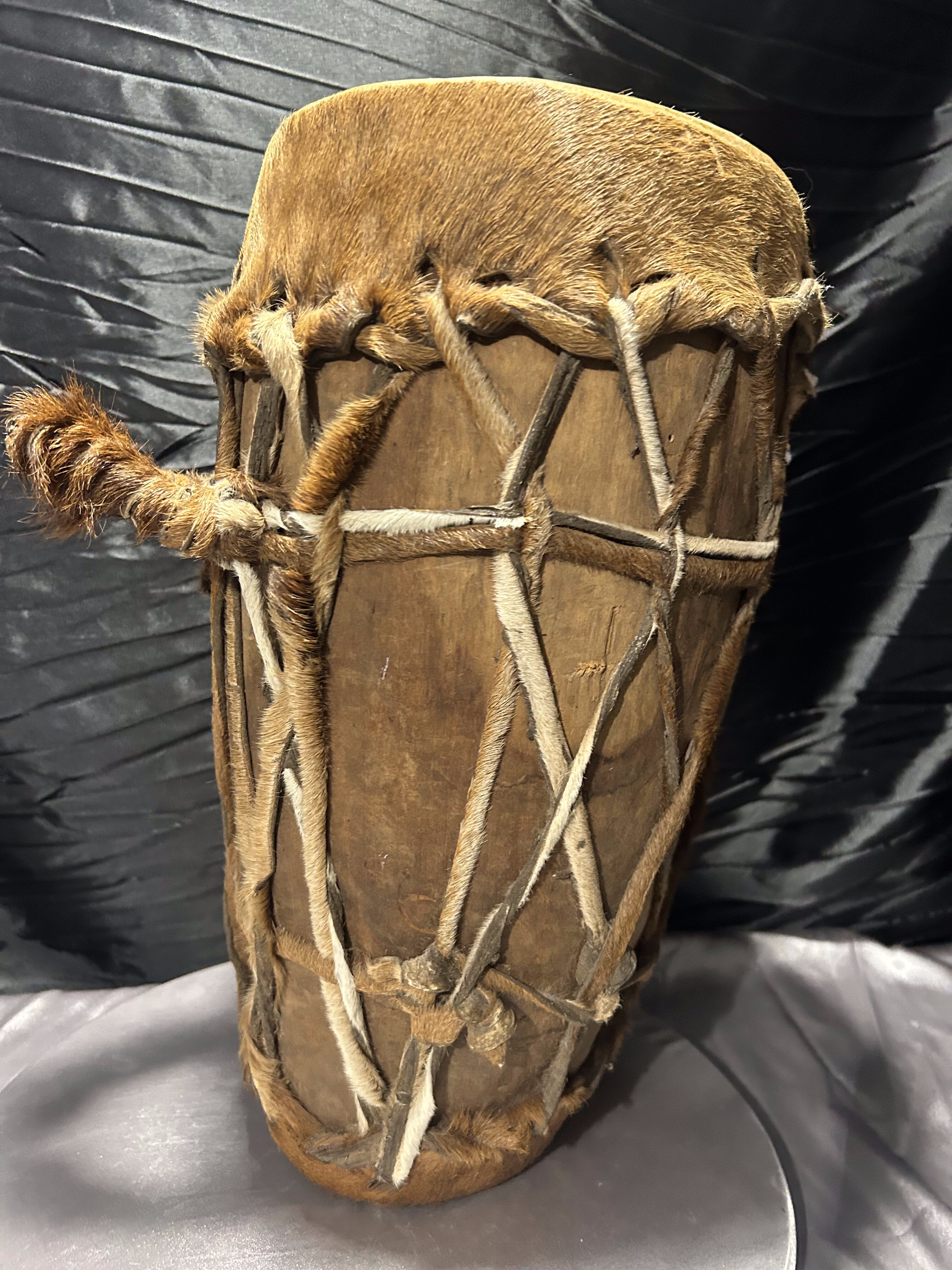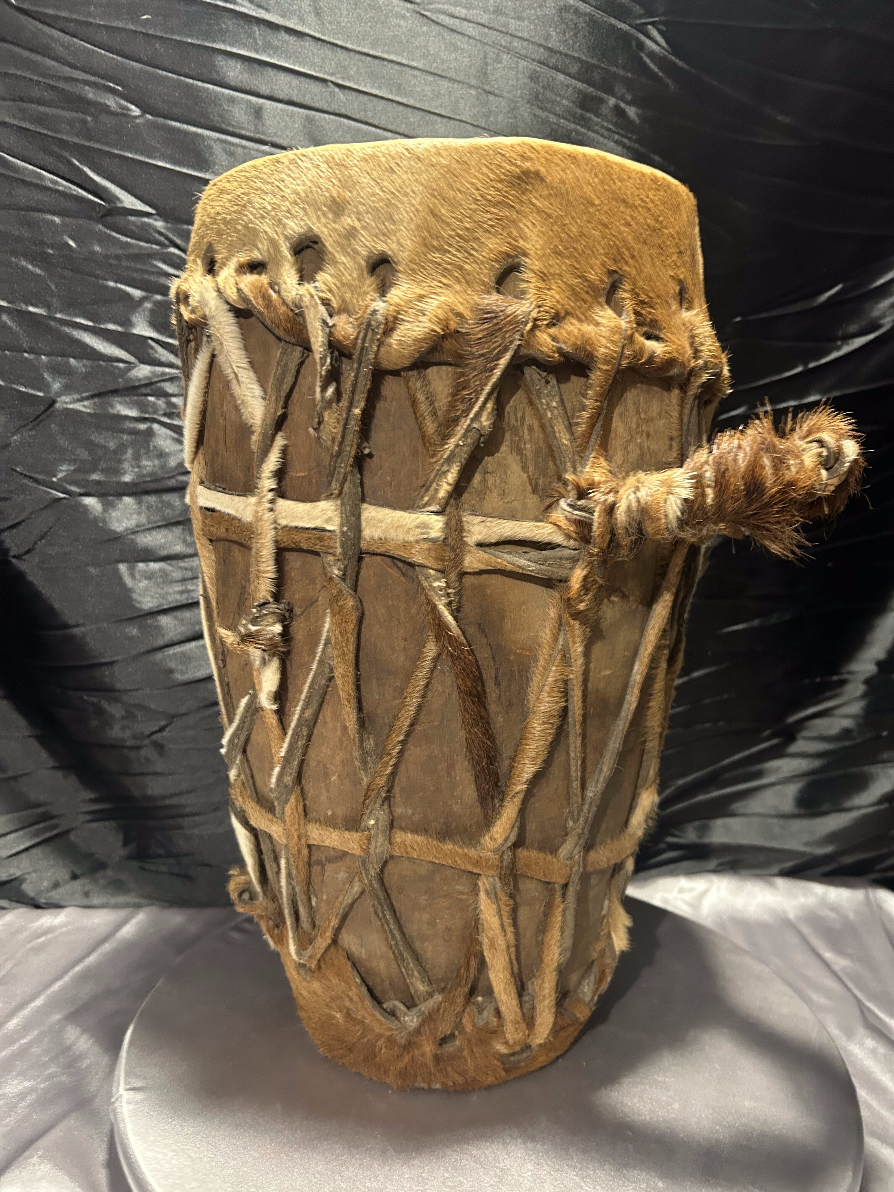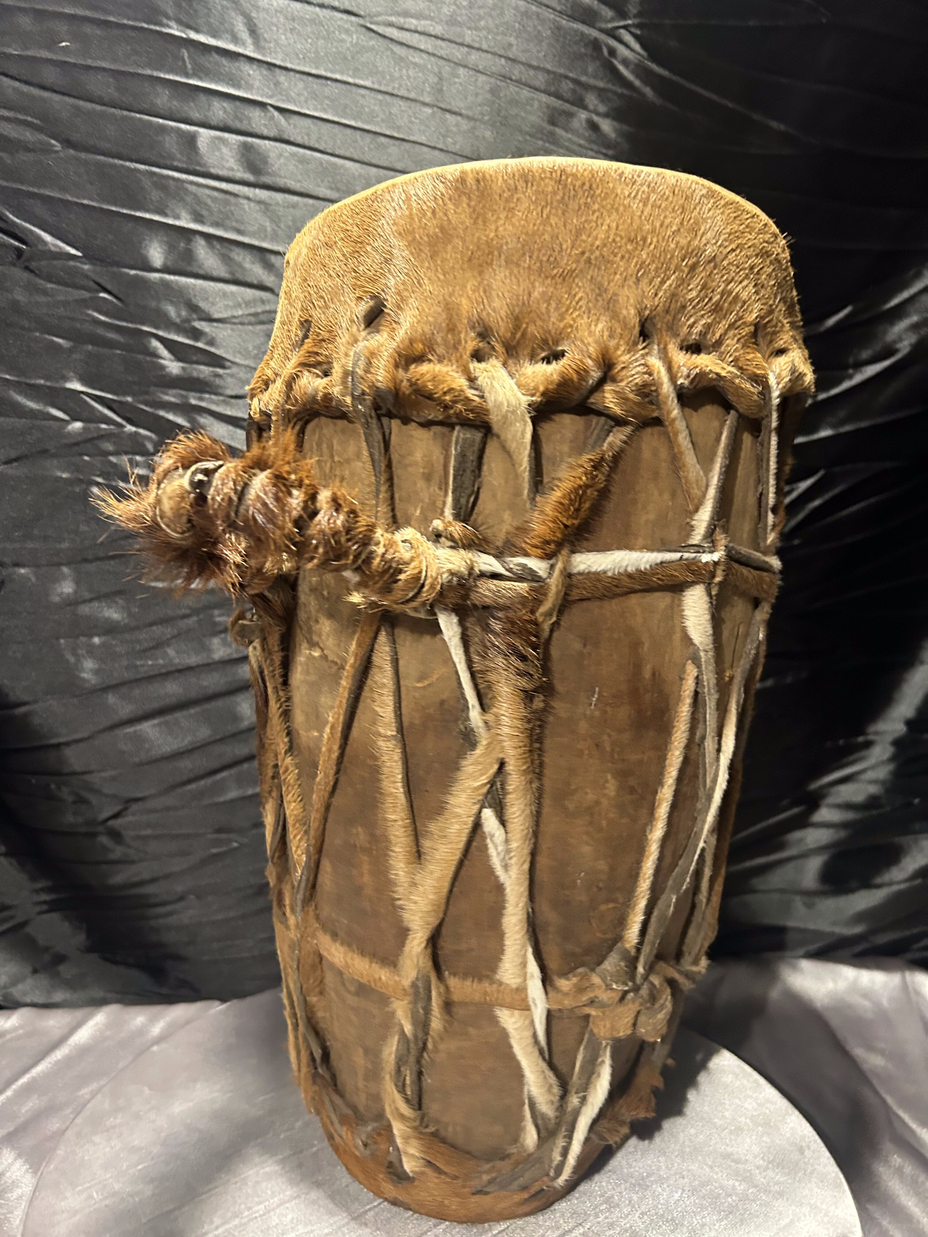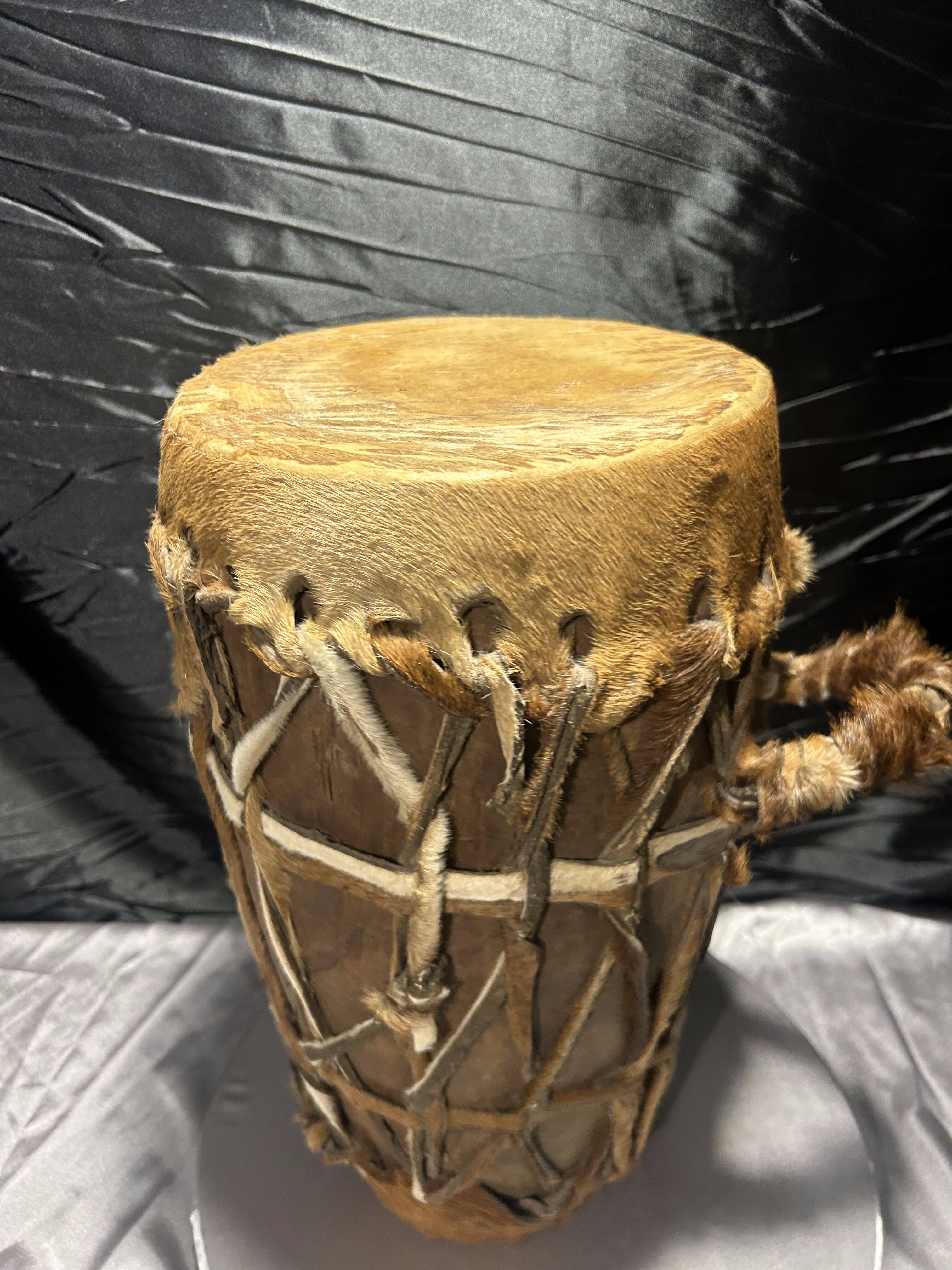 Oryginalny, tradycyjny bęben ngoma/engoma z regionu Wielkich Jezior Afryki (Burundi–Rwanda–Tanzania–Uganda). Korpus został wydrążony z jednego kawałka drewna, tworząc zwartą, beczułkowatą formę charakterystyczną dla autentycznych instrumentów rytualnych. Obie strony zamknięto jednoczęściowymi płatami surowej skóry – górny naciąg wygolony jest w polu gry, natomiast na bokach i przy wiązaniach zachowano naturalne włosie. Spód również wykonano z pełnej skóry, dzięki czemu instrument jest zamknięty i wydaje głębszy, rezonujący dźwięk.