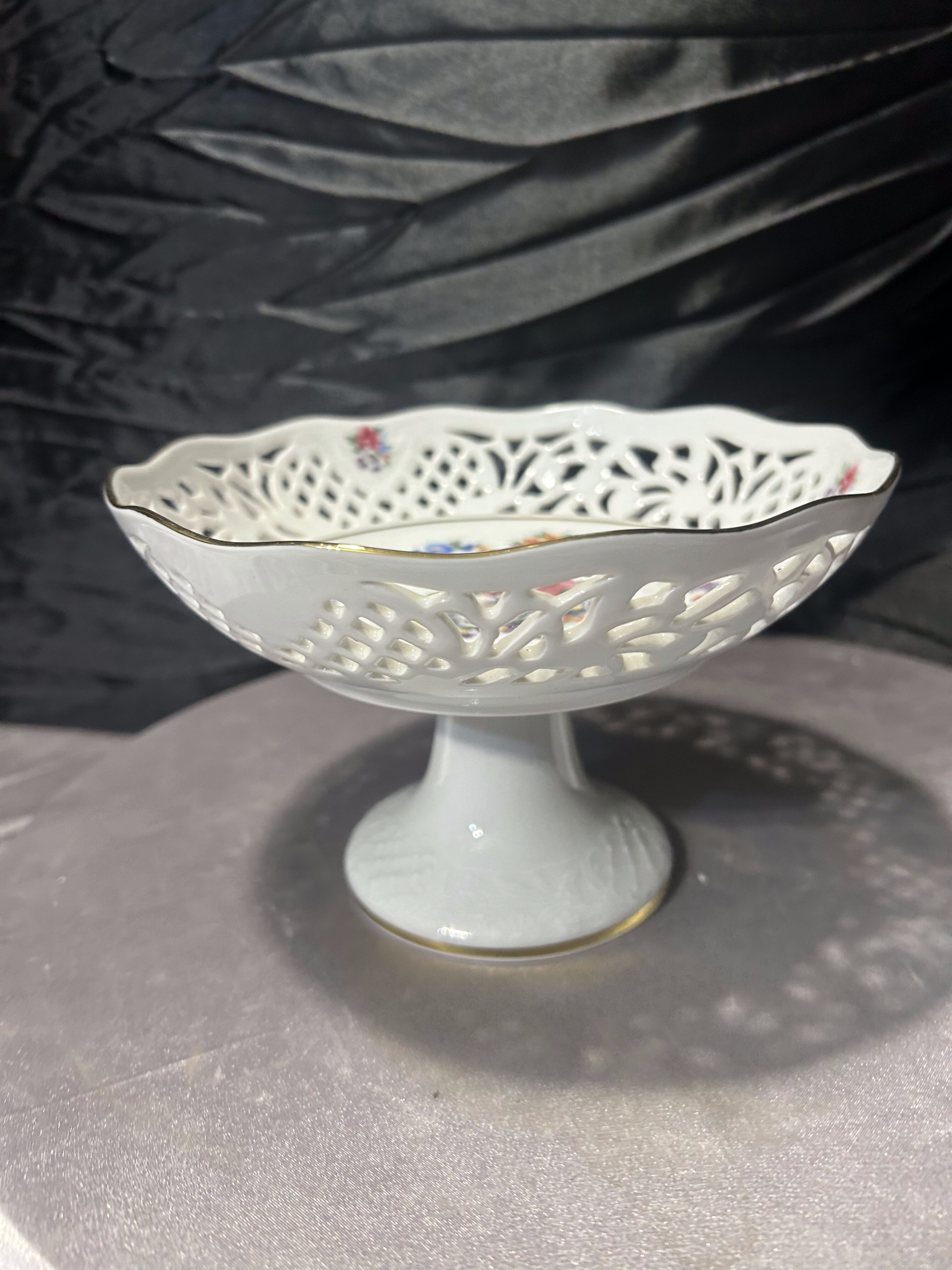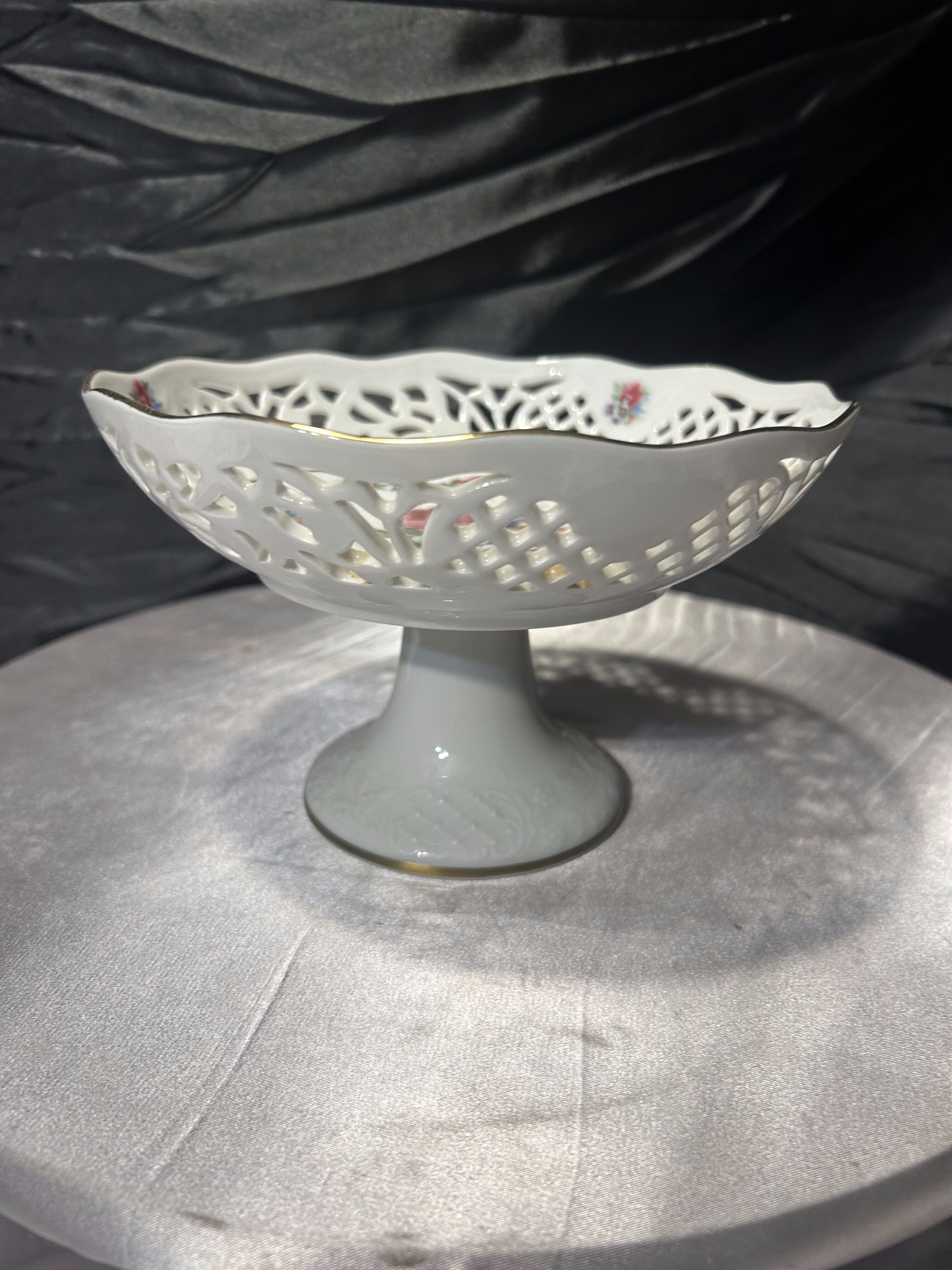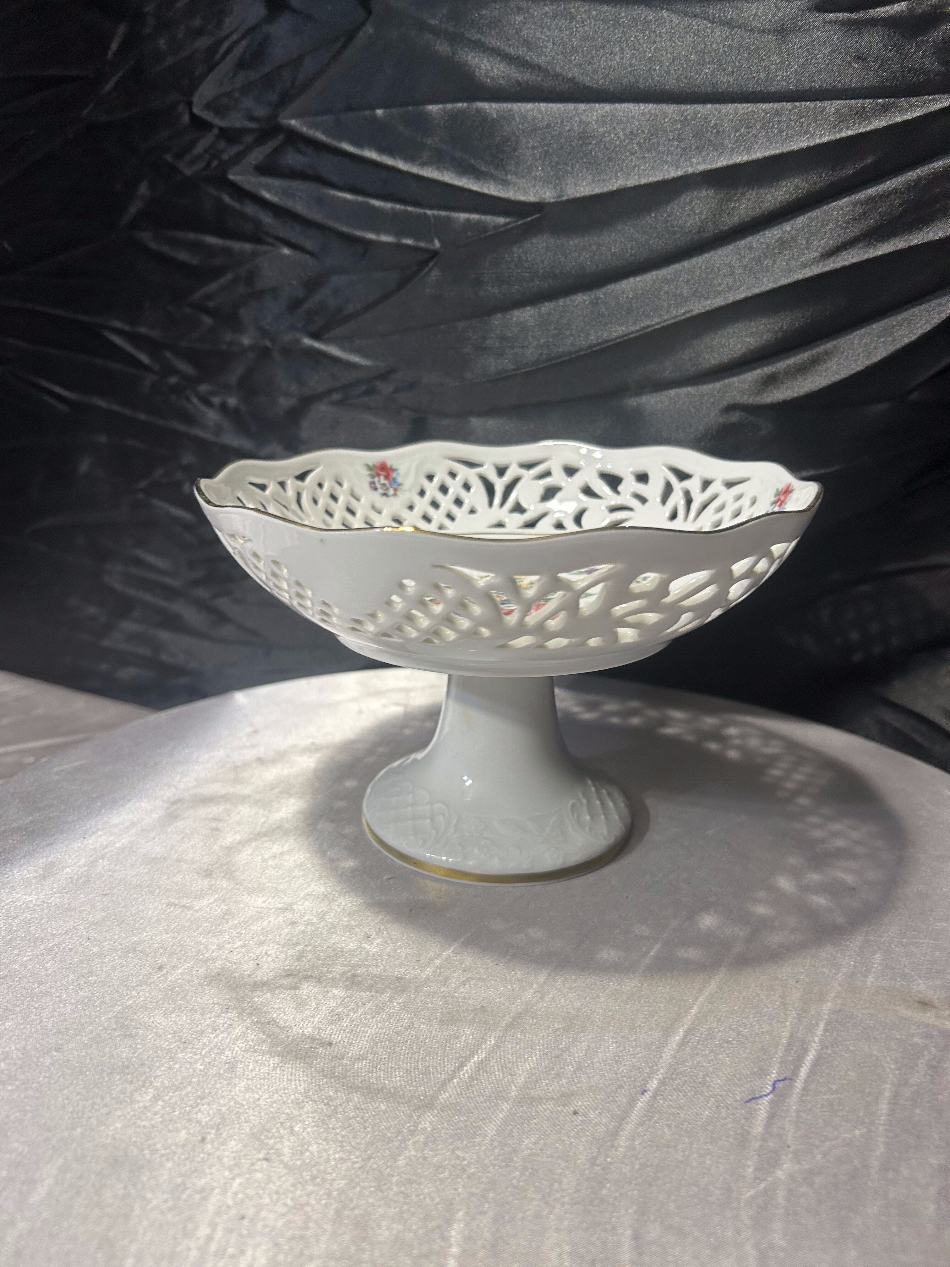 Elegancka patera na nodze wykonana z porcelany, ozdobiona ażurowym rantem oraz delikatnym, barwnym motywem kwiatowym. Centralna dekoracja przedstawia bukiet kwiatów otoczony subtelnym wieńcem roślinnym, a całość podkreślona jest cienką złoconą linią.
