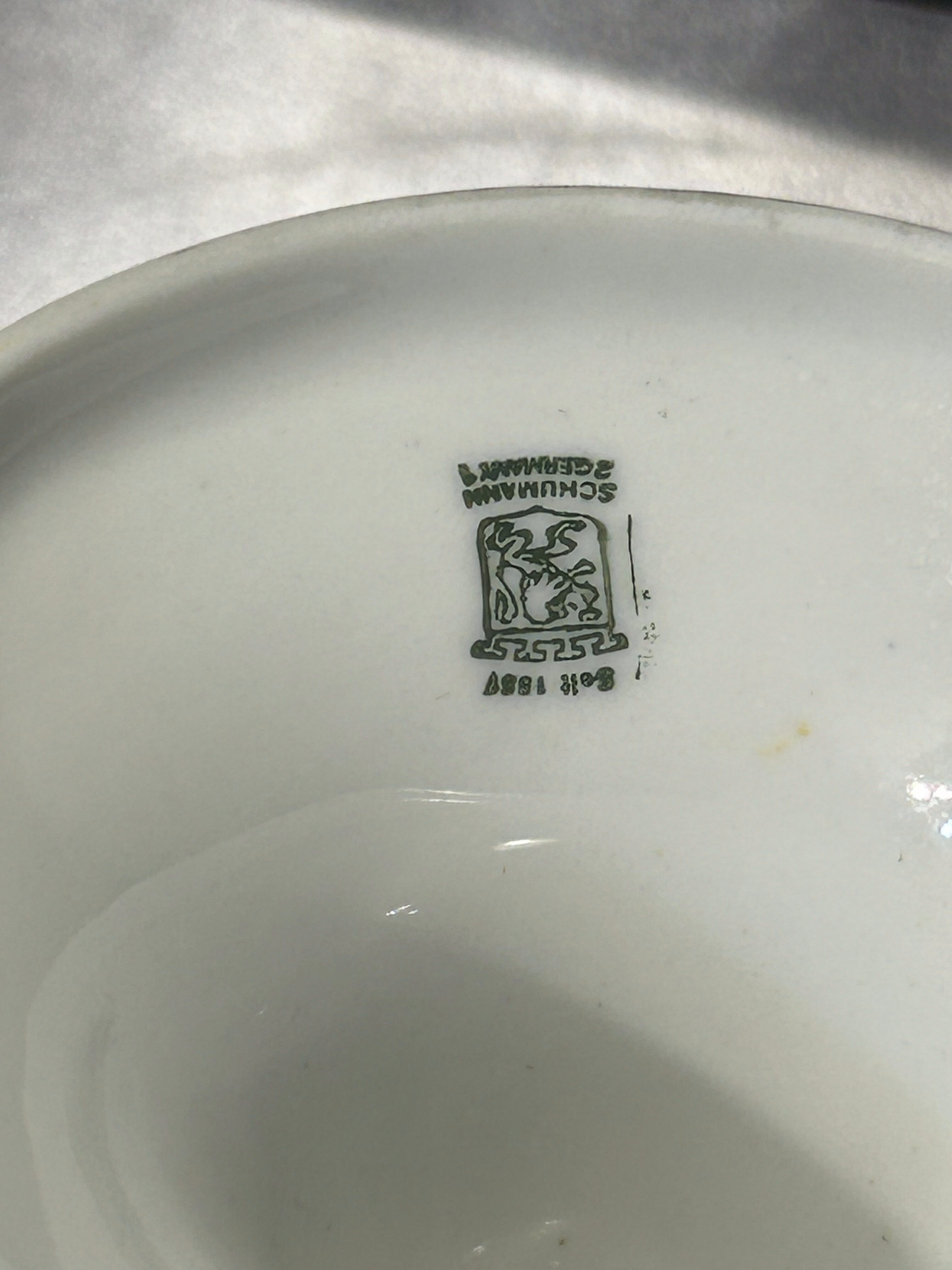 Na spodzie znajduje się sygnatura niemieckiej manufaktury porcelany Schumann Arzberg Bavaria, działającej w Bawarii i znanej z wysokiej jakości porcelany stołowej. Wyroby tej wytwórni były popularne szczególnie w połowie XX wieku i cenione za elegancję oraz staranne wykonanie.