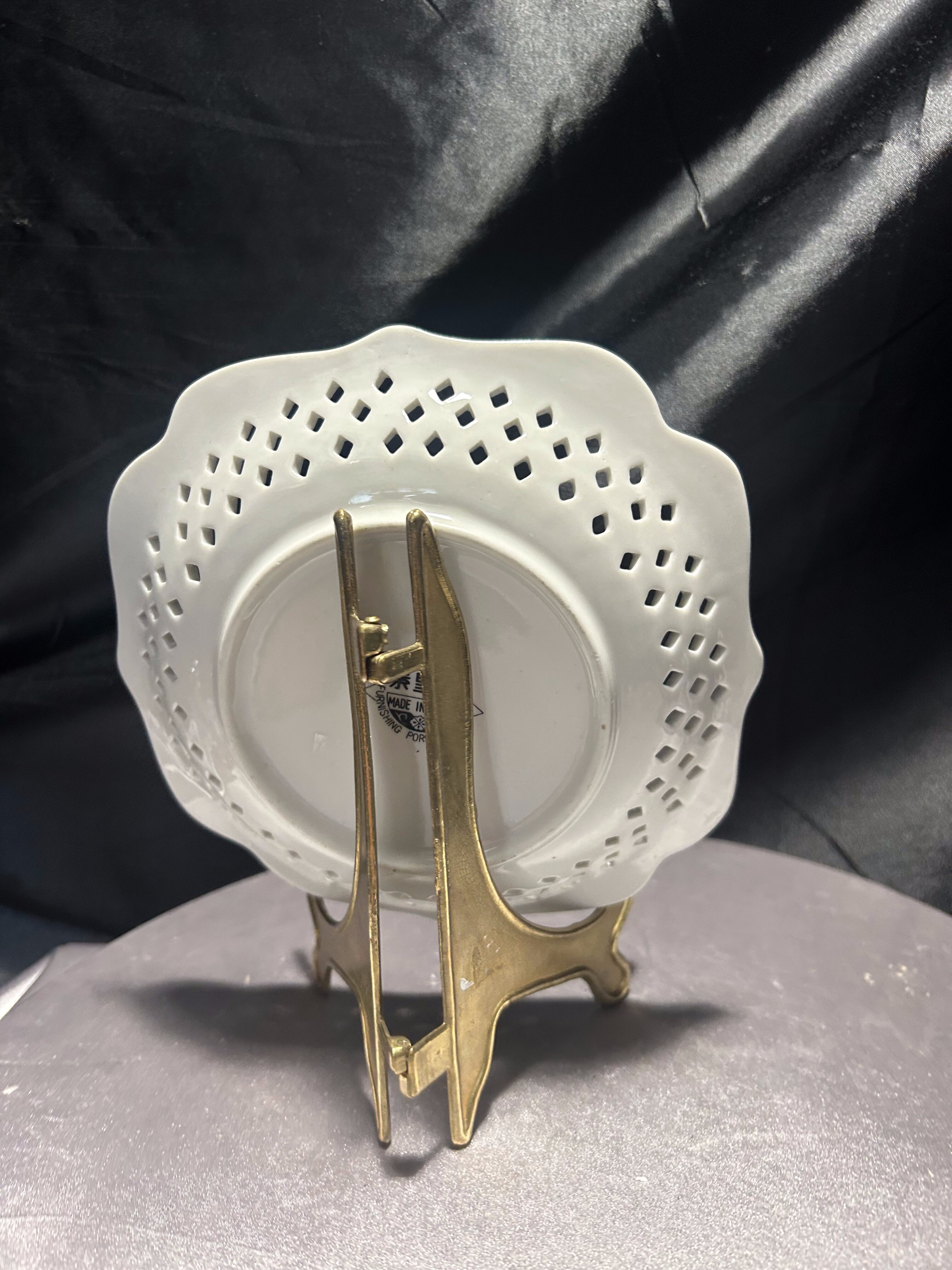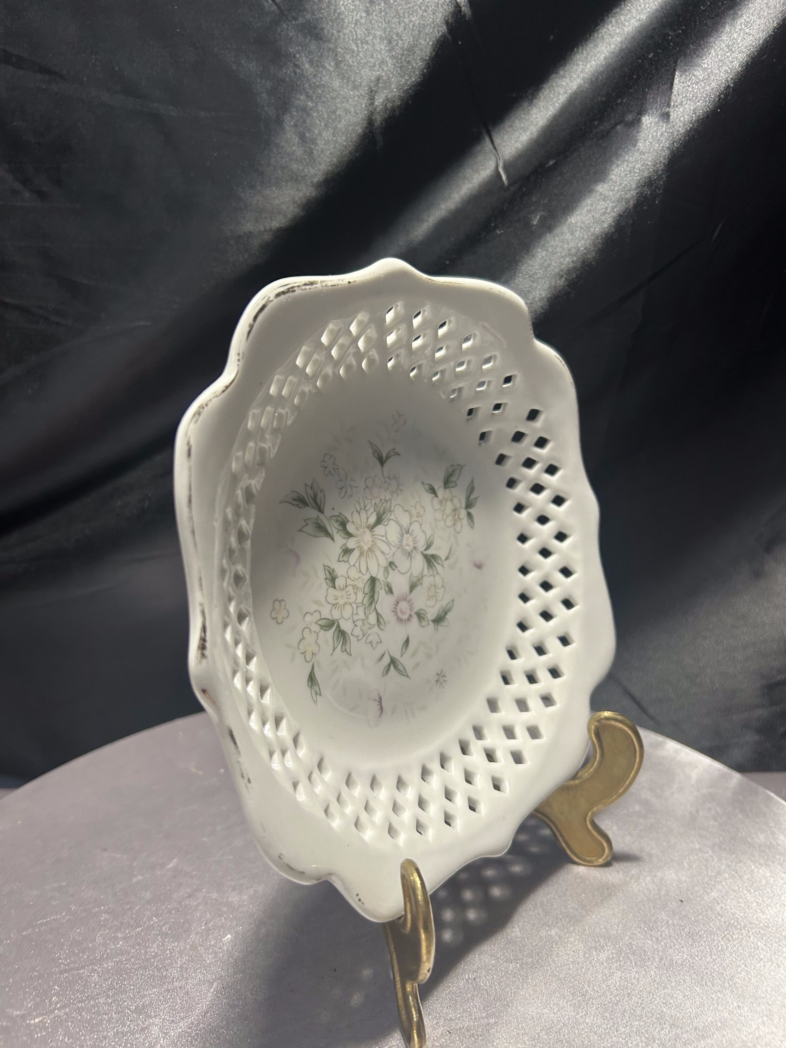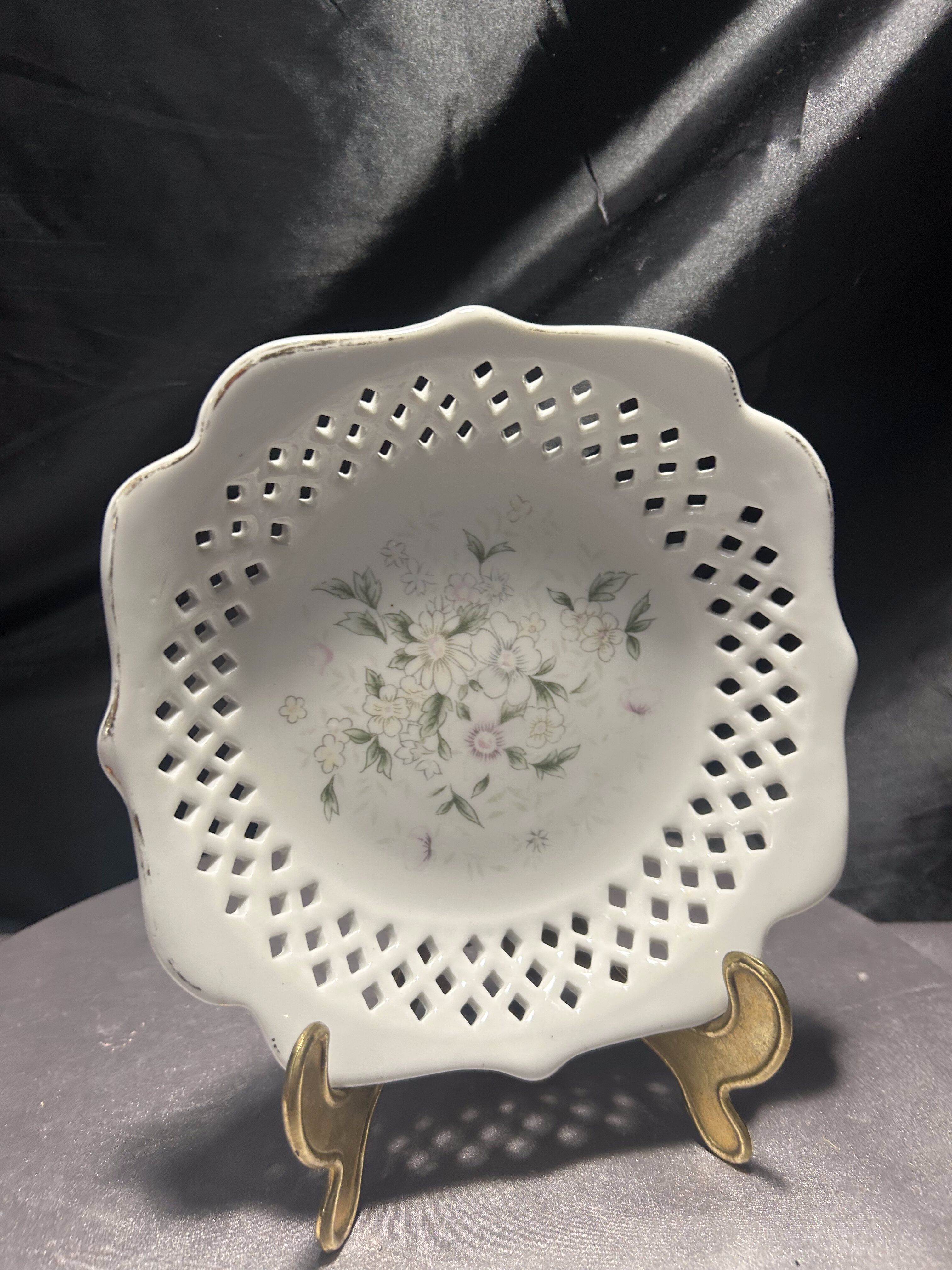 Delikatna porcelanowa patera z dekoracyjnym ażurowym rantem, wyprodukowana w Chinach przez Furnishing Porcelainwares. Centralną część zdobi subtelny motyw kwiatowy w pastelowych odcieniach bieli, różu i zieleni. Ażurowa koronka wokół talerza dodaje mu lekkości i elegancji, sprawiając, że doskonale odnajdzie się zarówno jako element dekoracyjny, jak i praktyczne naczynie na drobne wypieki czy owoce. Stan zachowania bardzo dobry. Sprzedawana bez stojaka widocznego na zdjęciach.