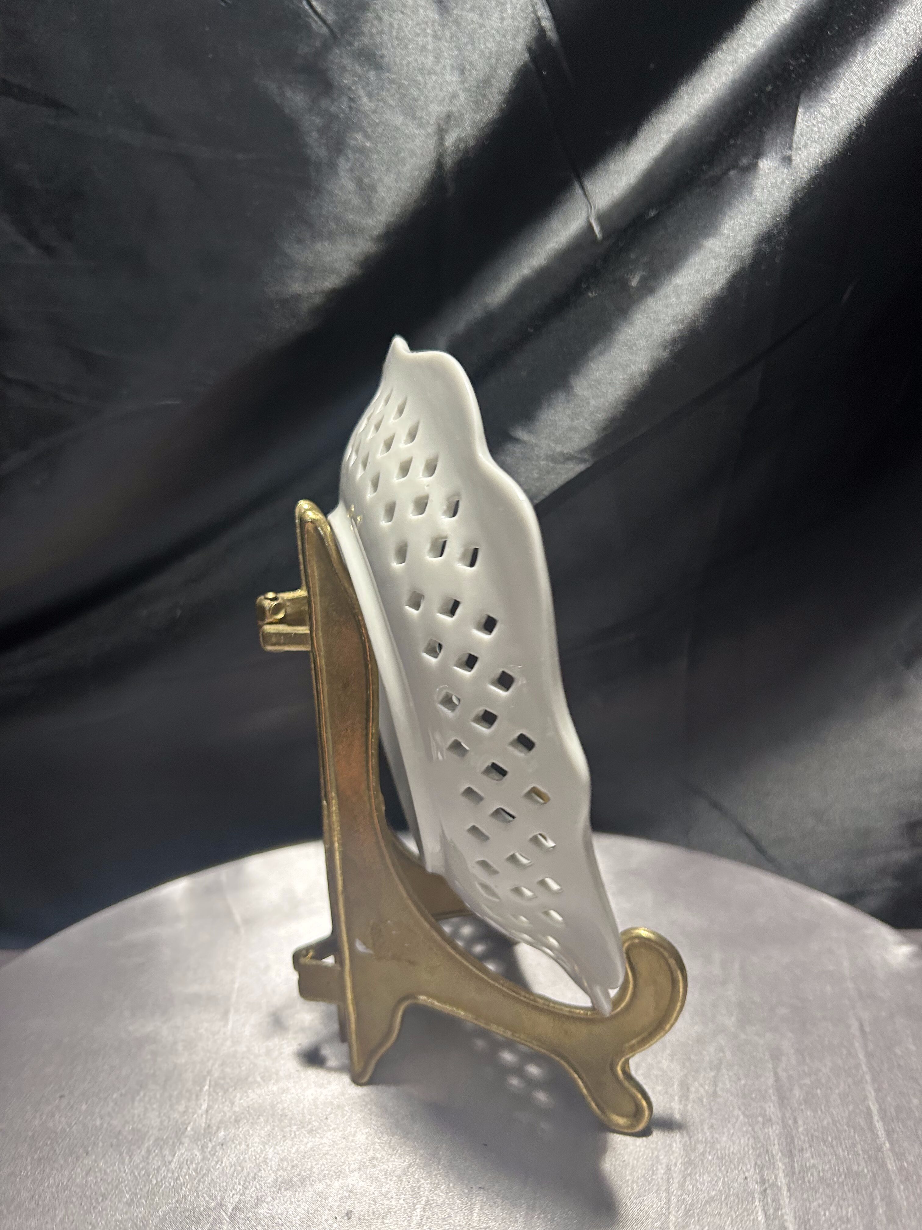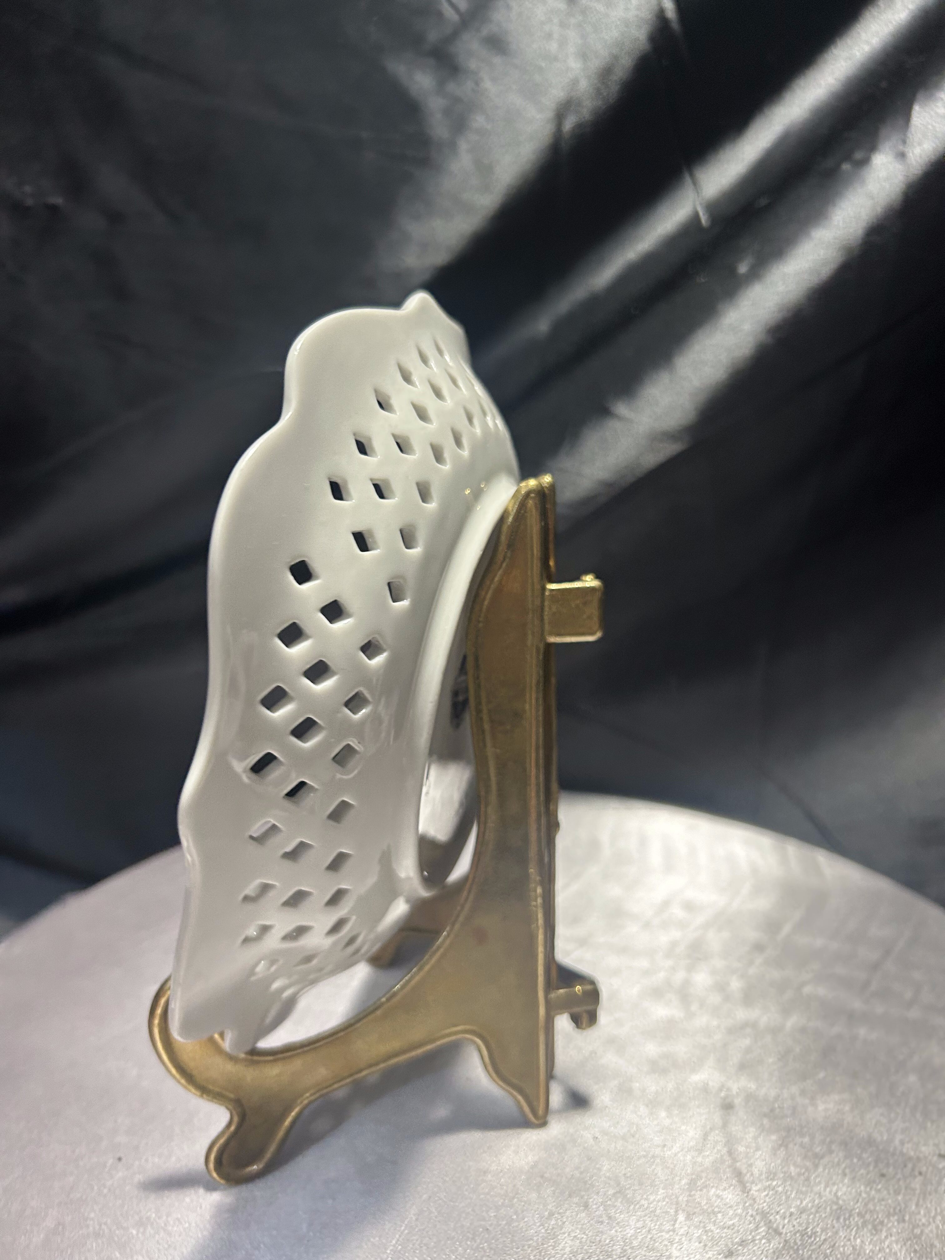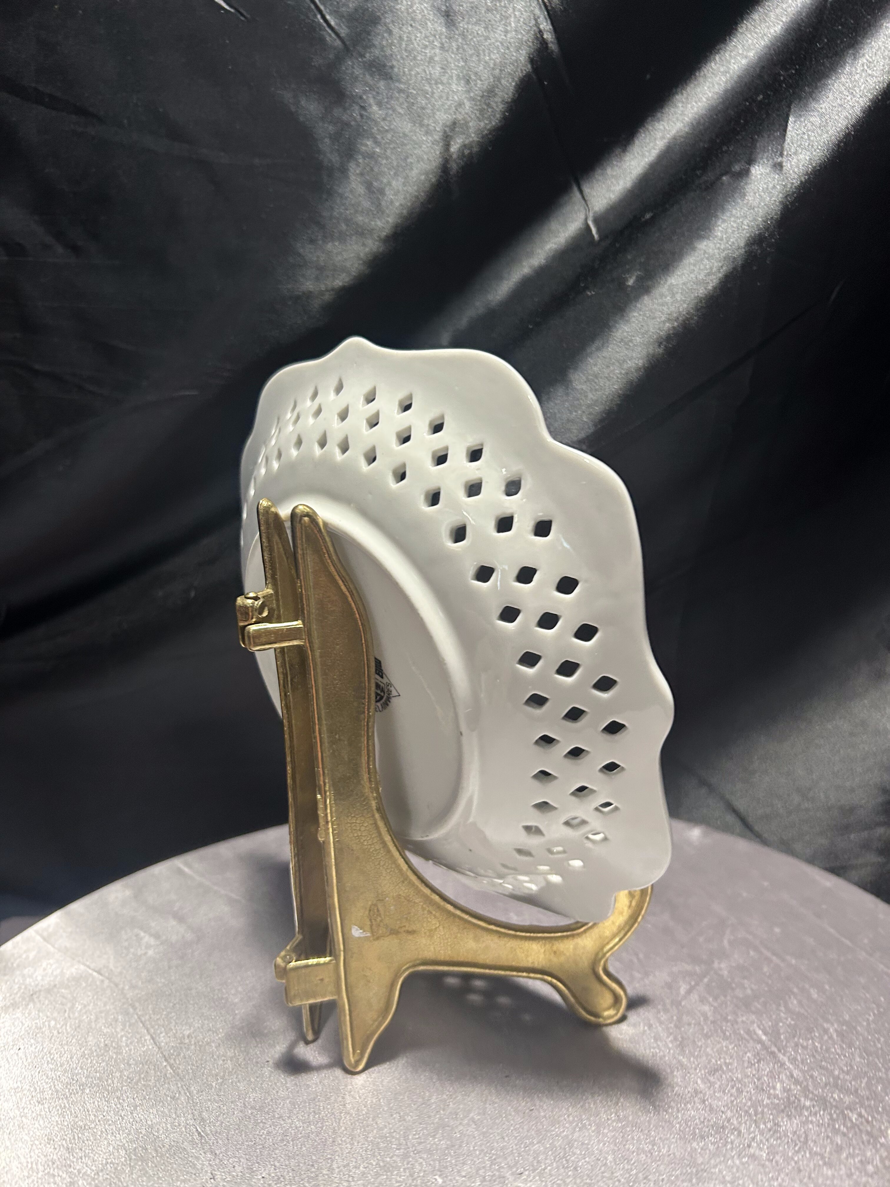 Delikatna porcelanowa patera z dekoracyjnym ażurowym rantem, wyprodukowana w Chinach przez Furnishing Porcelainwares. Centralną część zdobi subtelny motyw kwiatowy w pastelowych odcieniach bieli, różu i zieleni. Ażurowa koronka wokół talerza dodaje mu lekkości i elegancji, sprawiając, że doskonale odnajdzie się zarówno jako element dekoracyjny, jak i praktyczne naczynie na drobne wypieki czy owoce. Stan zachowania bardzo dobry. Sprzedawana bez stojaka widocznego na zdjęciach.