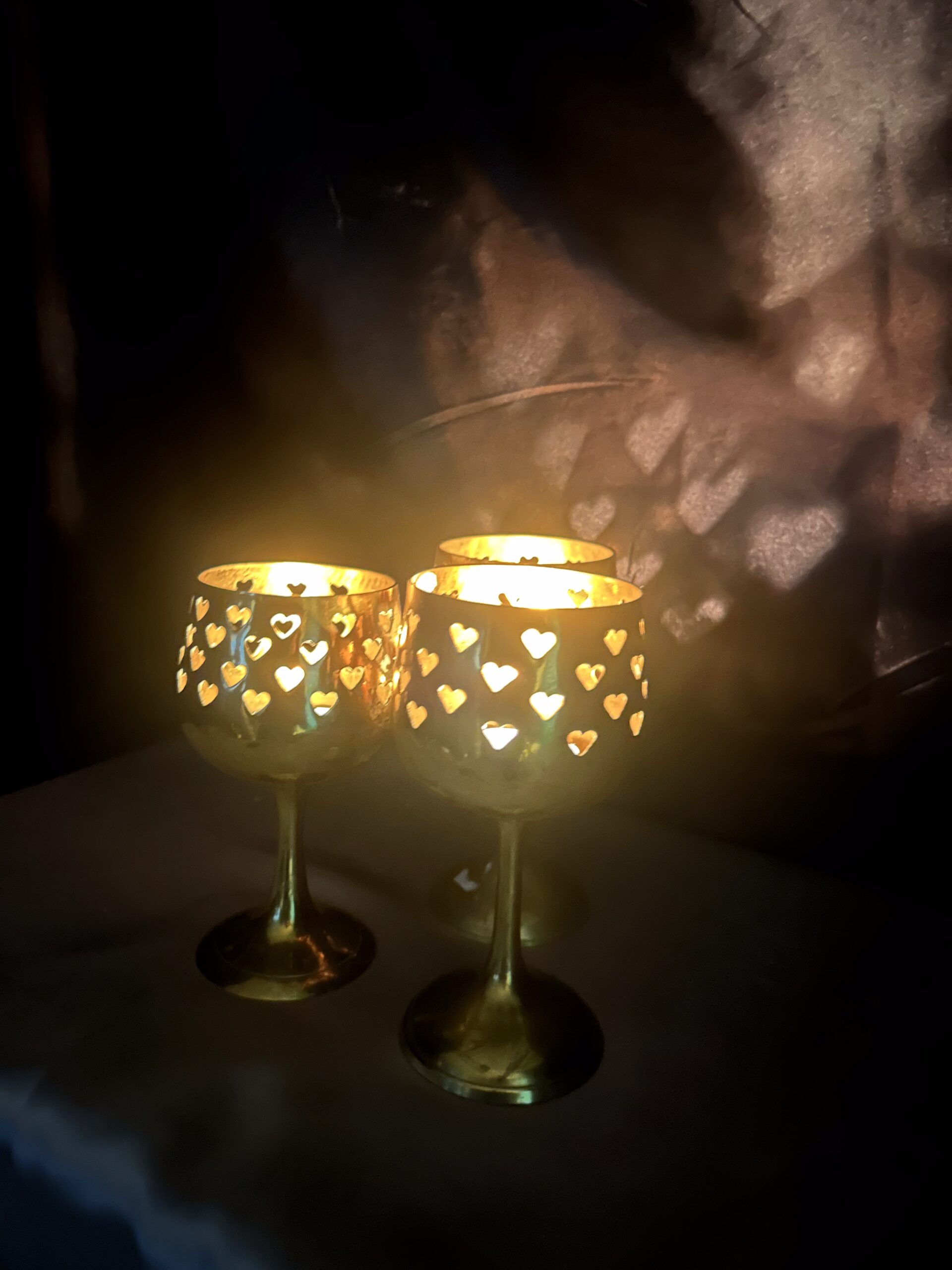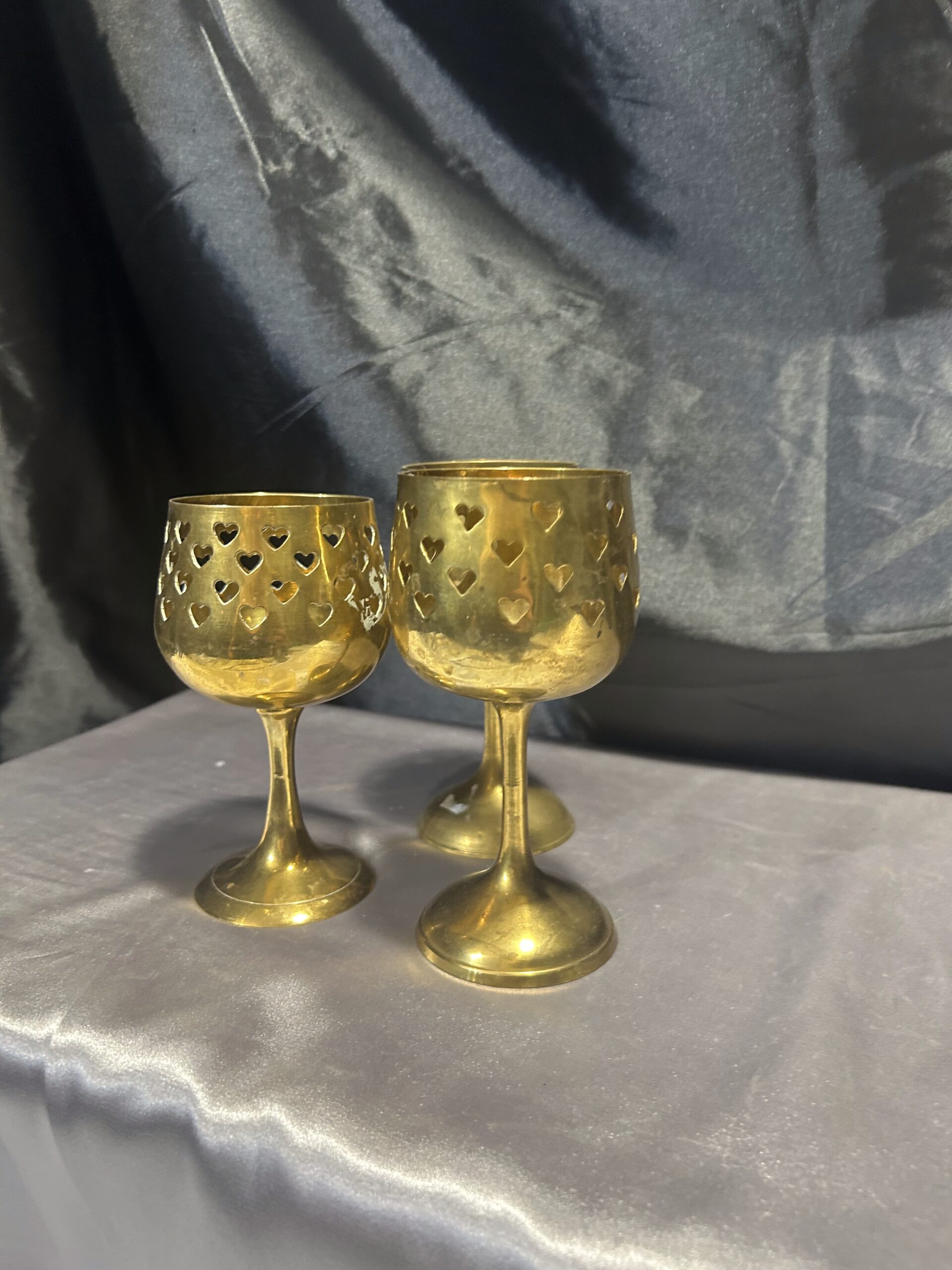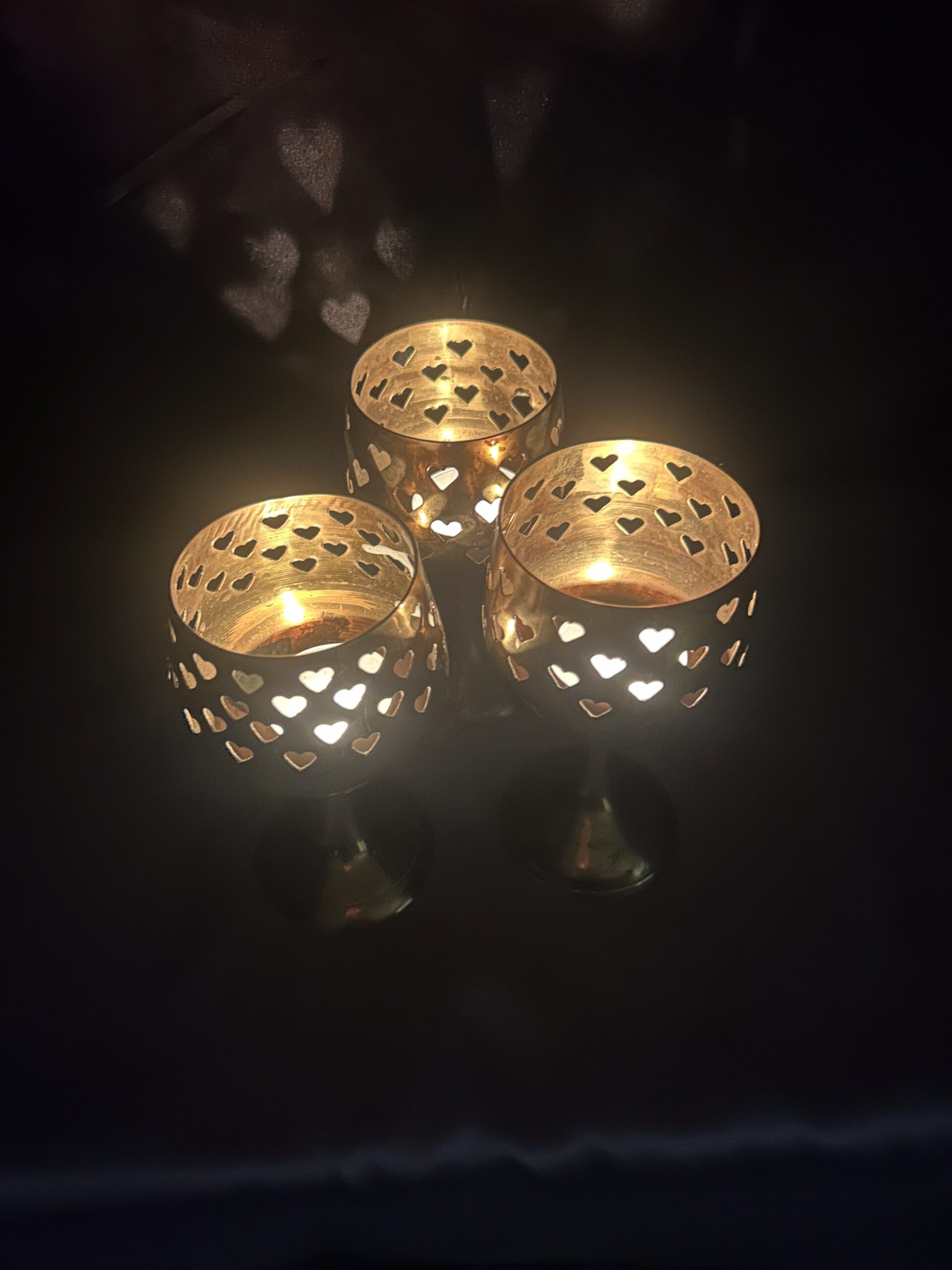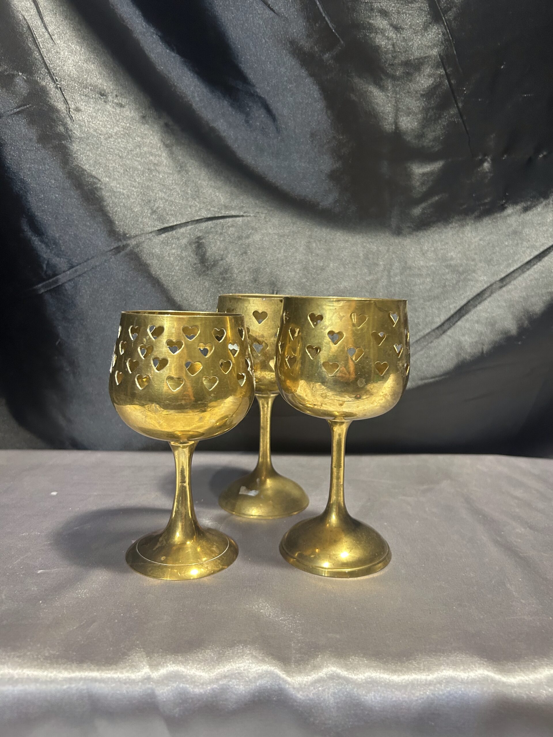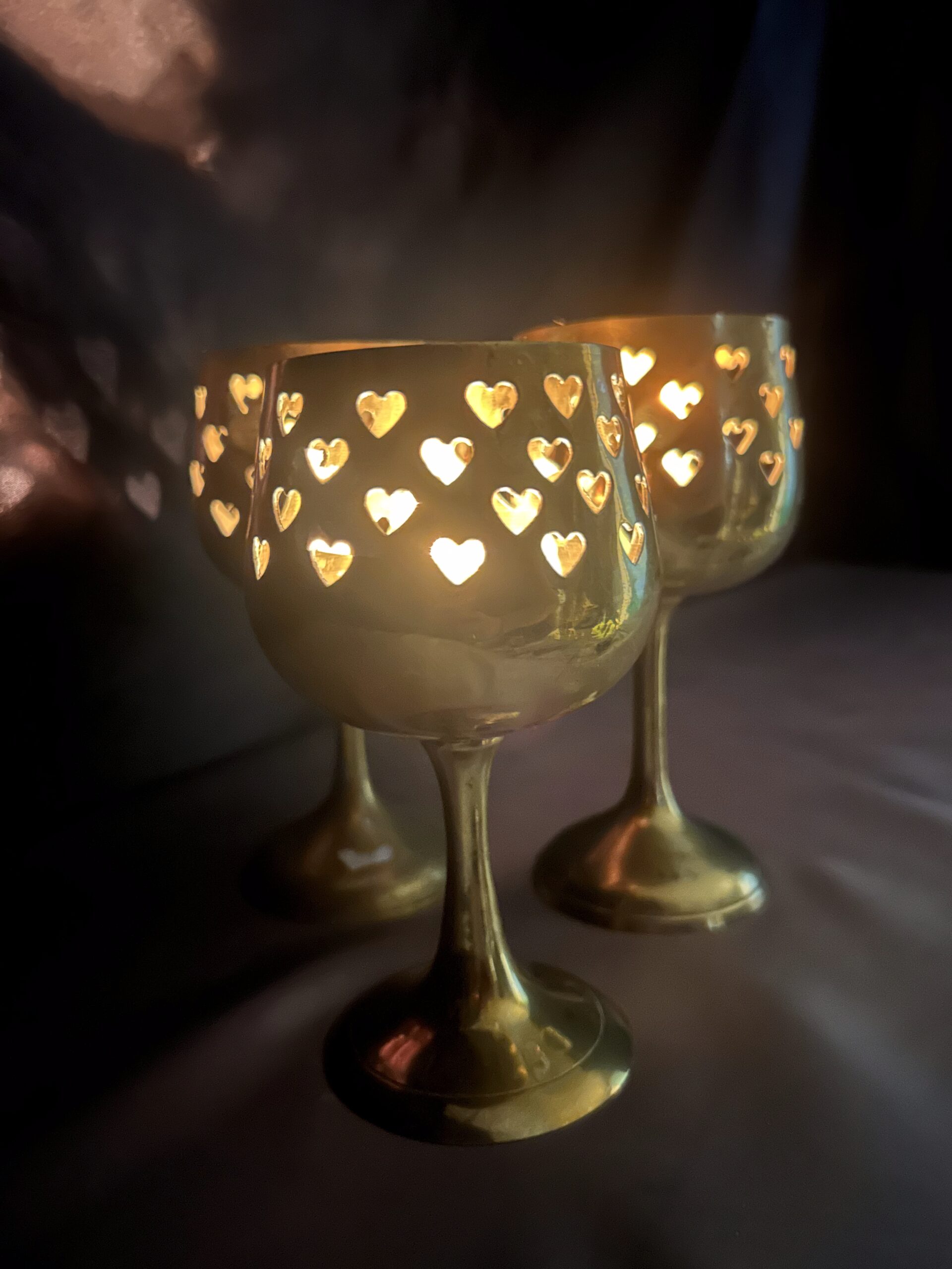 Przedmiotem oferty jest elegancki zestaw trzech mosiężnych świeczników w formie kieliszków, przeznaczonych na tealighty. Każdy świecznik został ozdobiony ażurowym wzorem z serduszkami, co nadaje im subtelnego uroku i pięknie rozprasza światło świecy. Dzięki wyjątkowej formie i klasycznemu wykonaniu świetnie sprawdzą się jako dekoracja wnętrza, dodając mu ciepłej i romantycznej atmosfery.