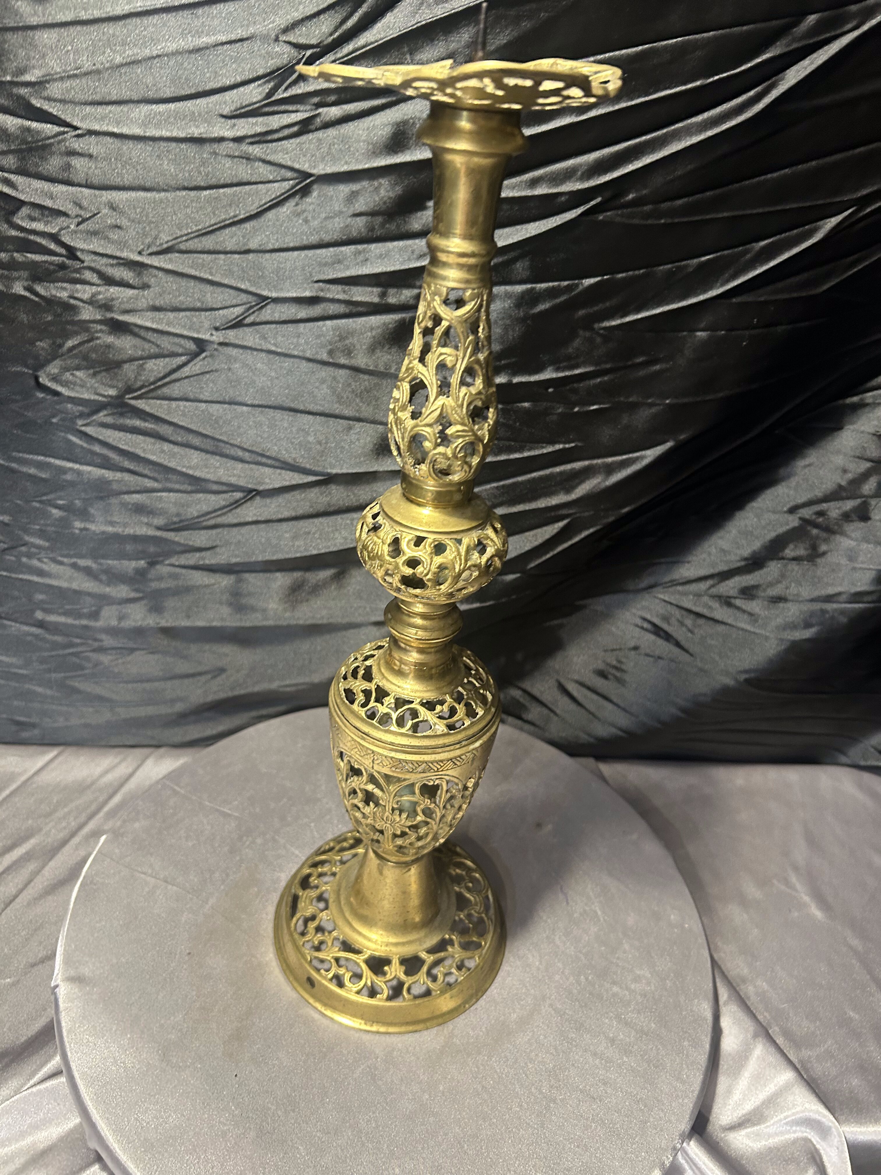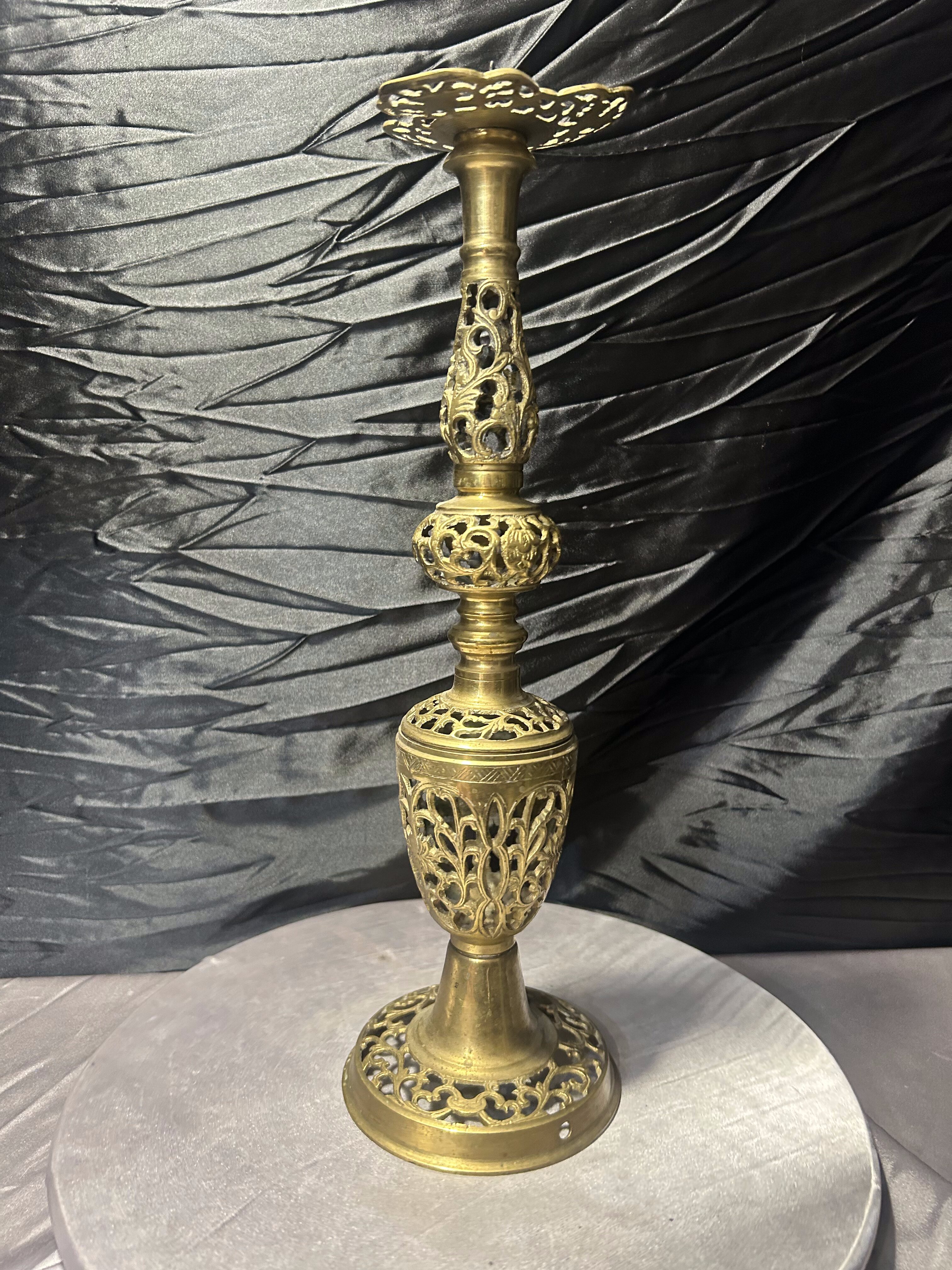 Ażurowy świecznik z mosiądzu – wysoki lichtarz dekoracyjny