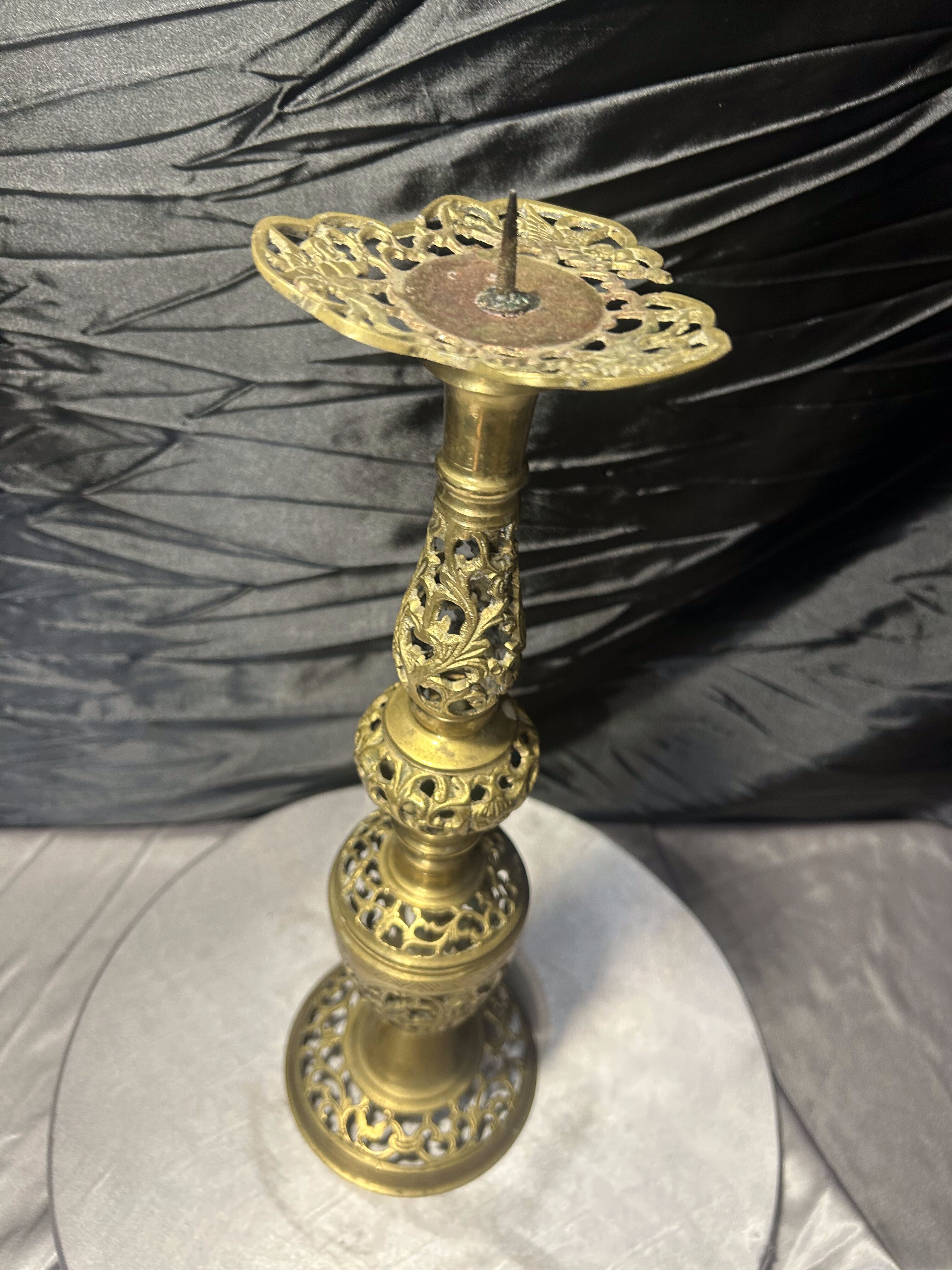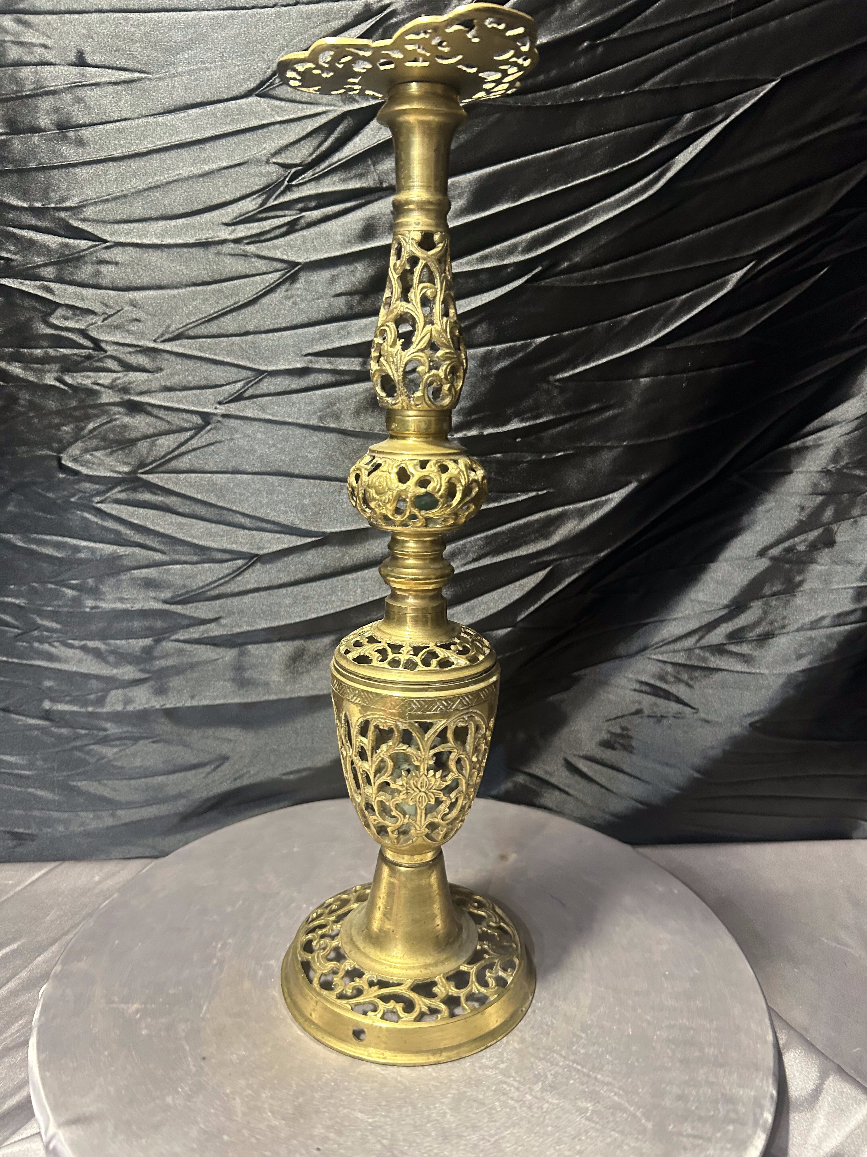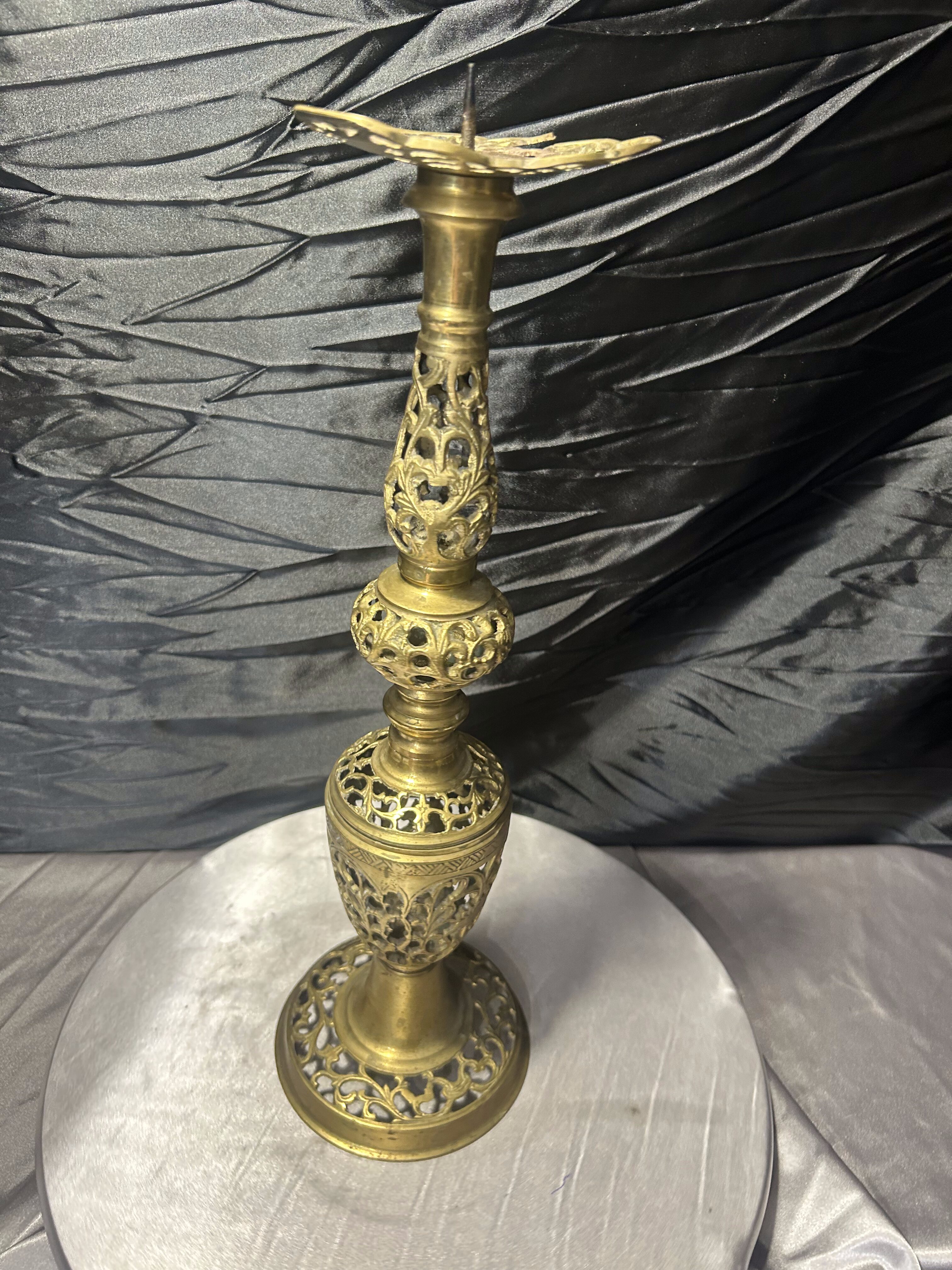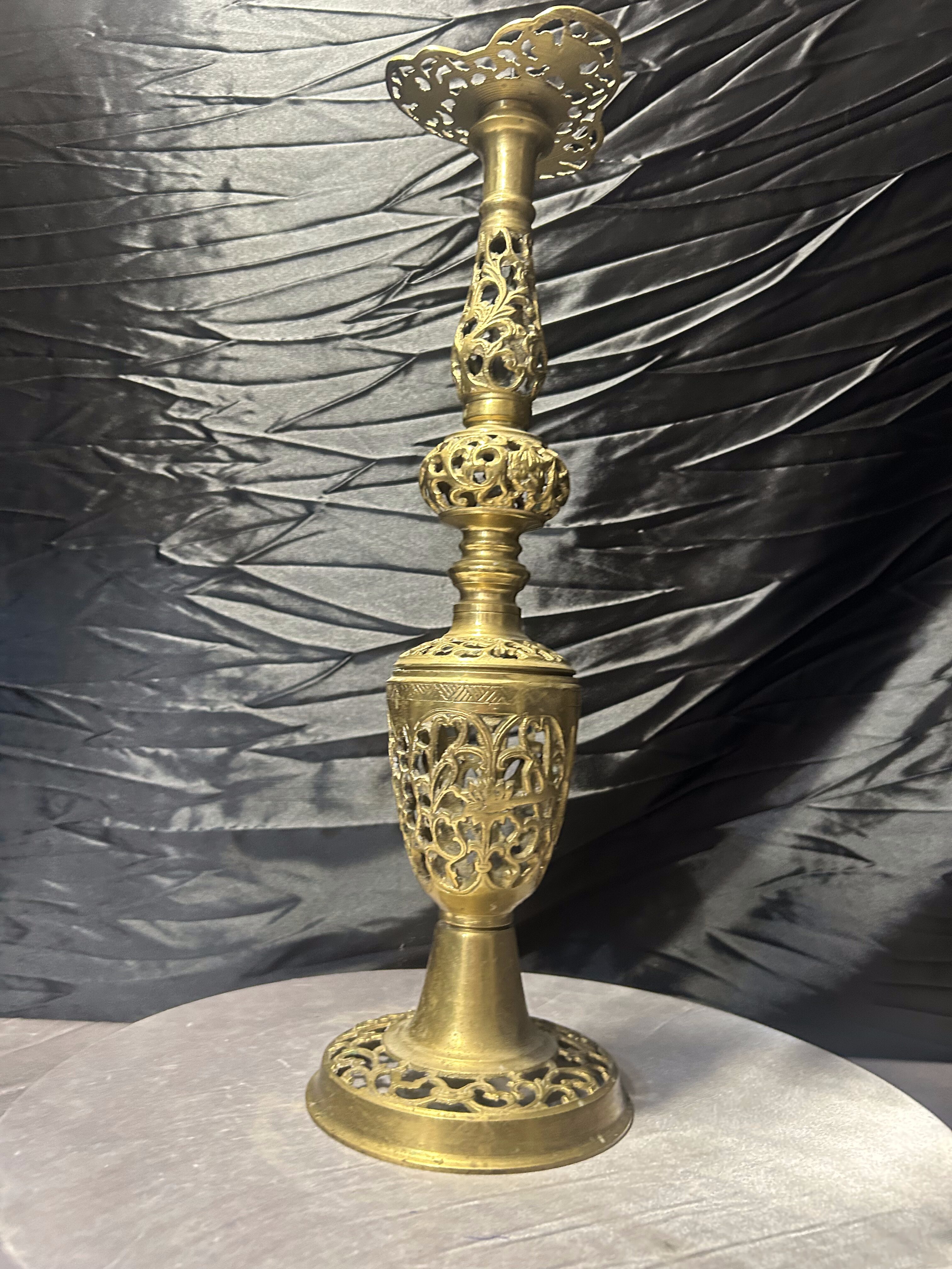 Efektowny, wysoki świecznik wykonany z mosiądzu, wyróżniający się bogato zdobioną, ażurową formą. Konstrukcja składa się z kilku dekoracyjnych segmentów z finezyjnym ornamentem roślinnym, tworząc elegancką, smukłą sylwetkę o wyjątkowo dekoracyjnym charakterze.