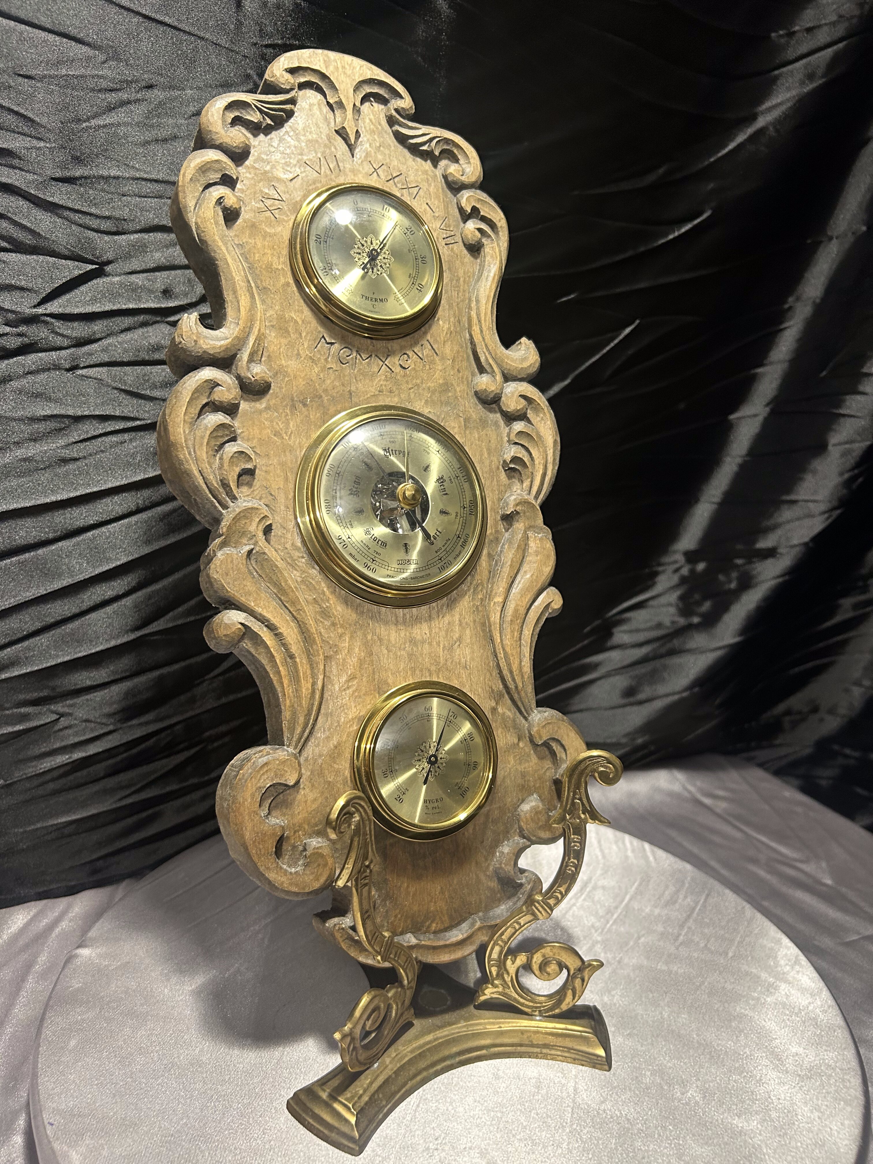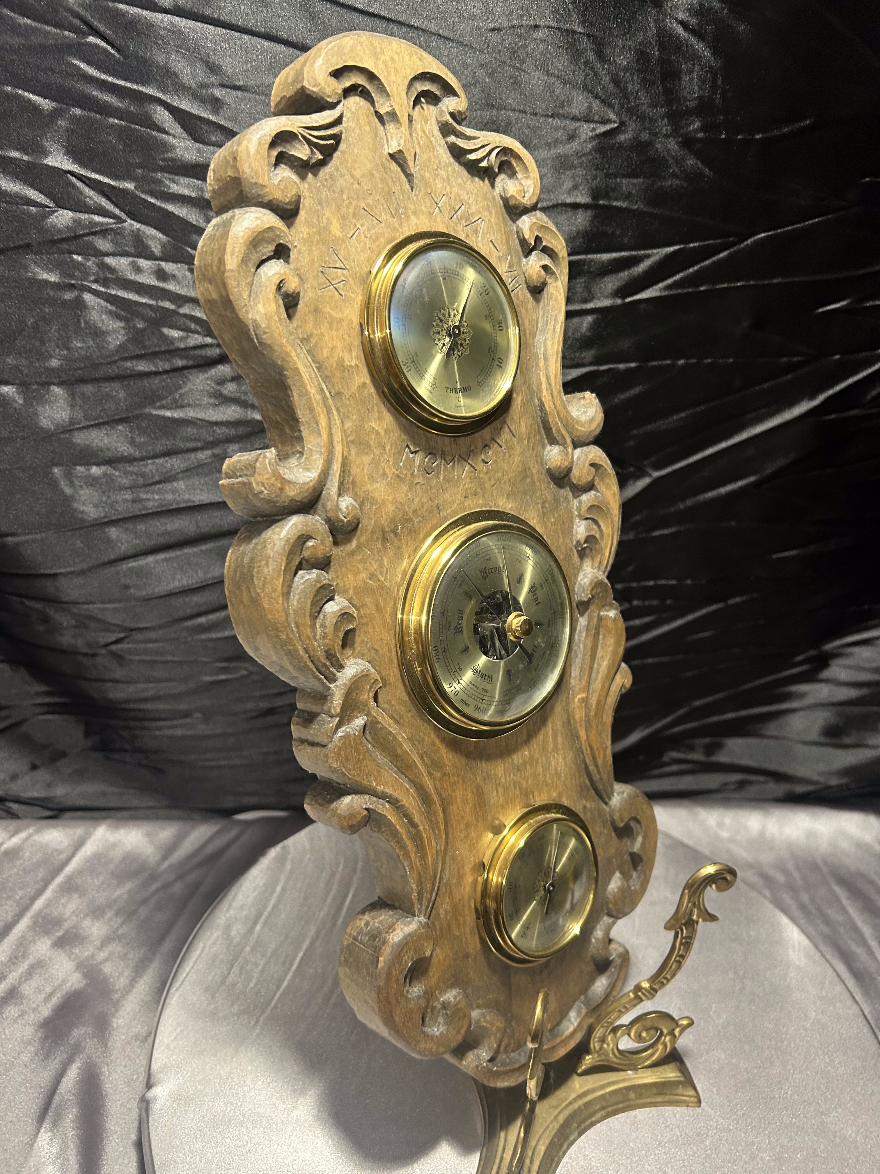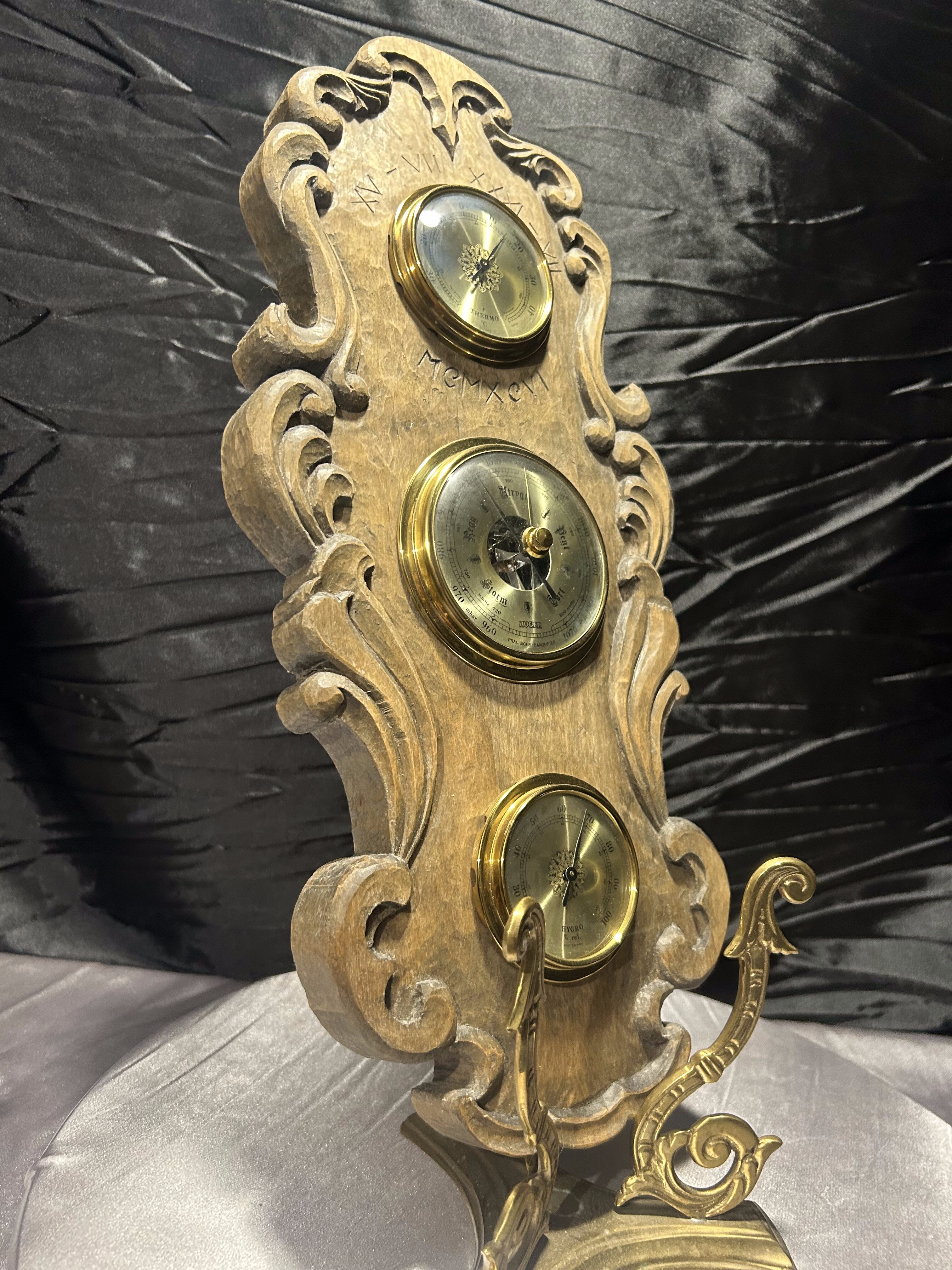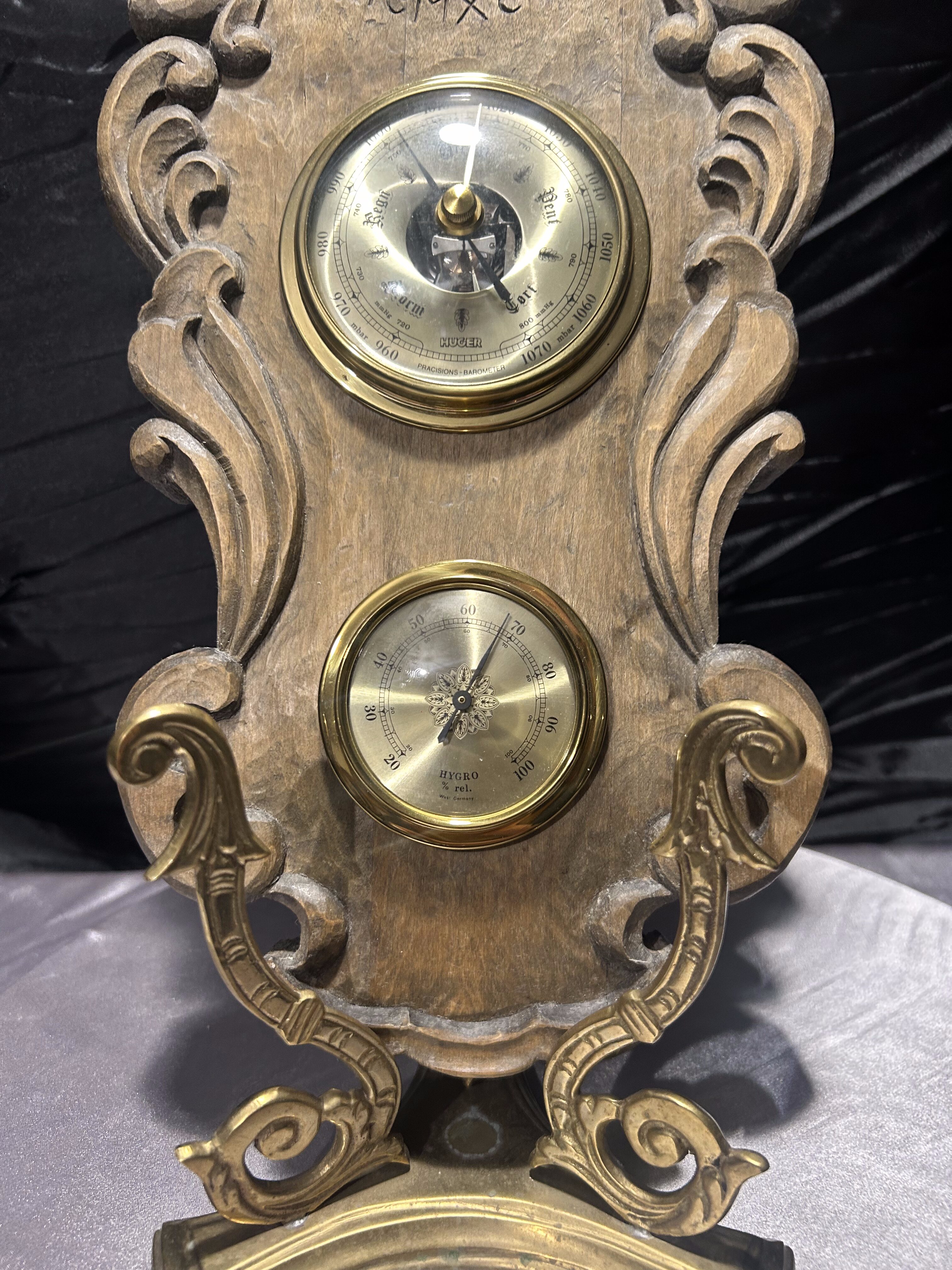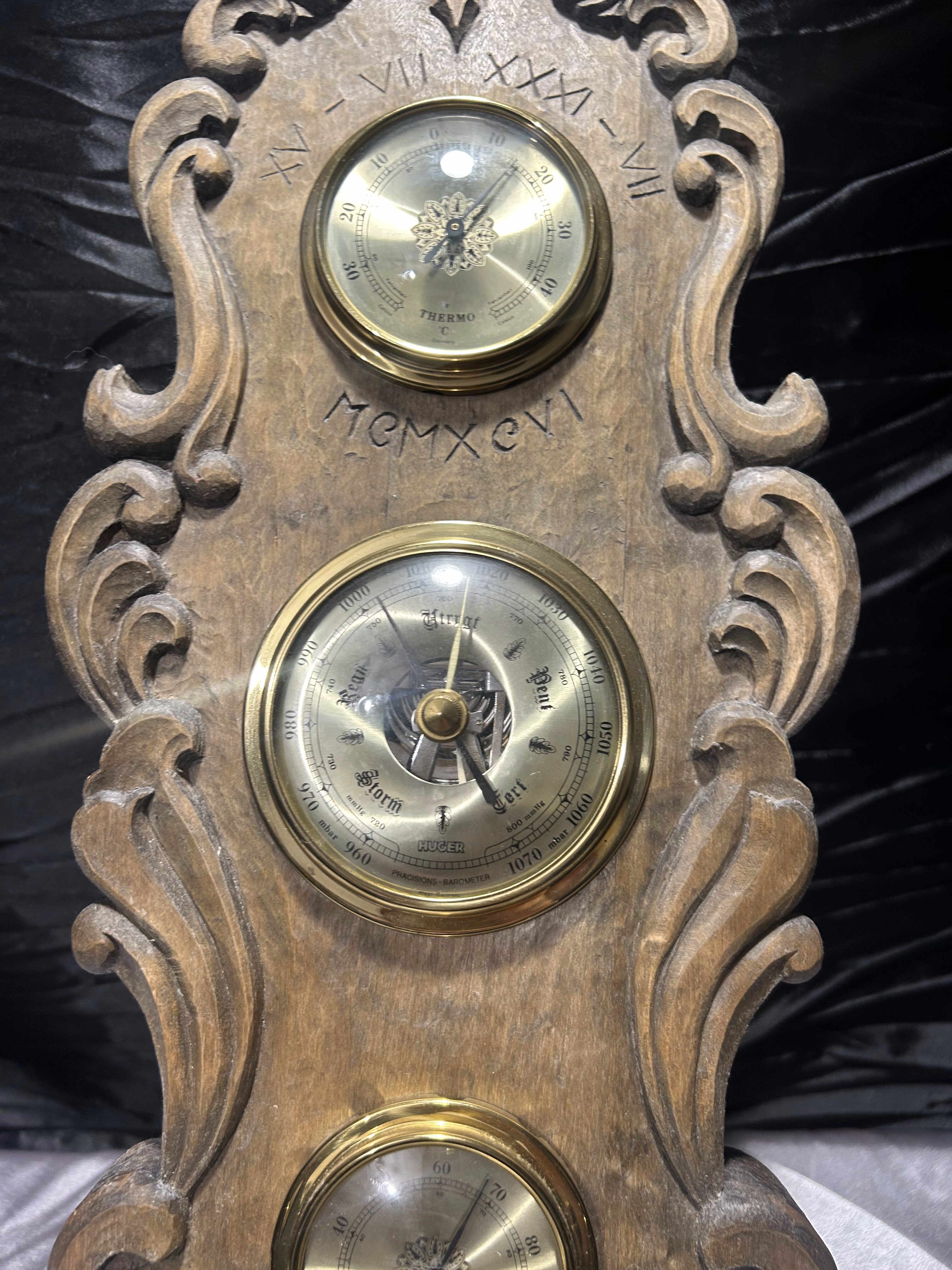 Imponujący, klasyczny barometr firmy Huger z wbudowanym termometrem i higrometrem, umieszczony w rzeźbionej drewnianej oprawie o wyjątkowym charakterze. Wykonany z grubego, solidnego drewna, ozdobiony dekoracyjnymi wyżłobieniami i subtelnymi inskrypcjami: XV–VII XXXI–VII MEMXCVI, które nadają całości unikalnego, niemal historycznego wydźwięku.