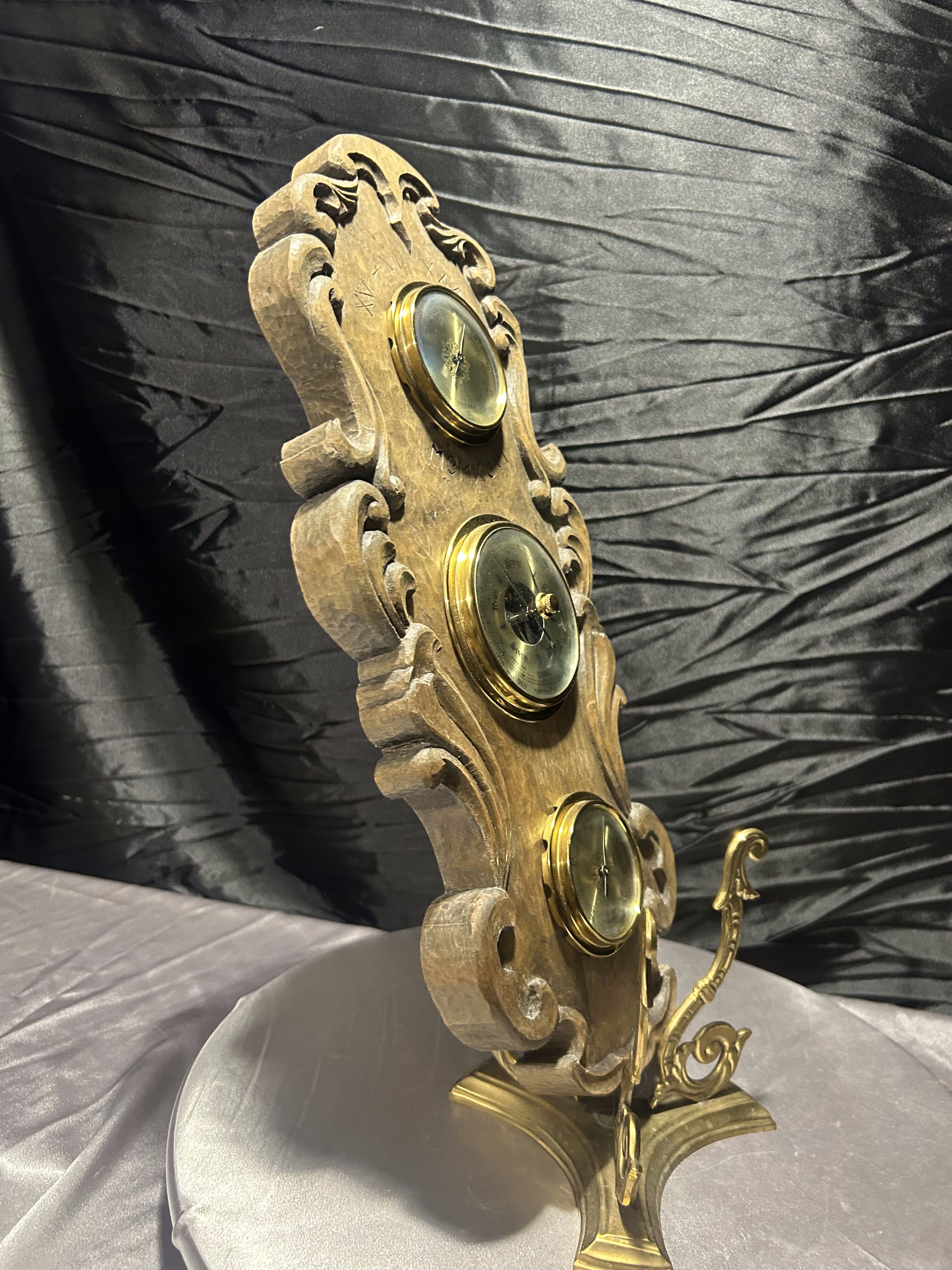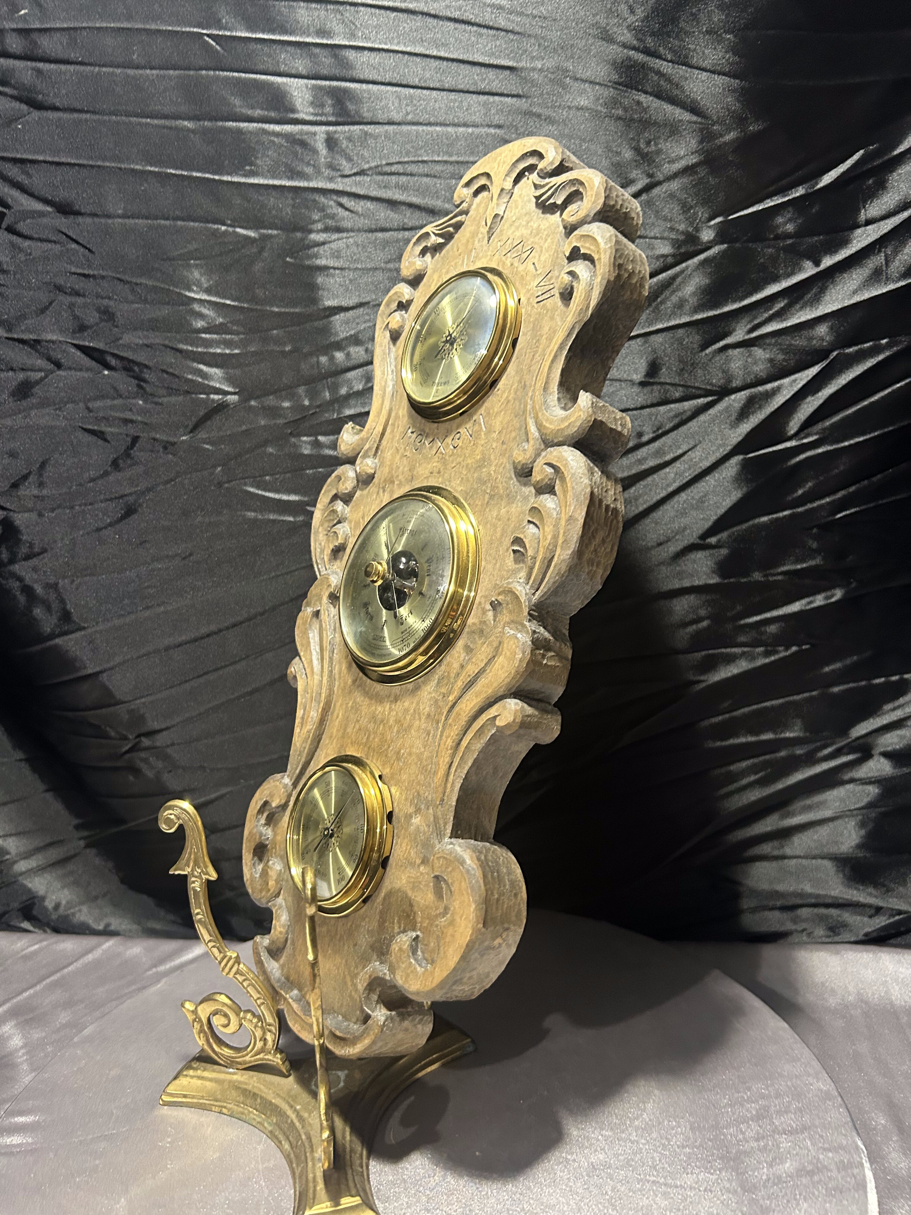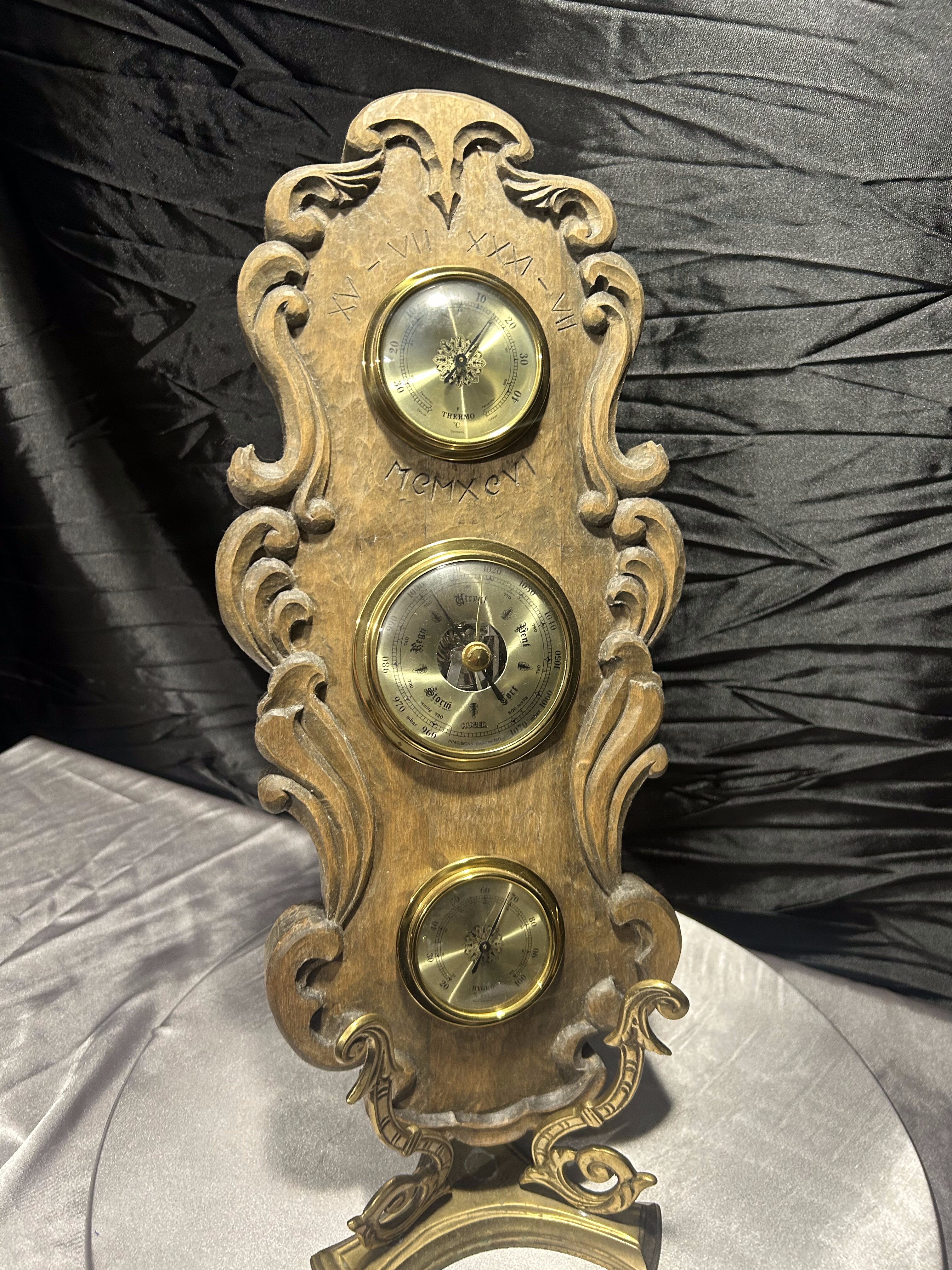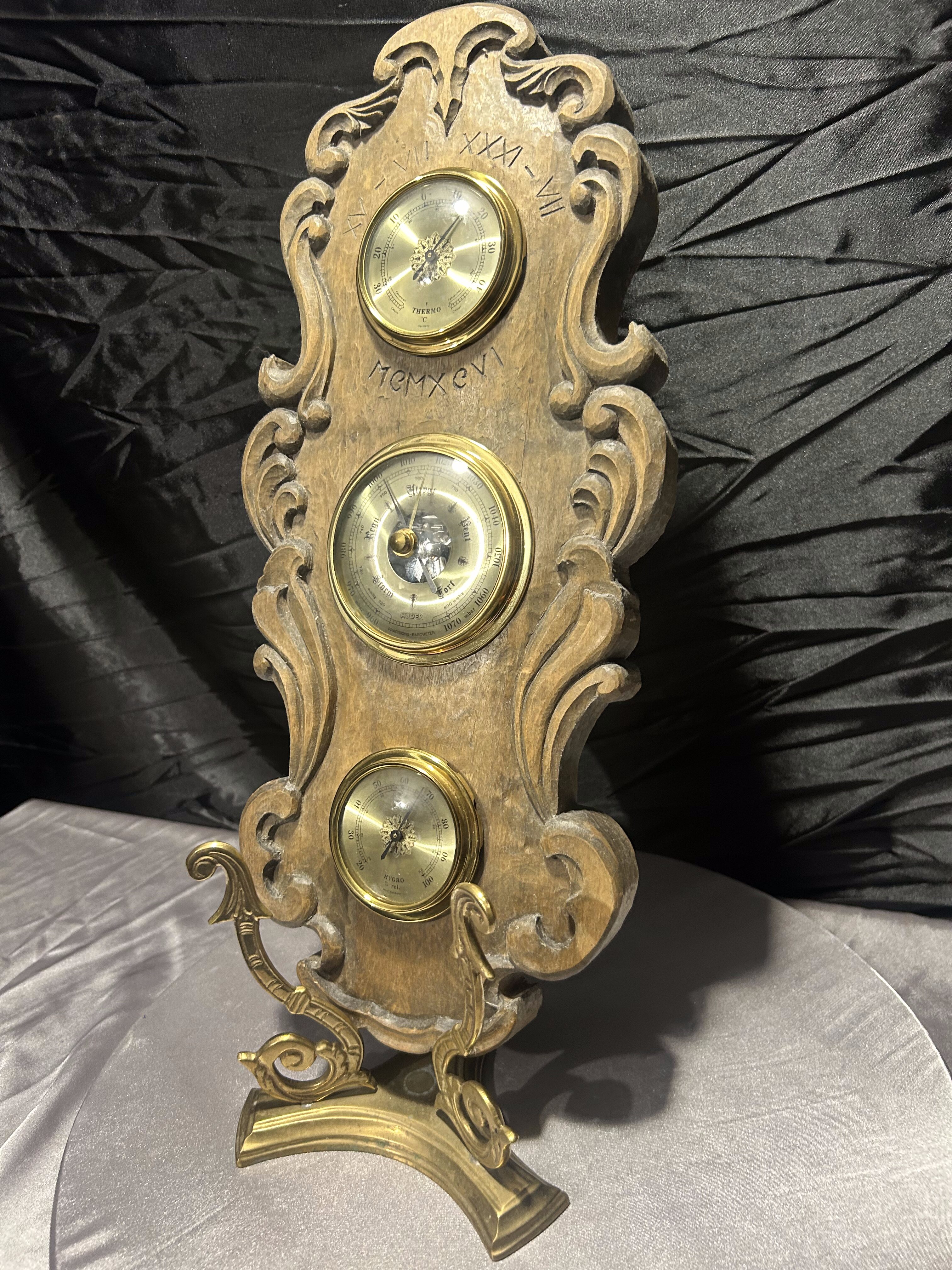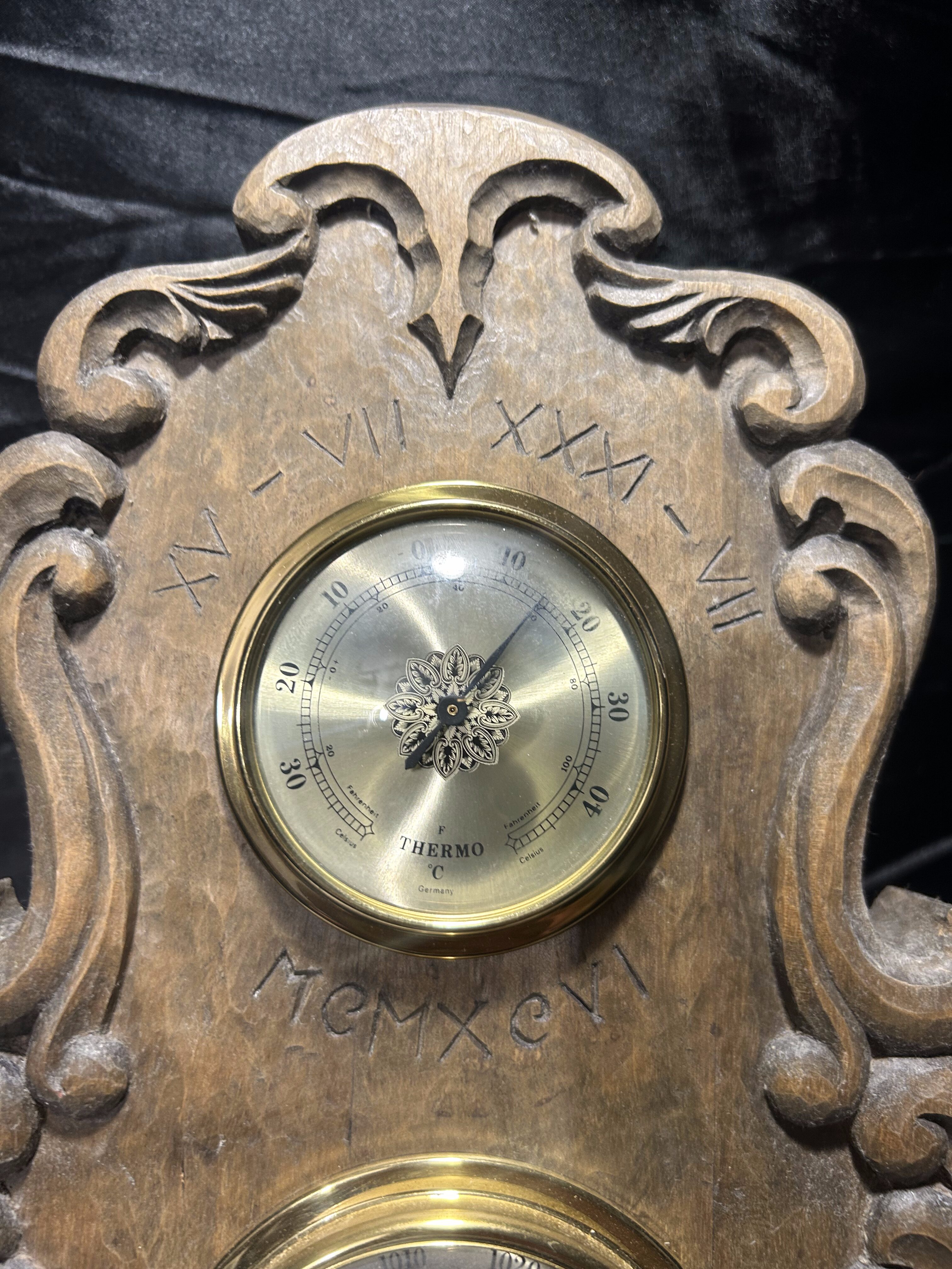 Imponujący, klasyczny barometr firmy Huger z wbudowanym termometrem i higrometrem, umieszczony w rzeźbionej drewnianej oprawie o wyjątkowym charakterze. Wykonany z grubego, solidnego drewna, ozdobiony dekoracyjnymi wyżłobieniami i subtelnymi inskrypcjami: XV–VII XXXI–VII MEMXCVI, które nadają całości unikalnego, niemal historycznego wydźwięku.