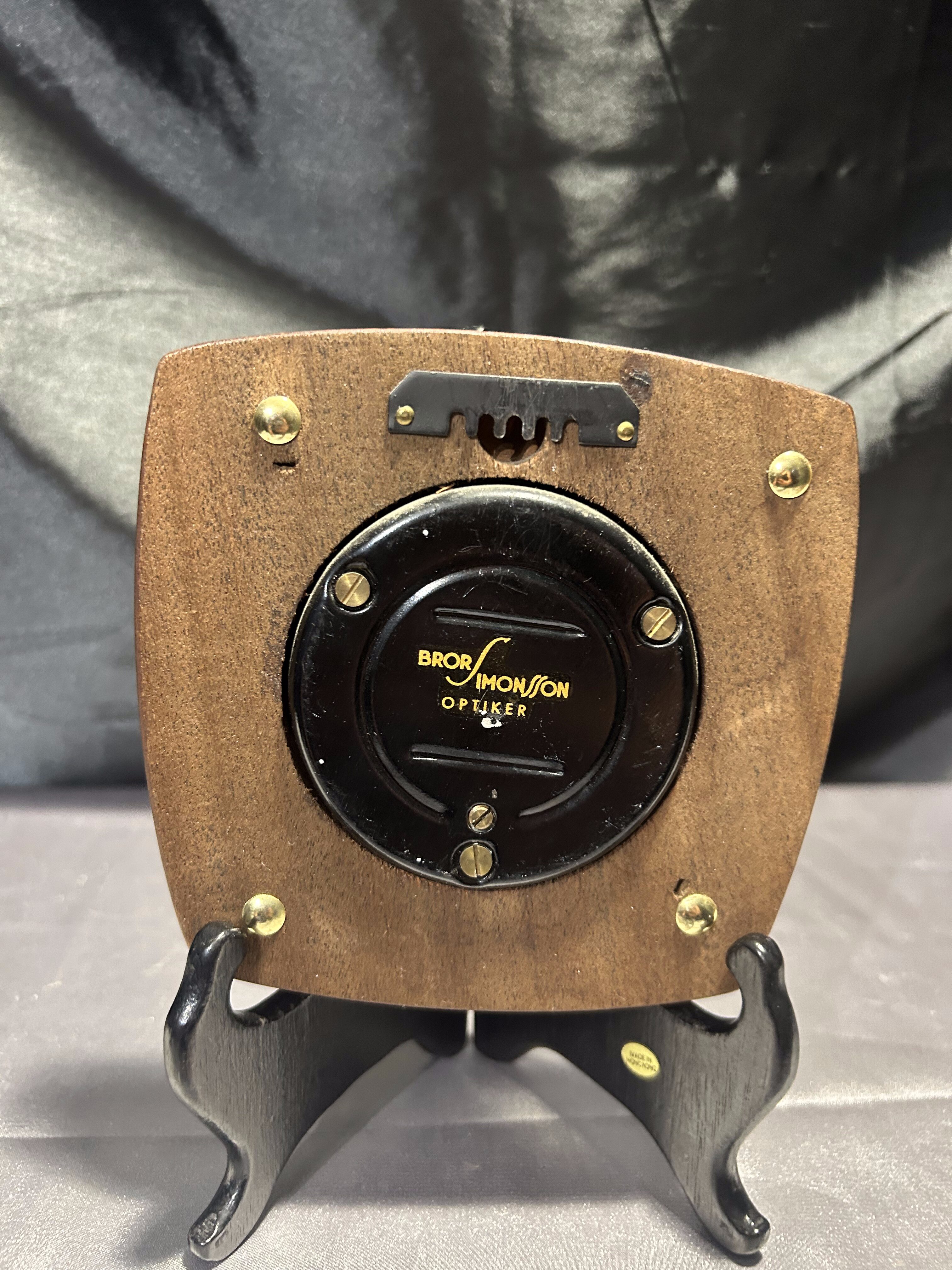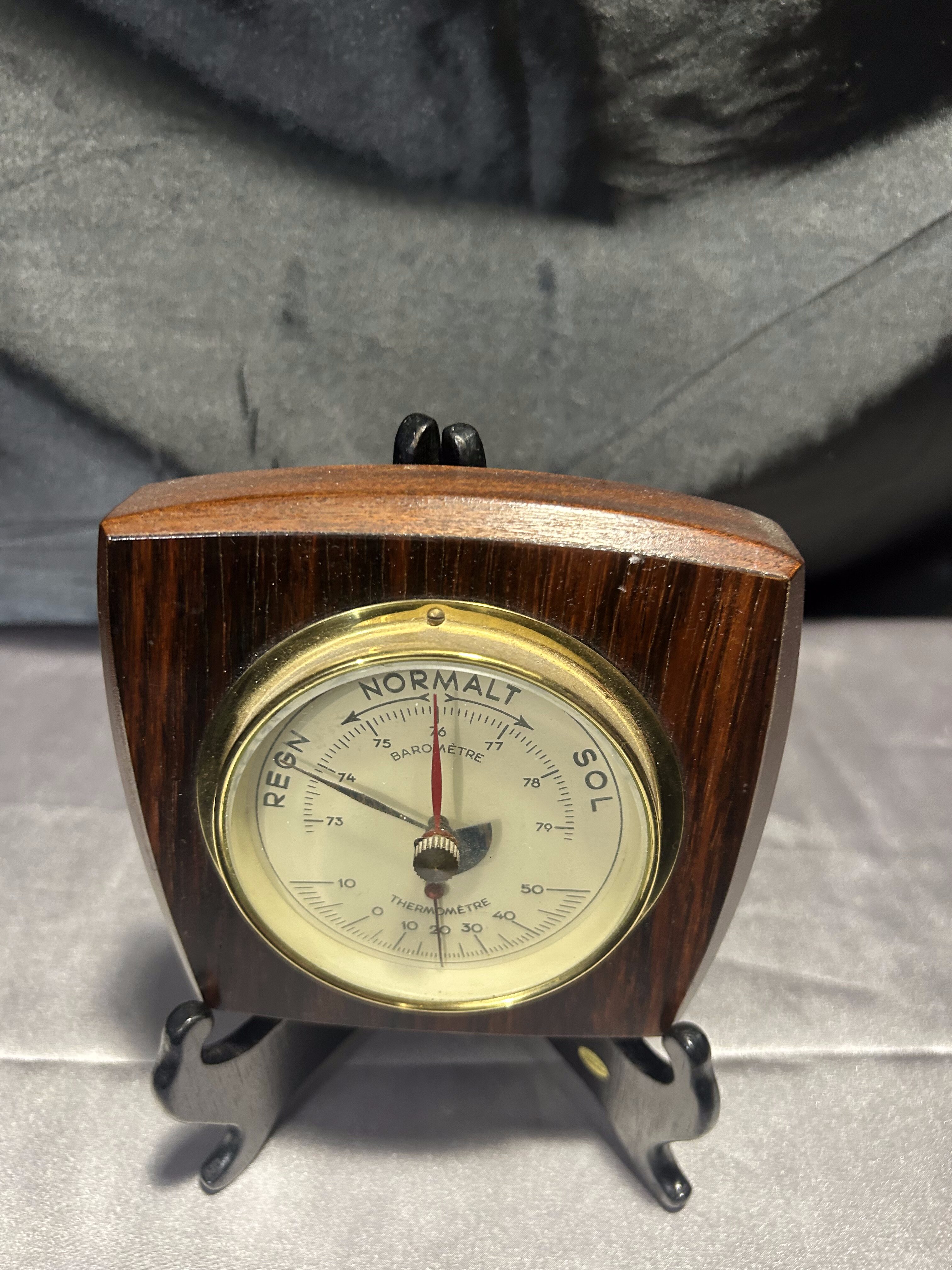 Kompaktowy barometr z termometrem na jednej tarczy, w eleganckiej drewnianej obudowie, sygnowany BROR SIMONSSON OPTIKER. Stylowy i praktyczny dodatek do wnętrz urządzonych klasycznie lub vintage. Dzięki niewielkim rozmiarom idealnie sprawdzi się na ścianie w gabinecie, przedpokoju czy salonie.