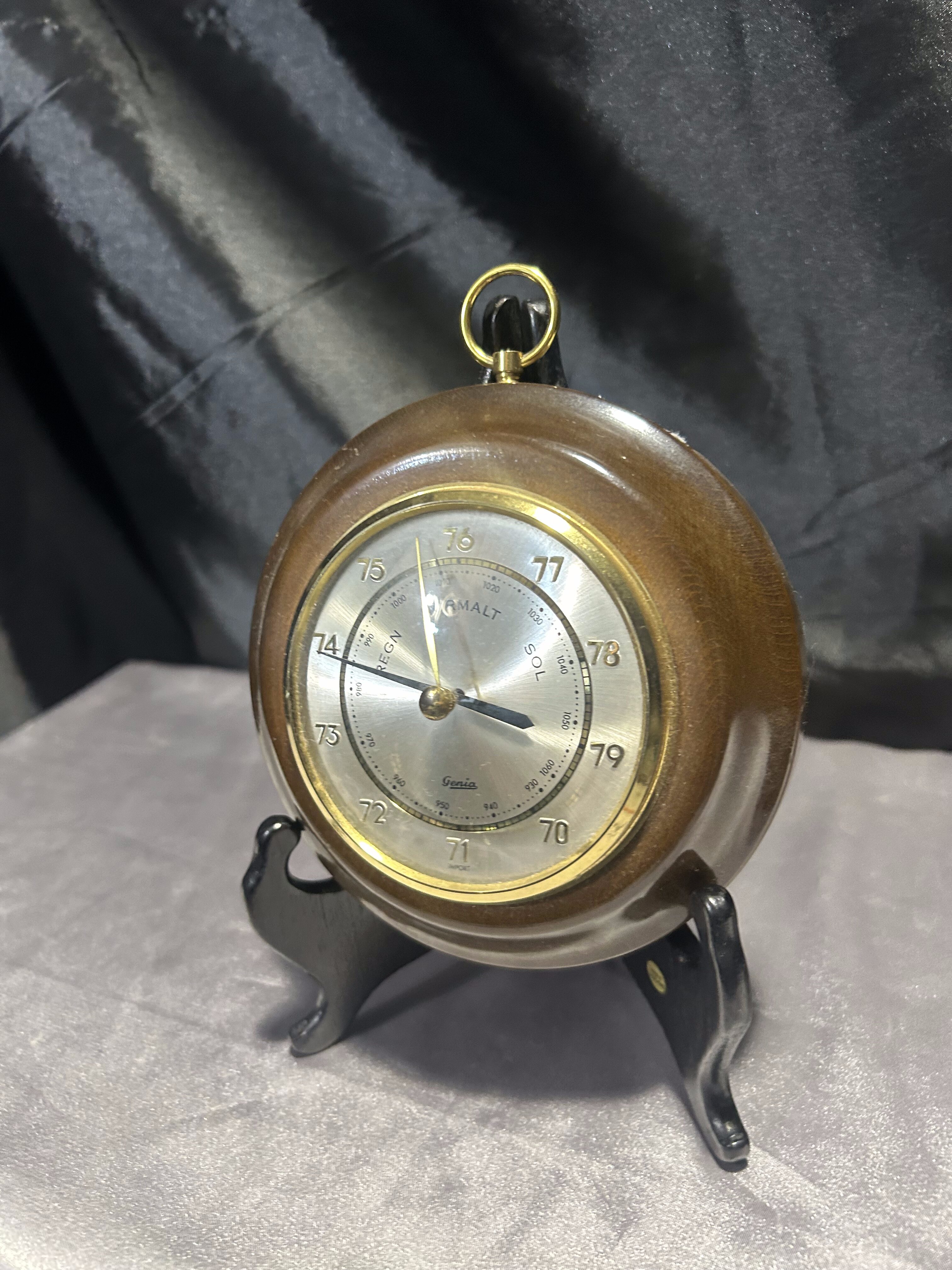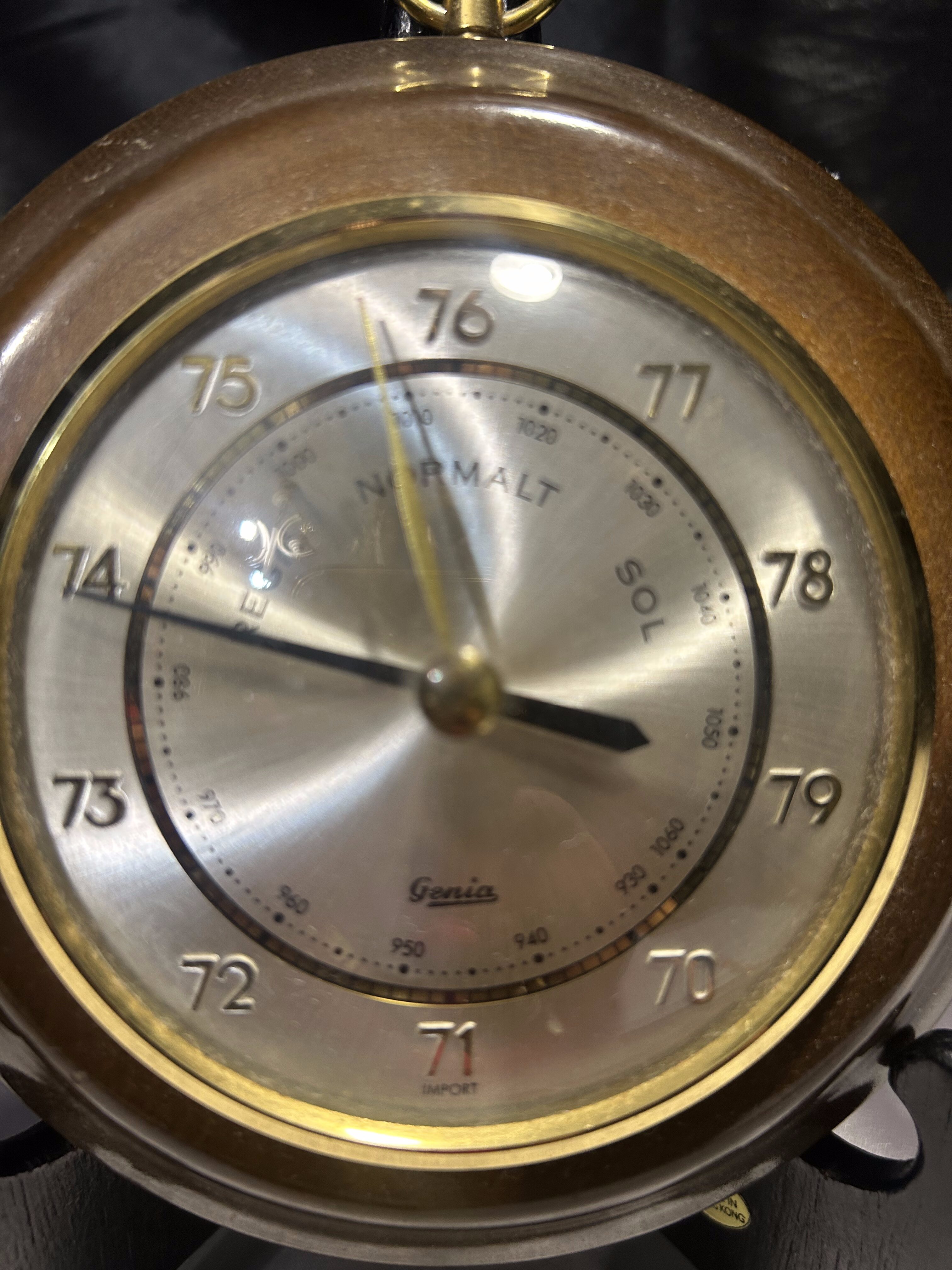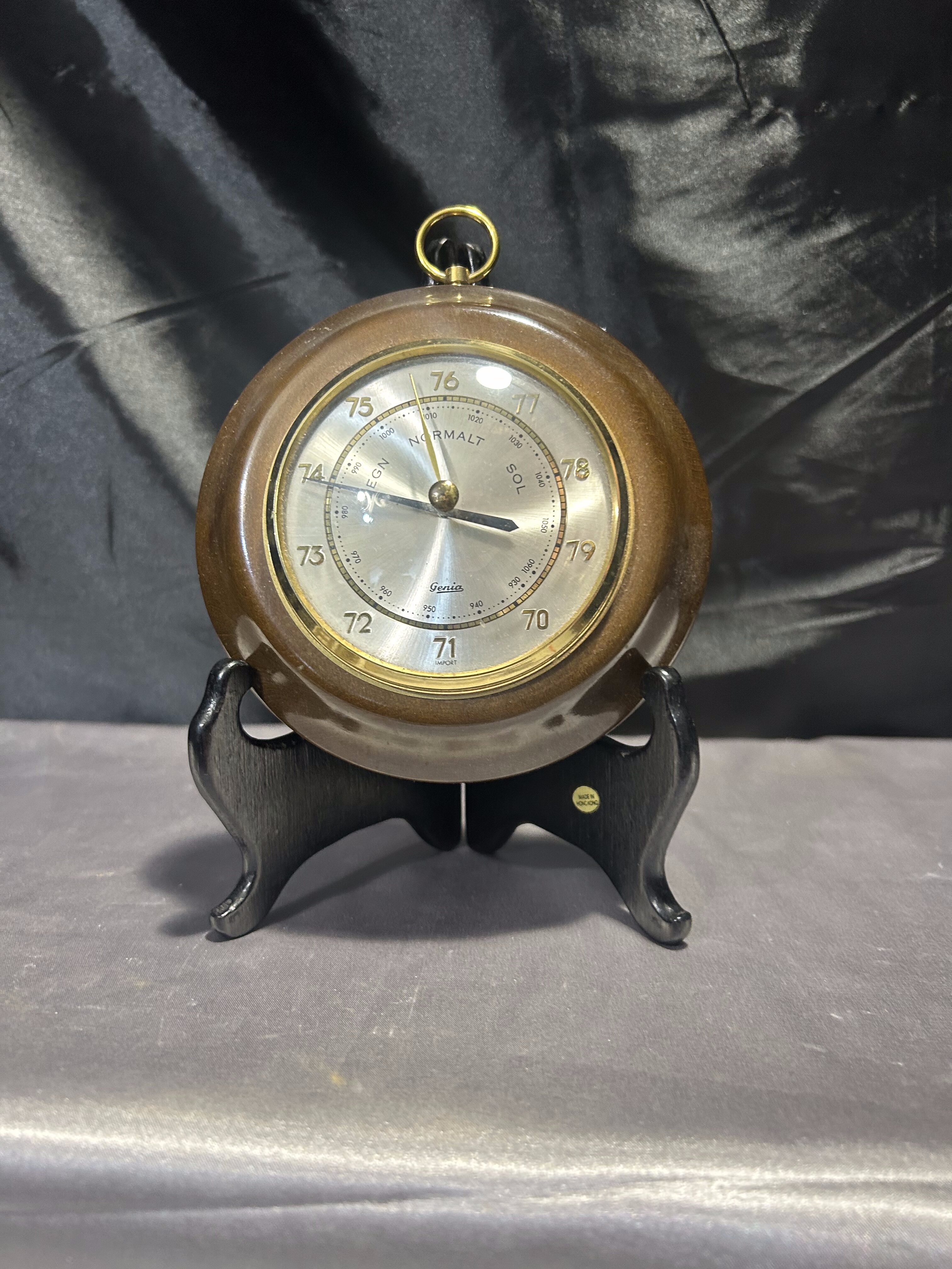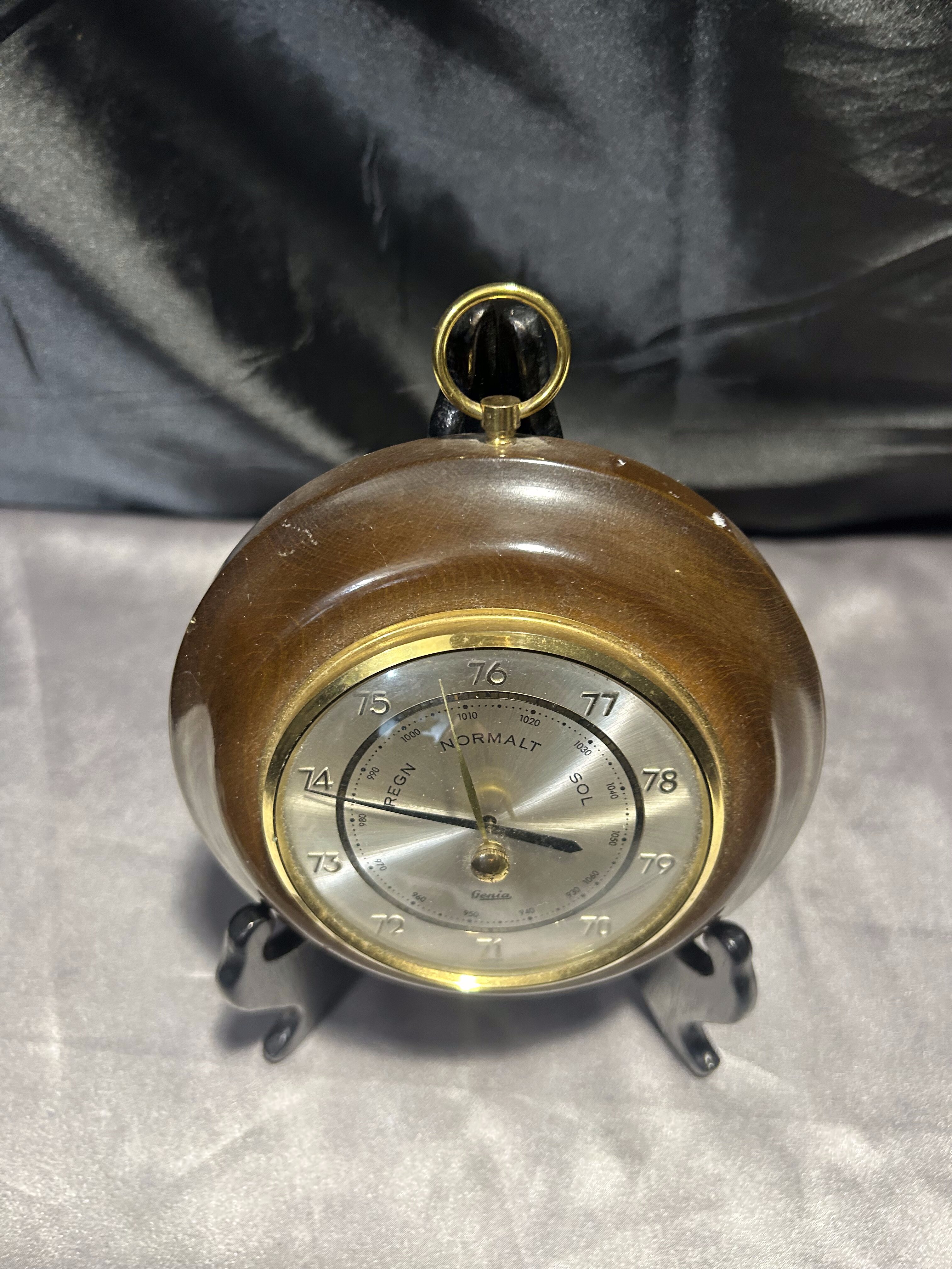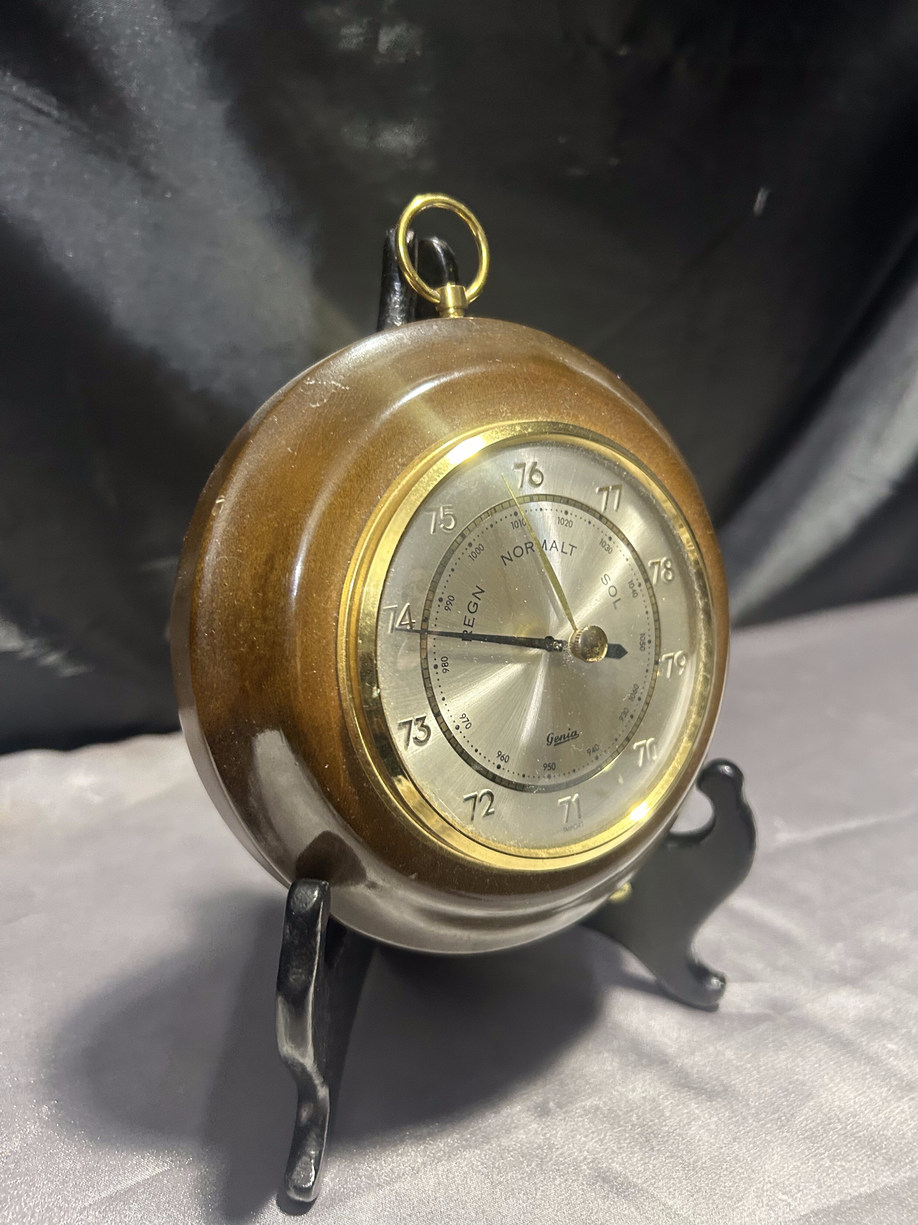 Klasyczny okrągły barometr marki GENIA, osadzony w eleganckiej drewnianej oprawie. Wyposażony w metalowe oczko do zawieszenia, idealnie sprawdzi się jako funkcjonalny i dekoracyjny dodatek do wnętrza w stylu klasycznym, rustykalnym lub vintage.