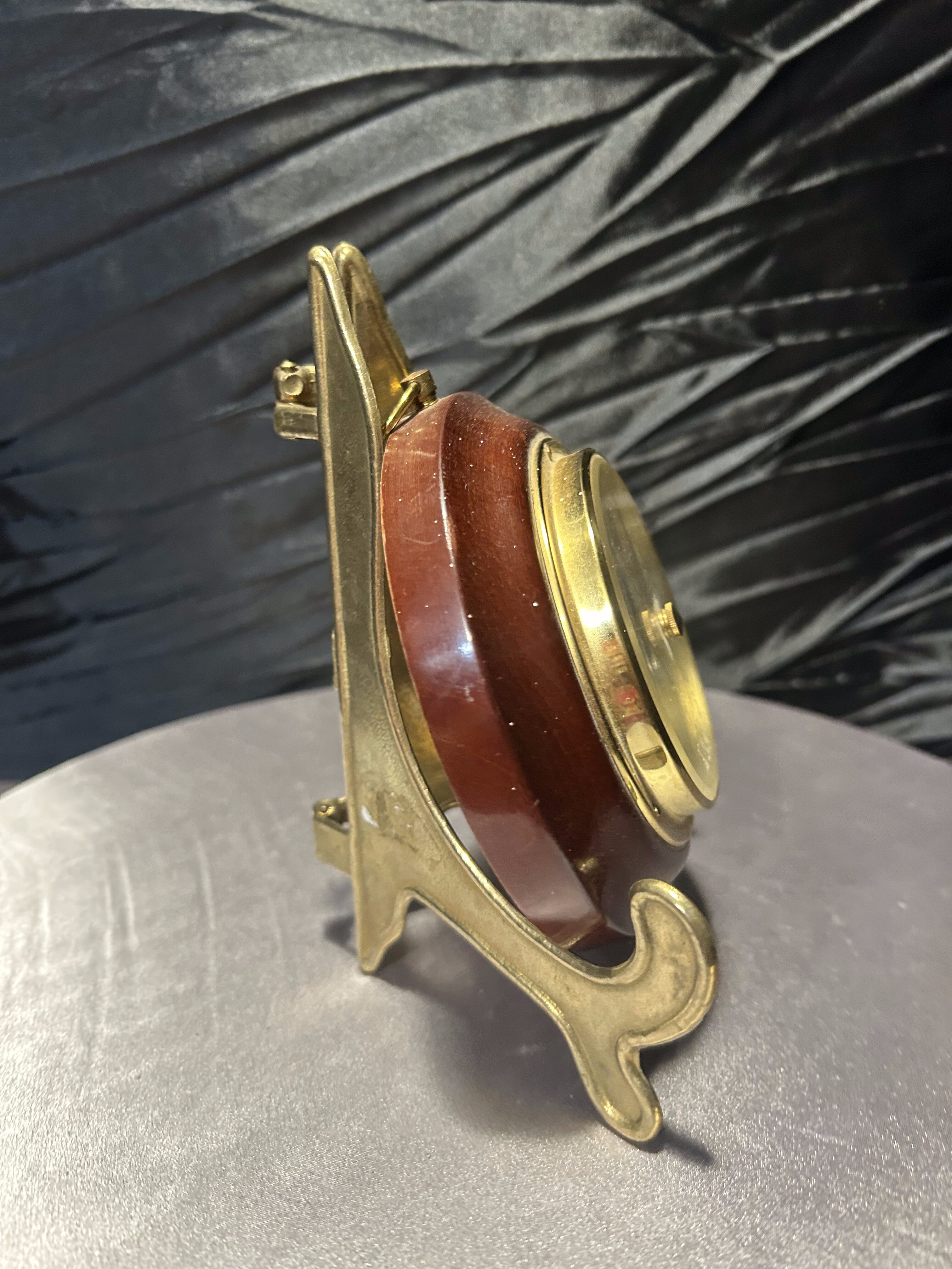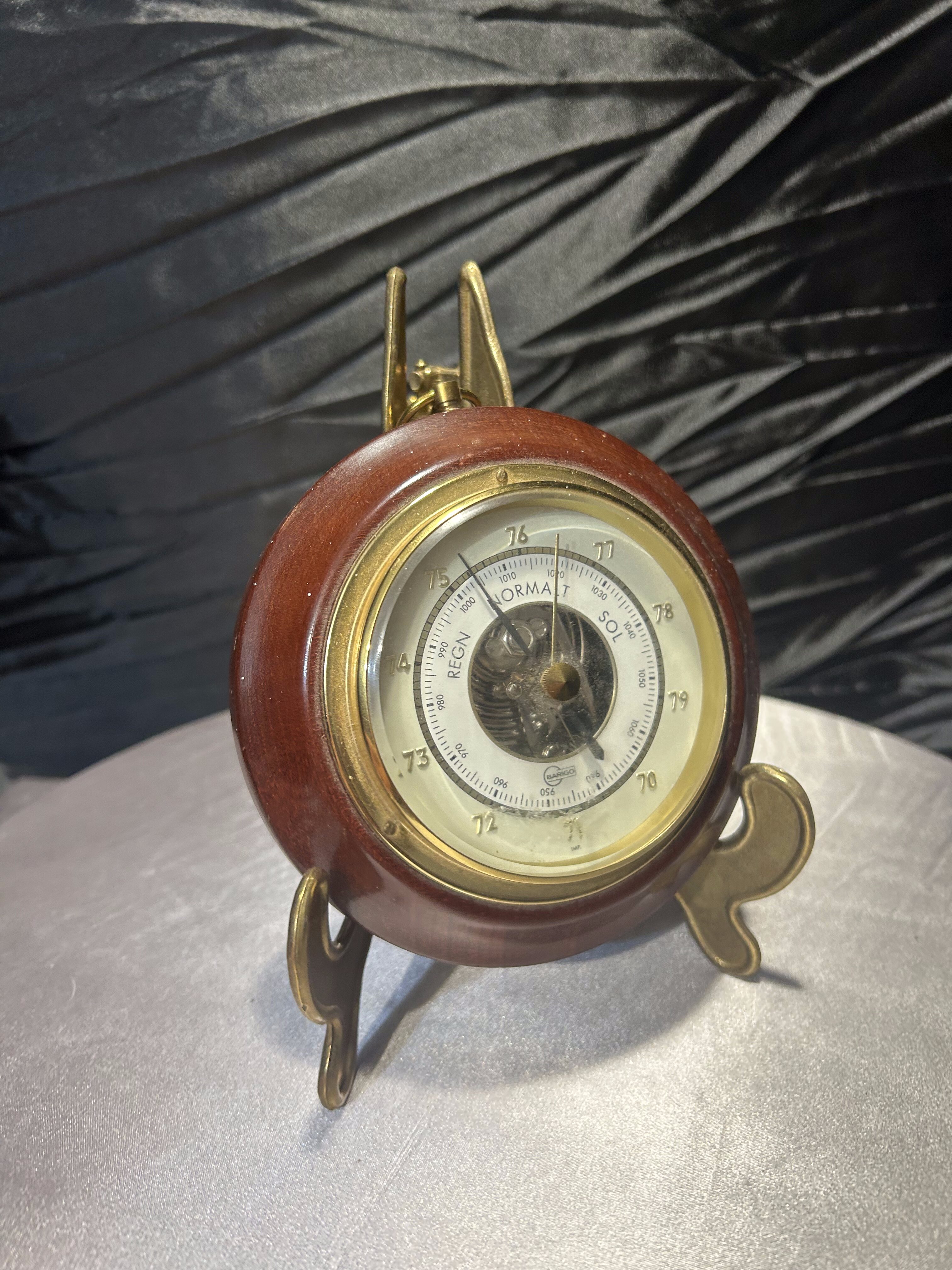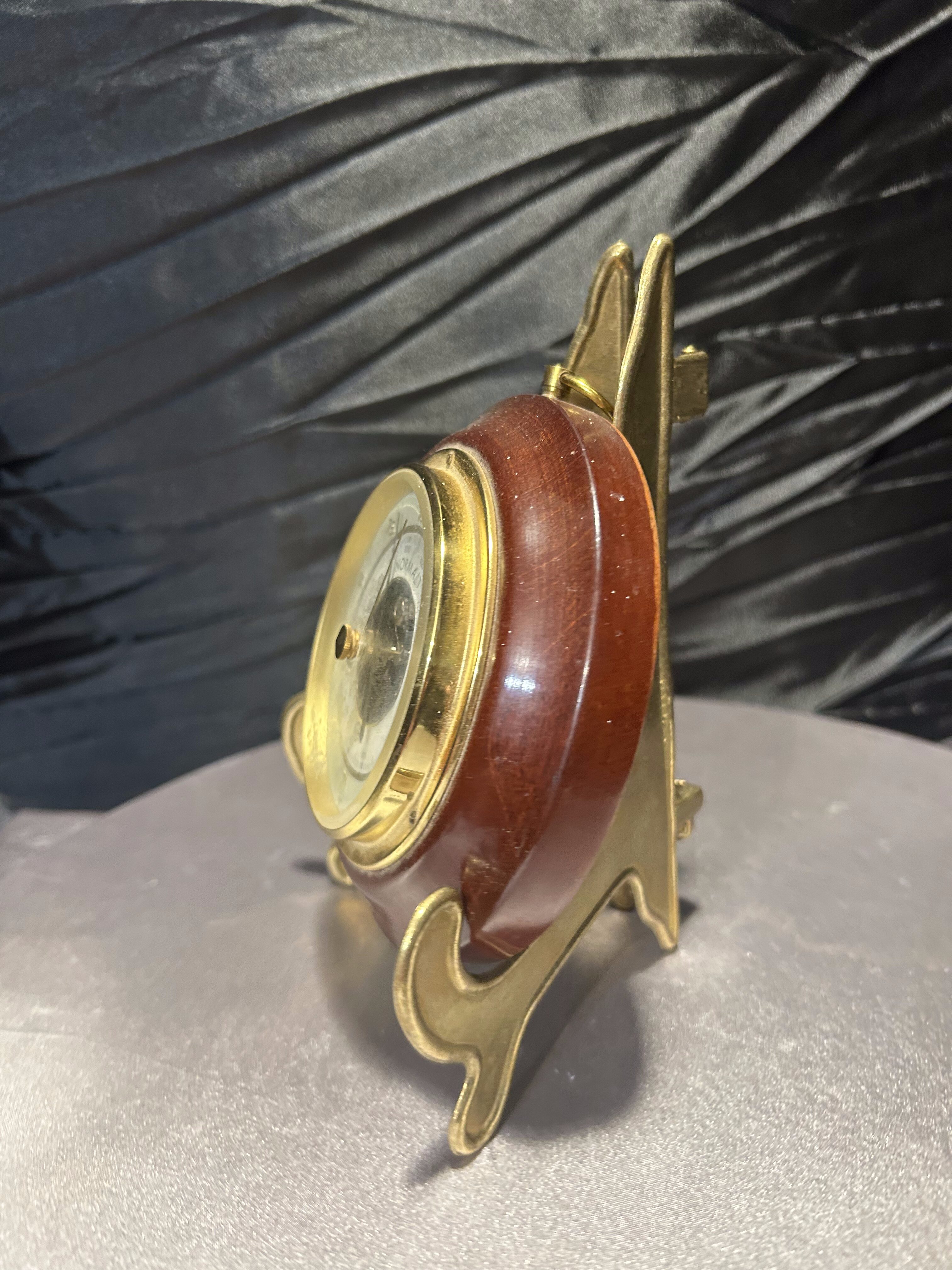 Klasyczny, okrągły barometr oprawiony w elegancką, drewnianą ramę z mosiężnymi elementami. Urządzenie umożliwia monitorowanie zmian ciśnienia atmosferycznego, co pozwala przewidywać pogodę w domowych warunkach. Stylowa oprawa sprawia, że barometr pełni nie tylko funkcję praktyczną, ale także dekoracyjną. Idealny do gabinetu, salonu czy wnętrz w stylu klasycznym lub marynistycznym. Stojak widoczny na zdjęciu służy jedynie do prezentacji i nie jest przedmiotem sprzedaży.