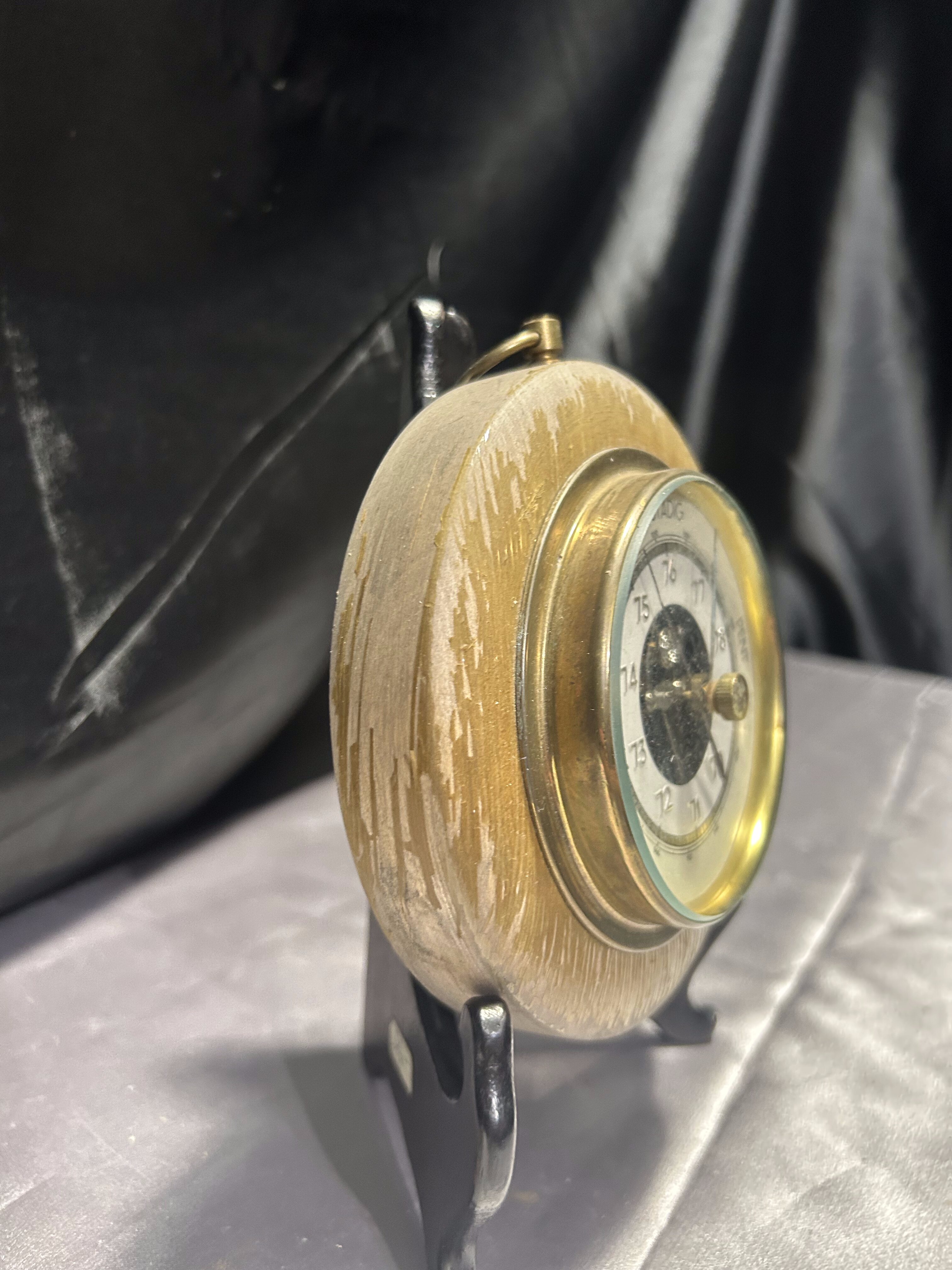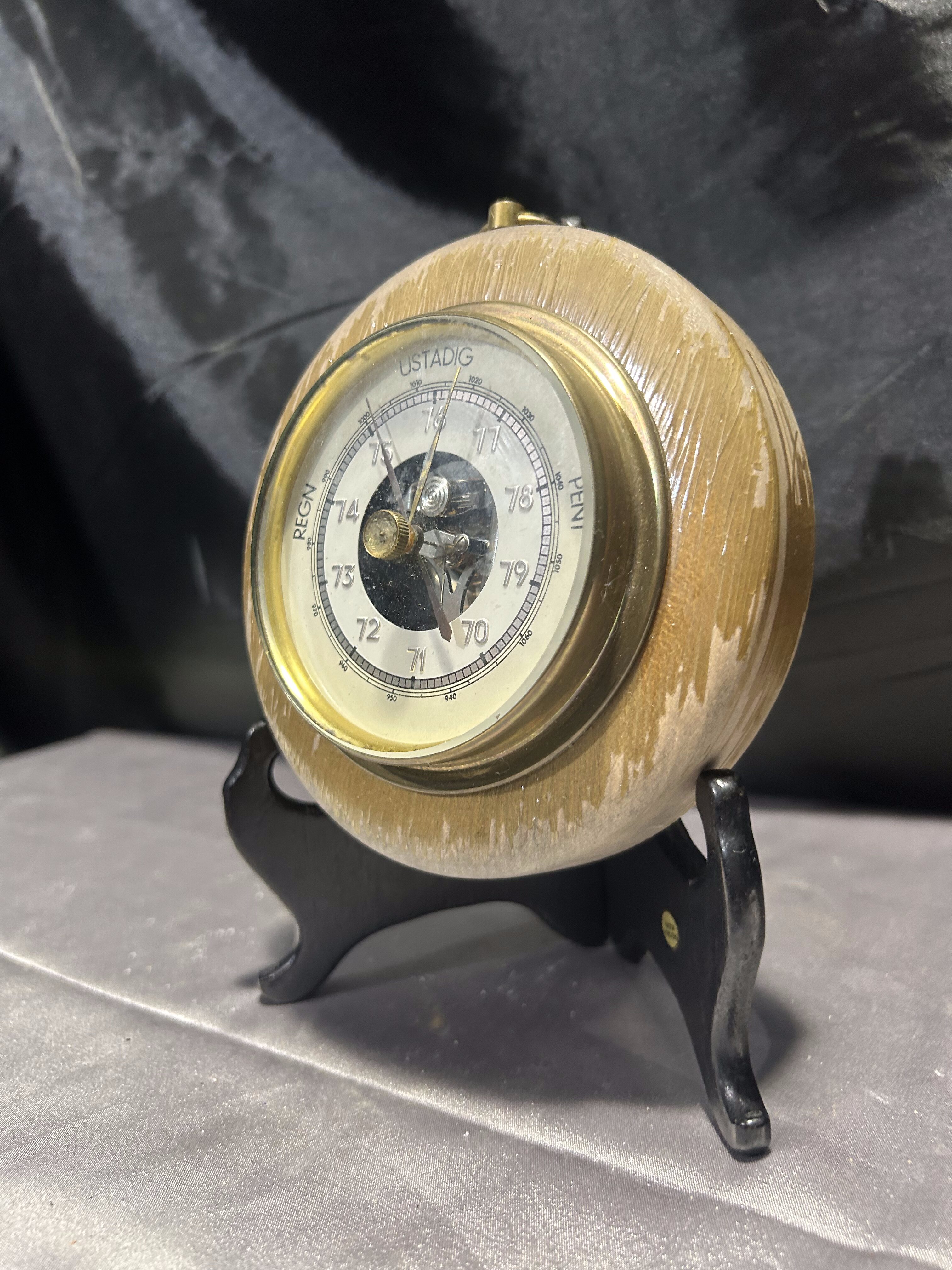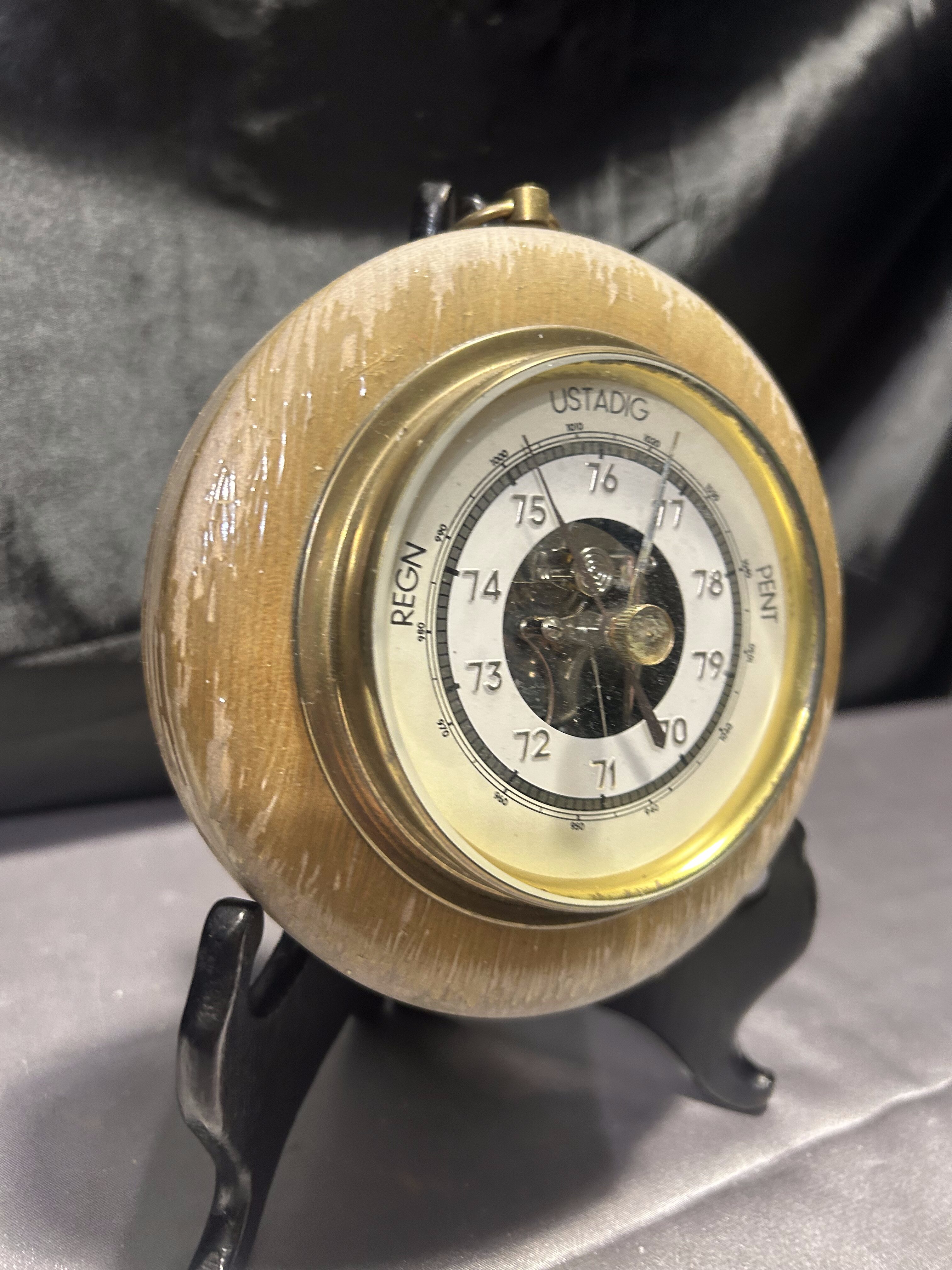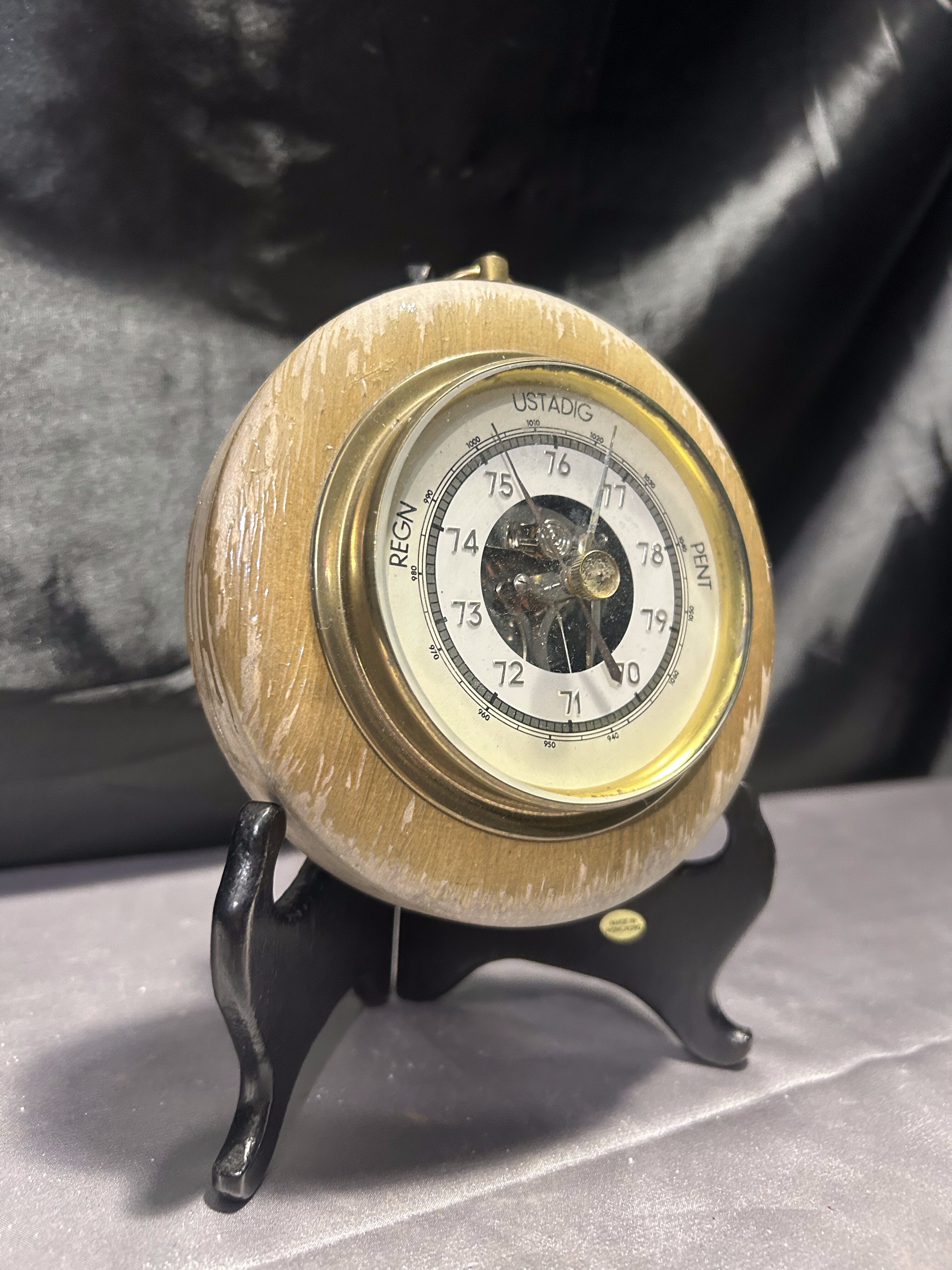 Ten niewielki barometr to funkcjonalny i estetyczny element wyposażenia wnętrza. Oczko do zawieszenia pozwala na łatwą ekspozycję na ścianie, a kompaktowa forma sprawdzi się nawet w mniejszych przestrzeniach. Miejscowe łuszczenie farby dodaje mu autentyczności i nie wpływa na jego praktyczne zastosowanie.