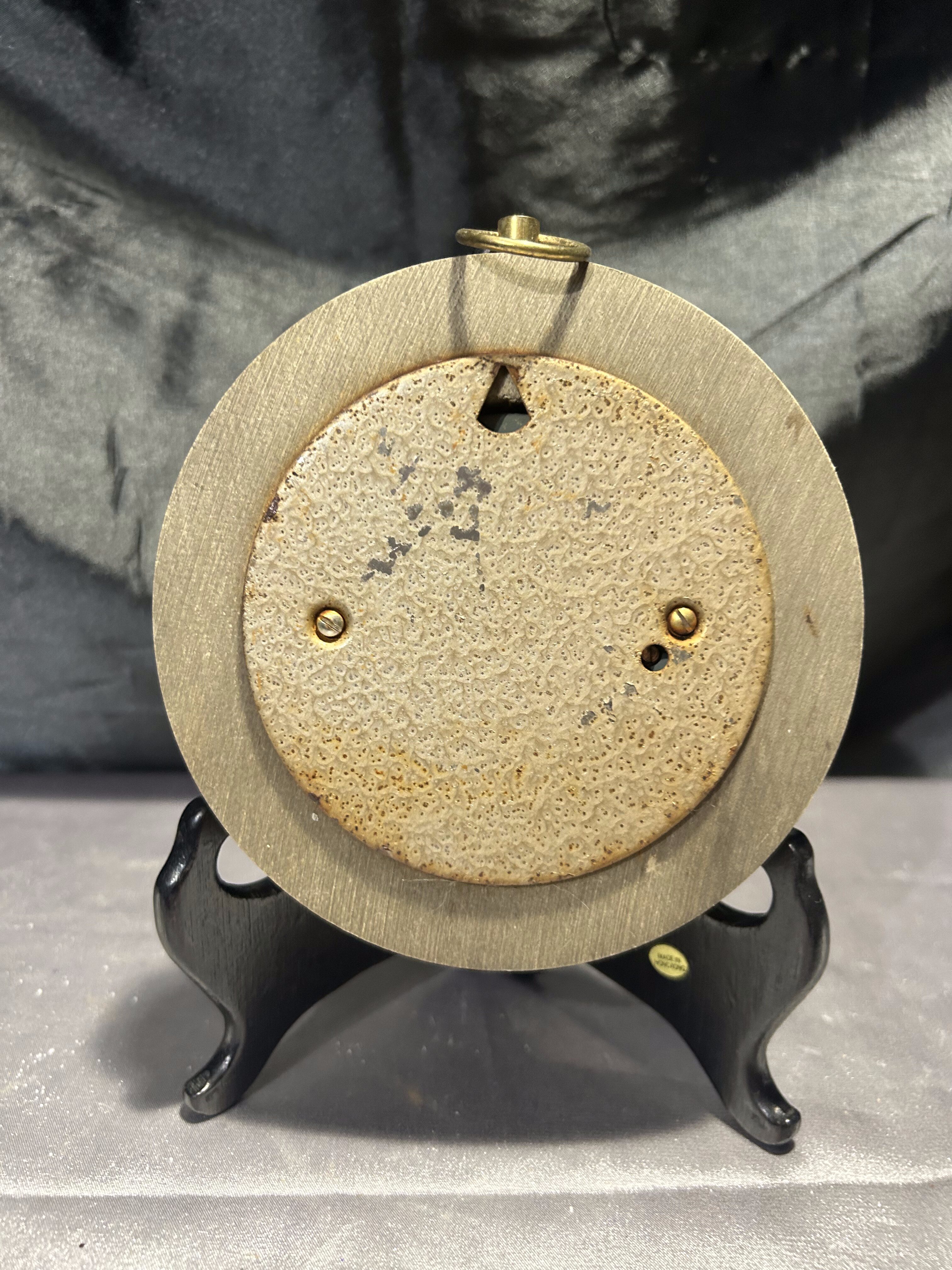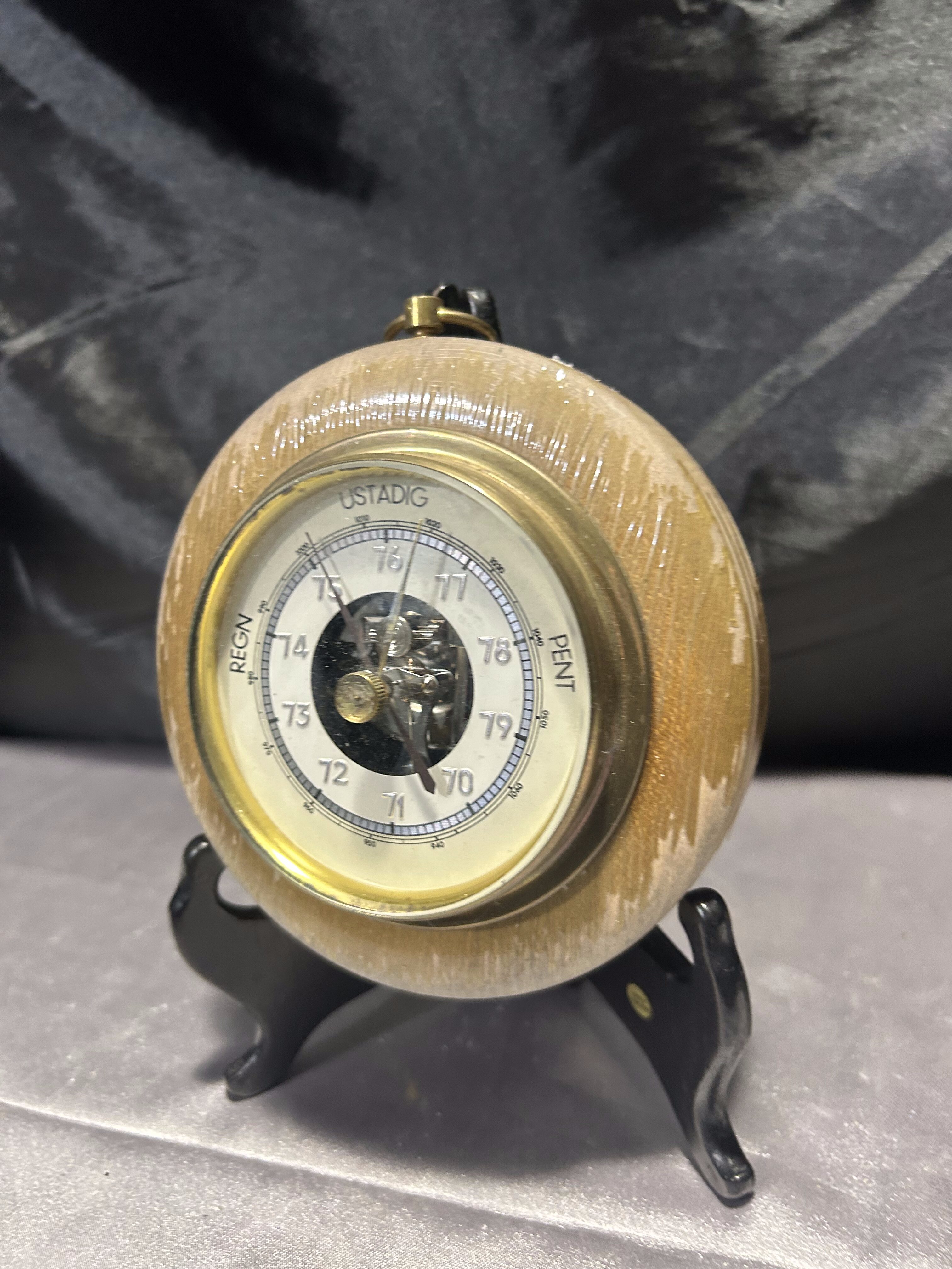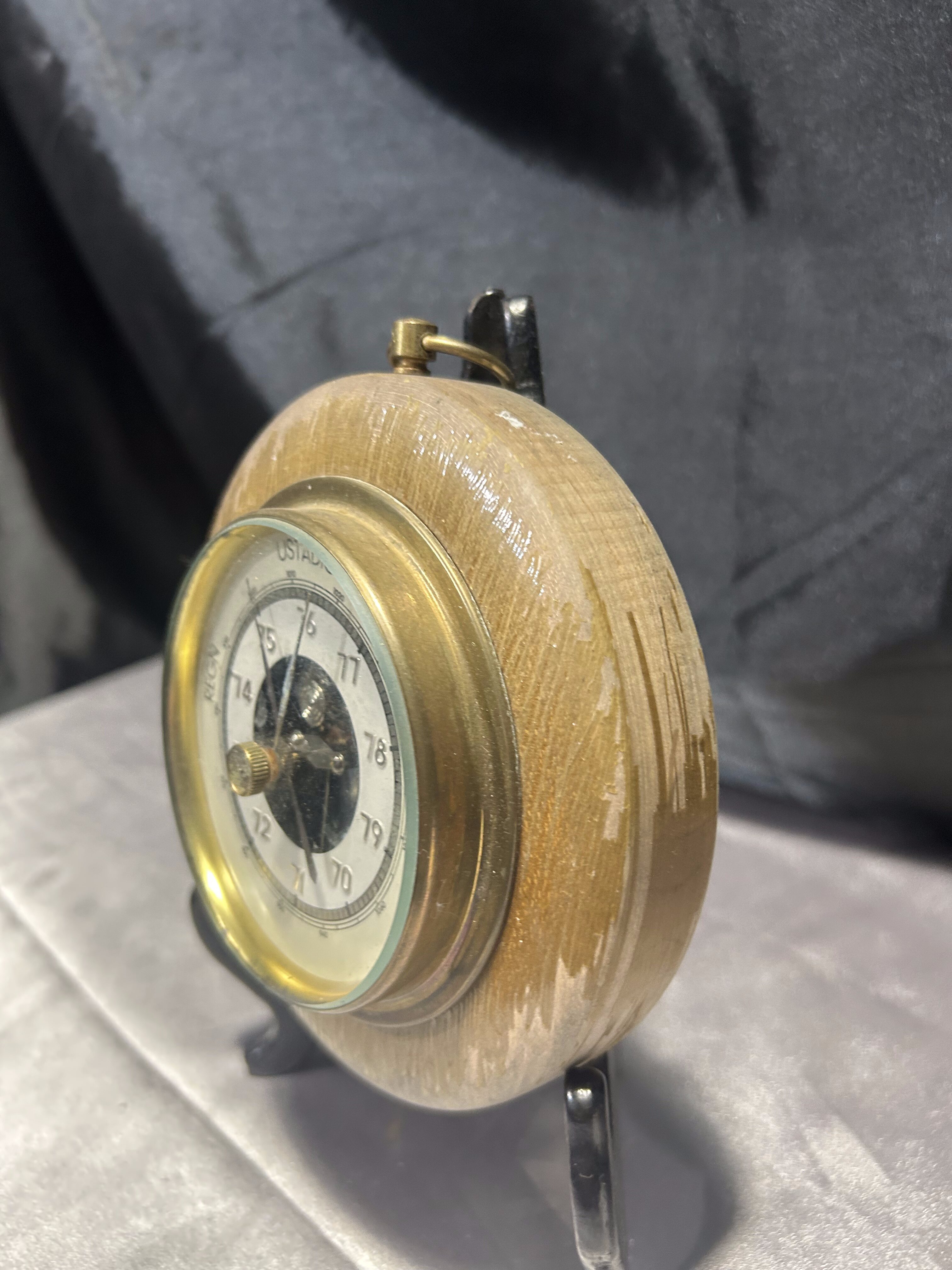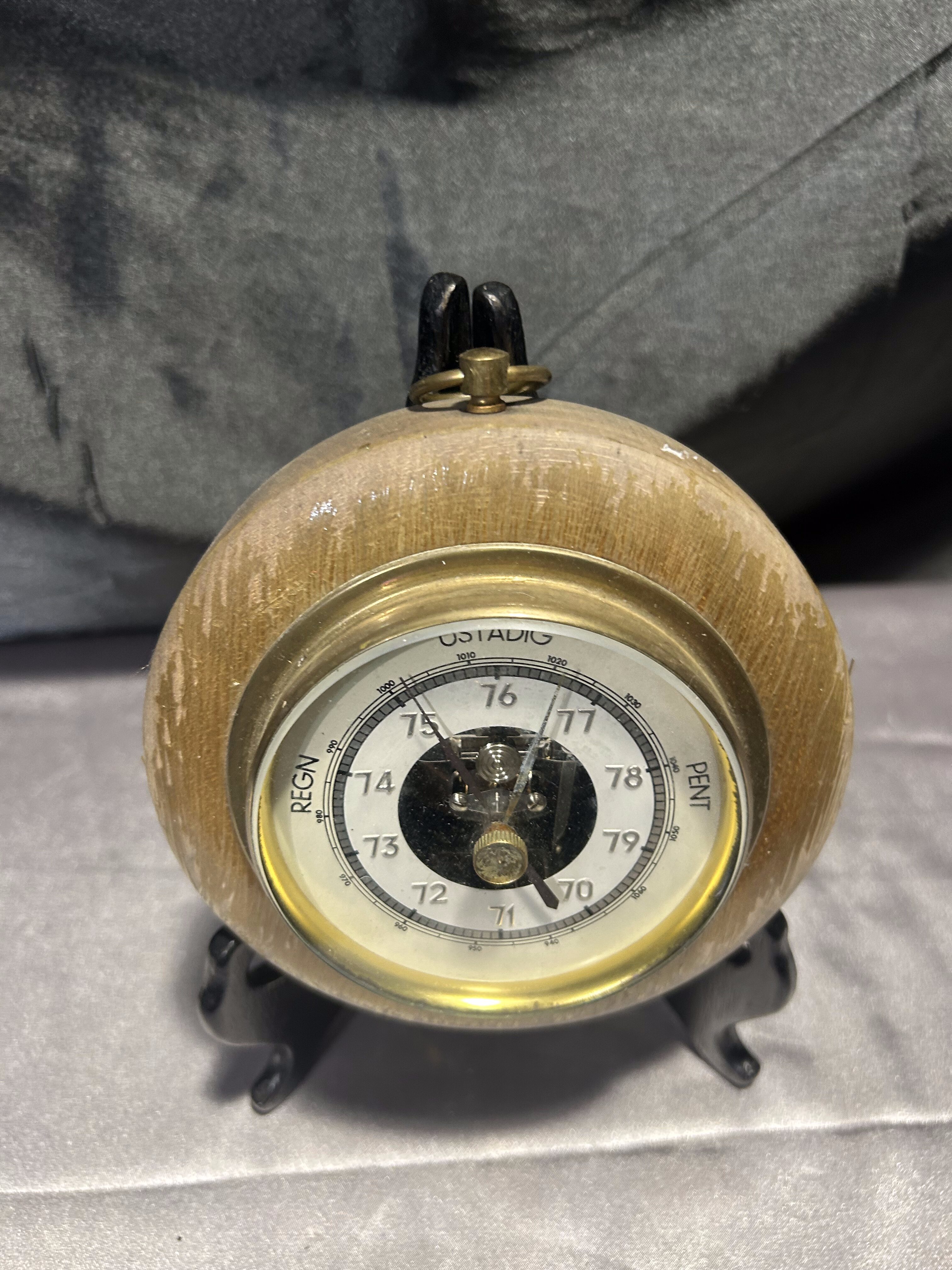 Ten niewielki barometr to funkcjonalny i estetyczny element wyposażenia wnętrza. Oczko do zawieszenia pozwala na łatwą ekspozycję na ścianie, a kompaktowa forma sprawdzi się nawet w mniejszych przestrzeniach. Miejscowe łuszczenie farby dodaje mu autentyczności i nie wpływa na jego praktyczne zastosowanie.