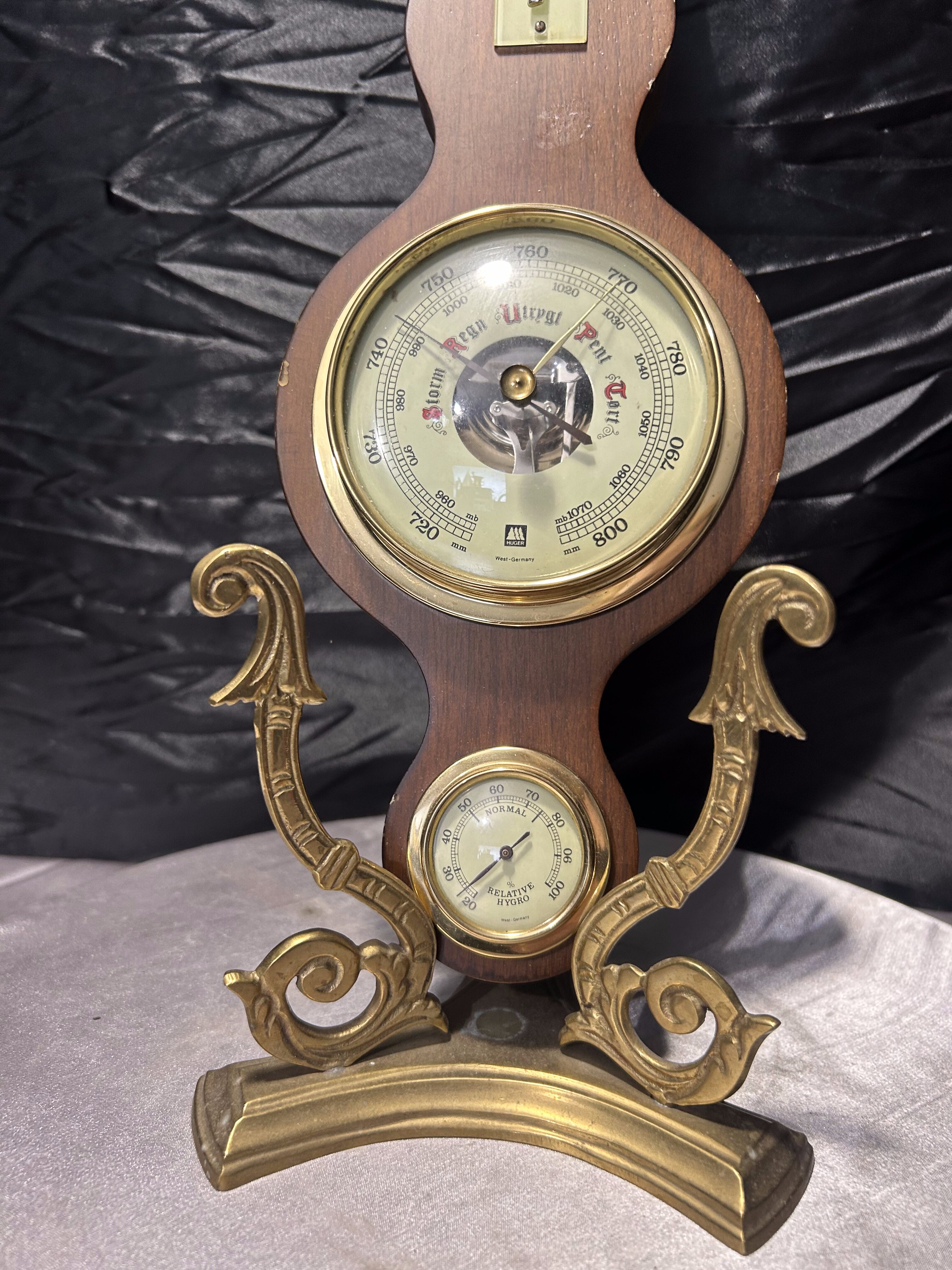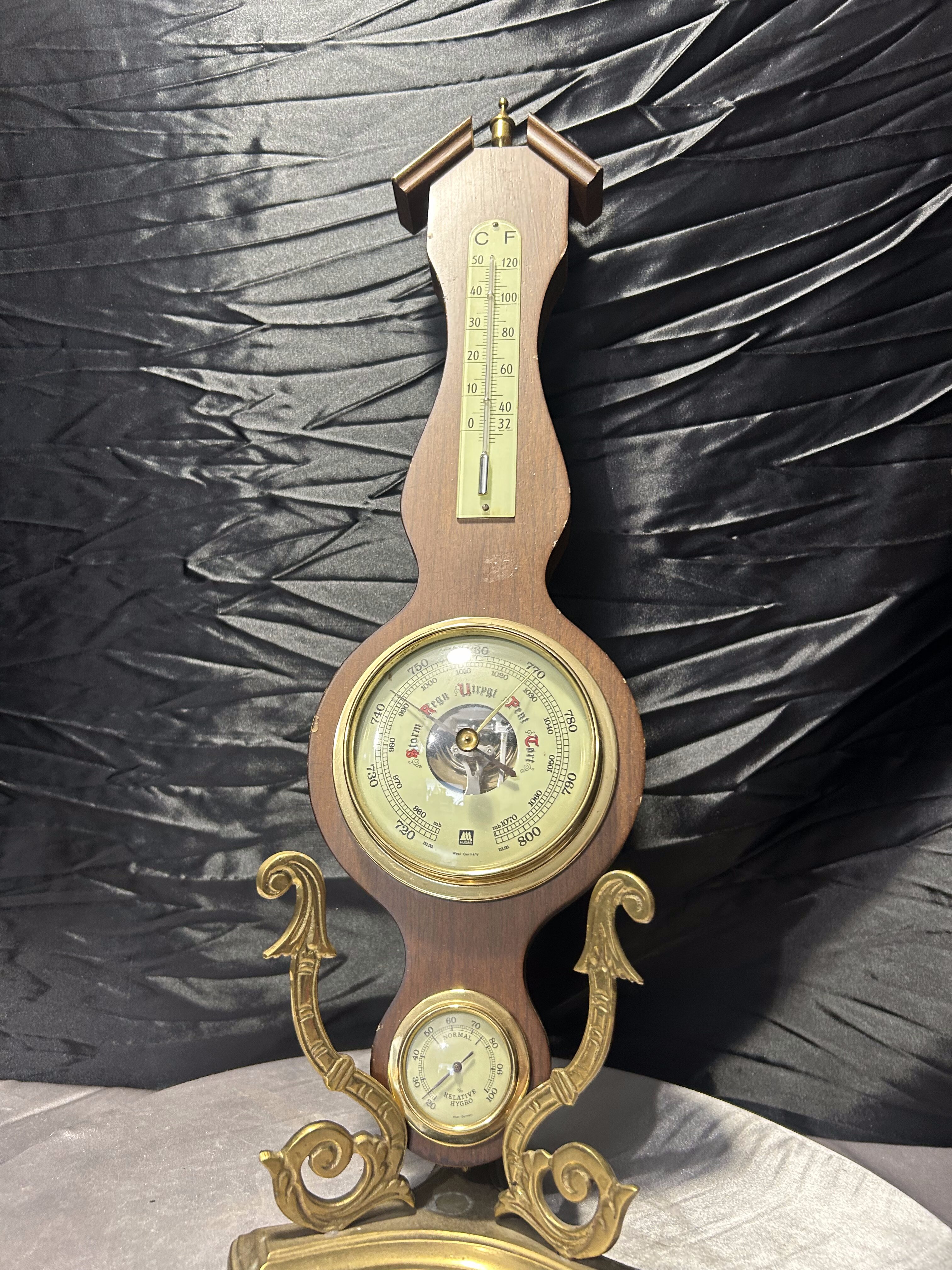 Centralnie umieszczony barometr z czytelną skalą, powyżej termometr w stopniach C i F, a poniżej higrometr do pomiaru wilgotności powietrza. Całość tworzy spójną, dekoracyjną kompozycję, która jest zarówno praktyczna, jak i efektowna wizualnie.