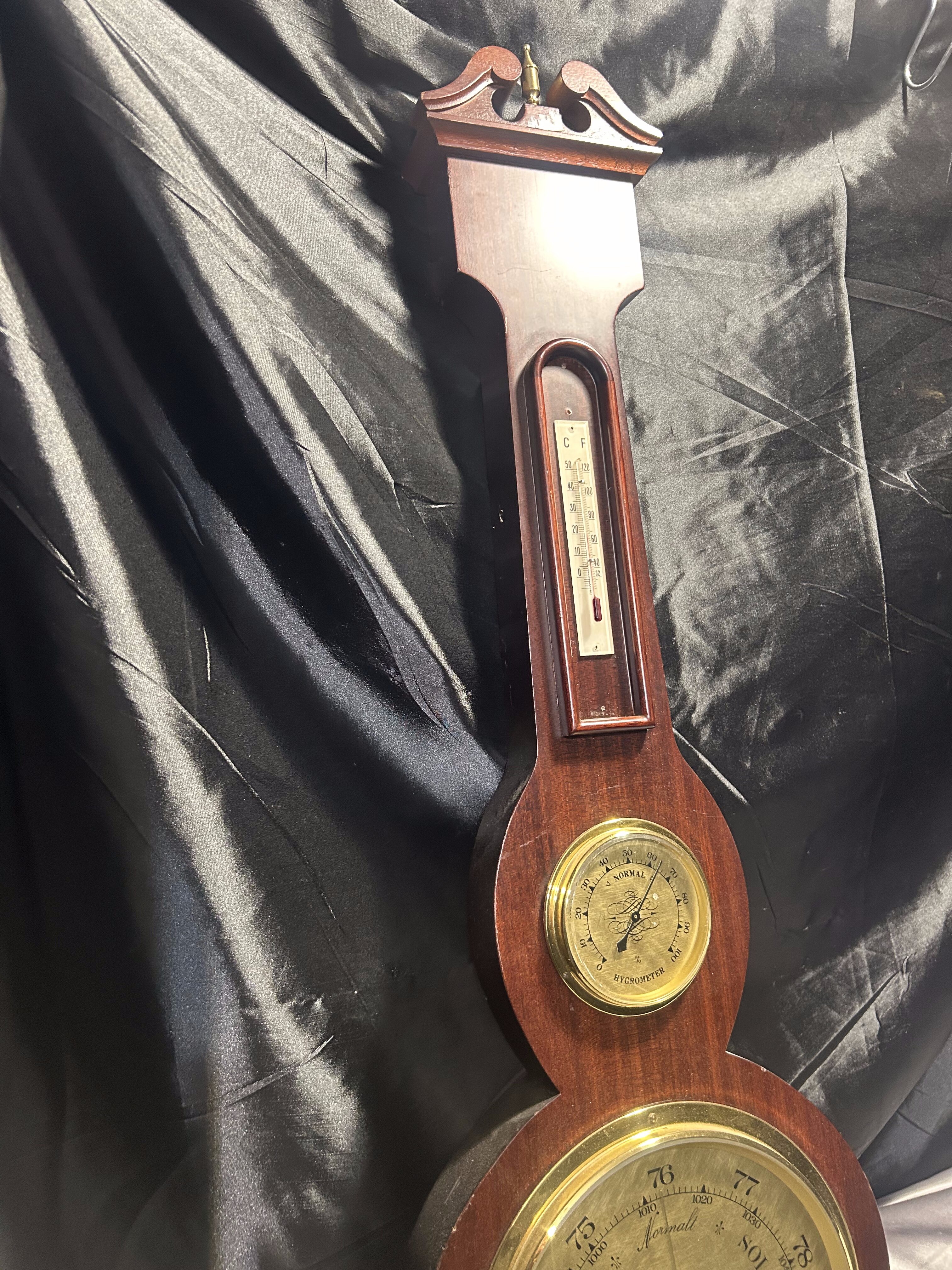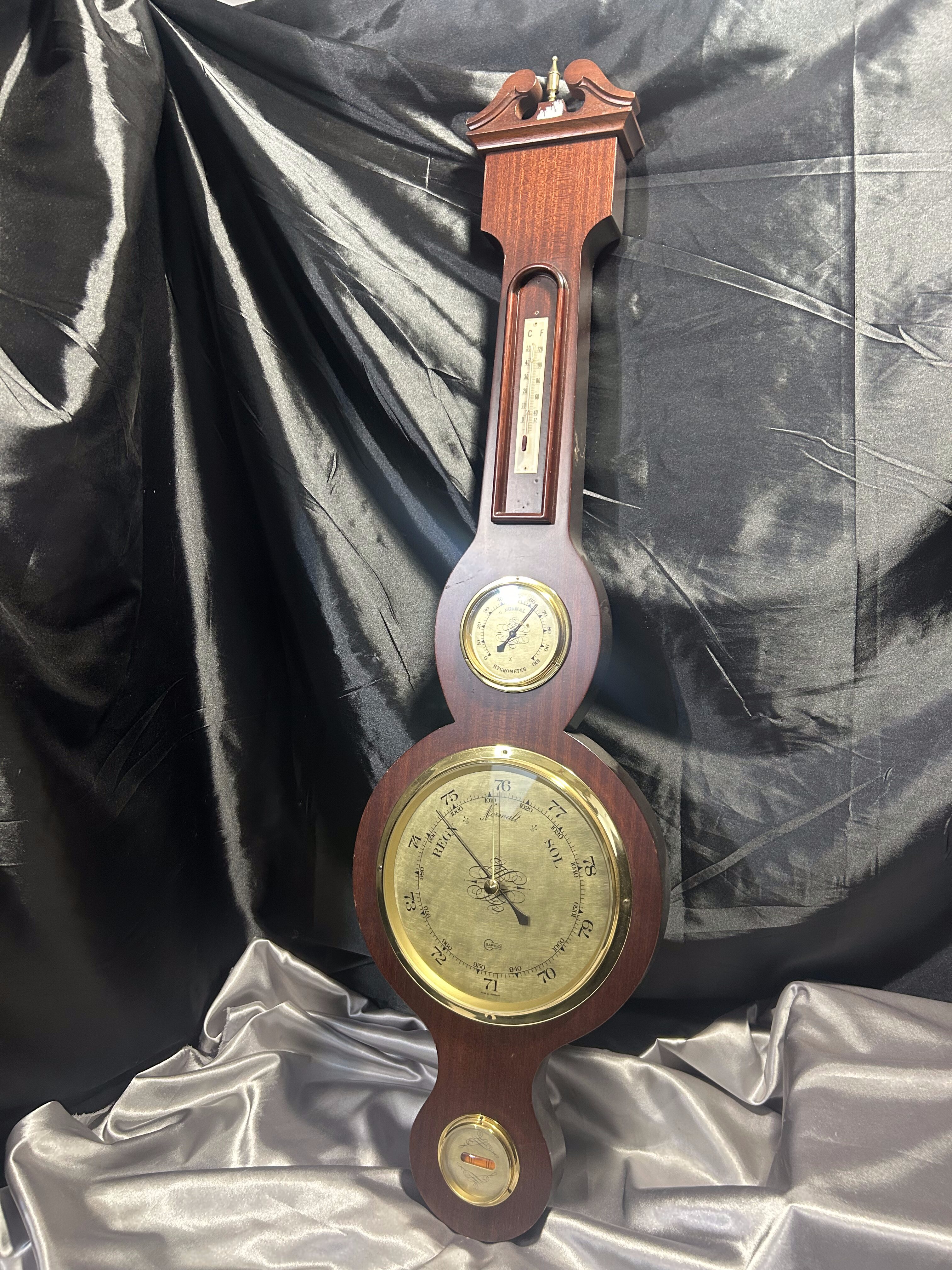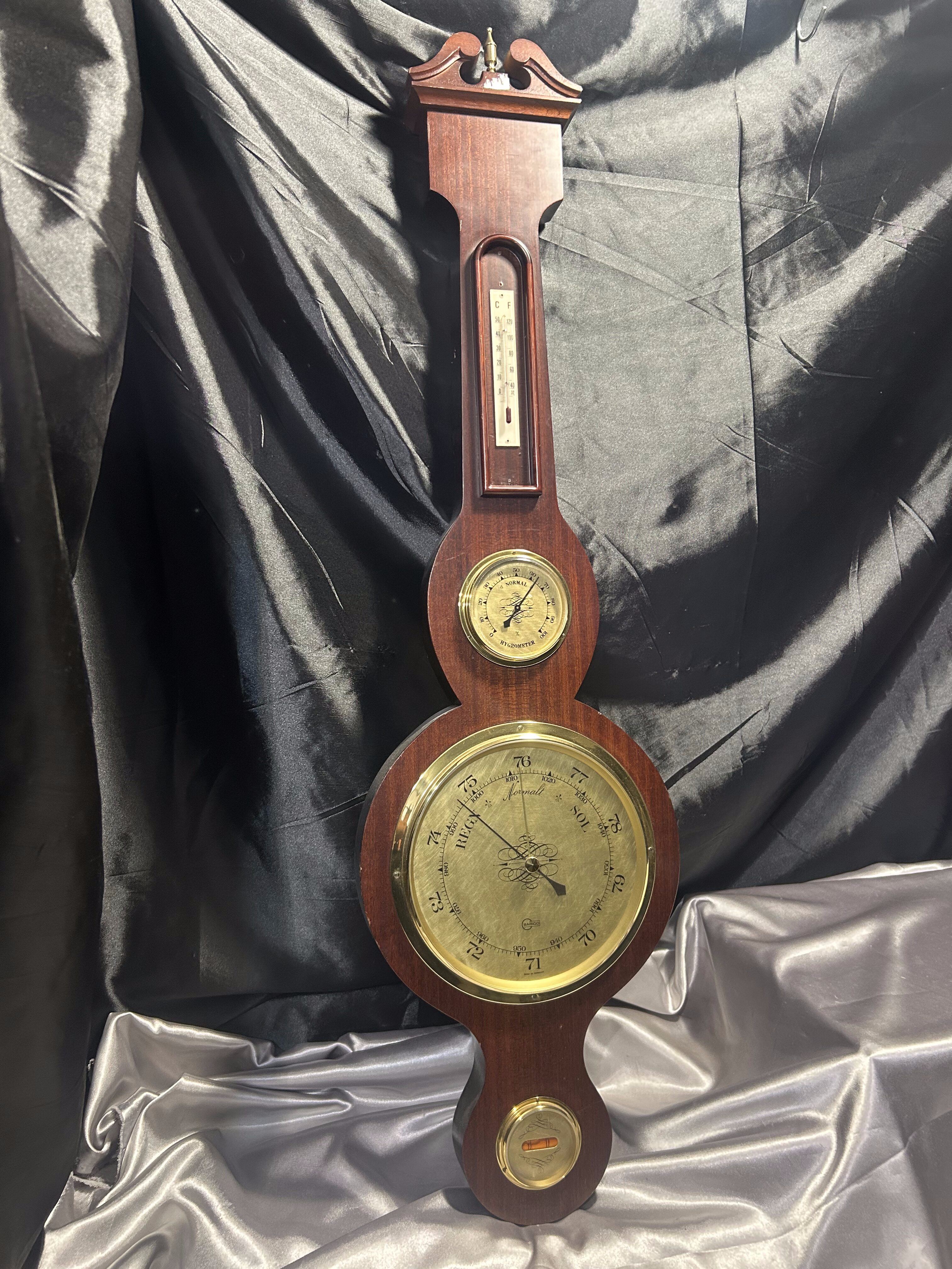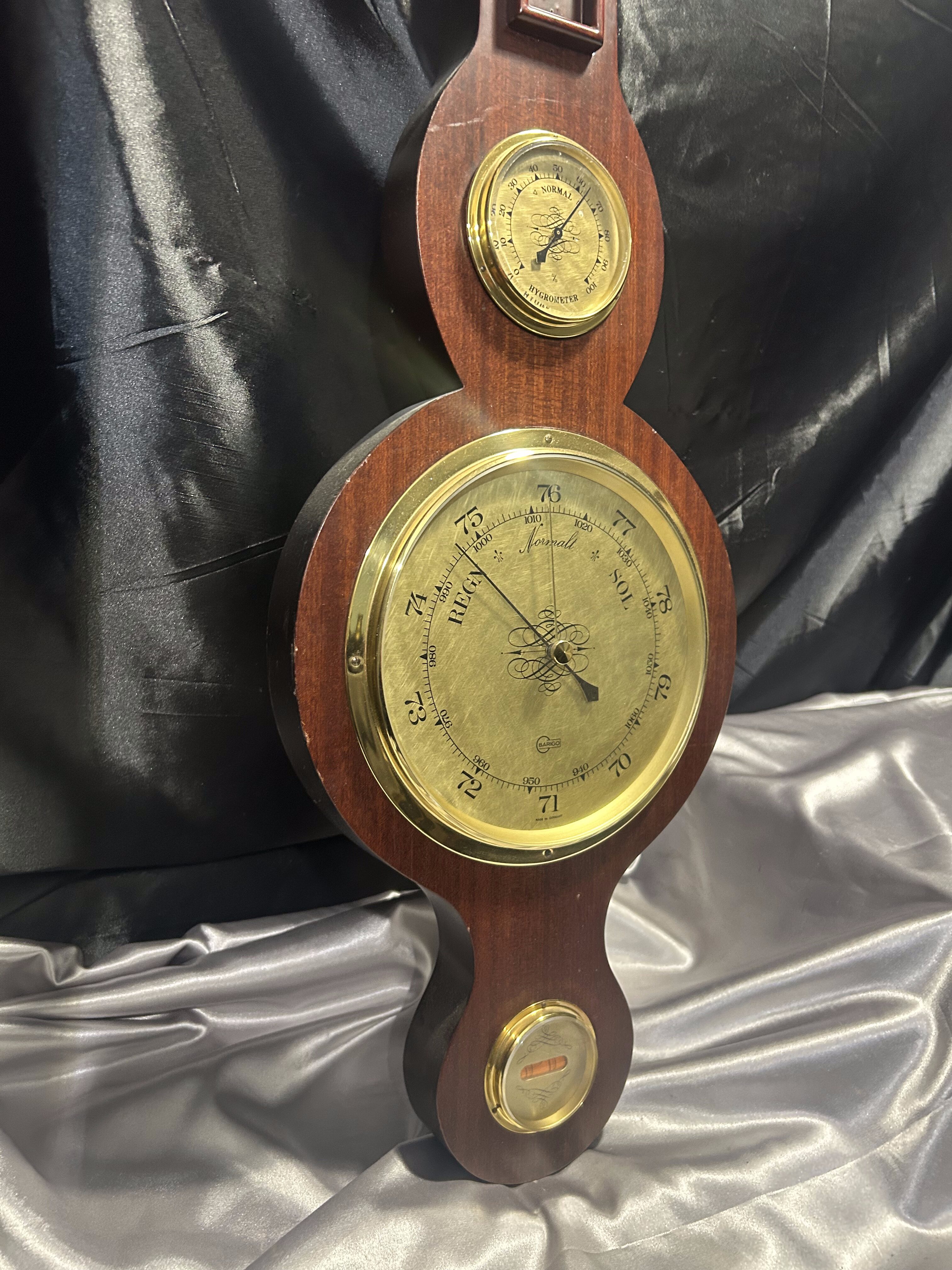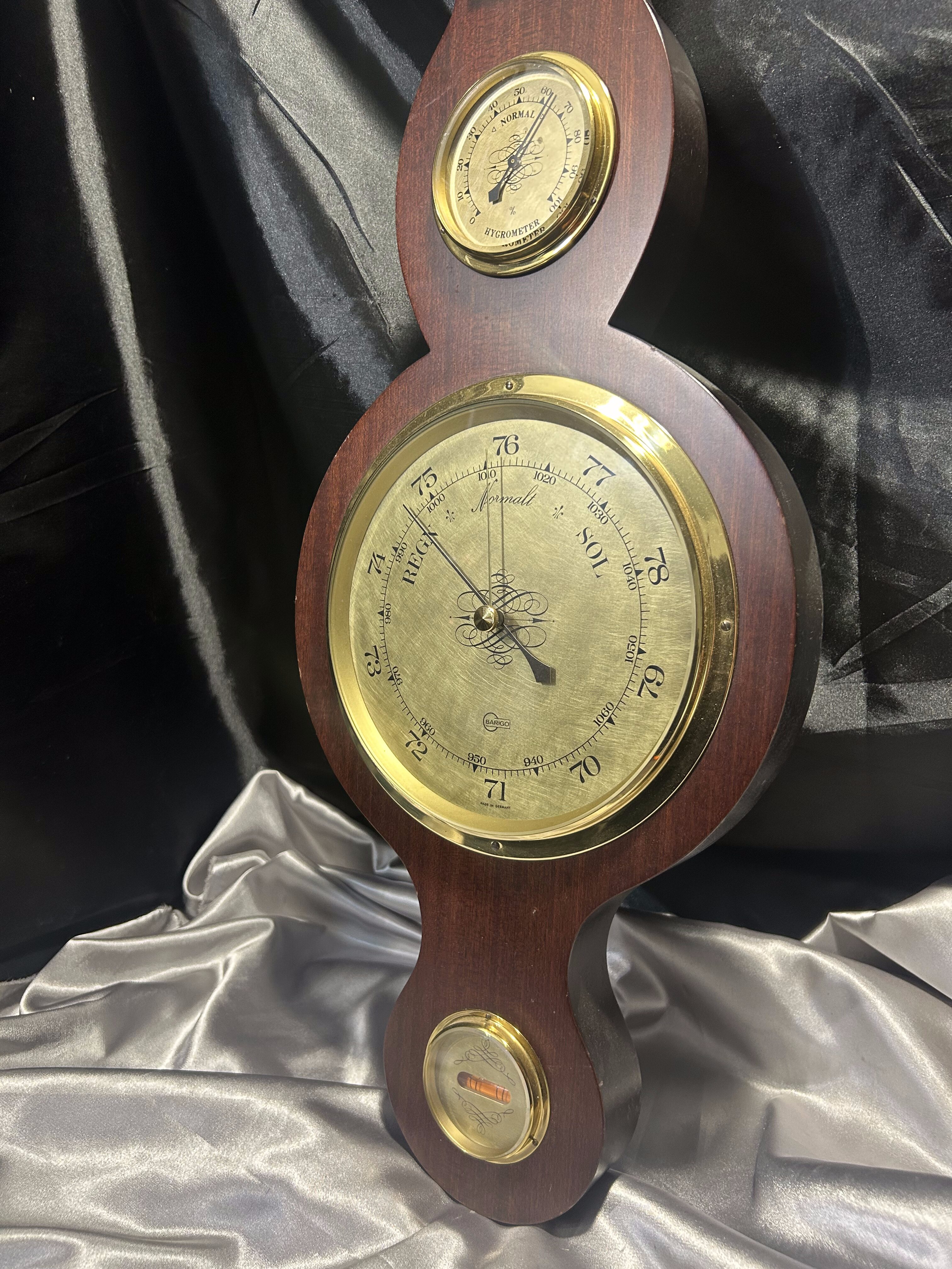 Imponująca stacja meteorologiczna 4 w 1 marki BARIGO, łącząca w jednej formie barometr, termometr, higrometr oraz poziomicę. Umieszczona w efektownej, drewnianej oprawie o wyjątkowo dużych wymiarach, prezentuje się niezwykle okazale – idealna do reprezentacyjnych wnętrz, gabinetów, pensjonatów czy klasycznych salonów.