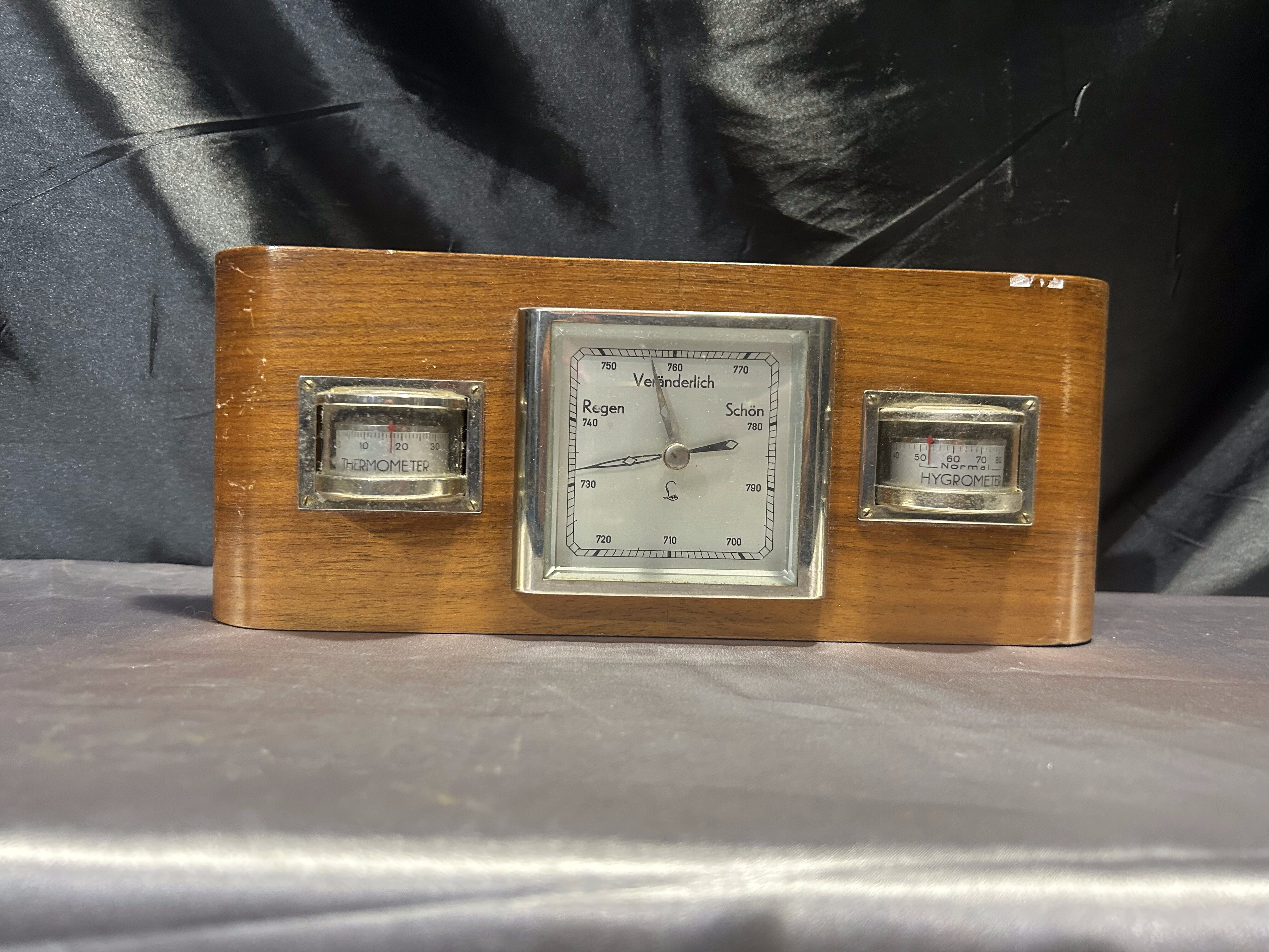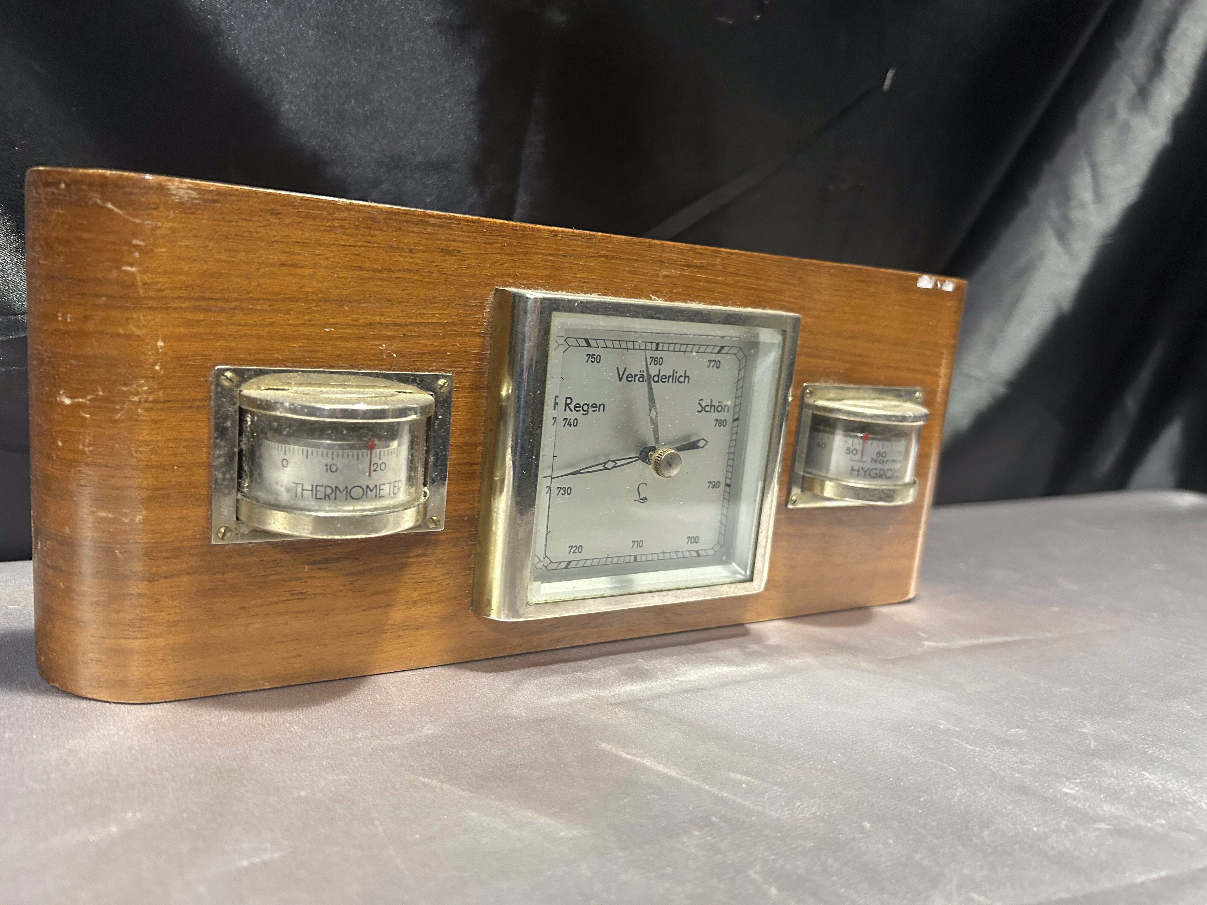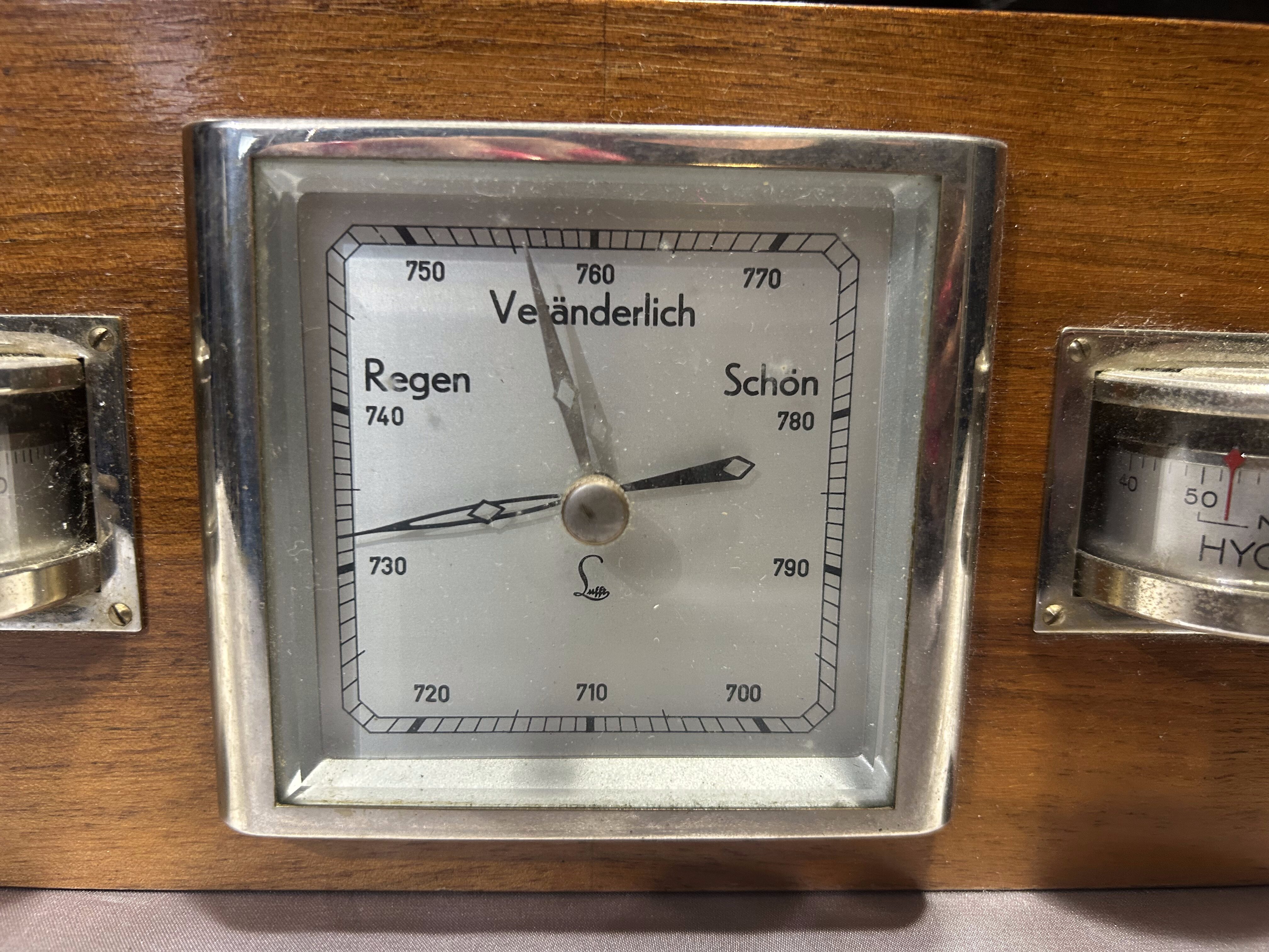 Wyjątkowa, kolekcjonerska stacja meteorologiczna 3 w 1 renomowanej marki LUFFT, w poziomej drewnianej oprawie. Barometr ma klasyczną formę, natomiast termometr i higrometr wykonane są w formie precyzyjnych skal – co czyni ten egzemplarz unikatowym i niezwykle efektownym. Idealny dla pasjonatów meteorologii, kolekcjonerów i miłośników nietypowych form.