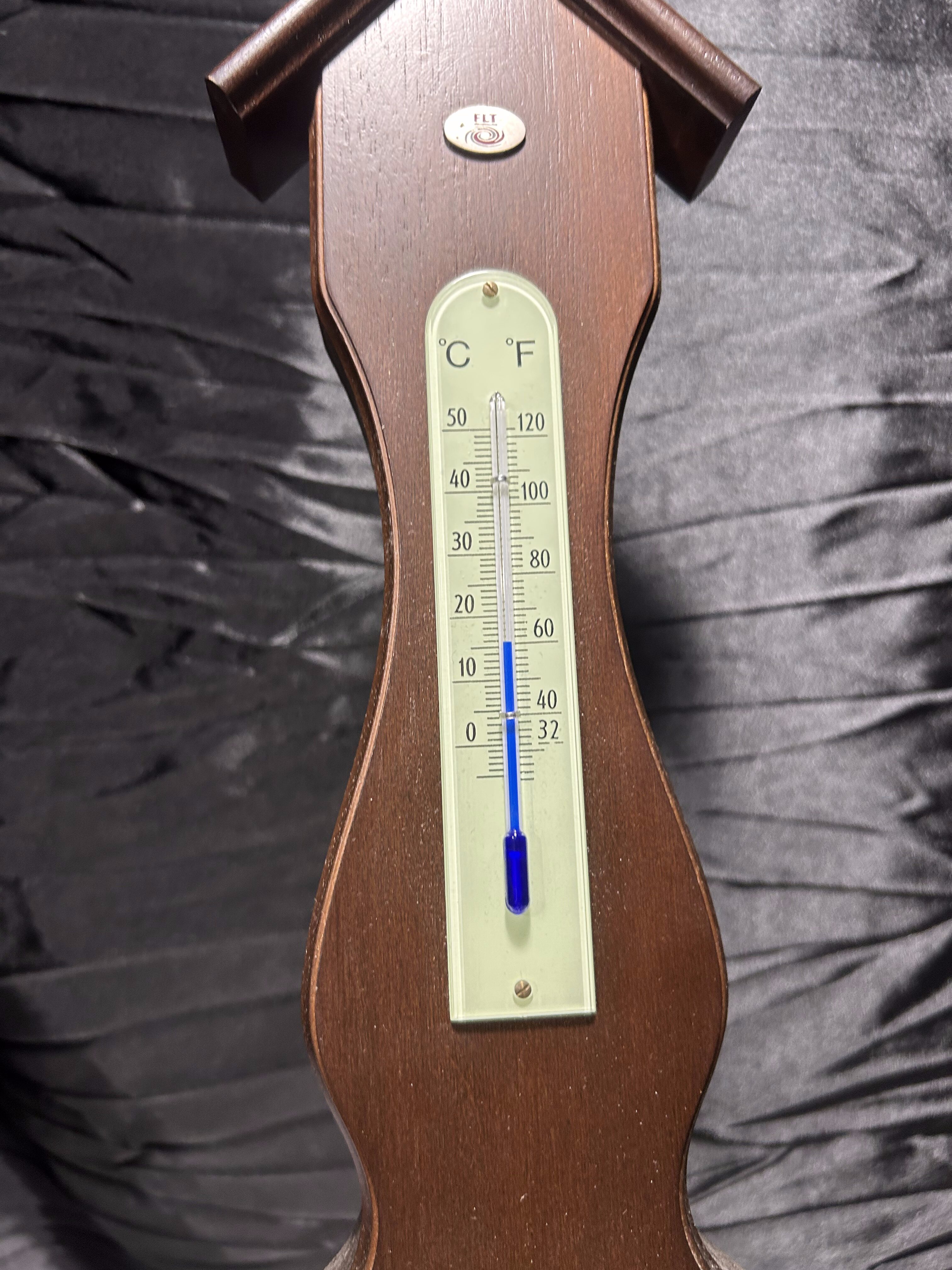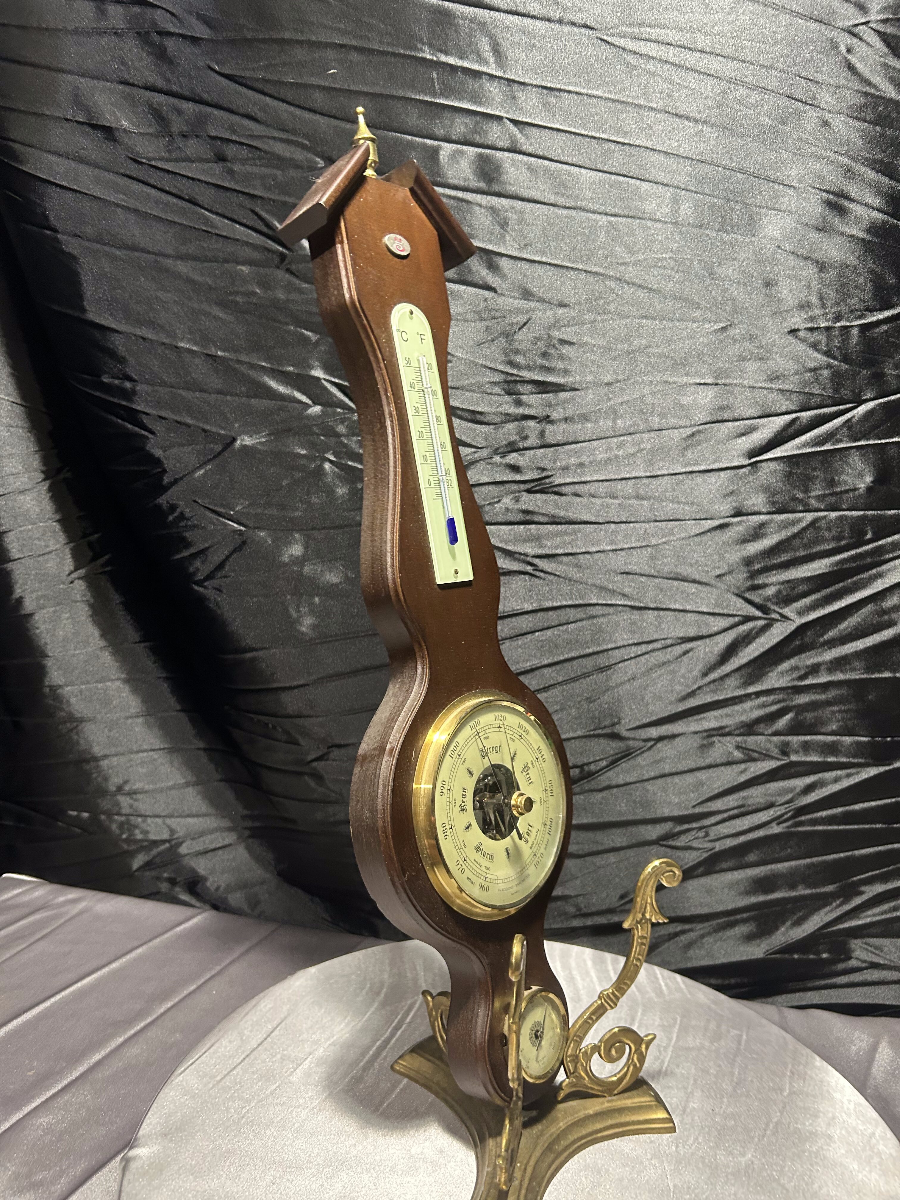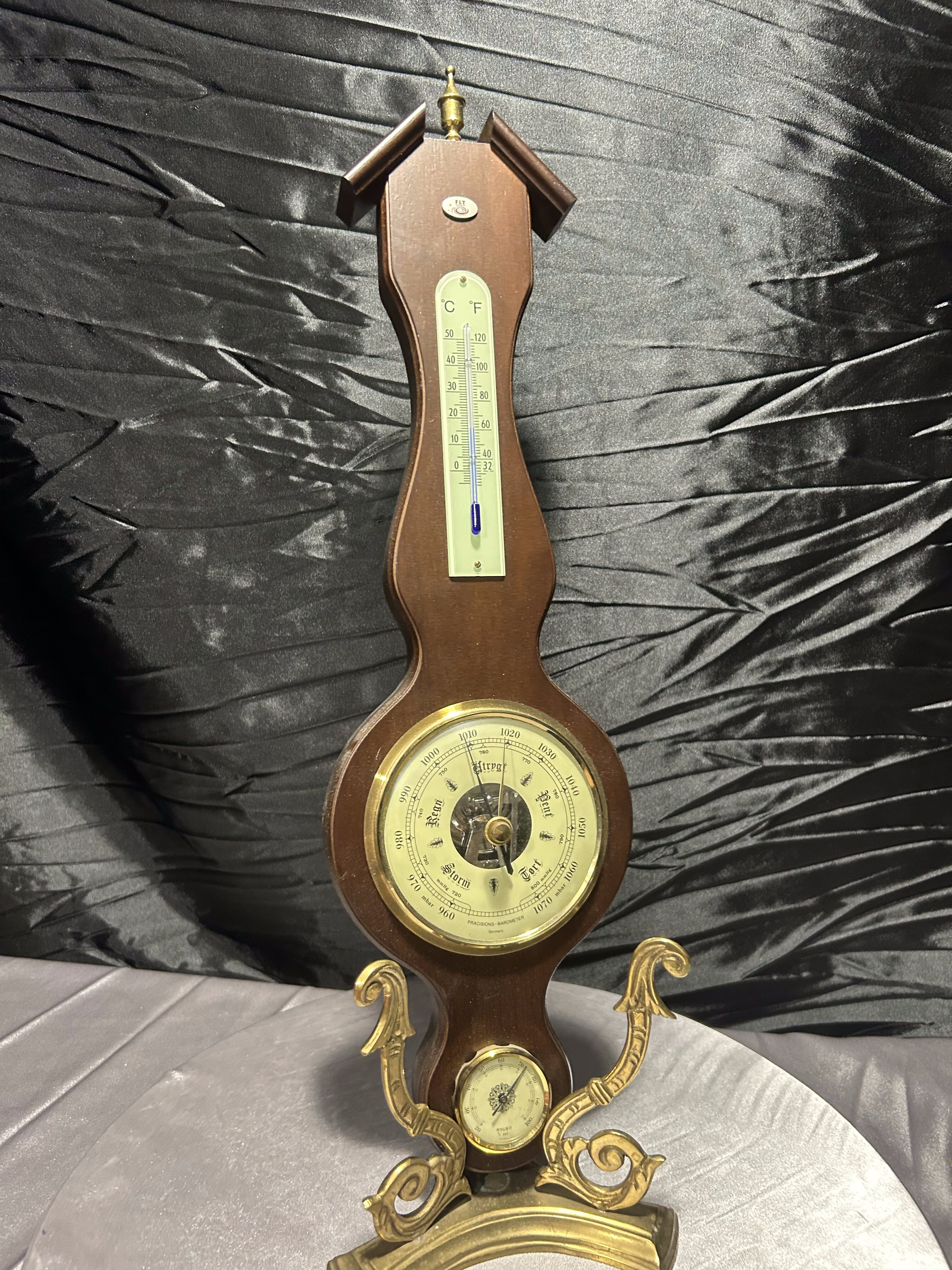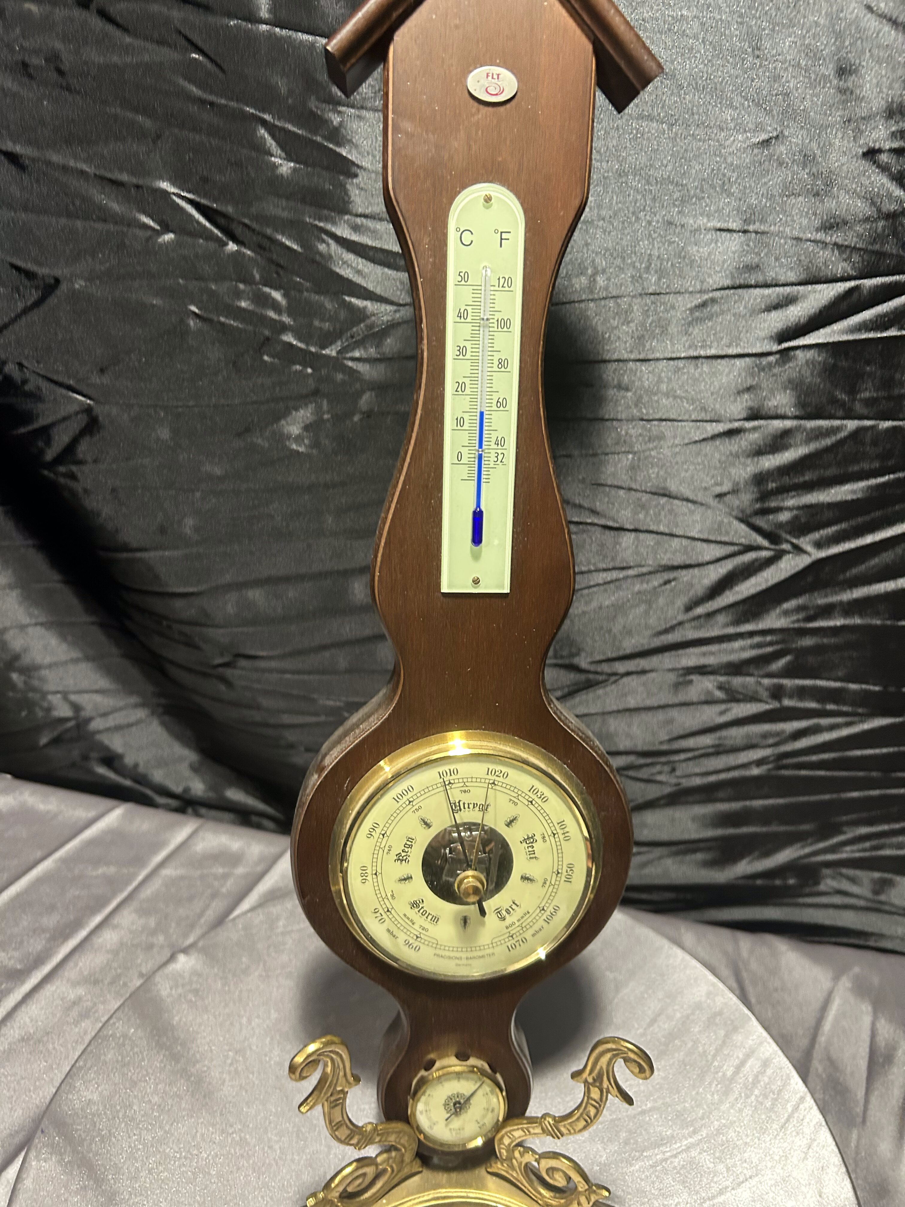 Elegancka domowa stacja pogodowa 3 w 1: barometr, termometr i higrometr w jednej drewnianej obudowie, sygnowanej „Made in Germany”, marką FLT. Konstrukcja w stylu klasycznym – wysoka obudowa o wysokości około 50 cm, front z tarczą barometru, w górnej części termometr z podziałką °C/°F, w dolnej – mały higrometr. Obudowa w kolorze ciemnego drewna, detale metalowe w kolorze mosiądzu. Idealna jako dekoracja wnętrza z funkcją pomiarową lub jako element vintage-kolekcji.