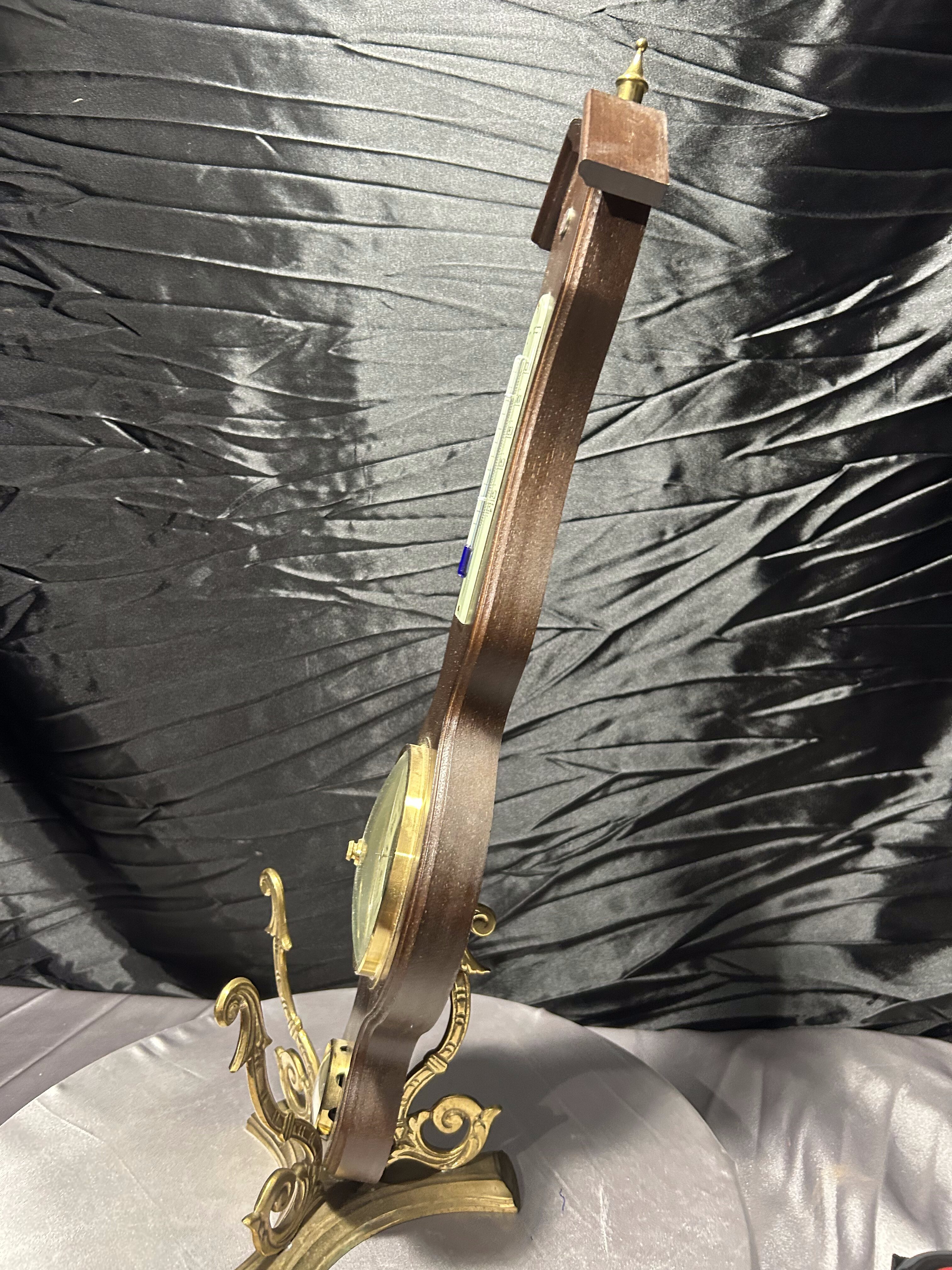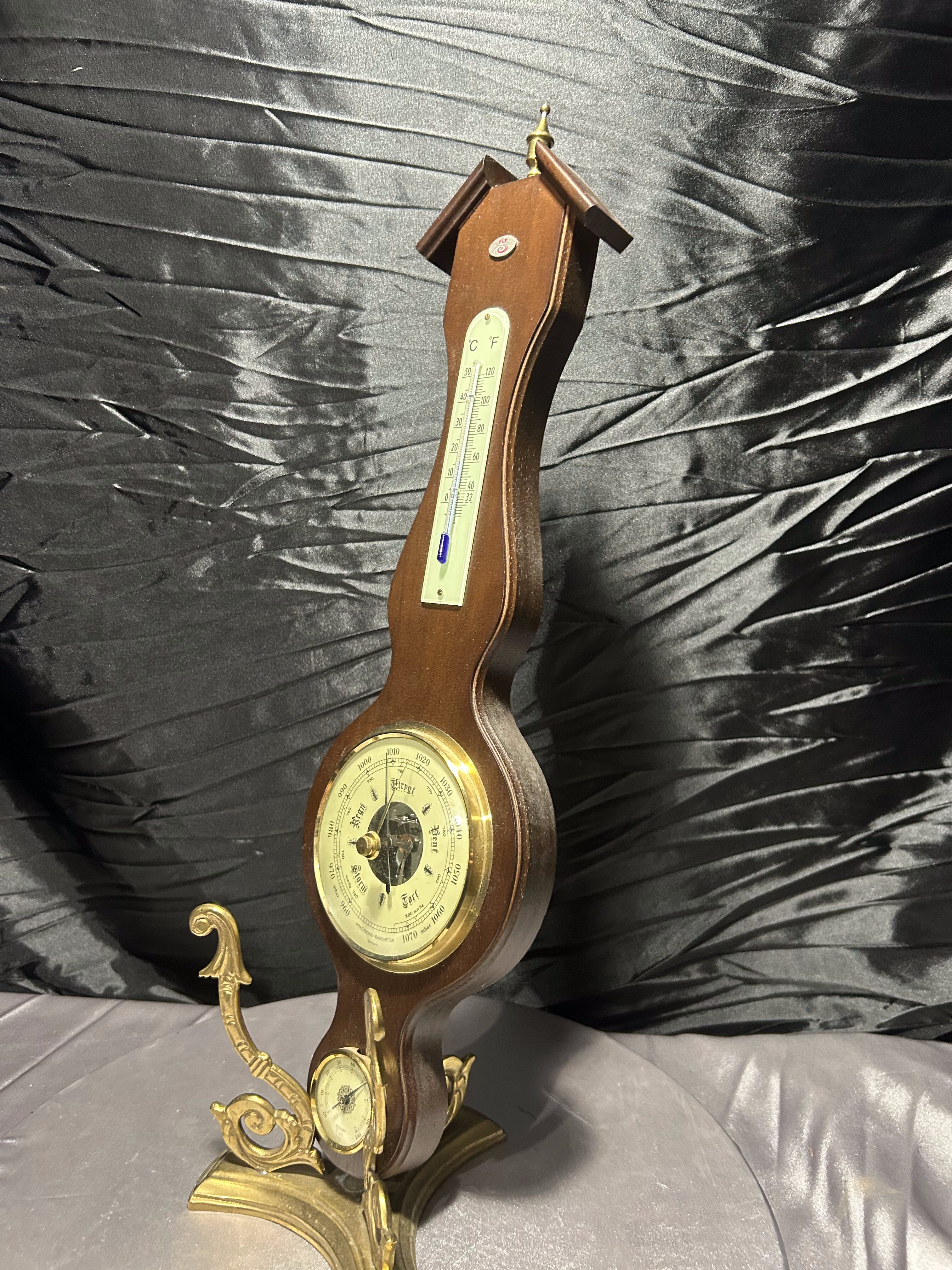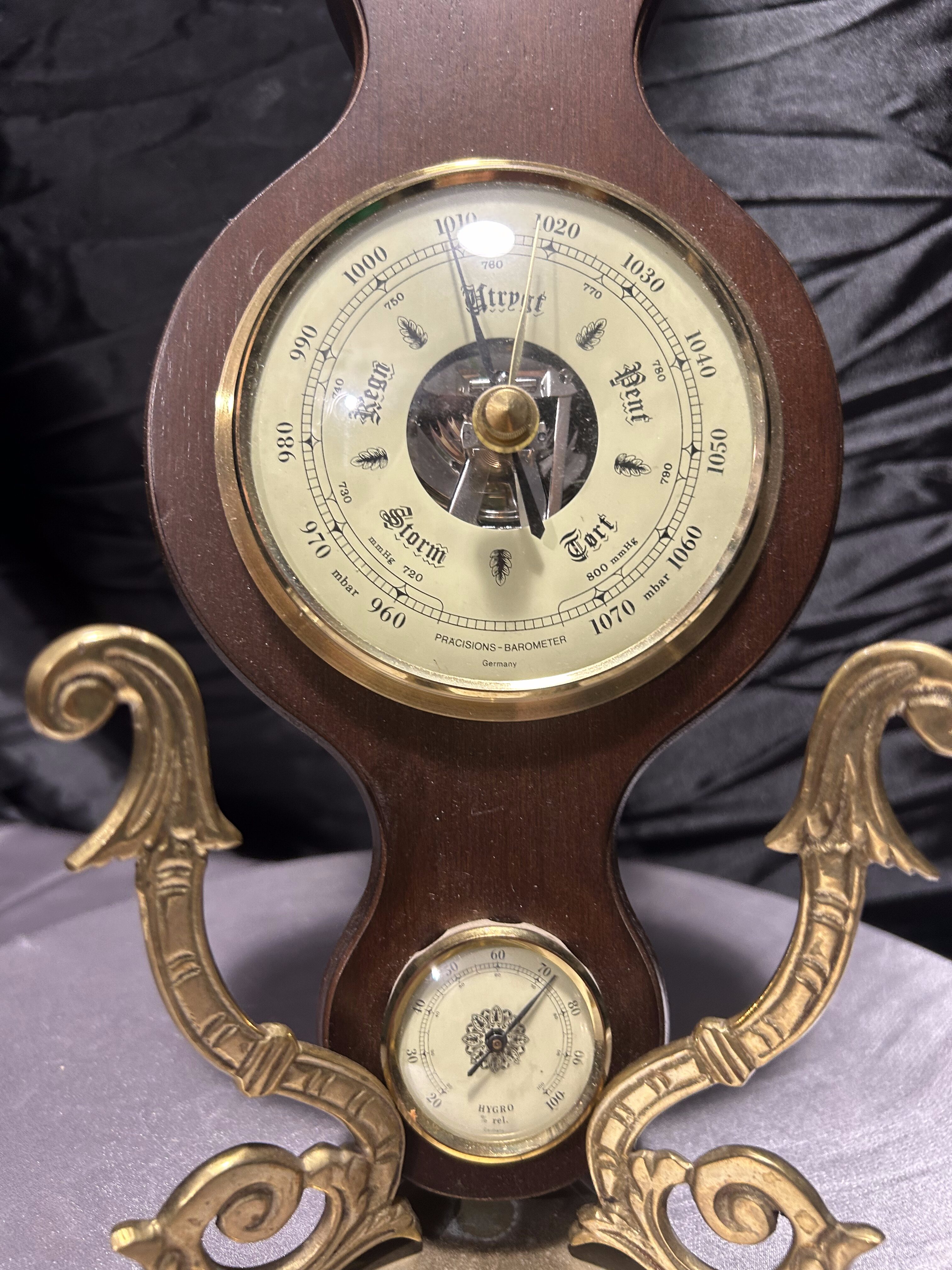Elegancka domowa stacja pogodowa 3 w 1: barometr, termometr i higrometr w jednej drewnianej obudowie, sygnowanej „Made in Germany”, marką FLT. Konstrukcja w stylu klasycznym – wysoka obudowa o wysokości około 50 cm, front z tarczą barometru, w górnej części termometr z podziałką °C/°F, w dolnej – mały higrometr. Obudowa w kolorze ciemnego drewna, detale metalowe w kolorze mosiądzu. Idealna jako dekoracja wnętrza z funkcją pomiarową lub jako element vintage-kolekcji.