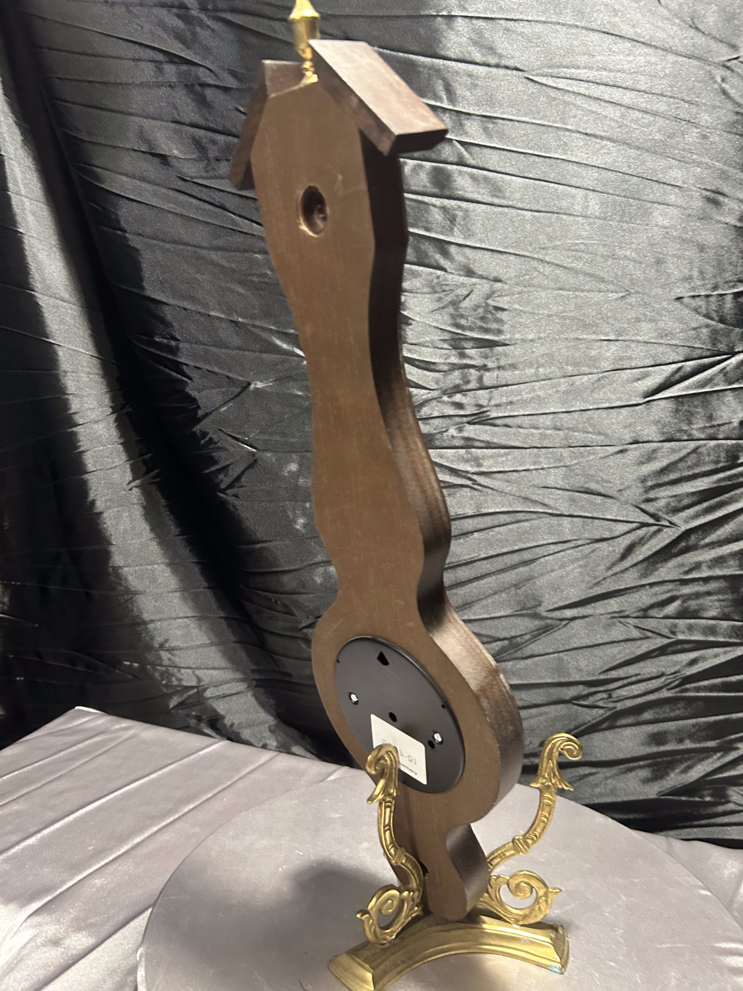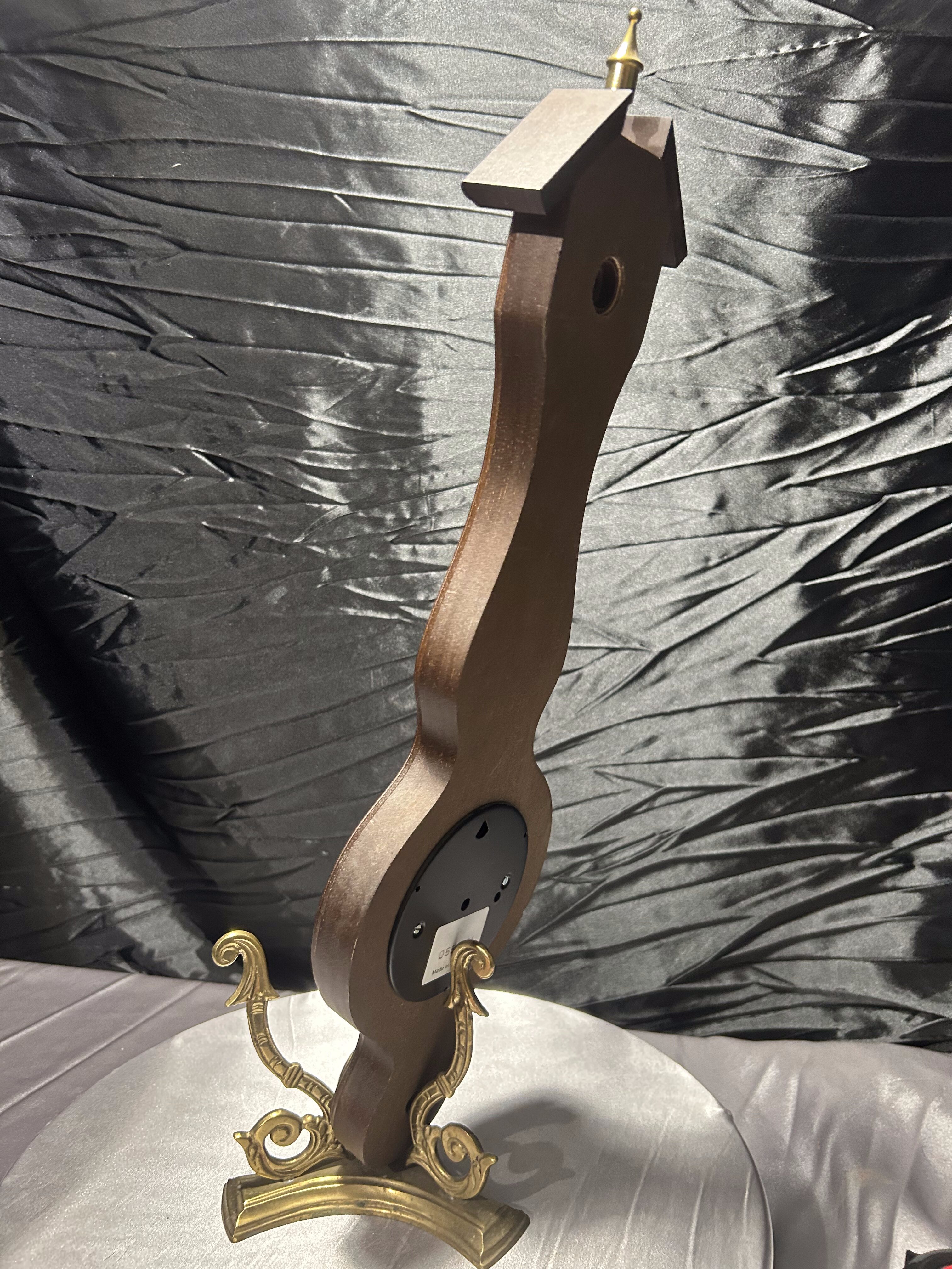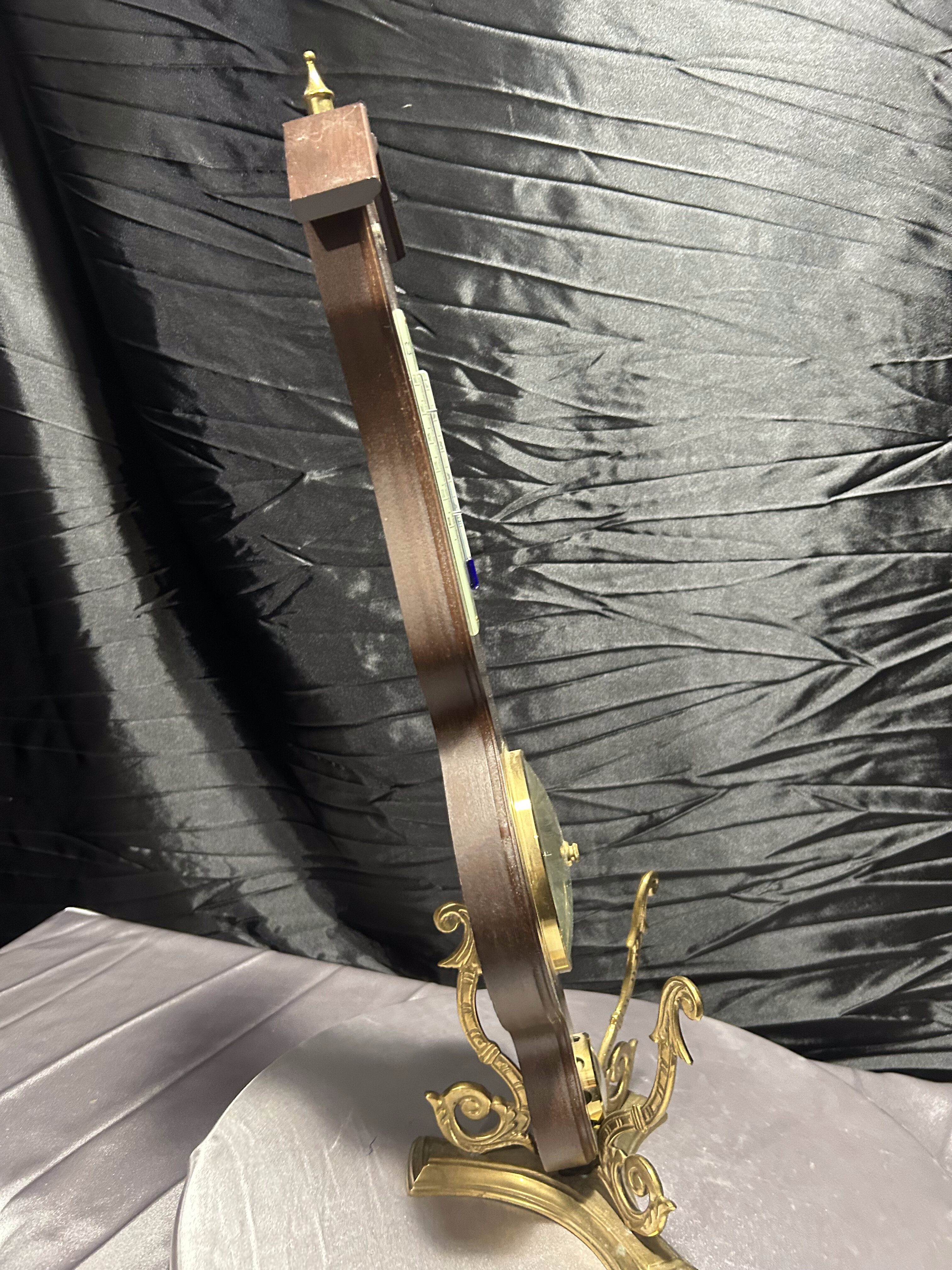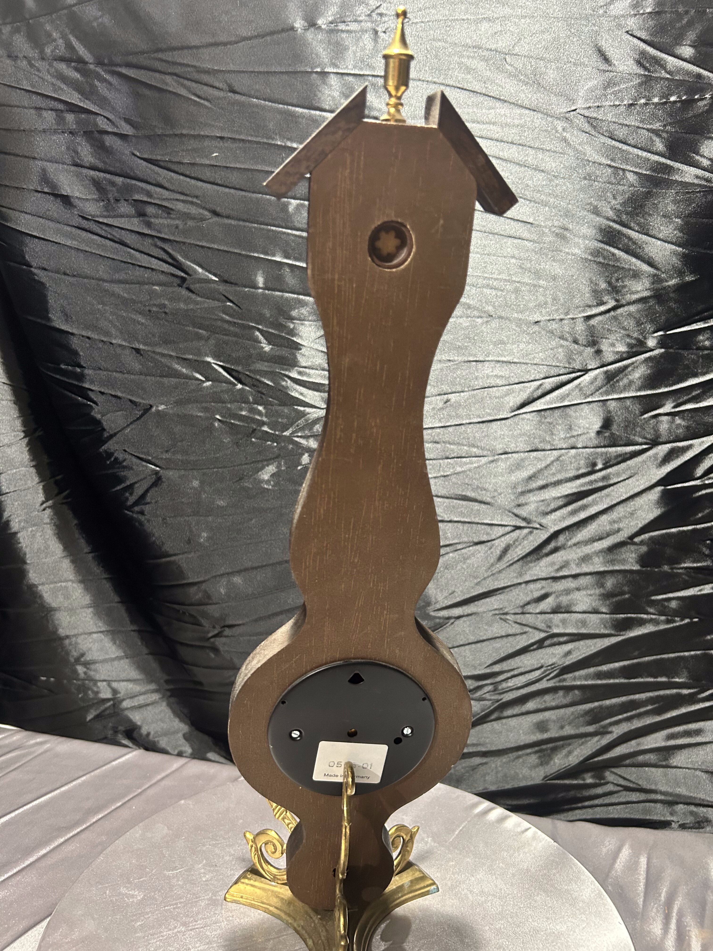 Elegancka domowa stacja pogodowa 3 w 1: barometr, termometr i higrometr w jednej drewnianej obudowie, sygnowanej „Made in Germany”, marką FLT. Konstrukcja w stylu klasycznym – wysoka obudowa o wysokości około 50 cm, front z tarczą barometru, w górnej części termometr z podziałką °C/°F, w dolnej – mały higrometr. Obudowa w kolorze ciemnego drewna, detale metalowe w kolorze mosiądzu. Idealna jako dekoracja wnętrza z funkcją pomiarową lub jako element vintage-kolekcji.