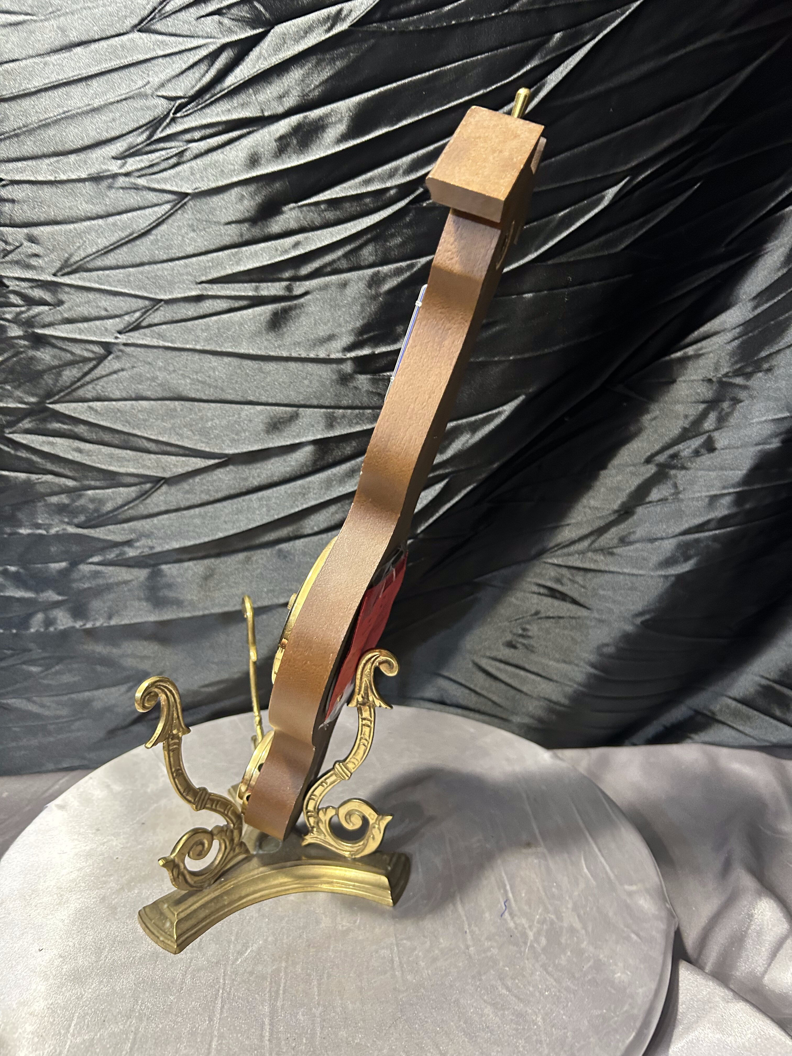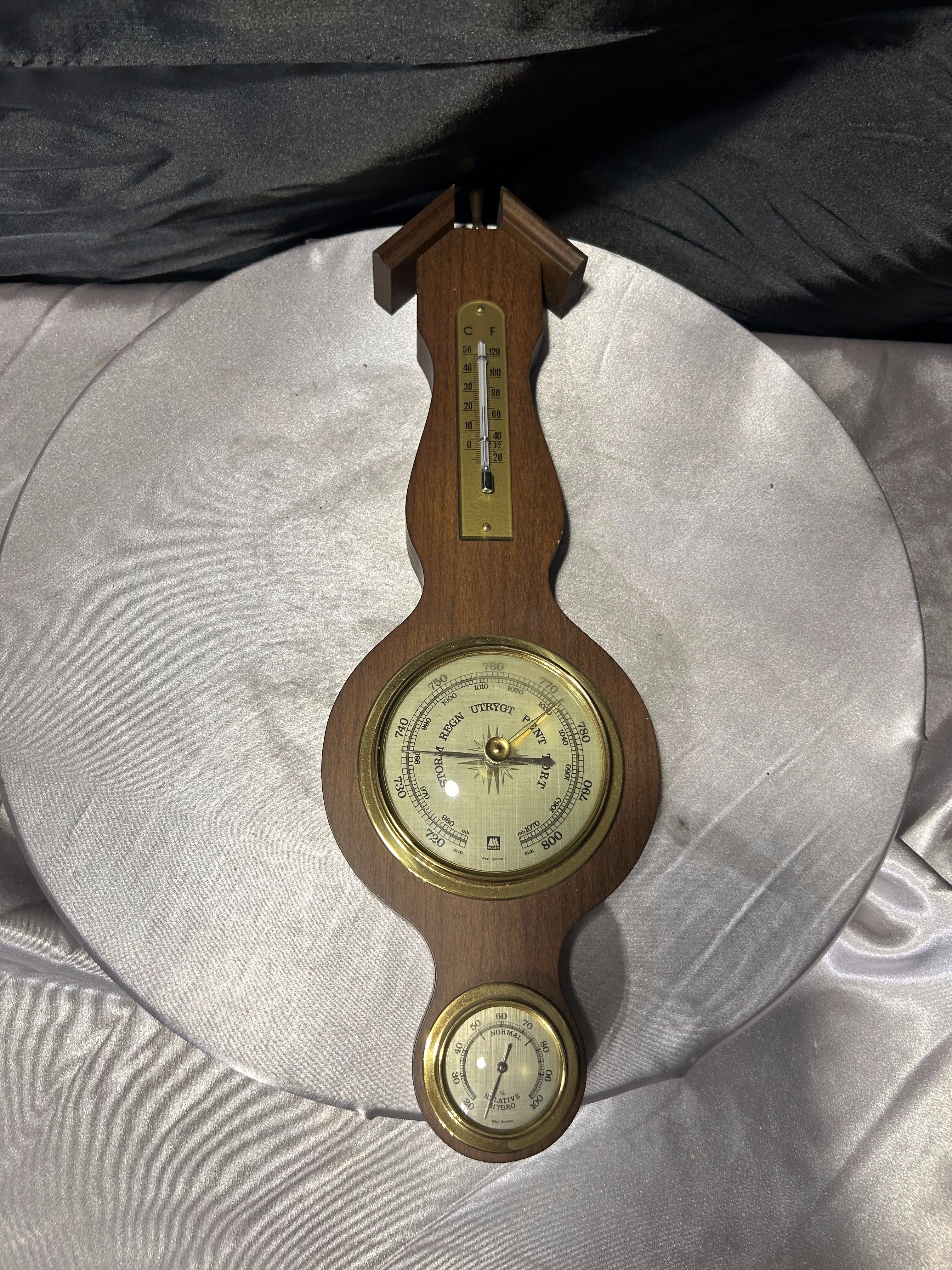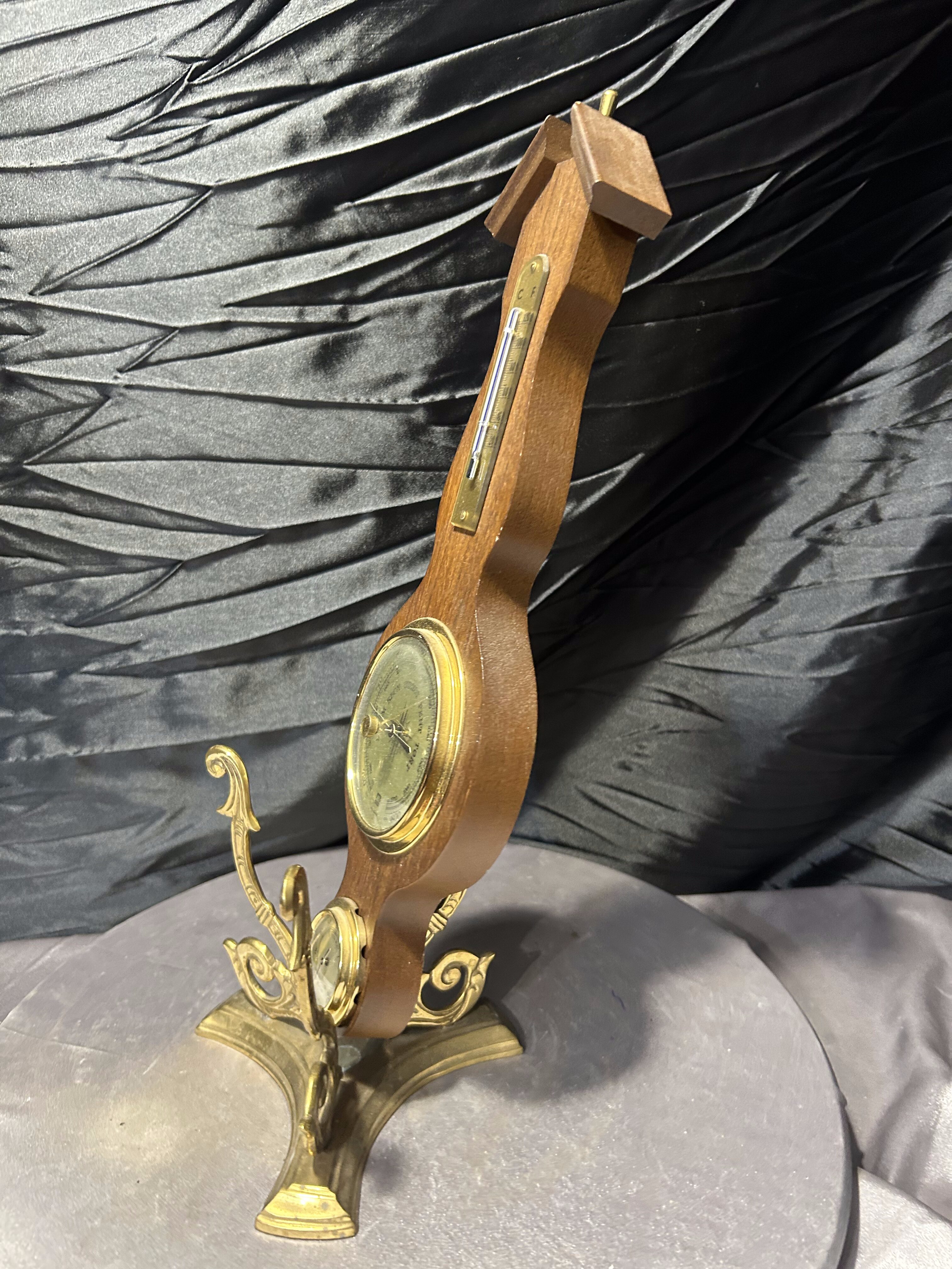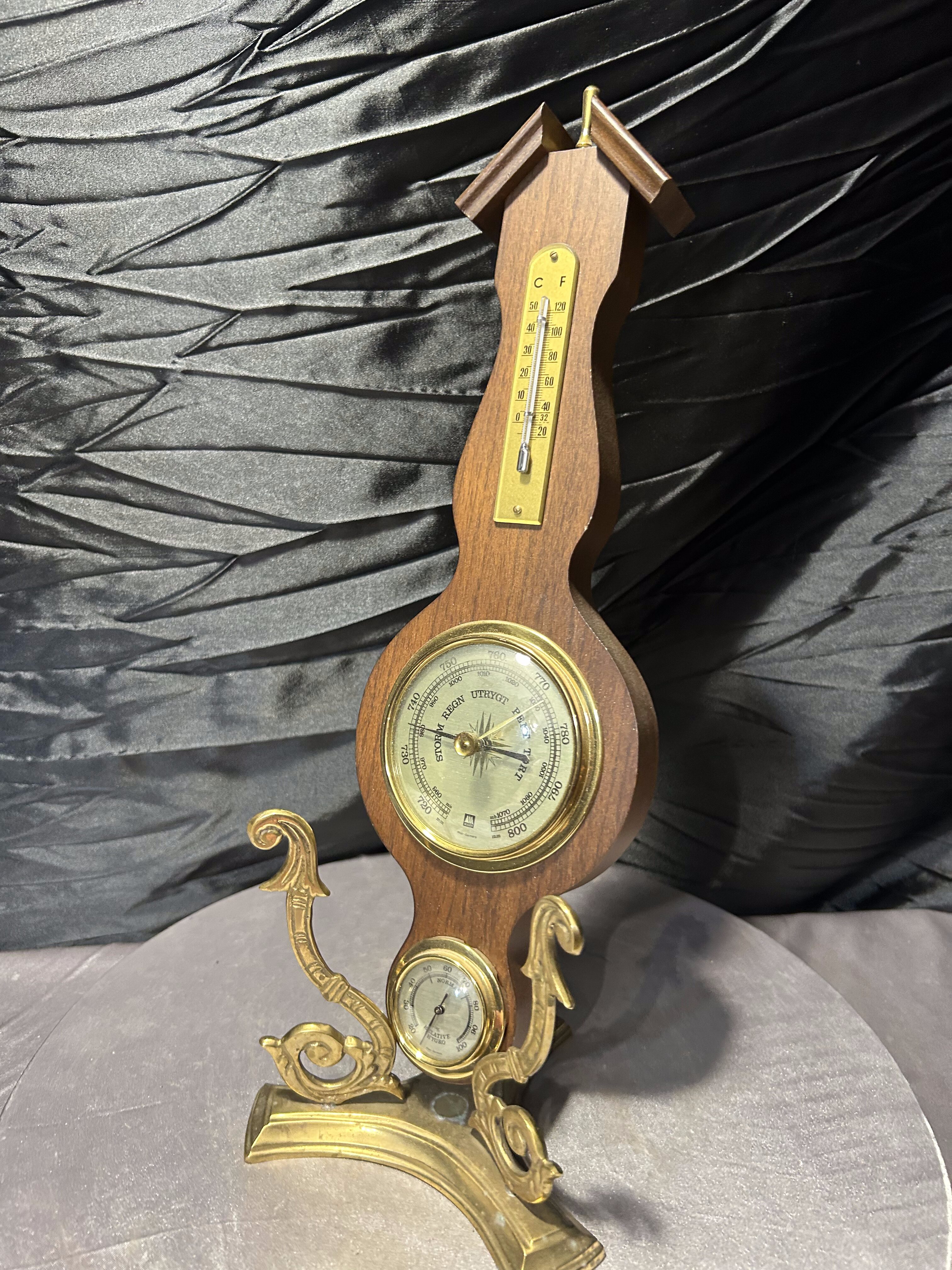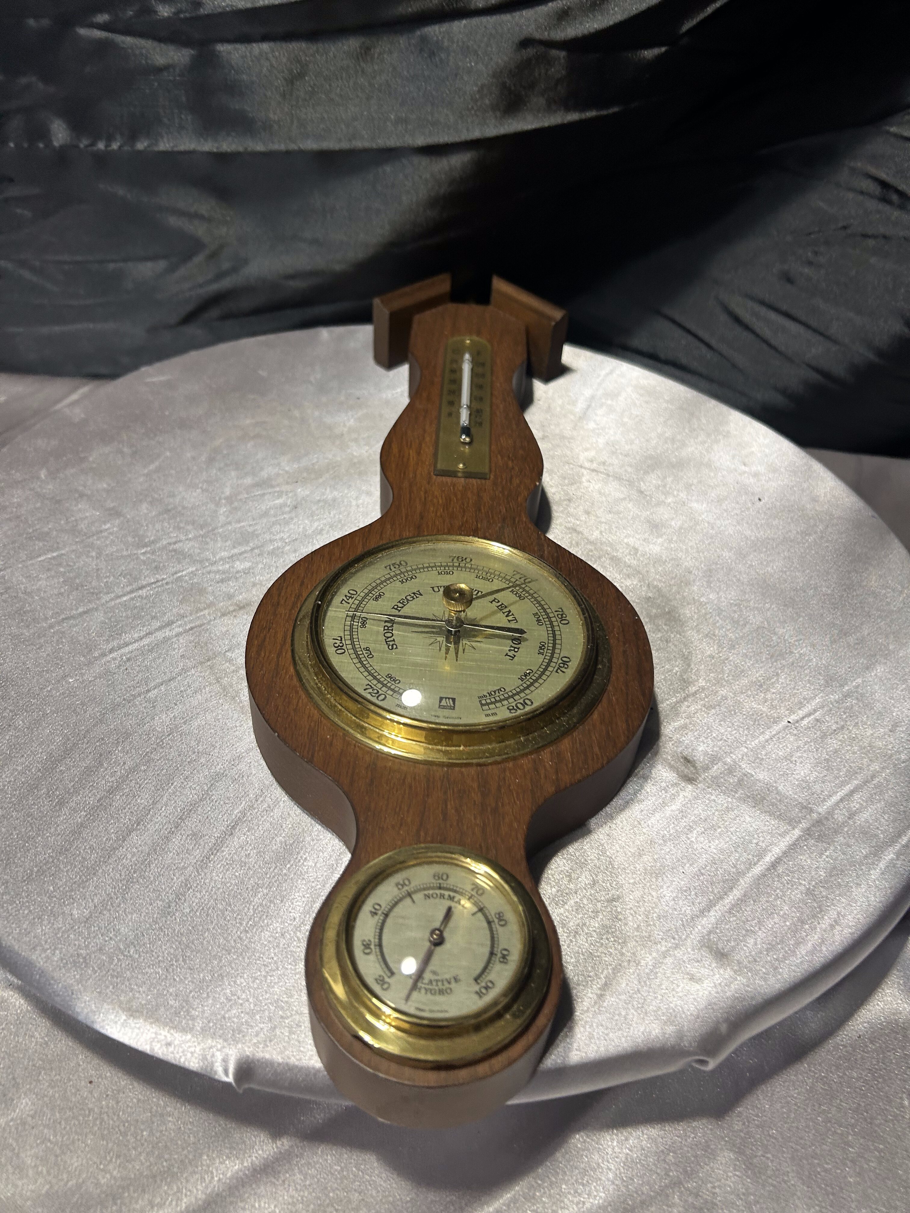 Centralnie umieszczony barometr z czytelną tarczą pozwala obserwować zmiany ciśnienia atmosferycznego, powyżej znajduje się termometr w skali C i F, a u dołu higrometr wskazujący poziom wilgotności powietrza. Złocone obramowania kontrastują z ciepłym odcieniem drewna, tworząc harmonijną i estetyczną kompozycję.