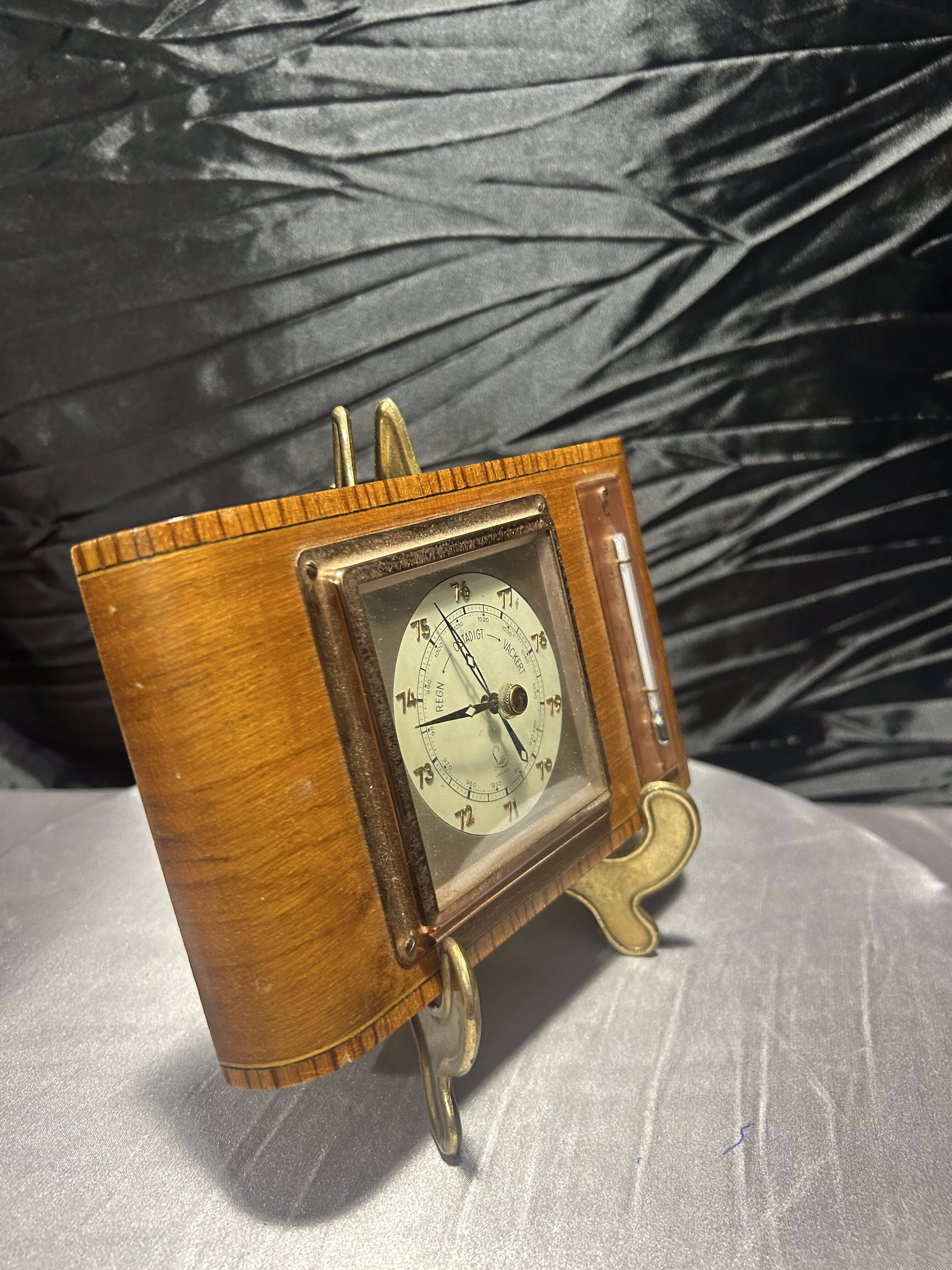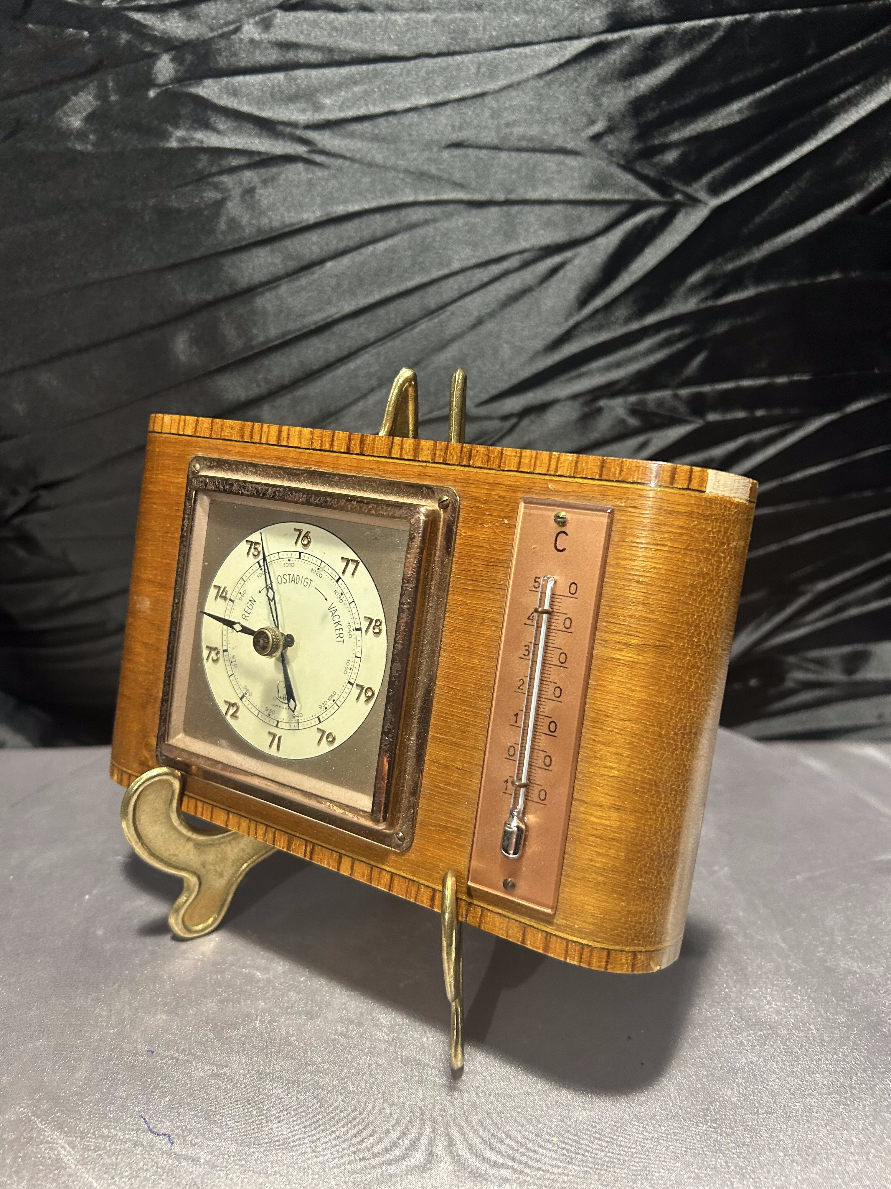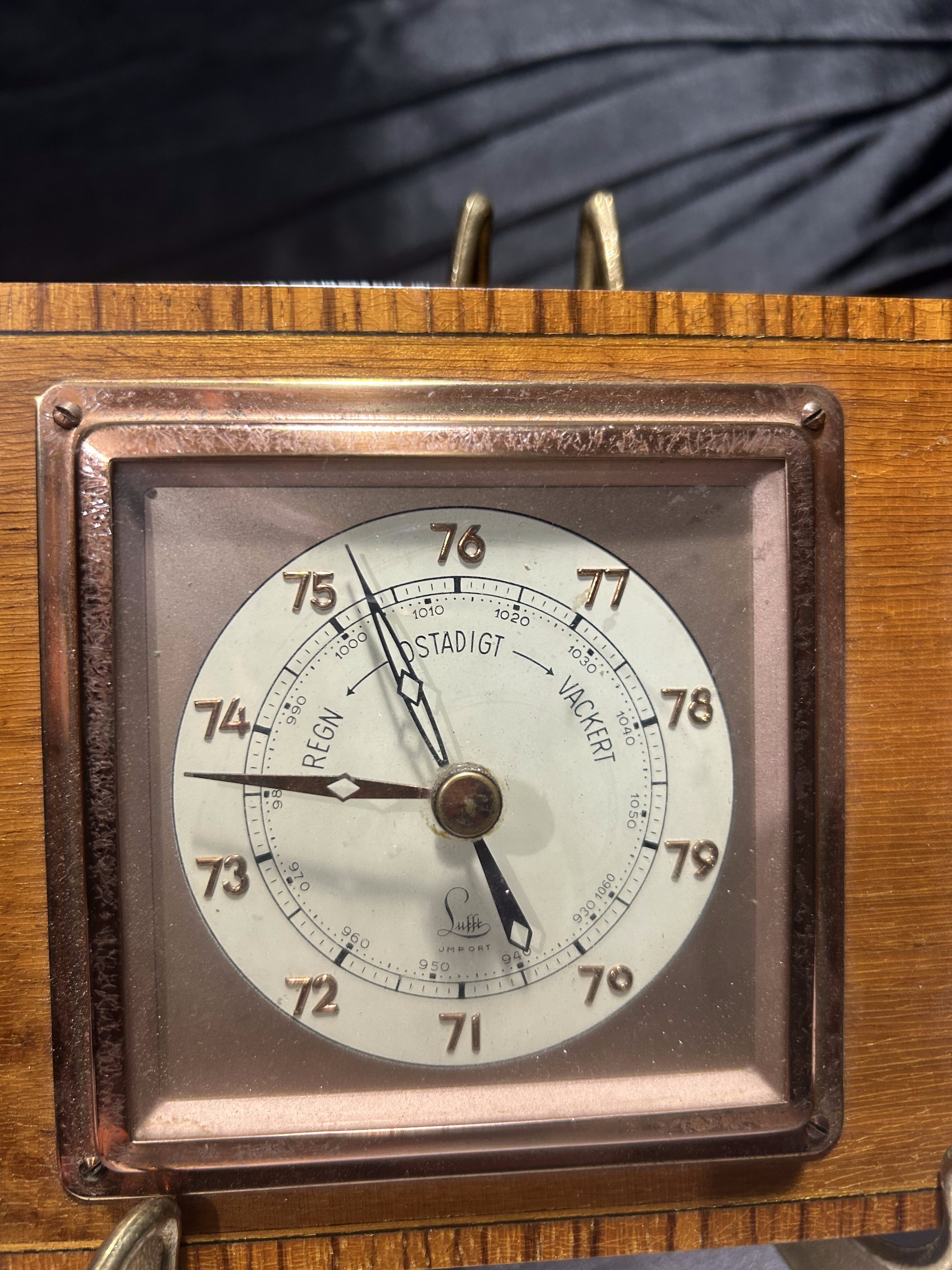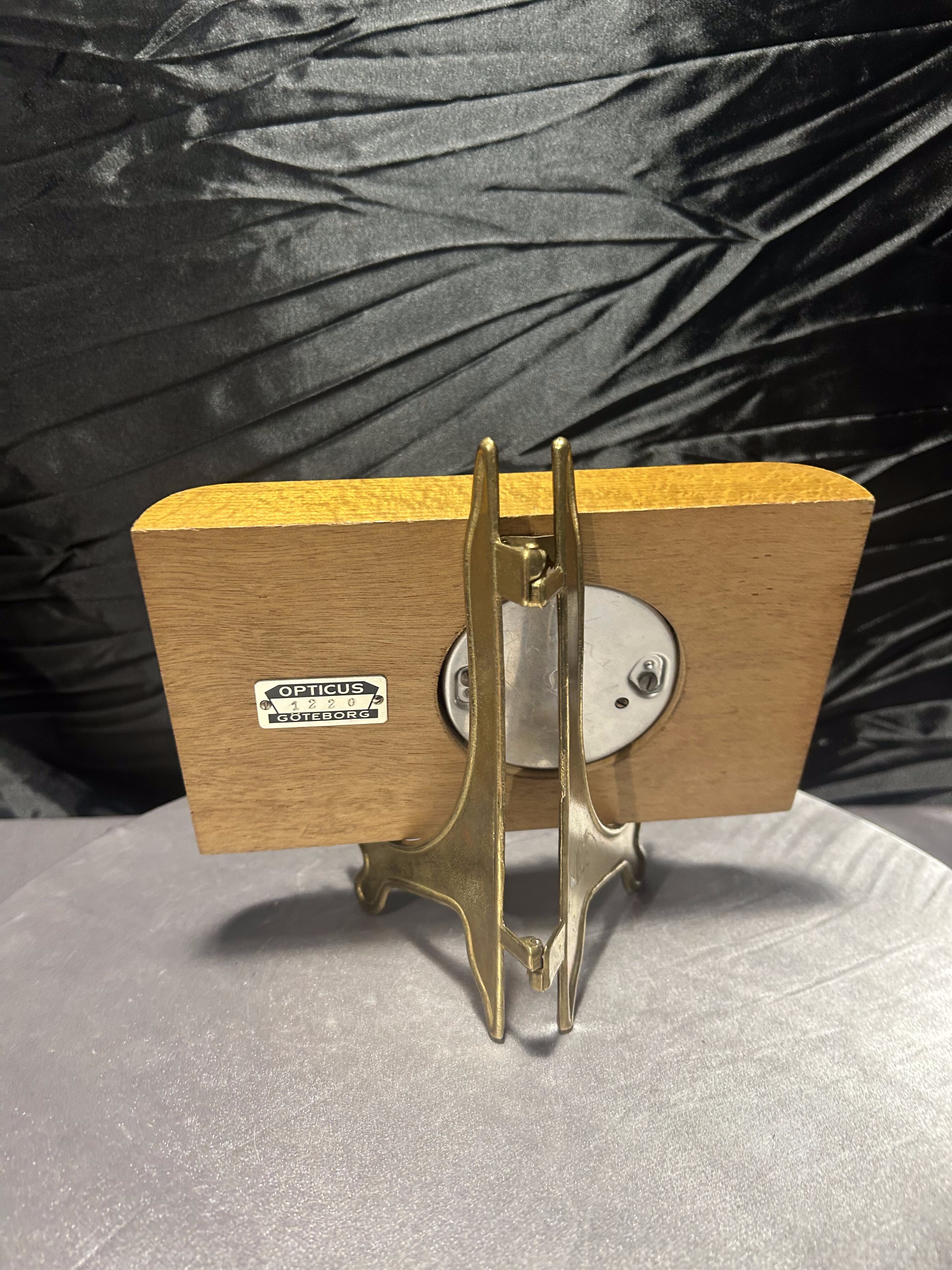 Stylowy barometr z termometrem marki OPTICUS Göteborg, będący klasycznym przykładem skandynawskiego wzornictwa połowy XX wieku. Wykonany z drewna o pięknym, ciepłym odcieniu i wyposażony w metalowe detale, łączy w sobie elegancję i funkcjonalność.