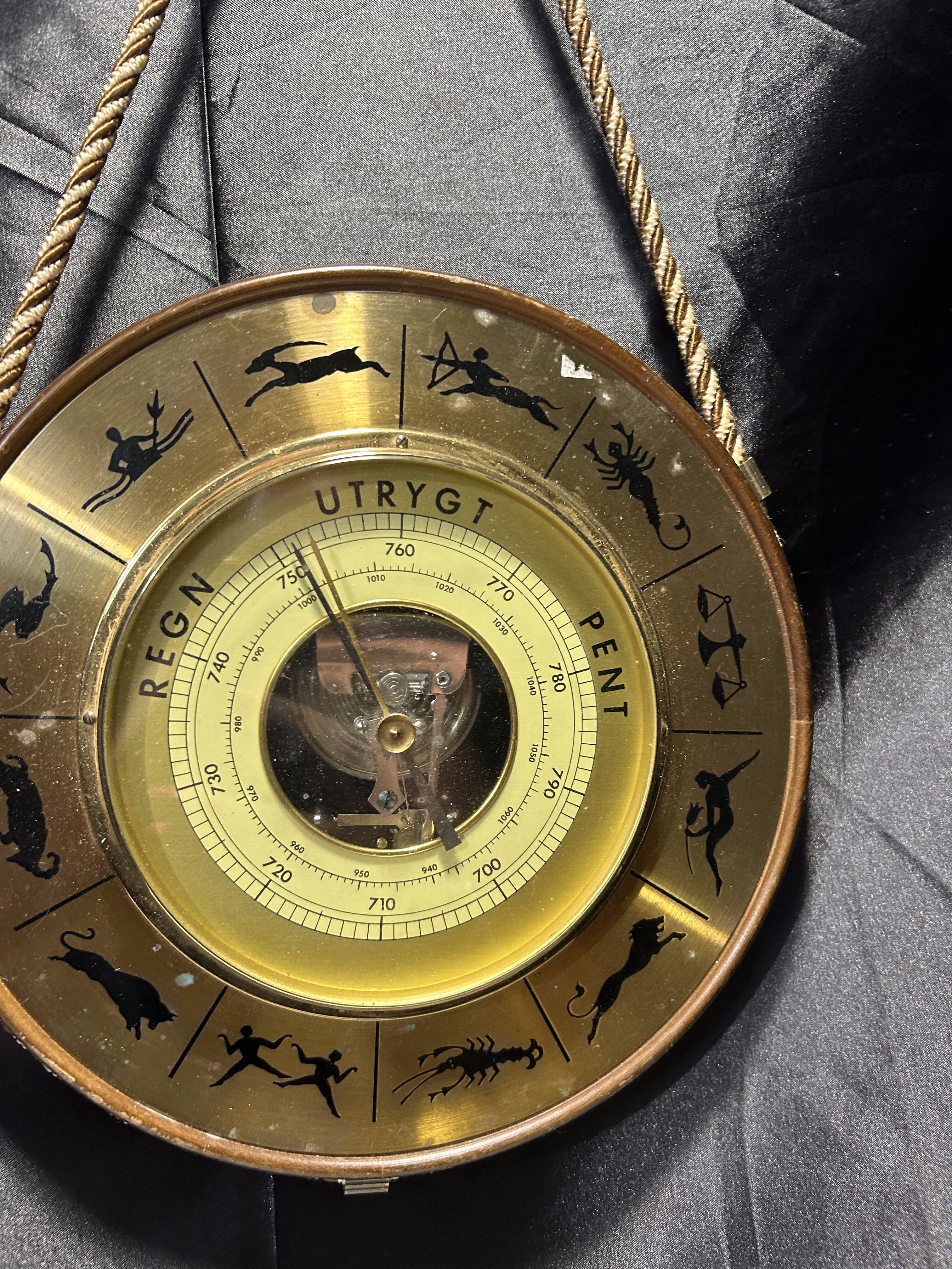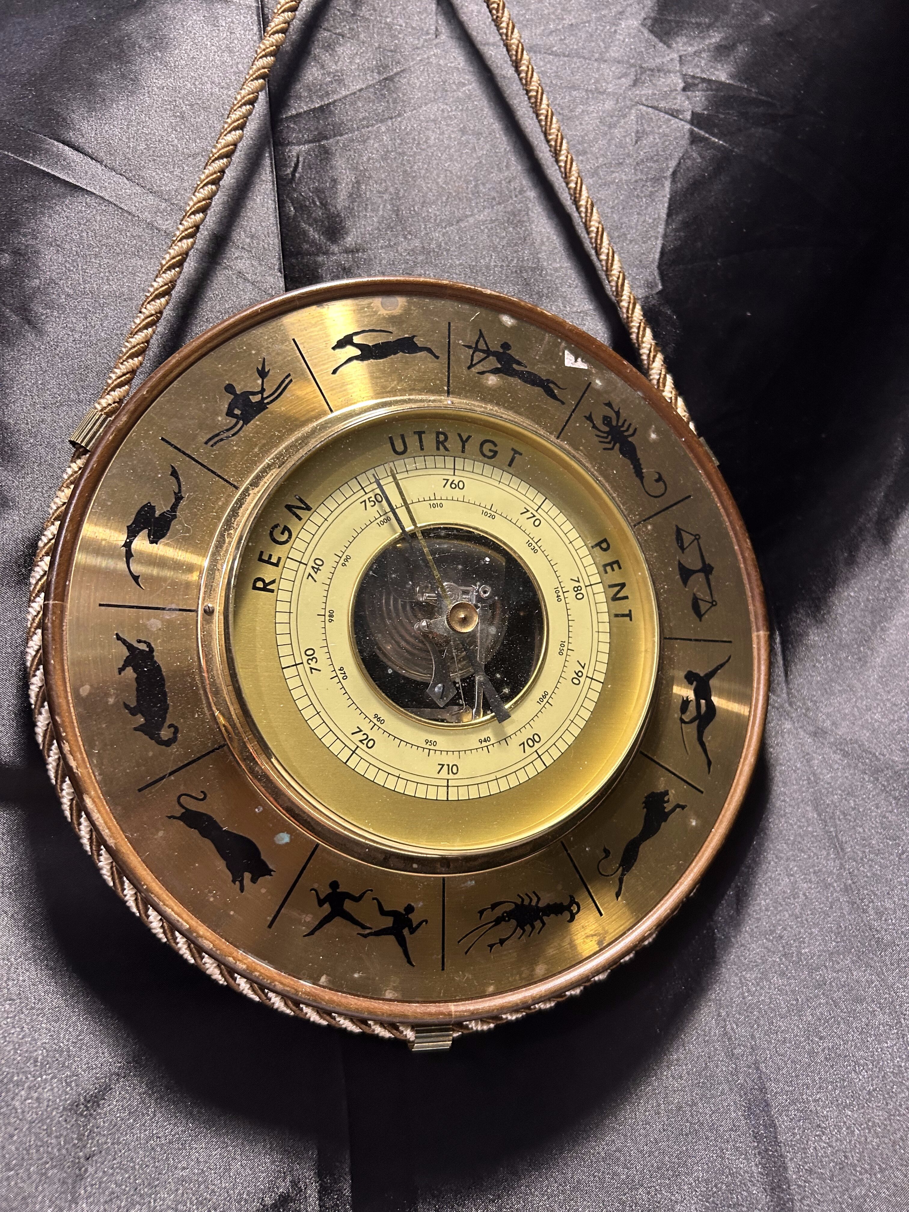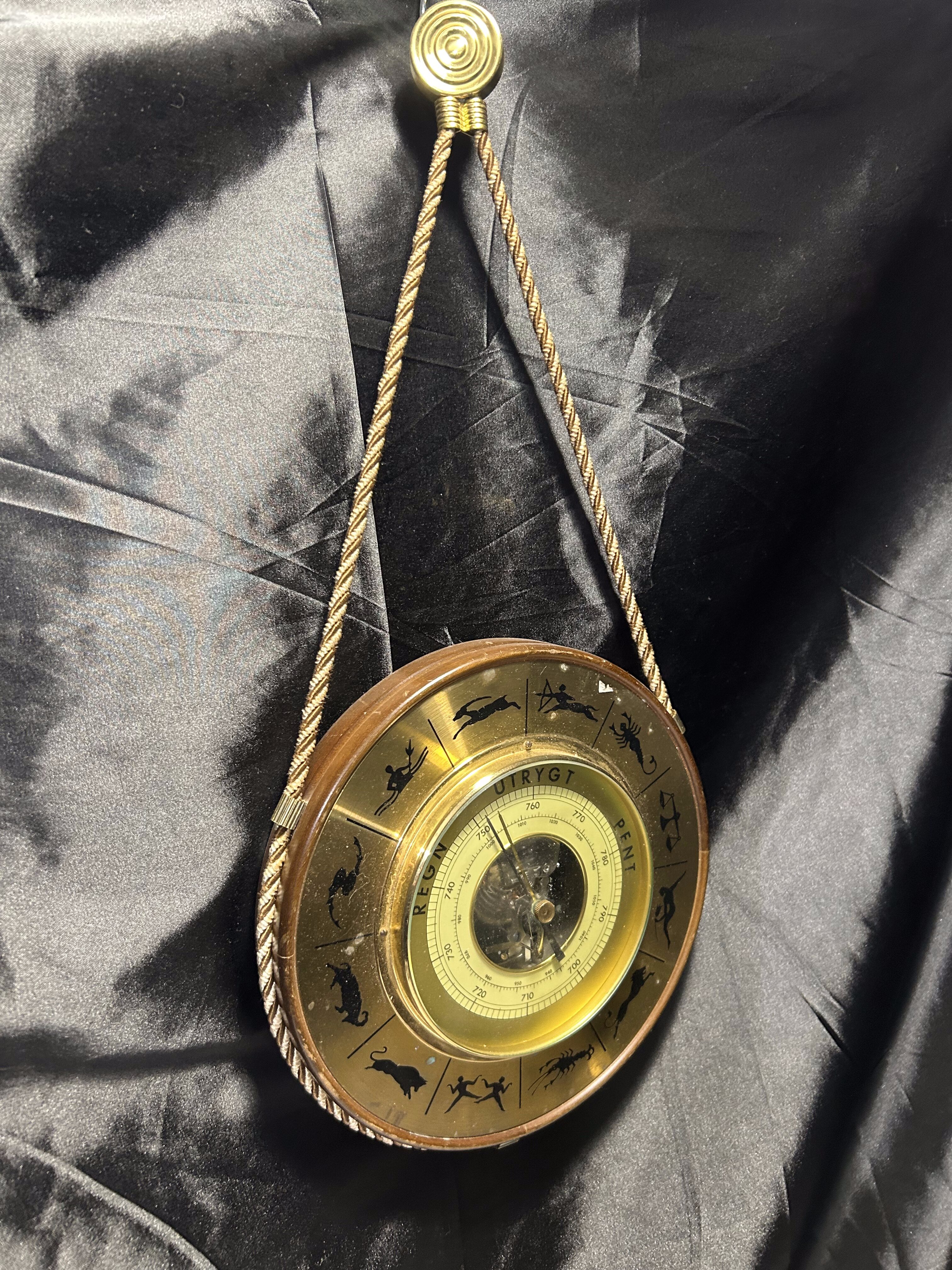 Ten unikalny barometr z motywem zodiakalnym to doskonałe połączenie funkcjonalności i symboliki. Ozdobny sznur i staranne detale czynią z niego wyjątkowy element aranżacji wnętrza – idealny dla miłośników astrologii, sztuki i niebanalnych przedmiotów z przeszłością.