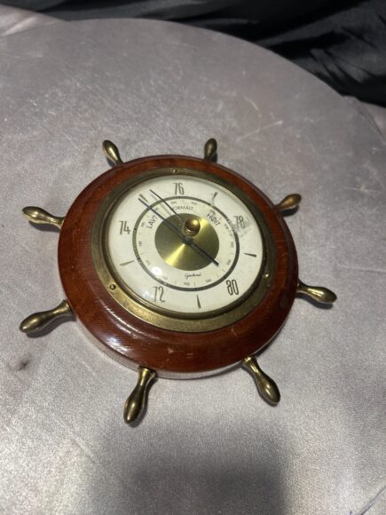 Barometr w kształcie koła sterniczego – drewno i mosiądz – dekoracja marynistyczna