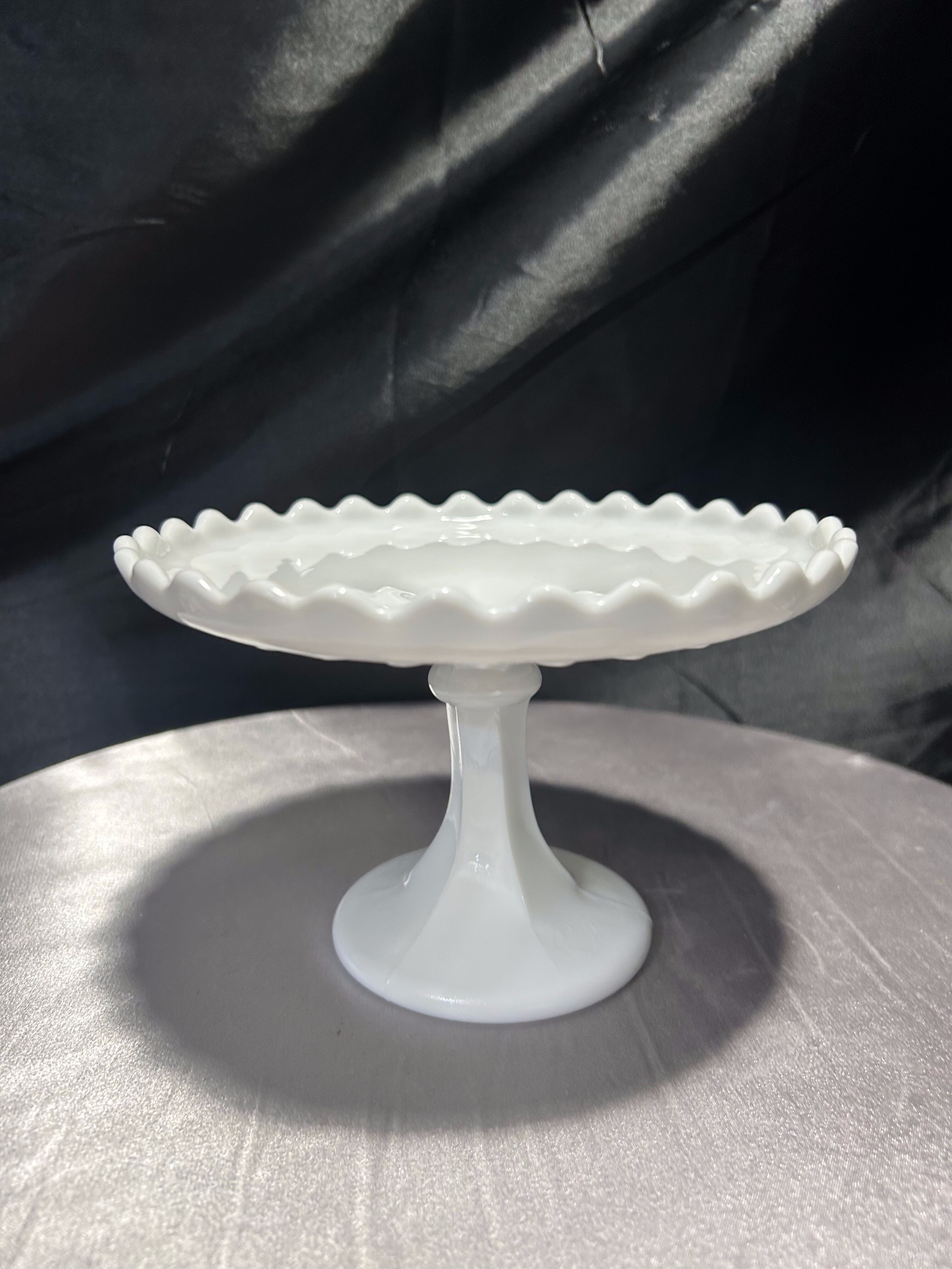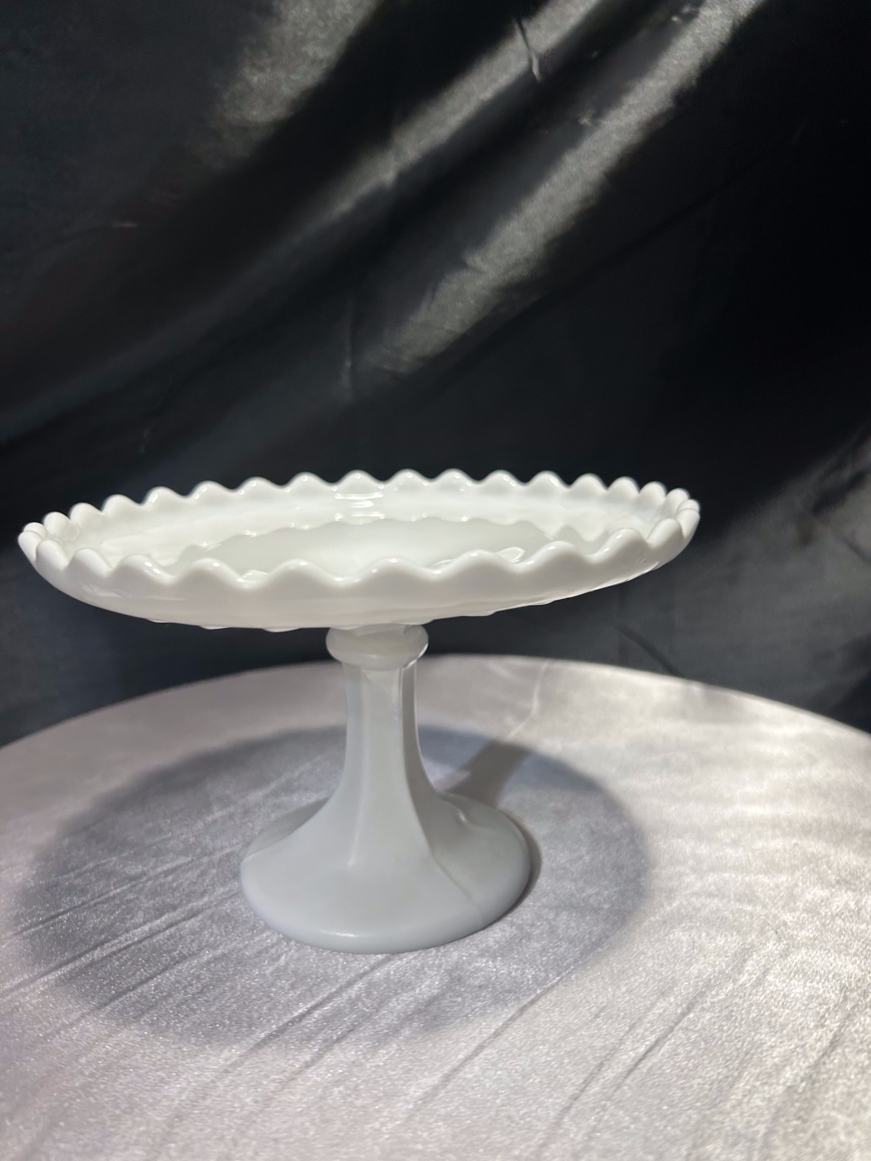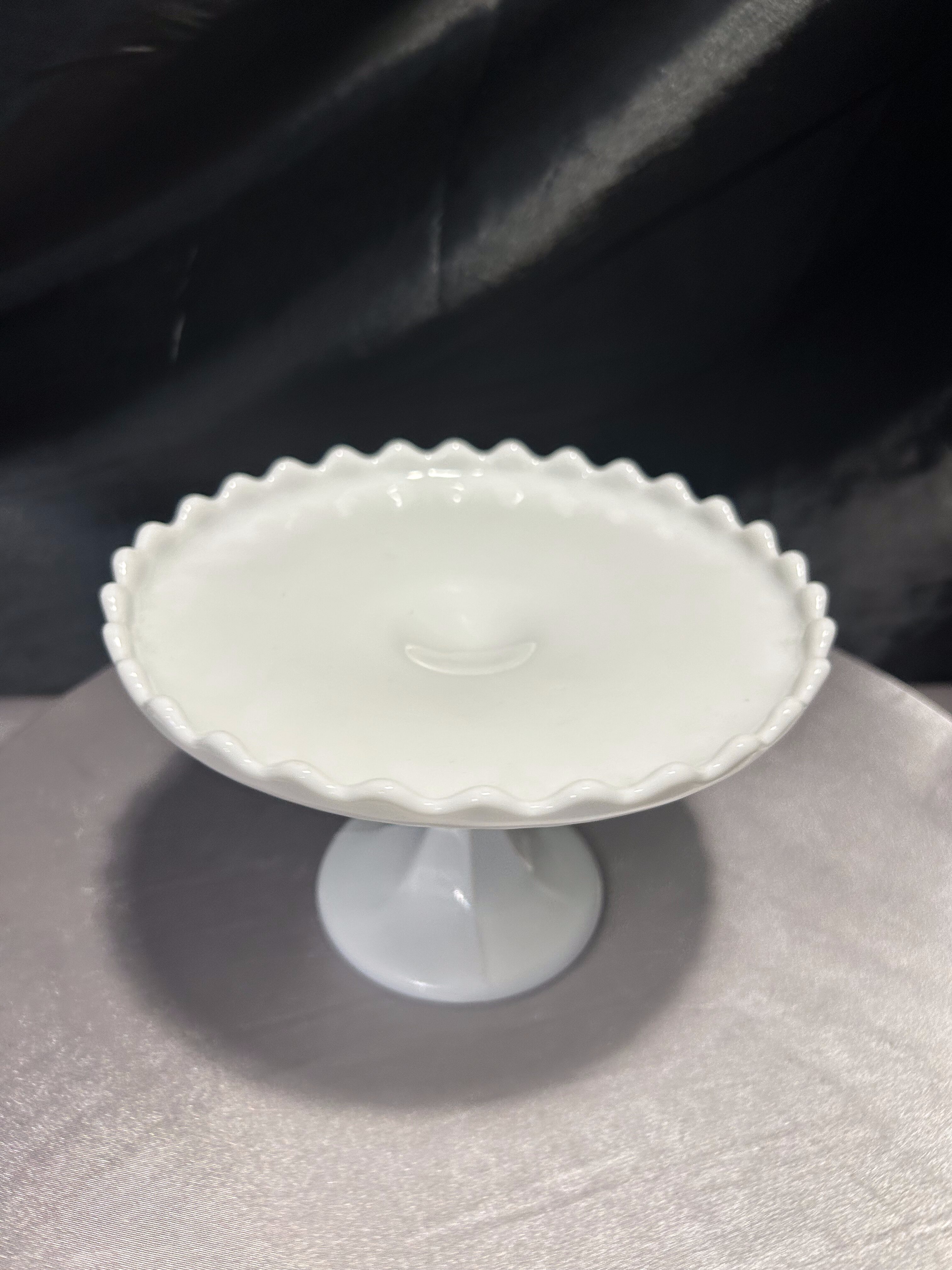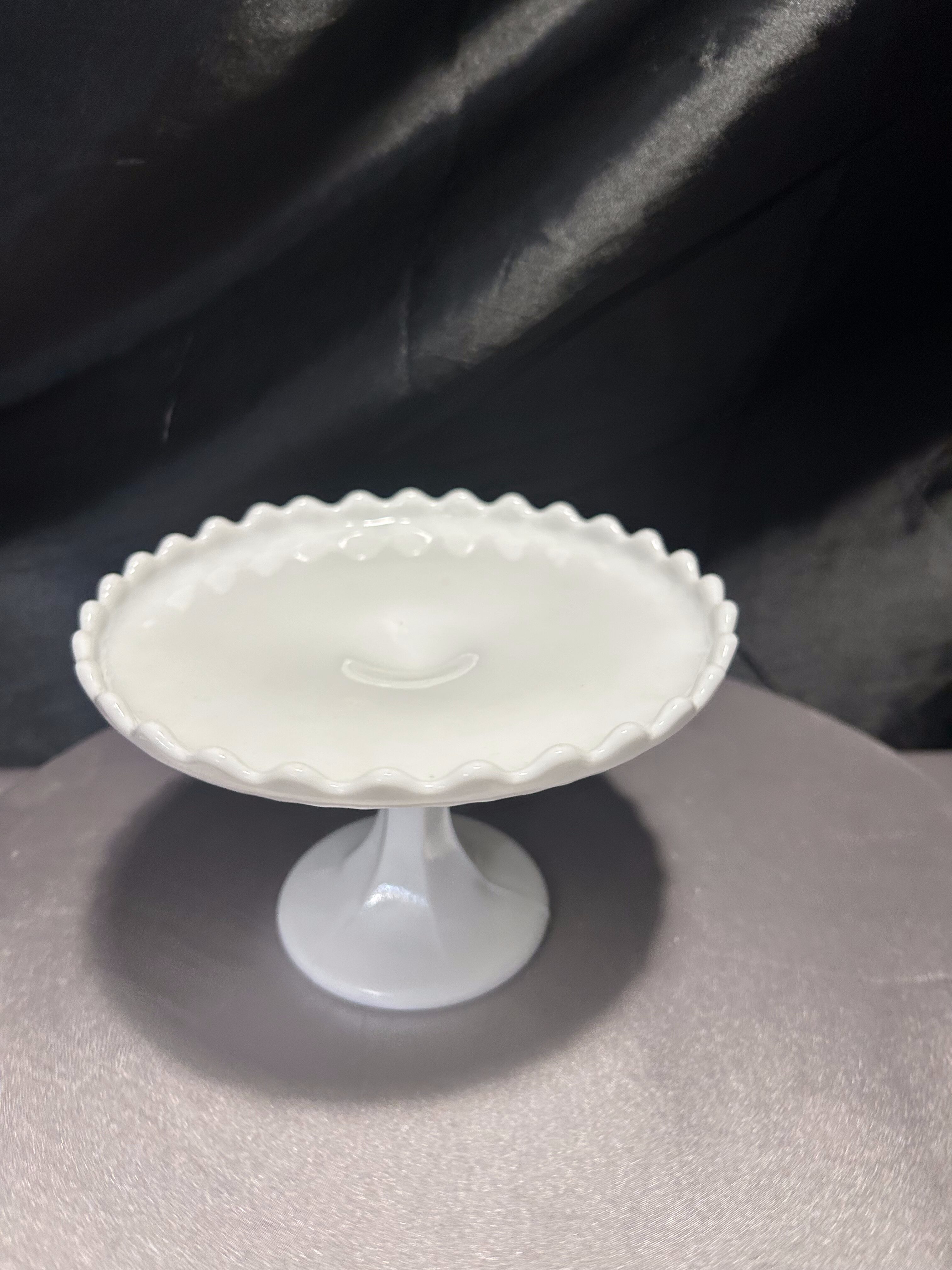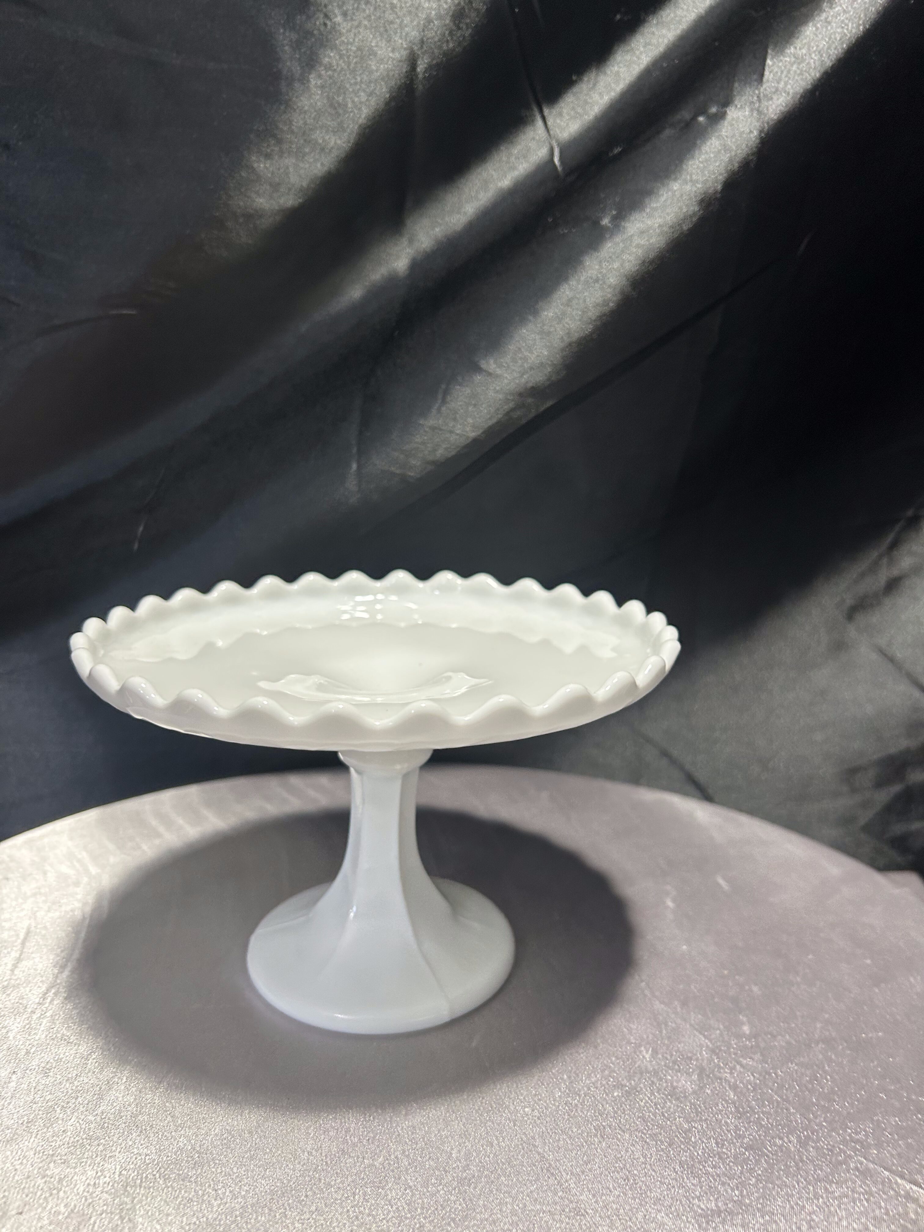 Biała patera na nóżce – z falbanką – subtelna elegancja