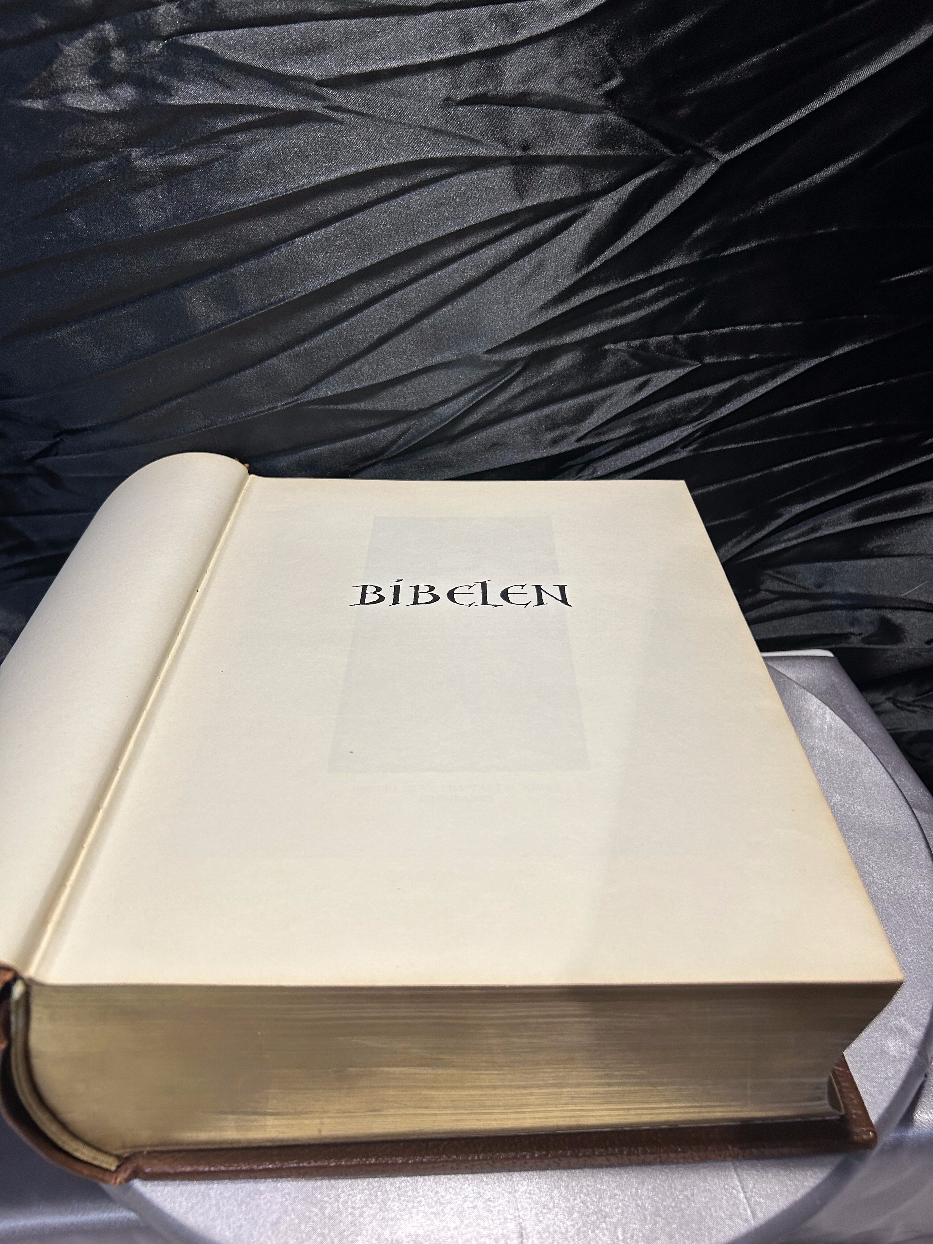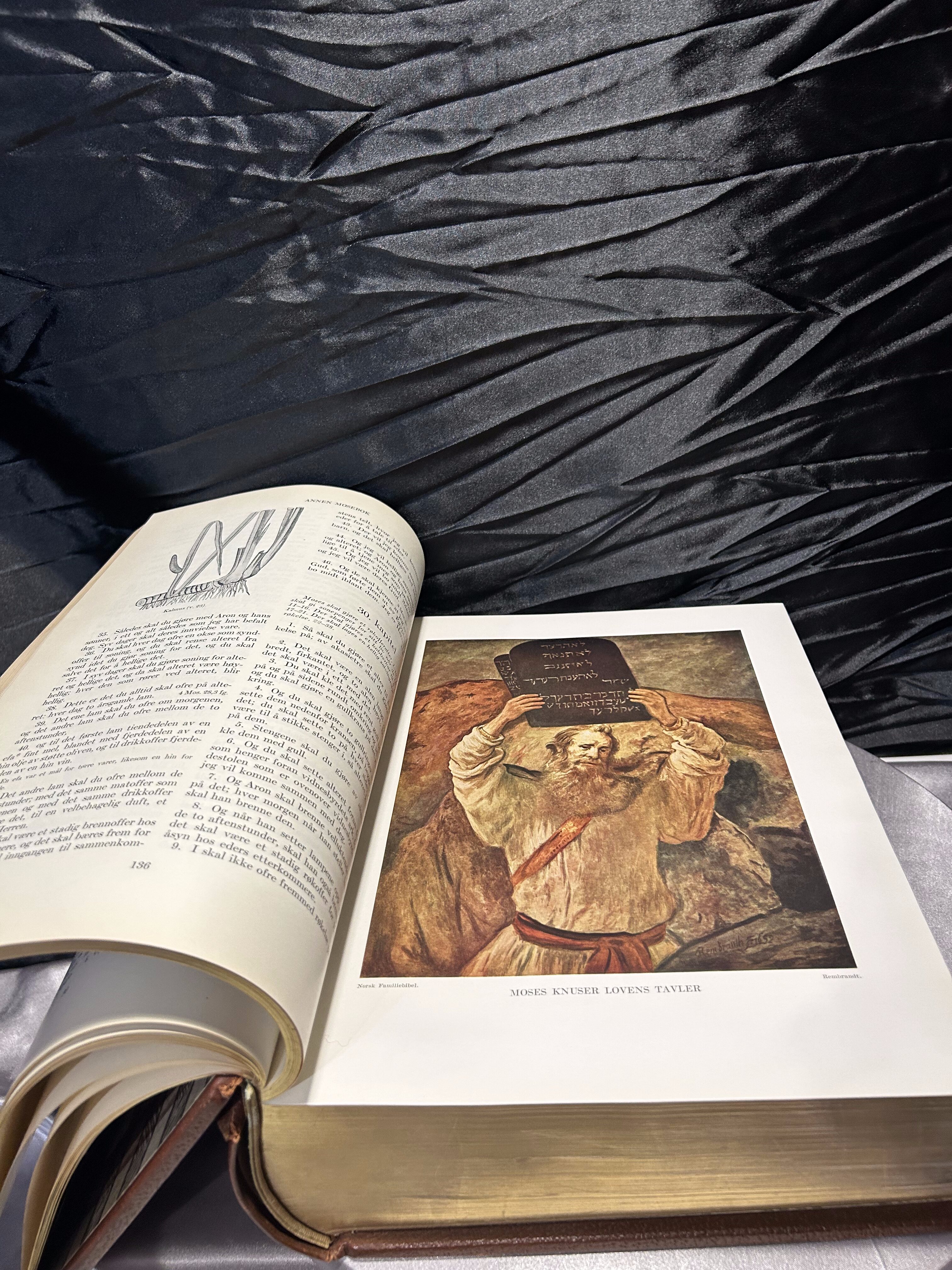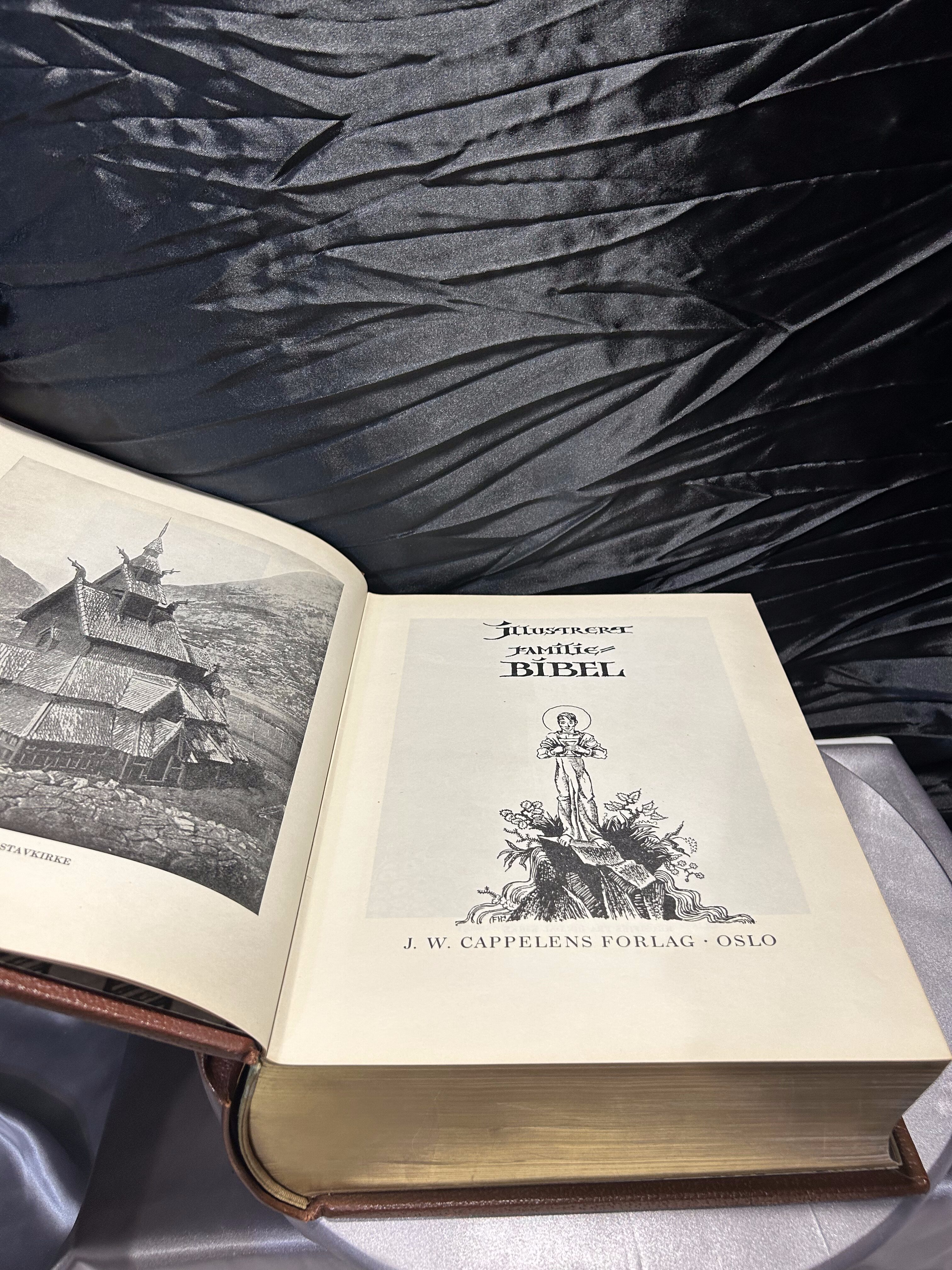 Unikalne wydanie Biblii z 1953 roku, w pięknej, tłoczonej skórzanej oprawie z delikatnym motywem na froncie. Strony wykończone złoceniem nadają książce wyjątkowego blasku i elegancji. Publikacja bogato ilustrowana – zawiera zarówno ilustracje czarno-białe, jak i barwne, które wzbogacają odbiór treści. Tekst prawdopodobnie w języku norweskim, co czyni ten egzemplarz rzadką pozycją kolekcjonerską dla miłośników wydań zagranicznych i antykwarycznych.