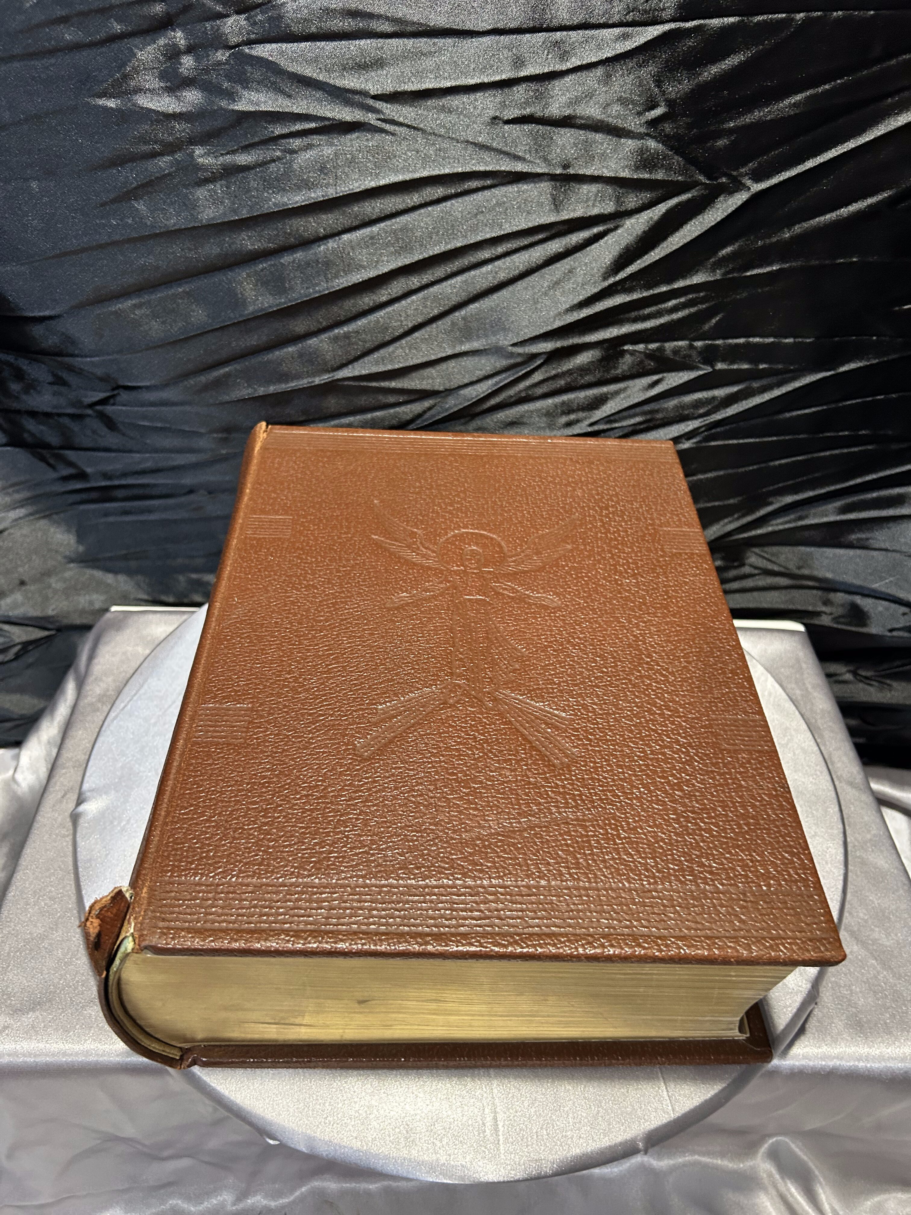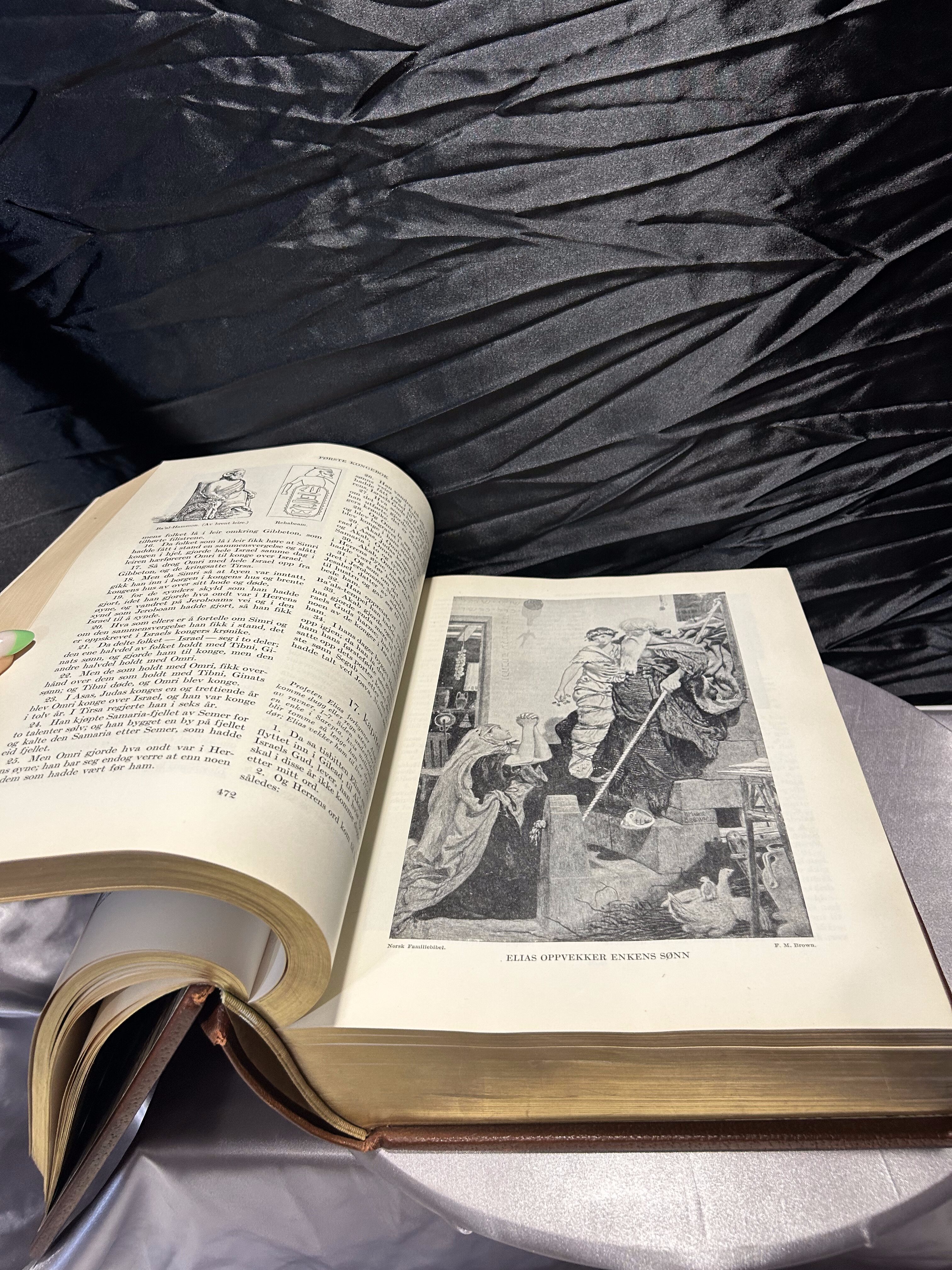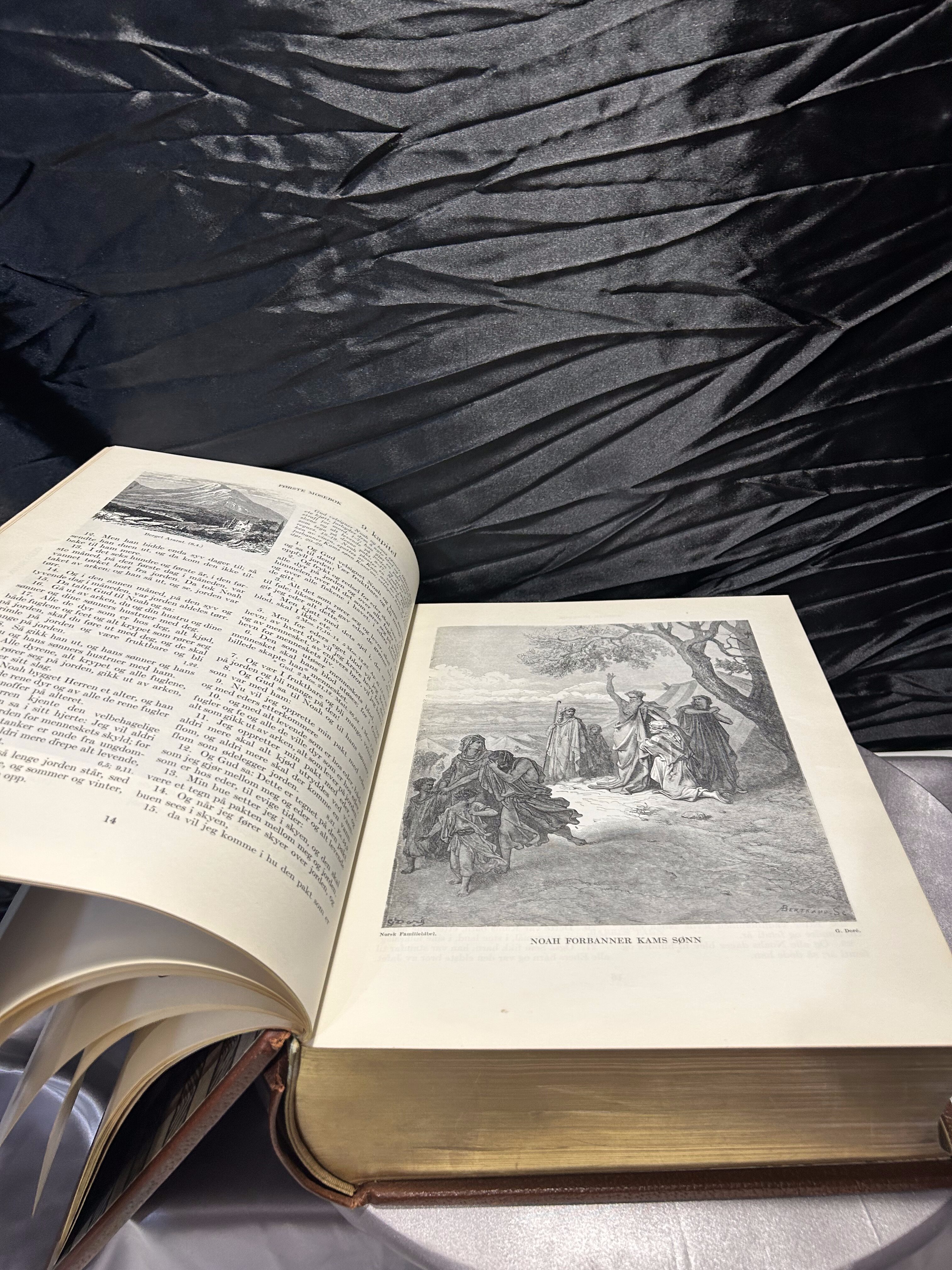 Unikalne wydanie Biblii z 1953 roku, w pięknej, tłoczonej skórzanej oprawie z delikatnym motywem na froncie. Strony wykończone złoceniem nadają książce wyjątkowego blasku i elegancji. Publikacja bogato ilustrowana – zawiera zarówno ilustracje czarno-białe, jak i barwne, które wzbogacają odbiór treści. Tekst prawdopodobnie w języku norweskim, co czyni ten egzemplarz rzadką pozycją kolekcjonerską dla miłośników wydań zagranicznych i antykwarycznych.