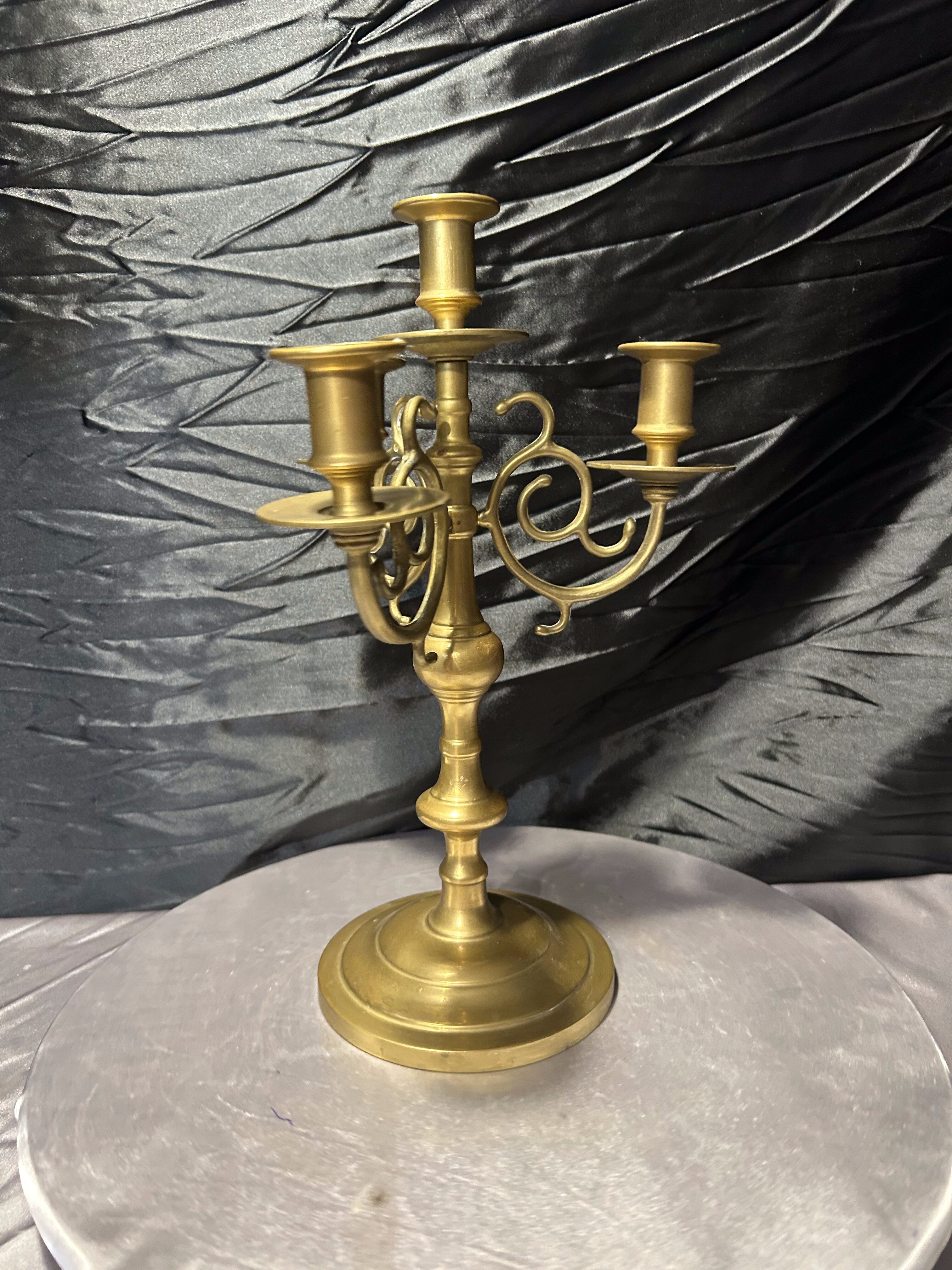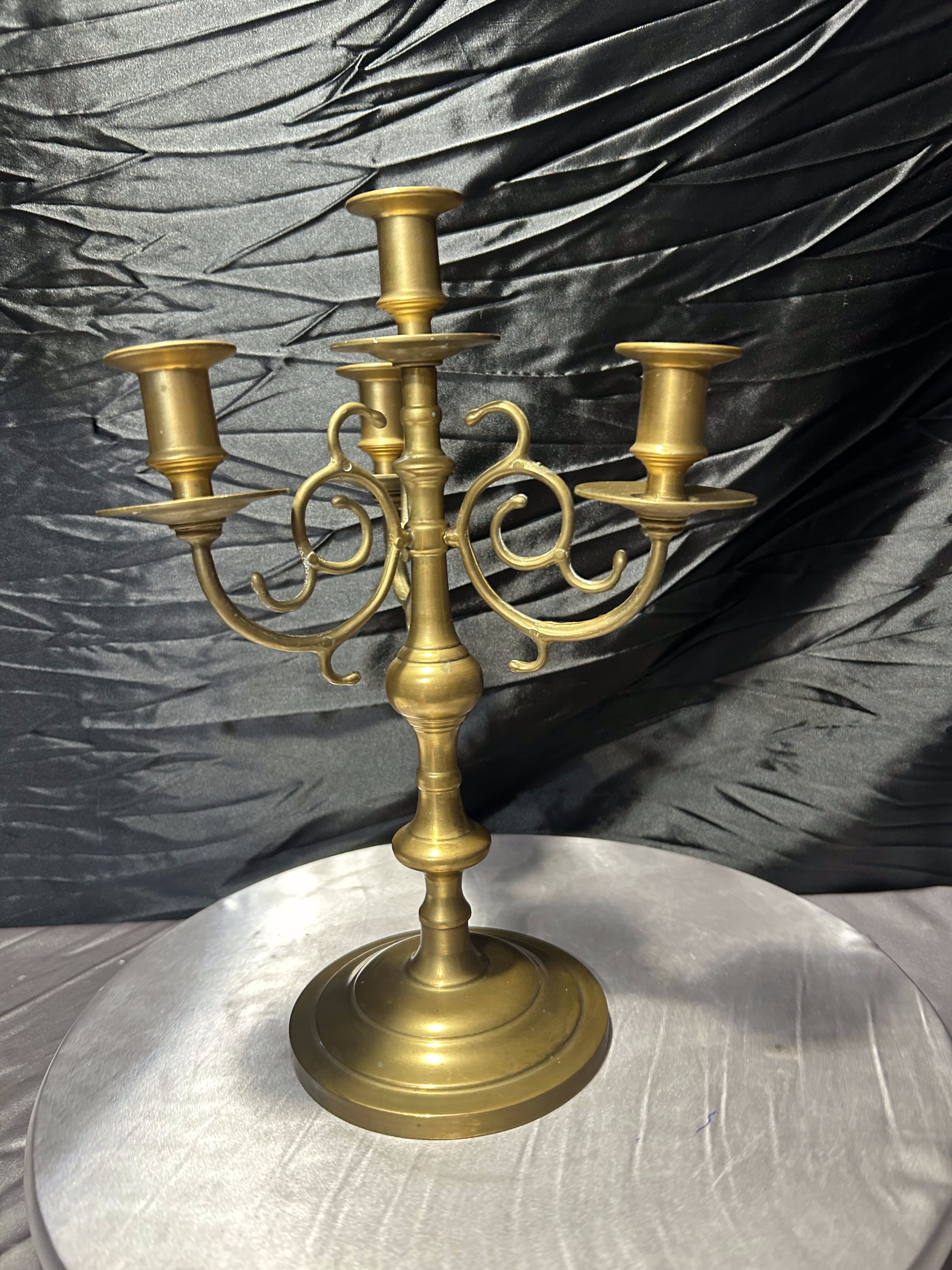 Efektowny świecznik wykonany z litego mosiądzu, o bogato zdobionej, klasycznej formie. Model trzyramienny, przeznaczony na cztery świece – centralna oraz trzy boczne ramiona. Solidna, ciężka konstrukcja oraz staranne detale czynią go wyrazistą dekoracją do eleganckich, klasycznych i historyzujących wnętrz.
