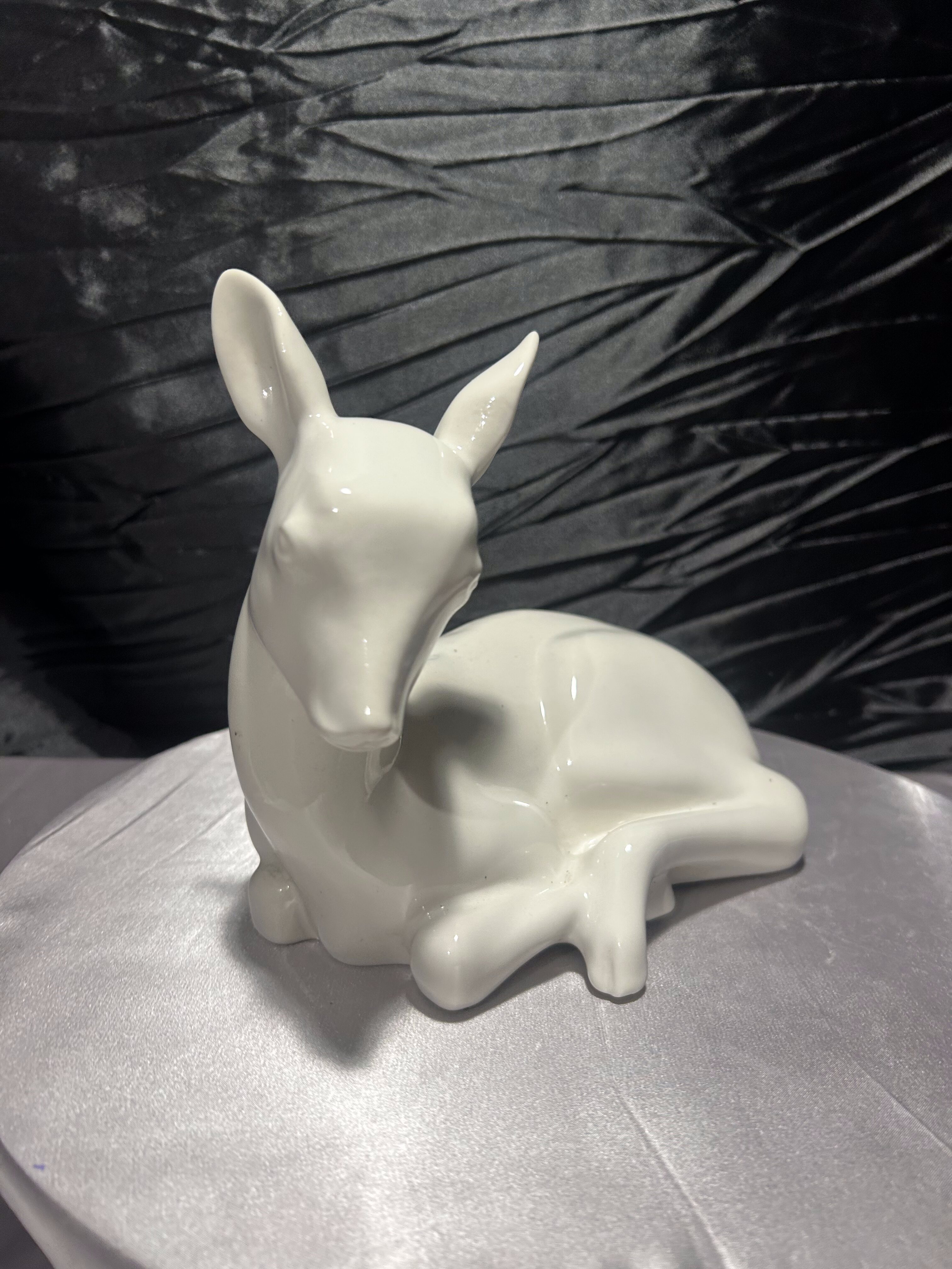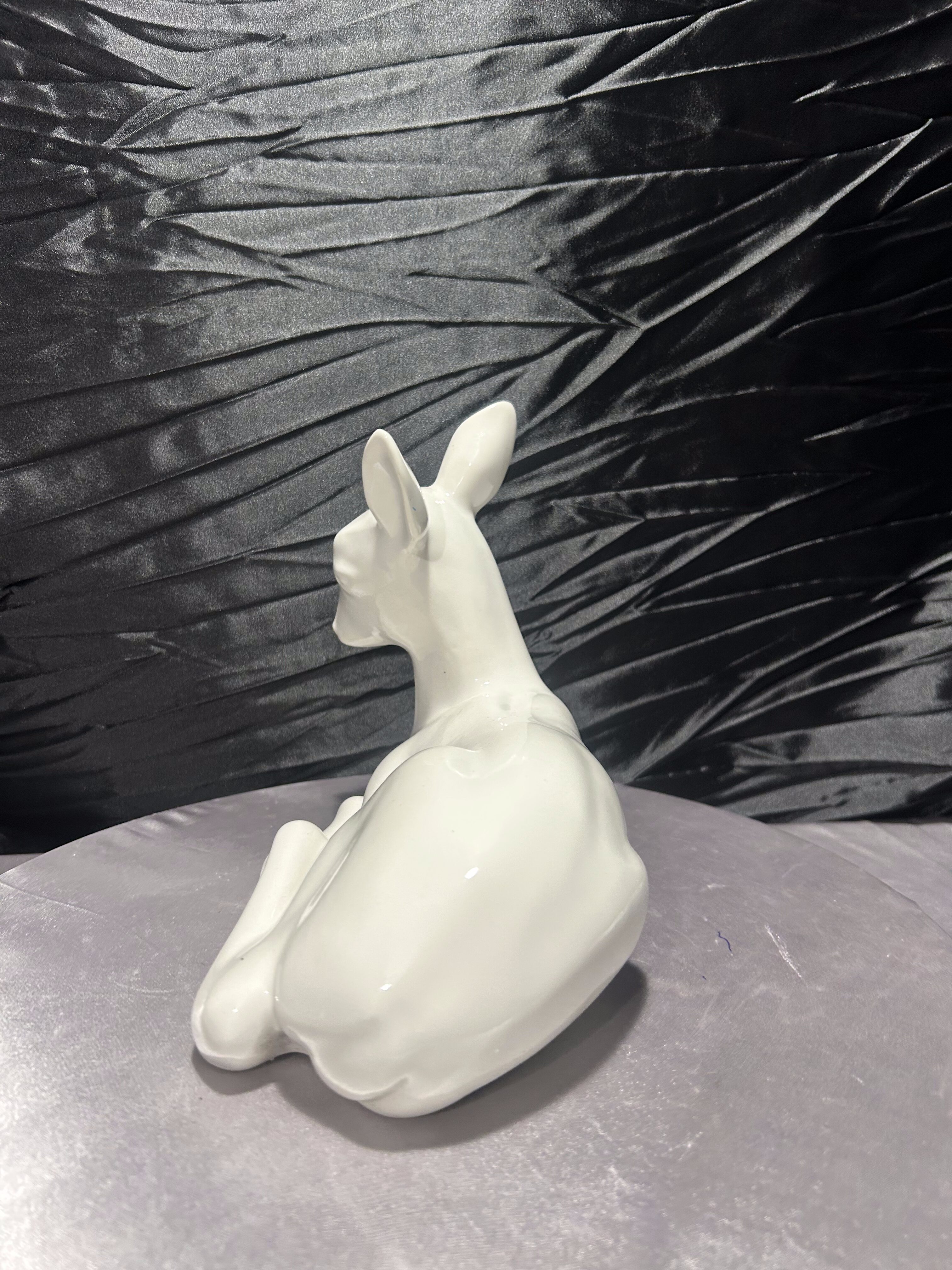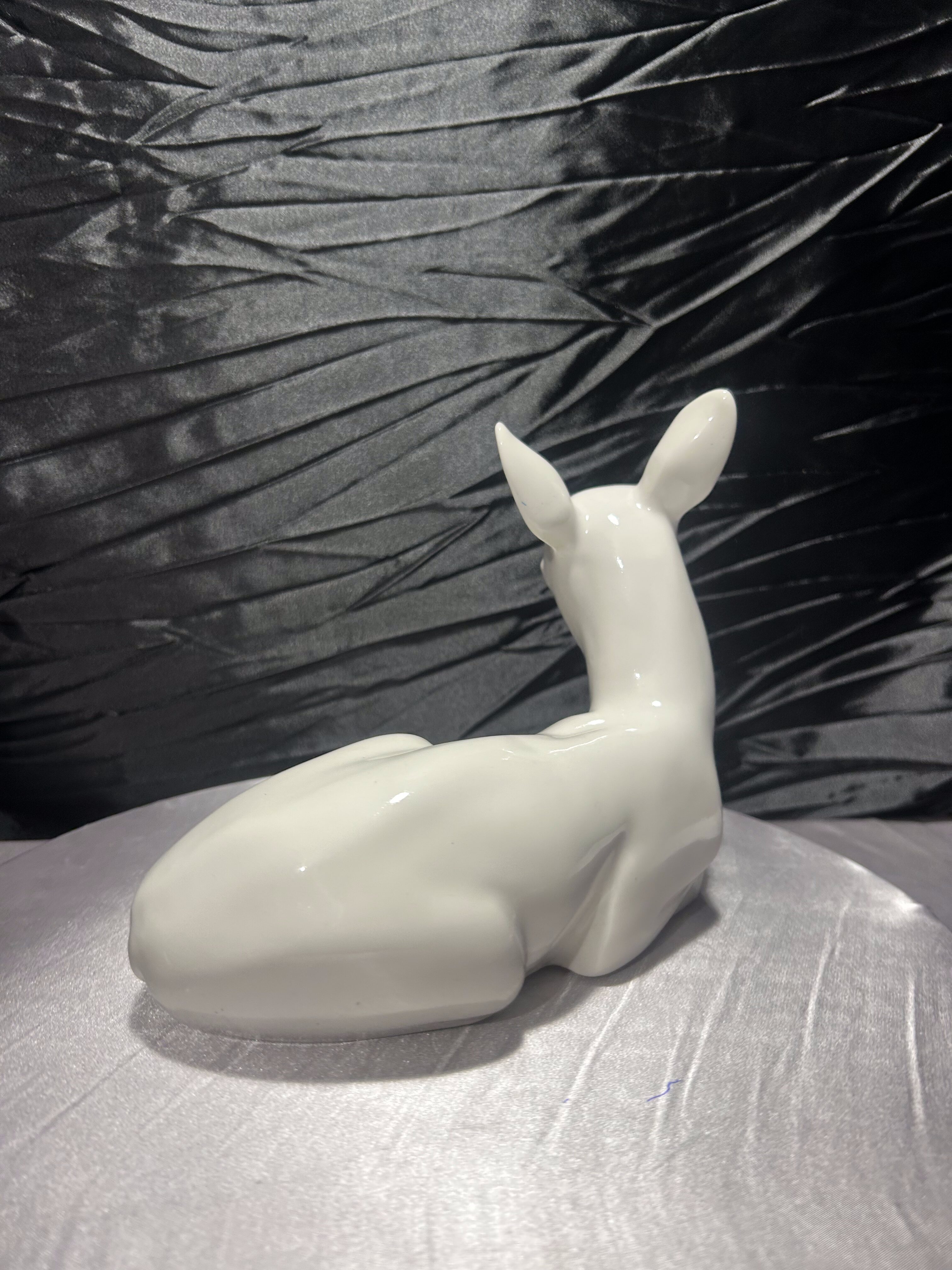 Subtelna i pełna wdzięku ceramiczna figurka sarenki, sygnowana znakiem NTP. Utrzymana w klasycznym, minimalistycznym stylu, emanuje spokojem i delikatnością formy. Biała szkliwiona powierzchnia pięknie odbija światło, podkreślając miękkie linie sylwetki i płynność ruchu.