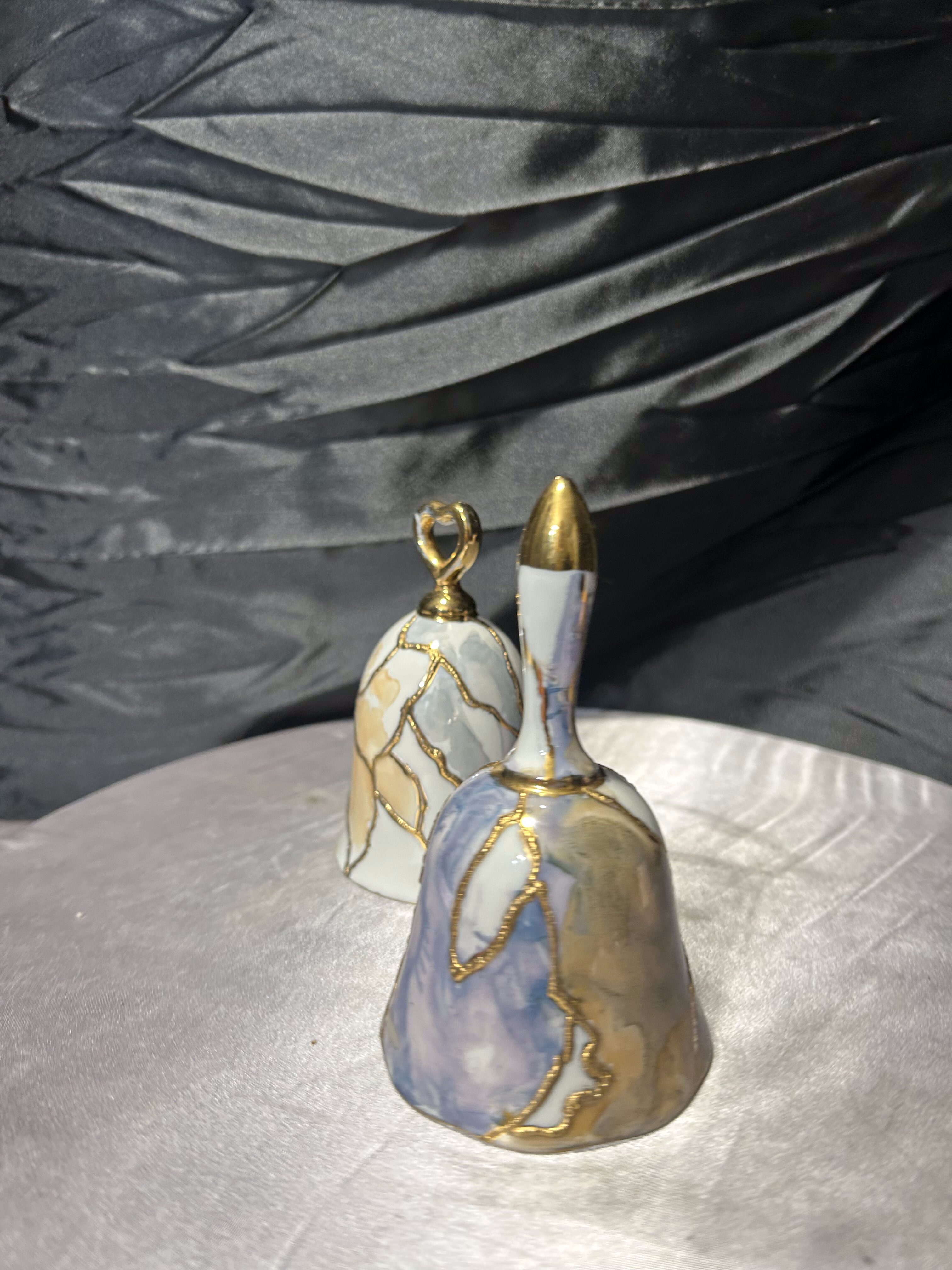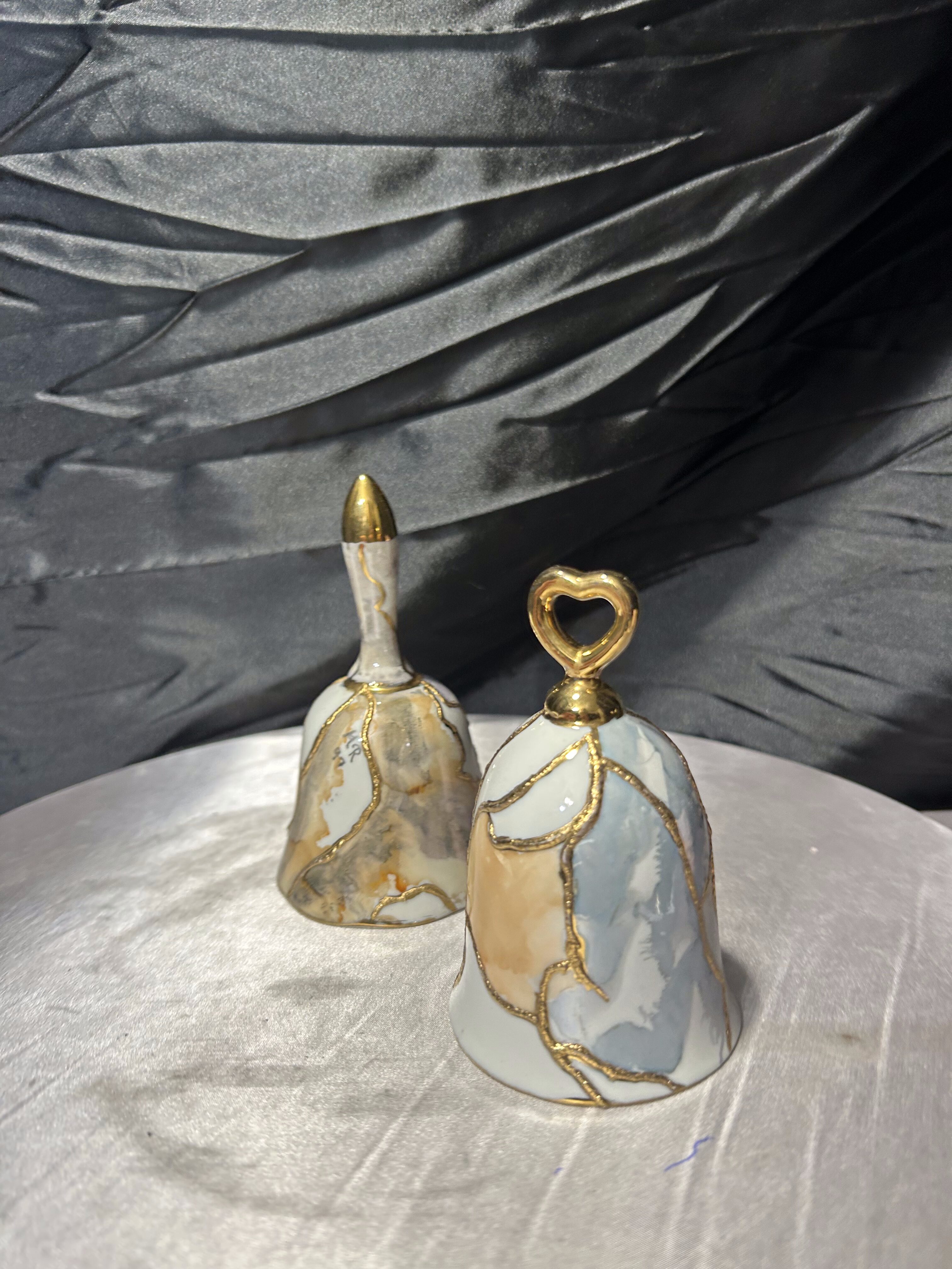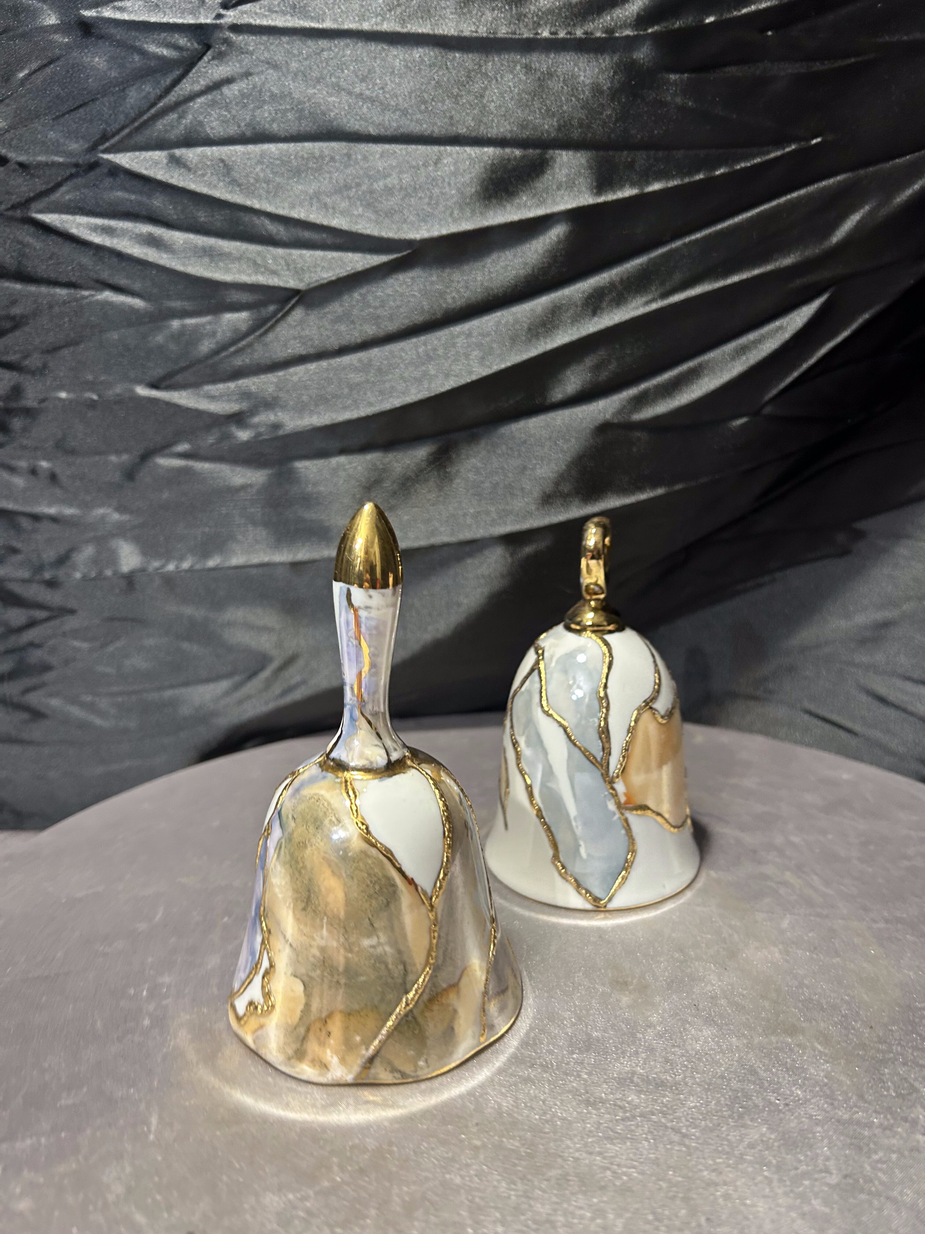 Zestaw dwóch dekoracyjnych dzwonków wykonanych z ceramiki, ozdobionych artystycznym, ręcznie malowanym wzorem z elementami złocenia. Każdy z dzwonków posiada unikalną kolorystykę – subtelne przejścia barw w odcieniach beżu, błękitu i szarości tworzą efekt przypominający malarskie akwarele, które zostały dodatkowo podkreślone złotymi liniami.