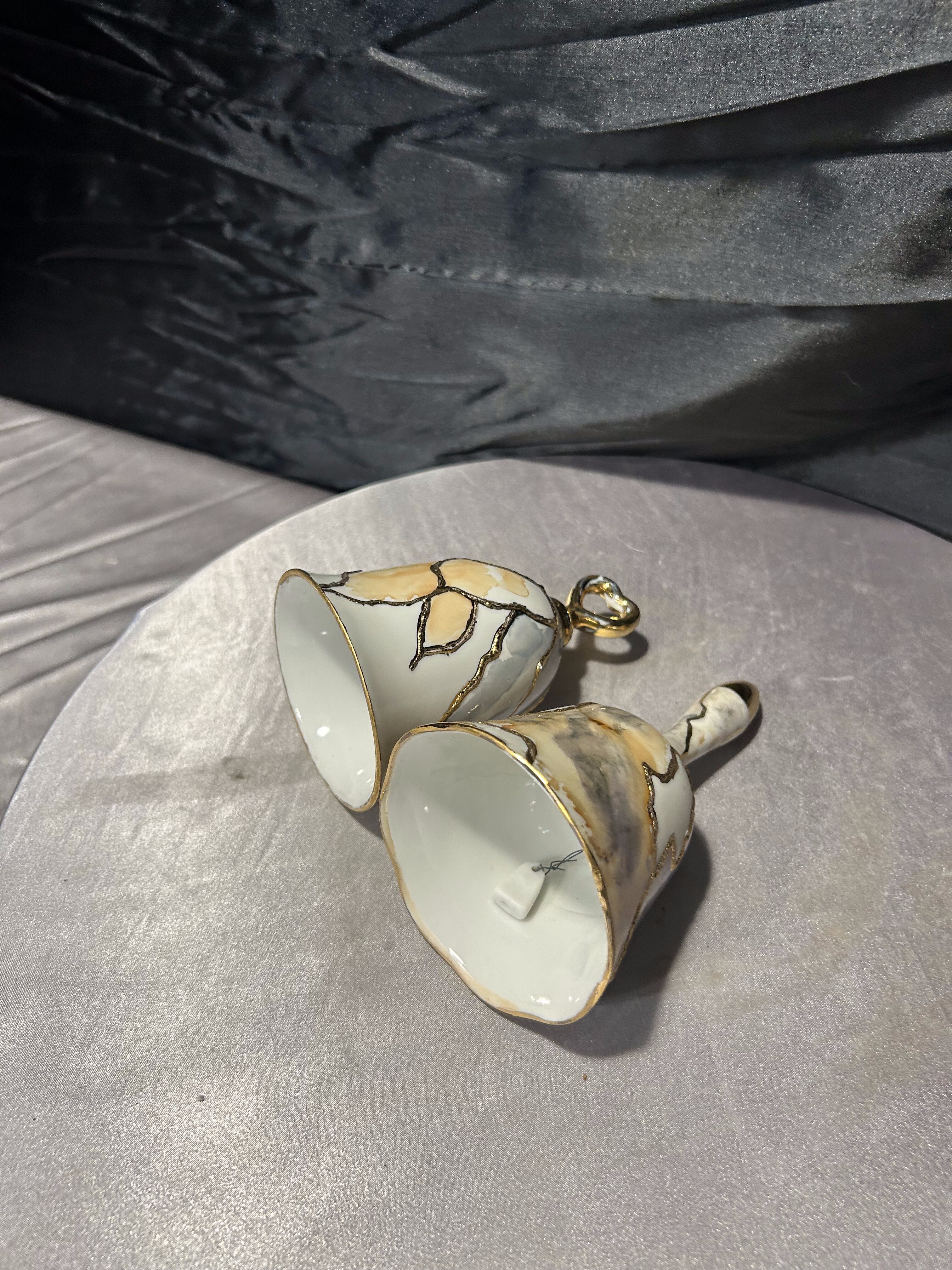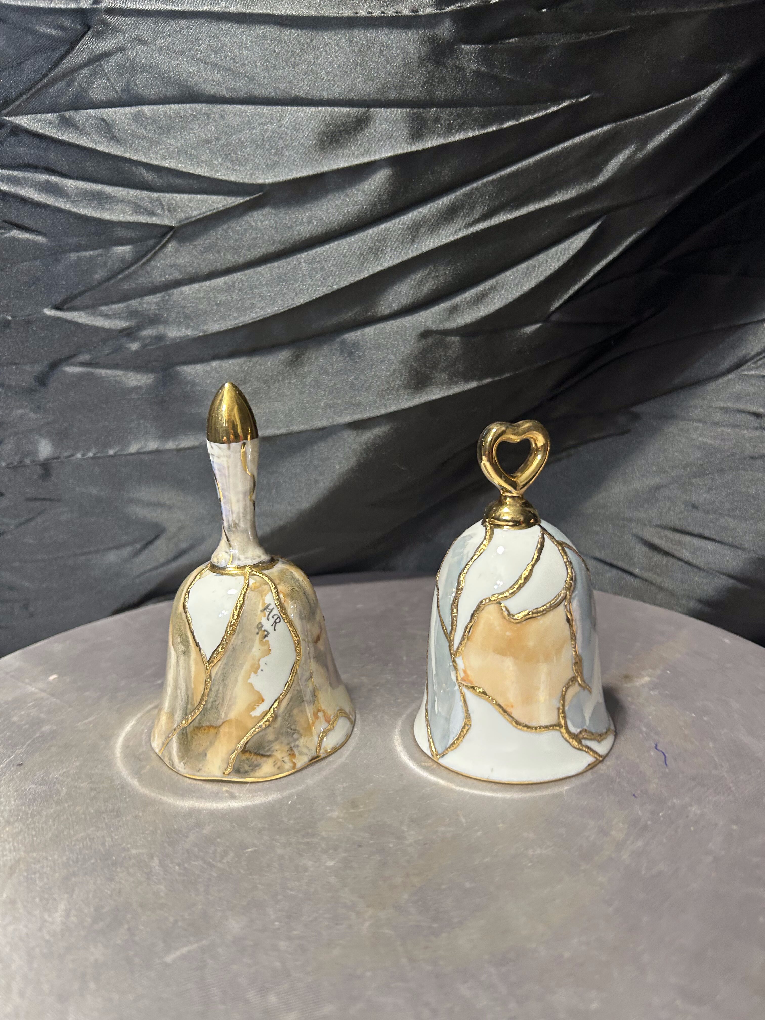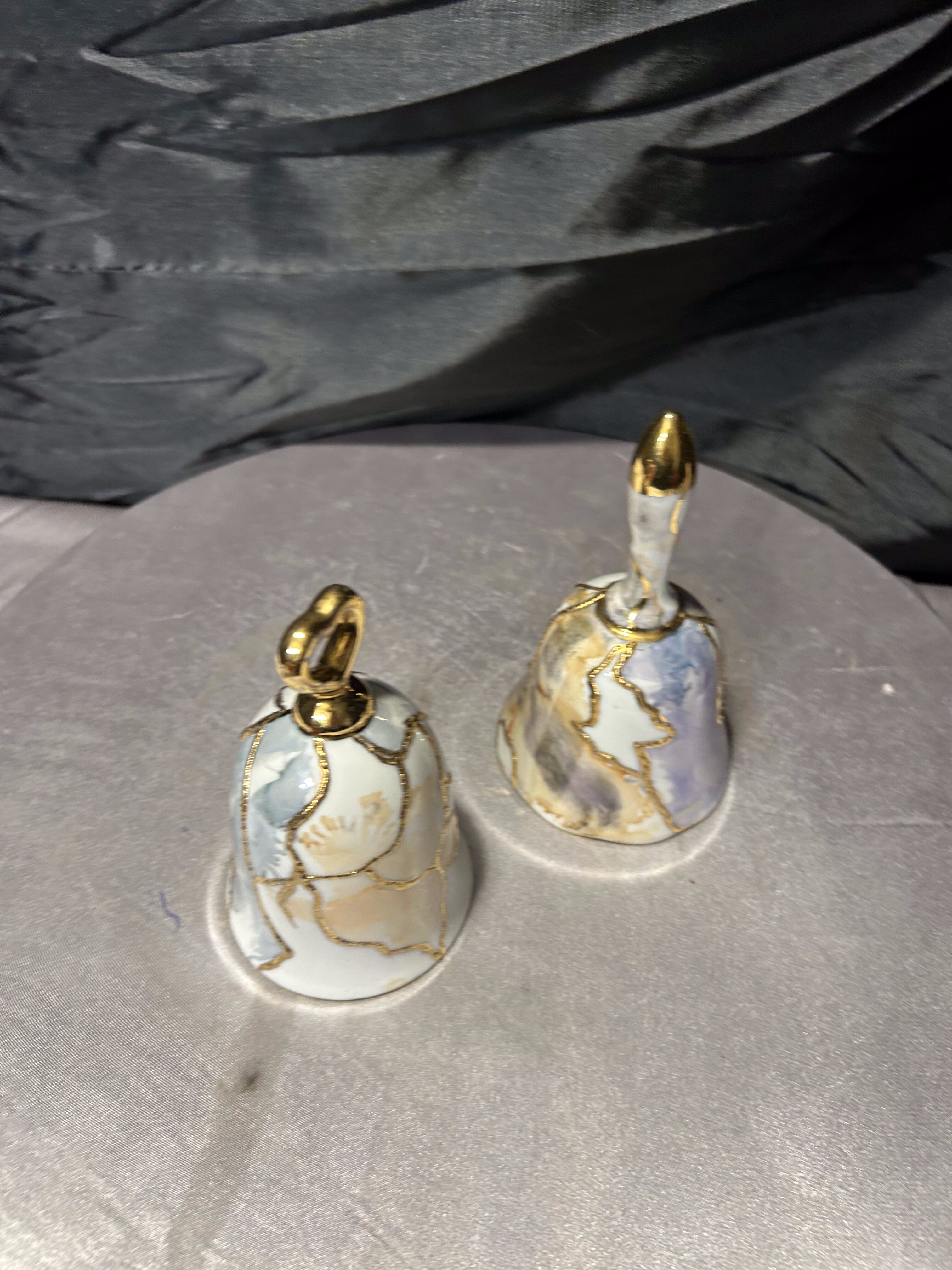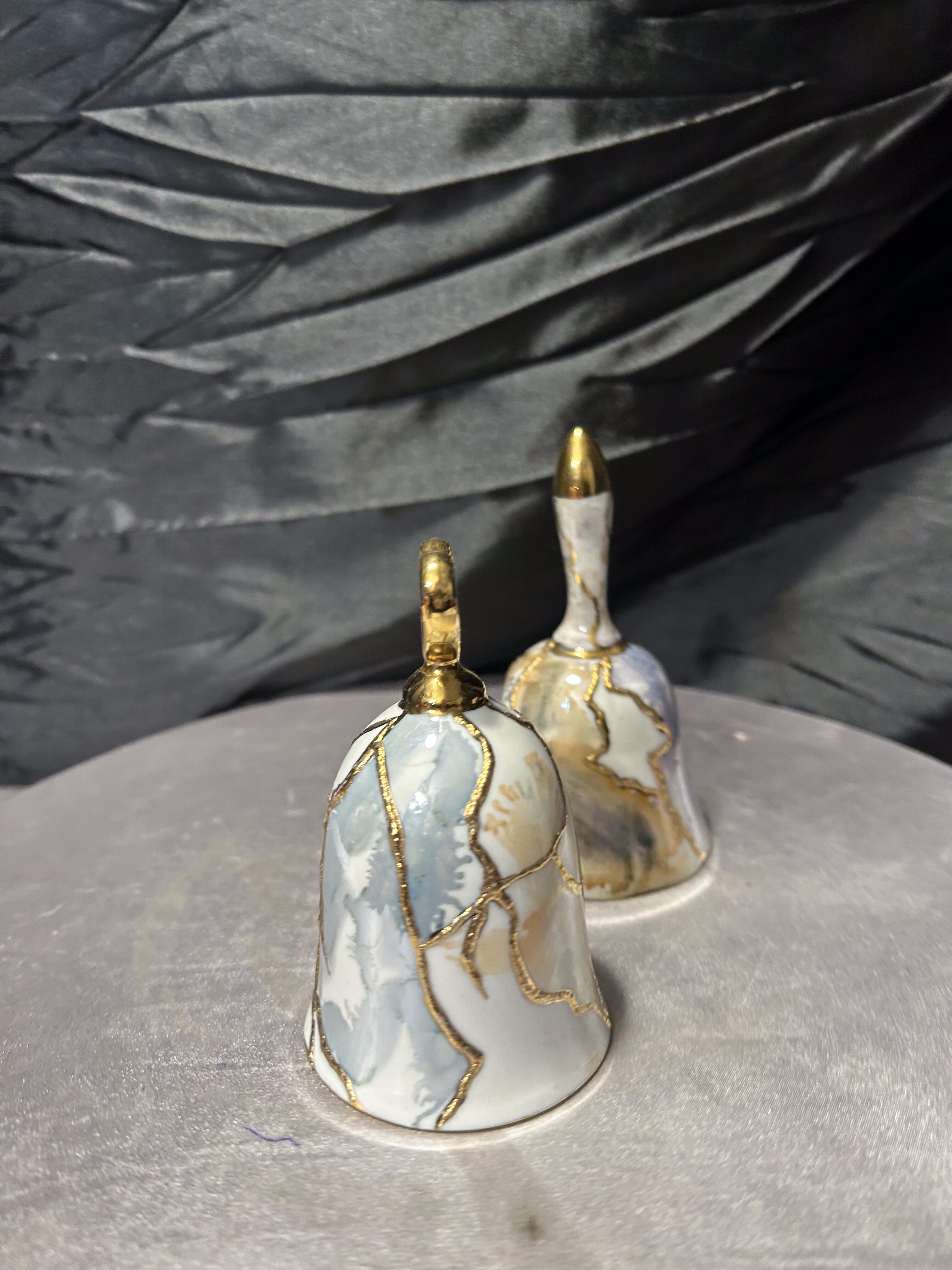 Zestaw dwóch dekoracyjnych dzwonków wykonanych z ceramiki, ozdobionych artystycznym, ręcznie malowanym wzorem z elementami złocenia. Każdy z dzwonków posiada unikalną kolorystykę – subtelne przejścia barw w odcieniach beżu, błękitu i szarości tworzą efekt przypominający malarskie akwarele, które zostały dodatkowo podkreślone złotymi liniami.