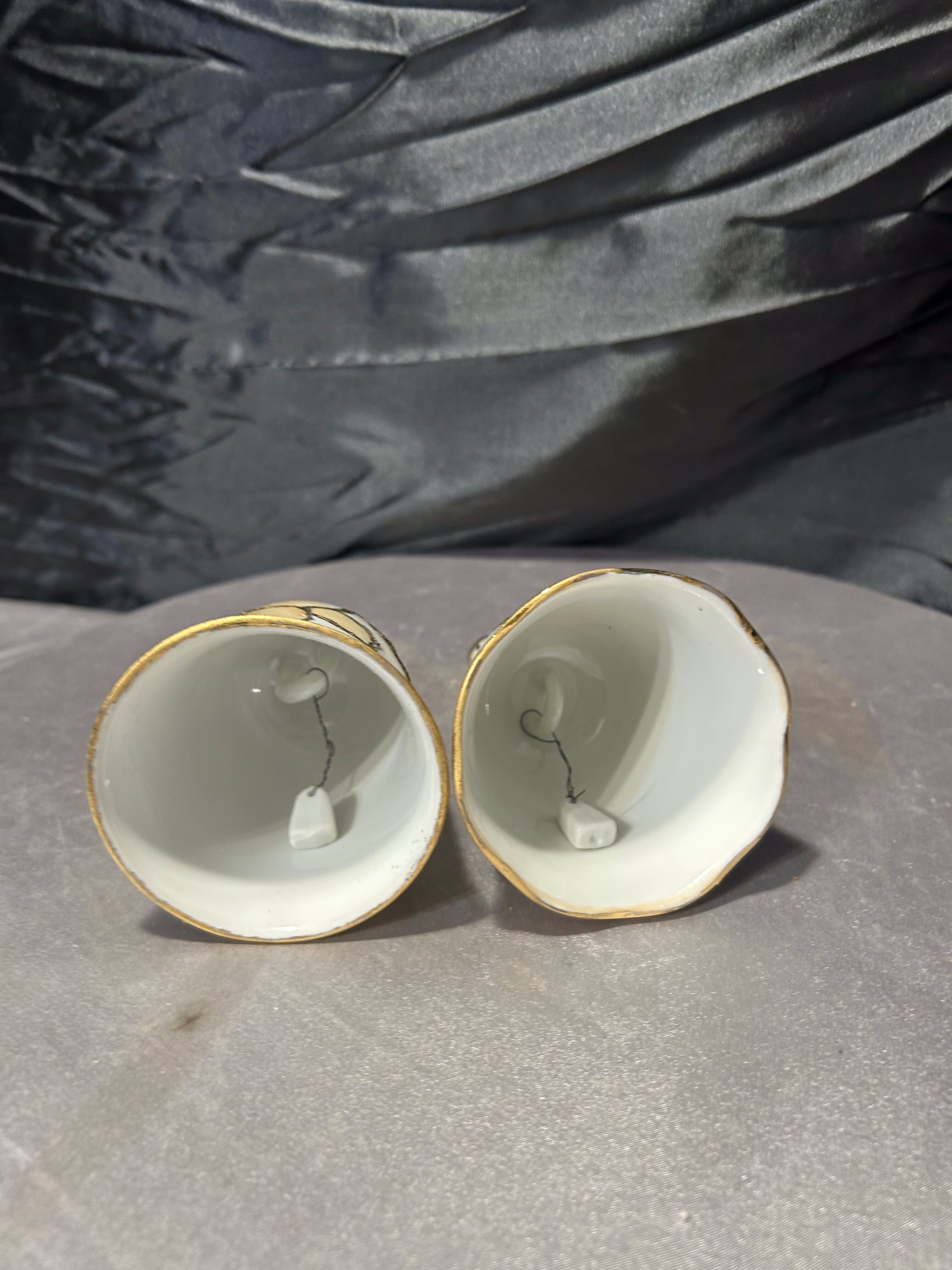 Elegancki komplet ceramicznych dzwonków dekoracyjnych, który dzięki subtelnym kolorom i złoconym detalom stanowi piękną ozdobę półki, witryny lub kolekcji porcelany.