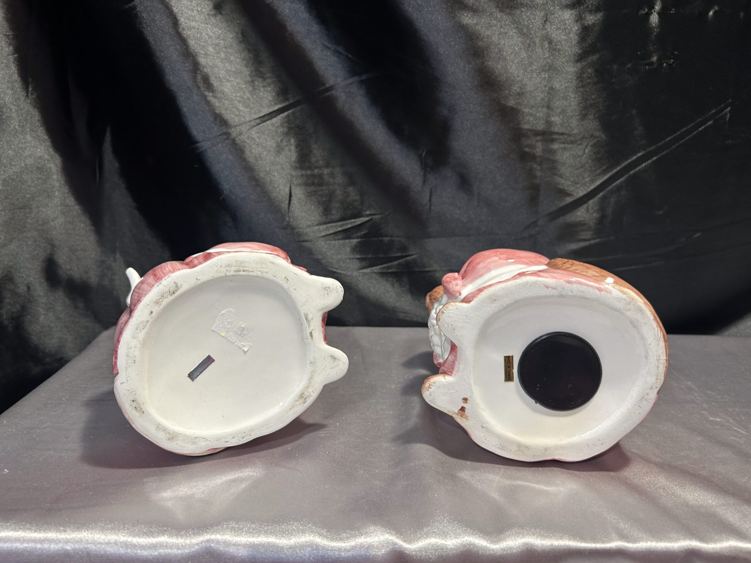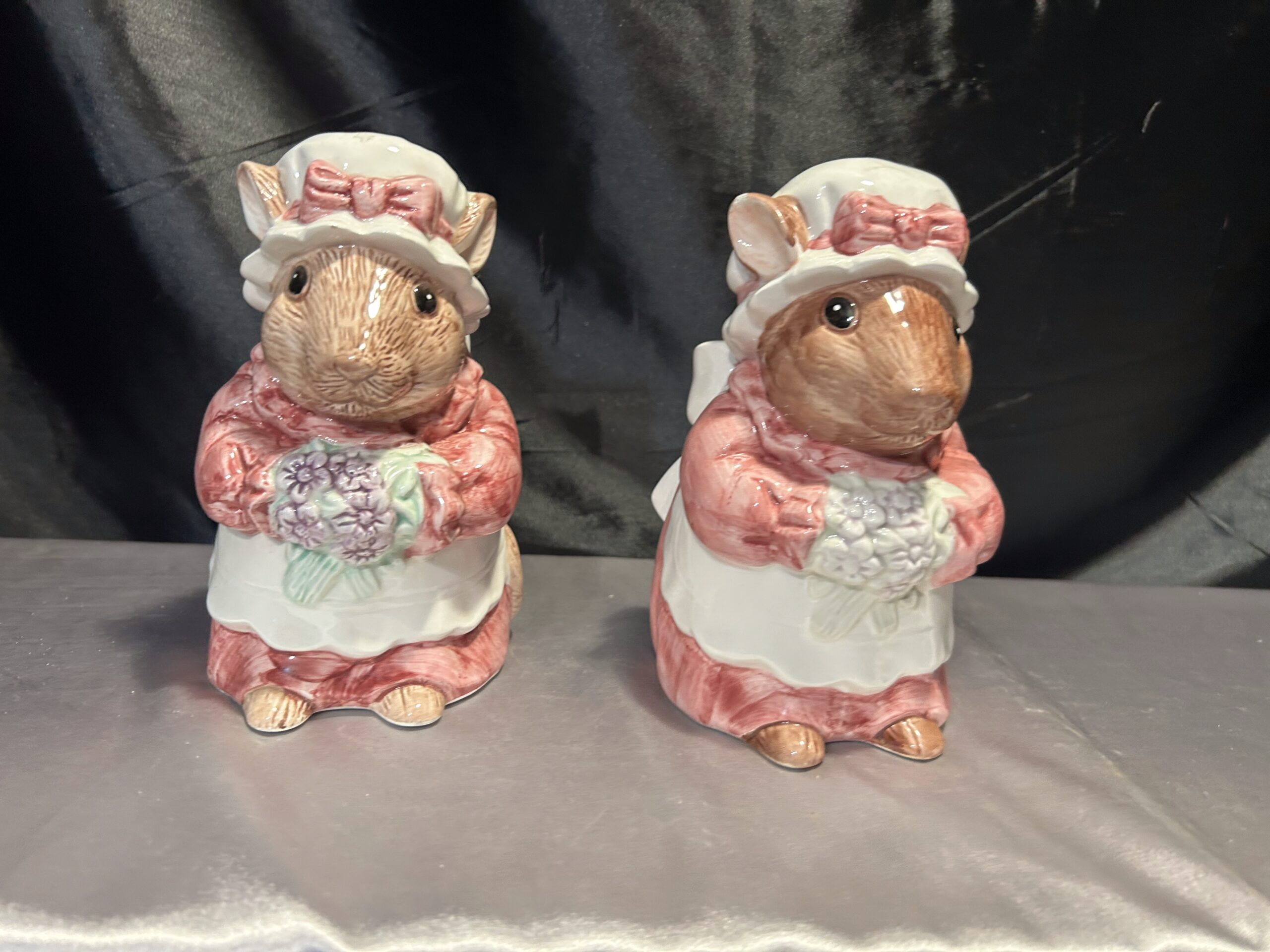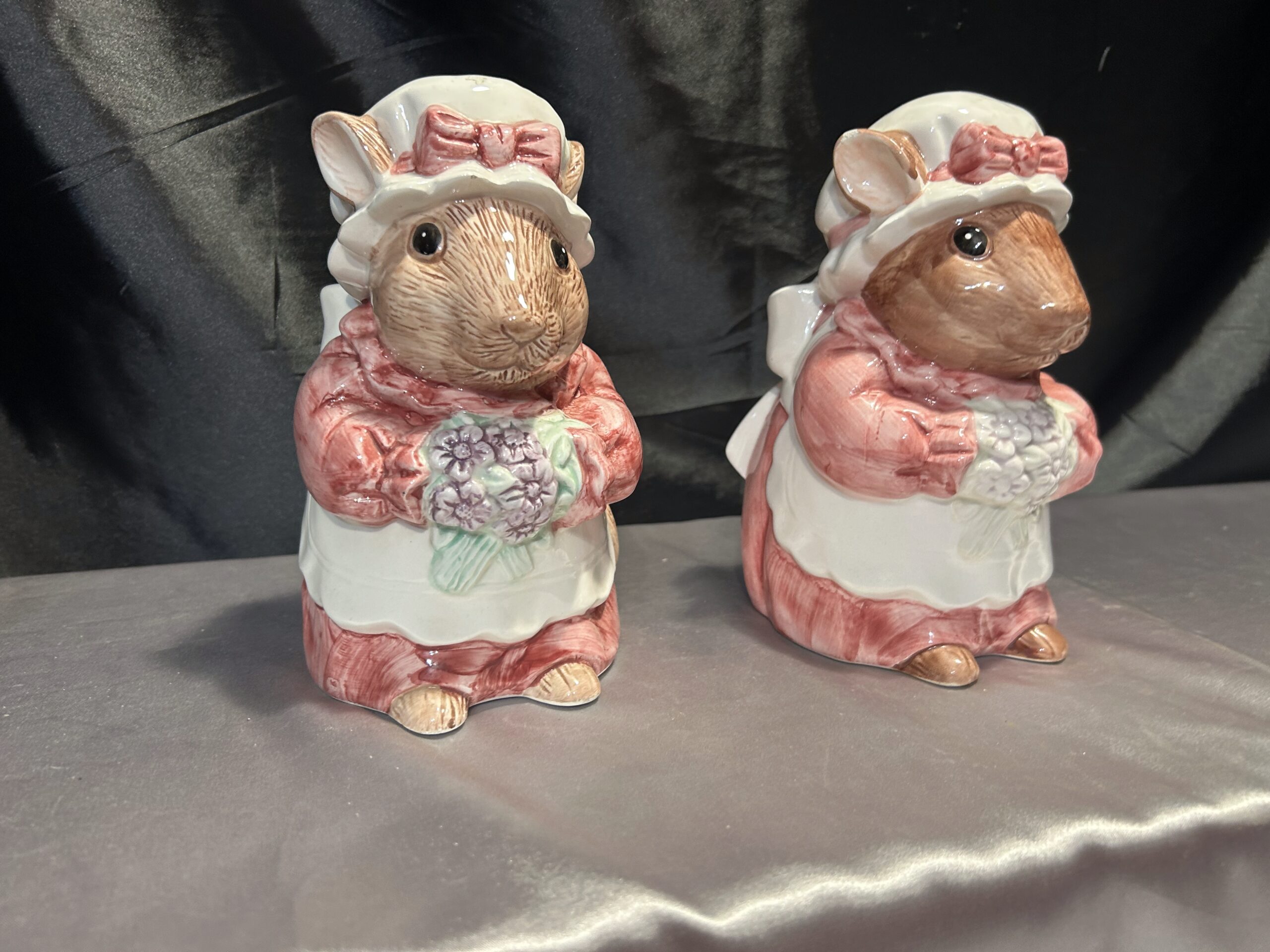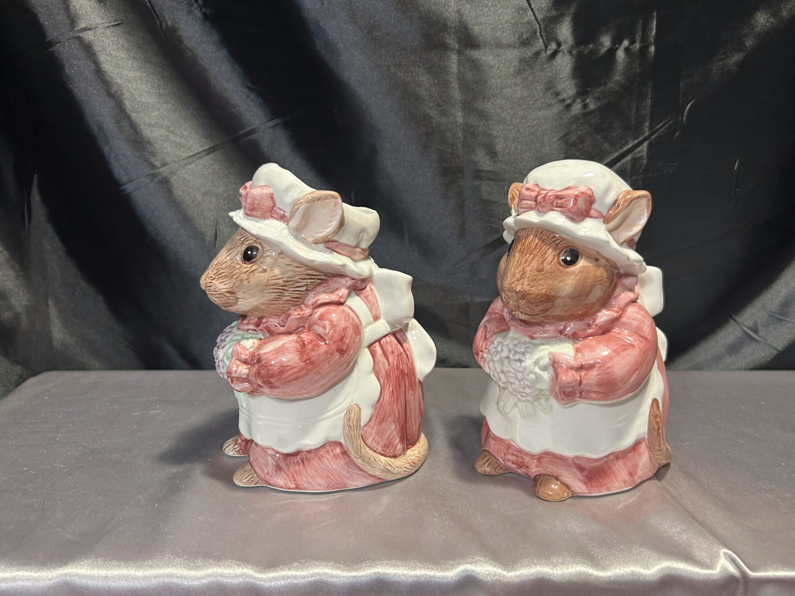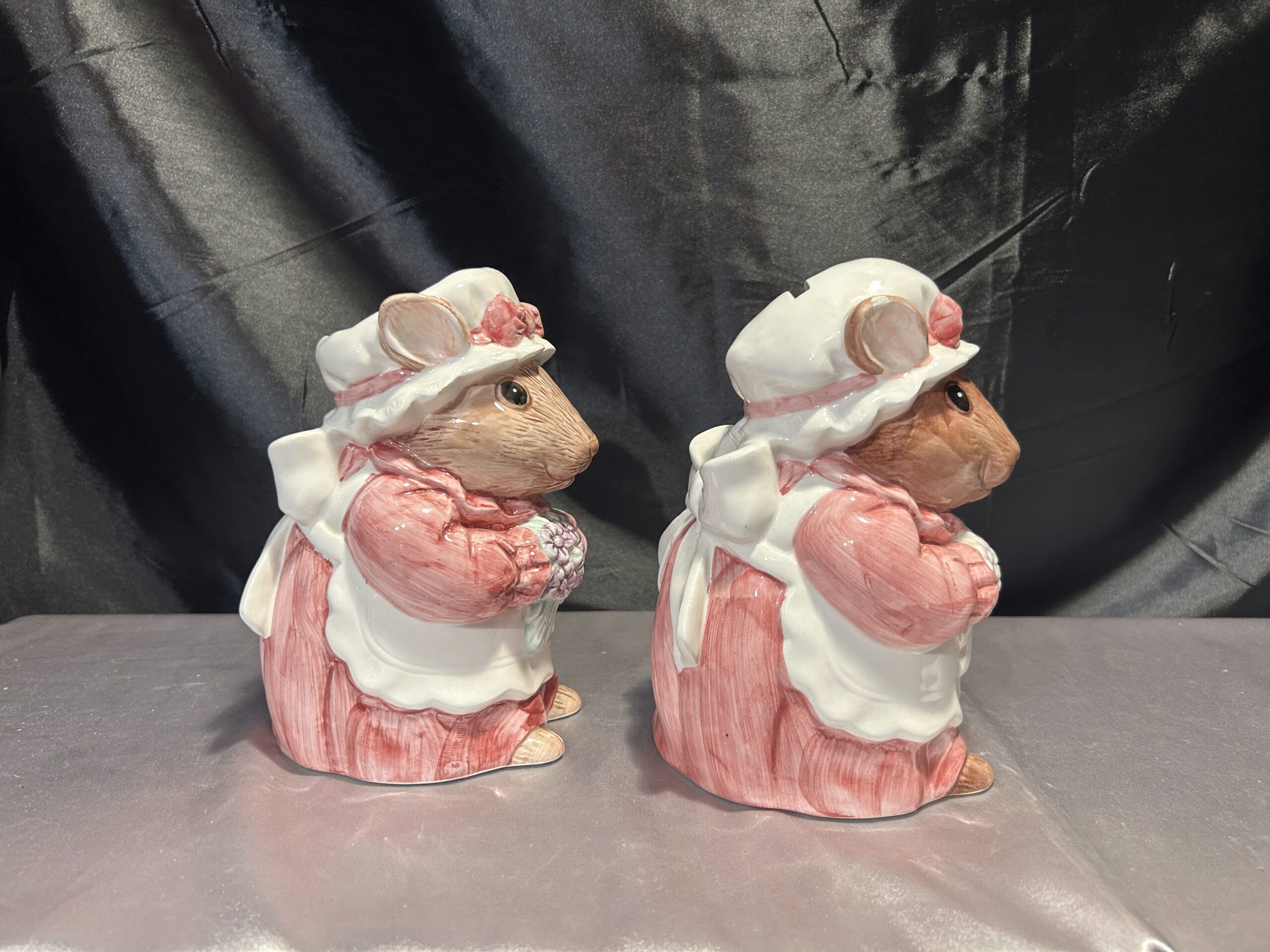 Uroczy zestaw dwóch ceramicznych myszek, które zachwycą każdego miłośnika niebanalnych dekoracji. Myszki wyglądają jak gosposie w różowych sukienkach, trzymają bukiety fioletowych kwiatów w łapkach, a ich białe fartuszki i czepki z kokardkami dodają im niezwykłego uroku. Jedna z figurek pełni funkcję skarbonki, a druga jest eleganckim flakonem na kwiaty. Wyprodukowano na Tajwanie.