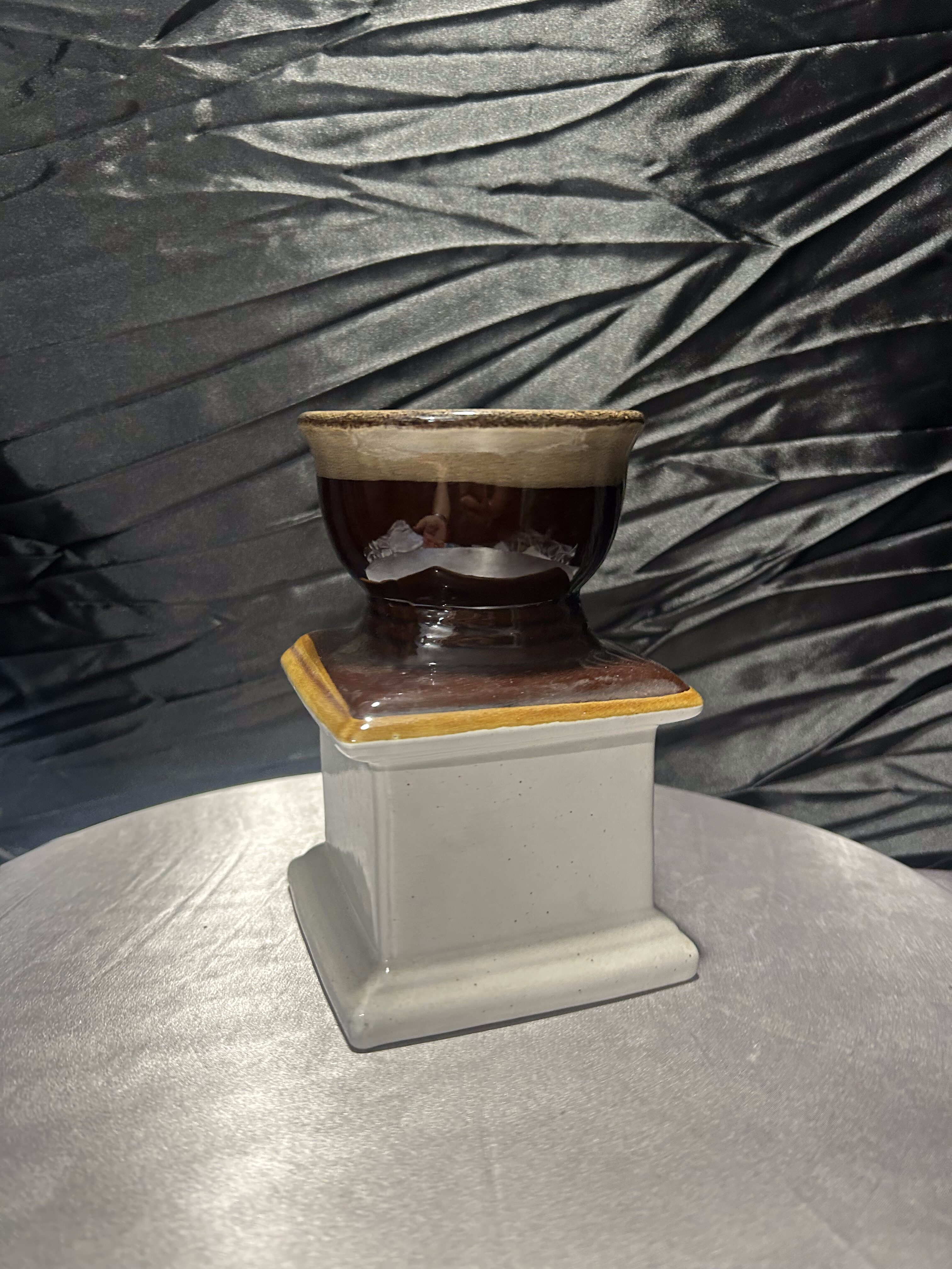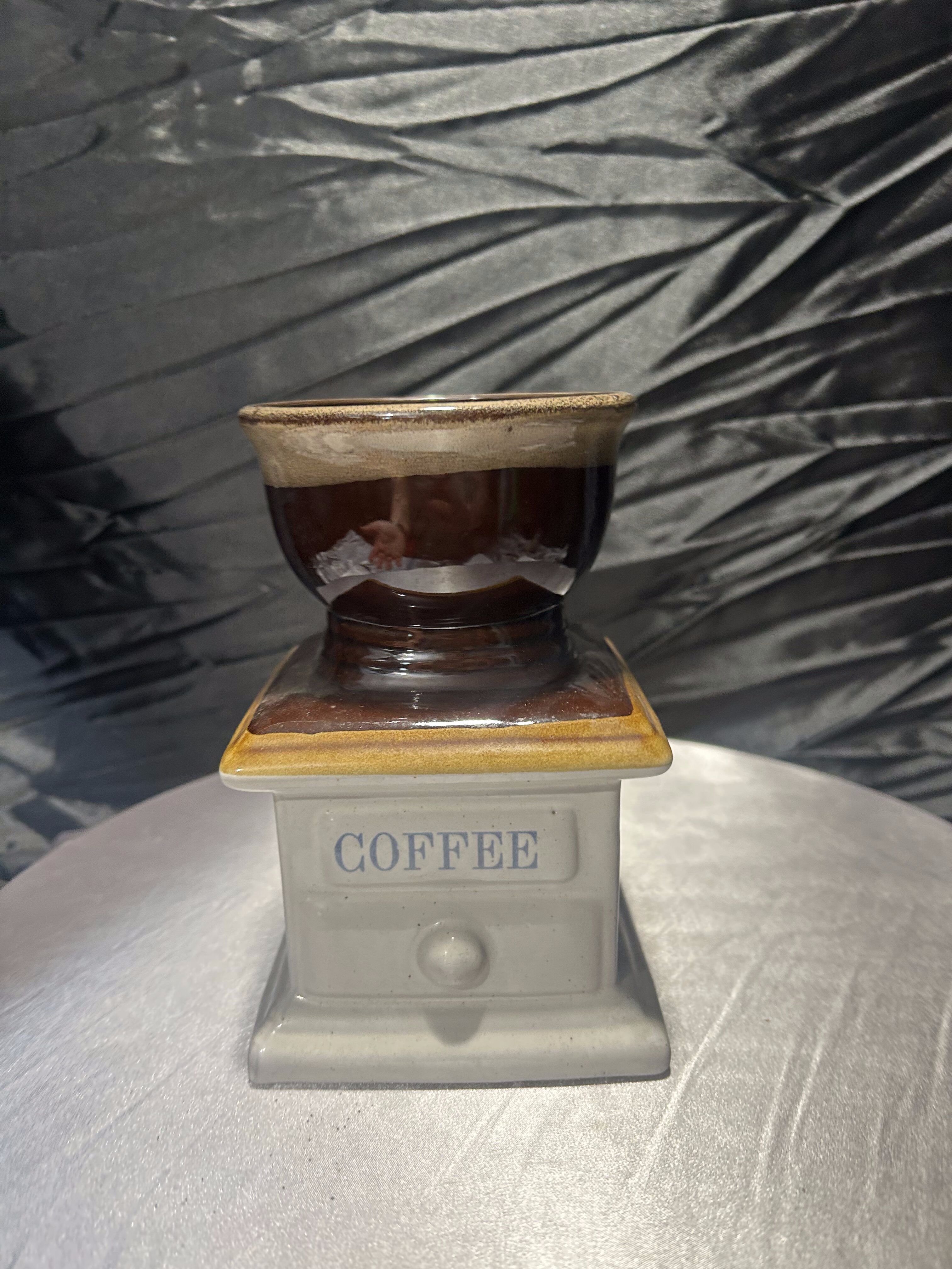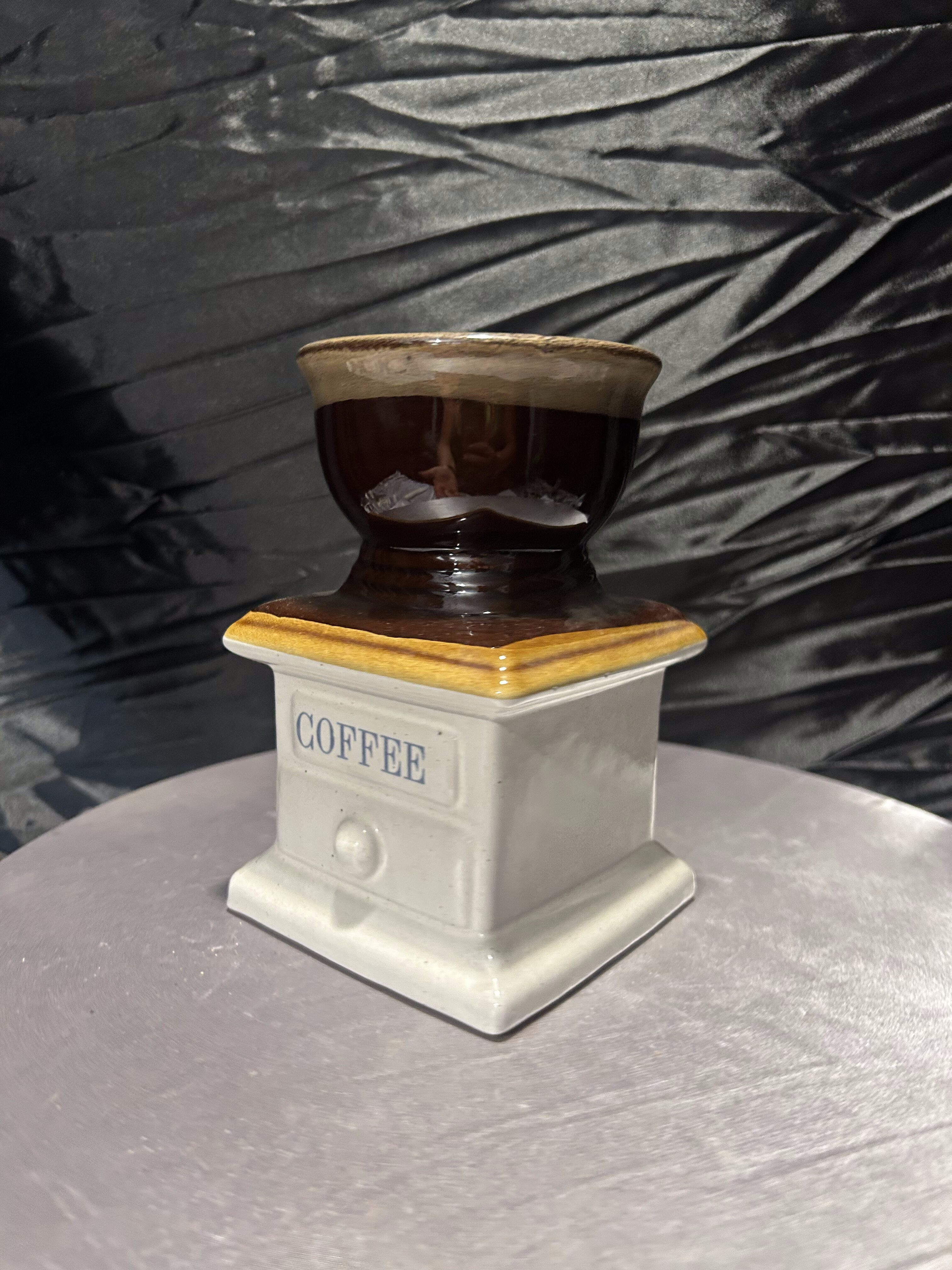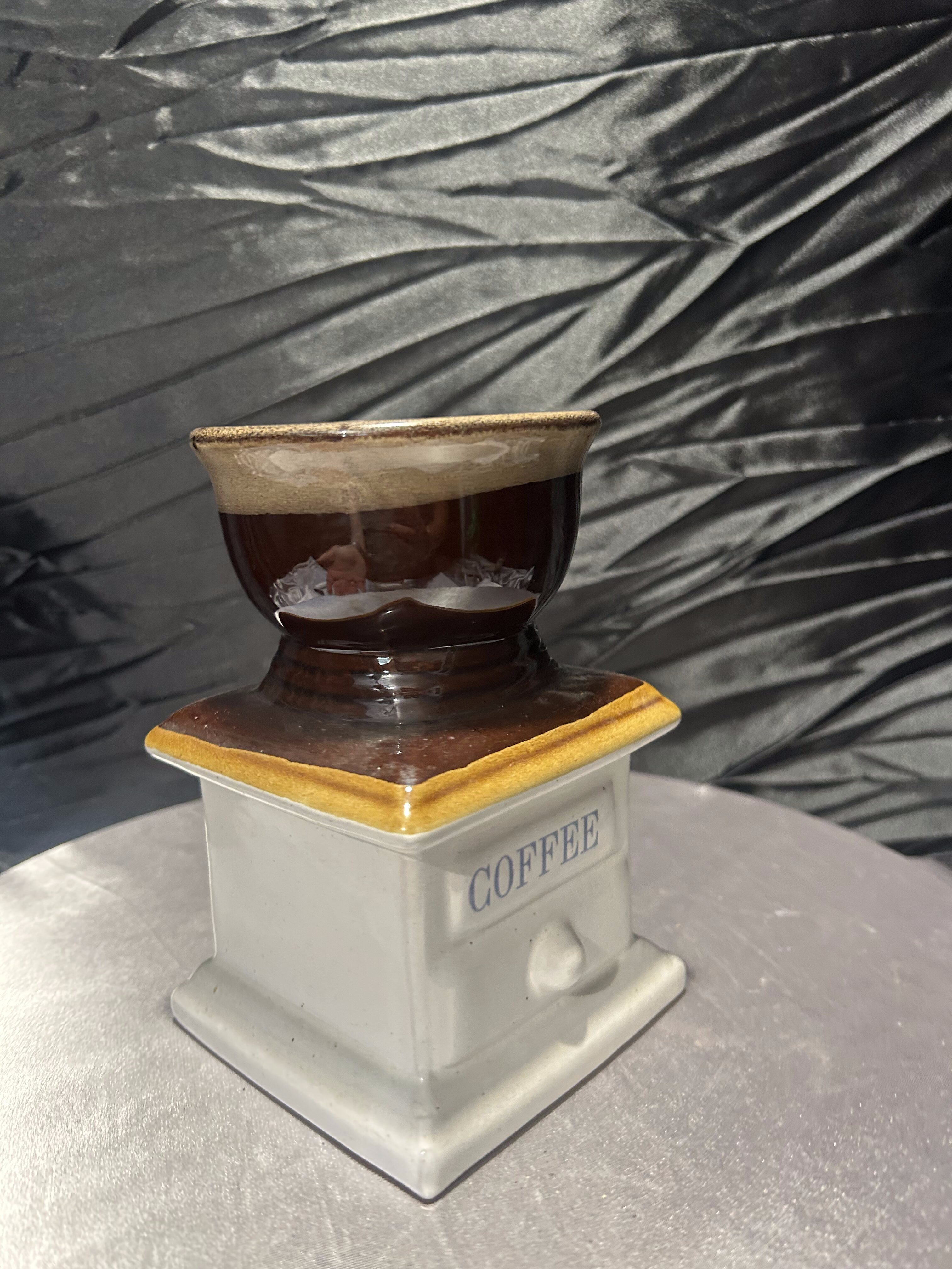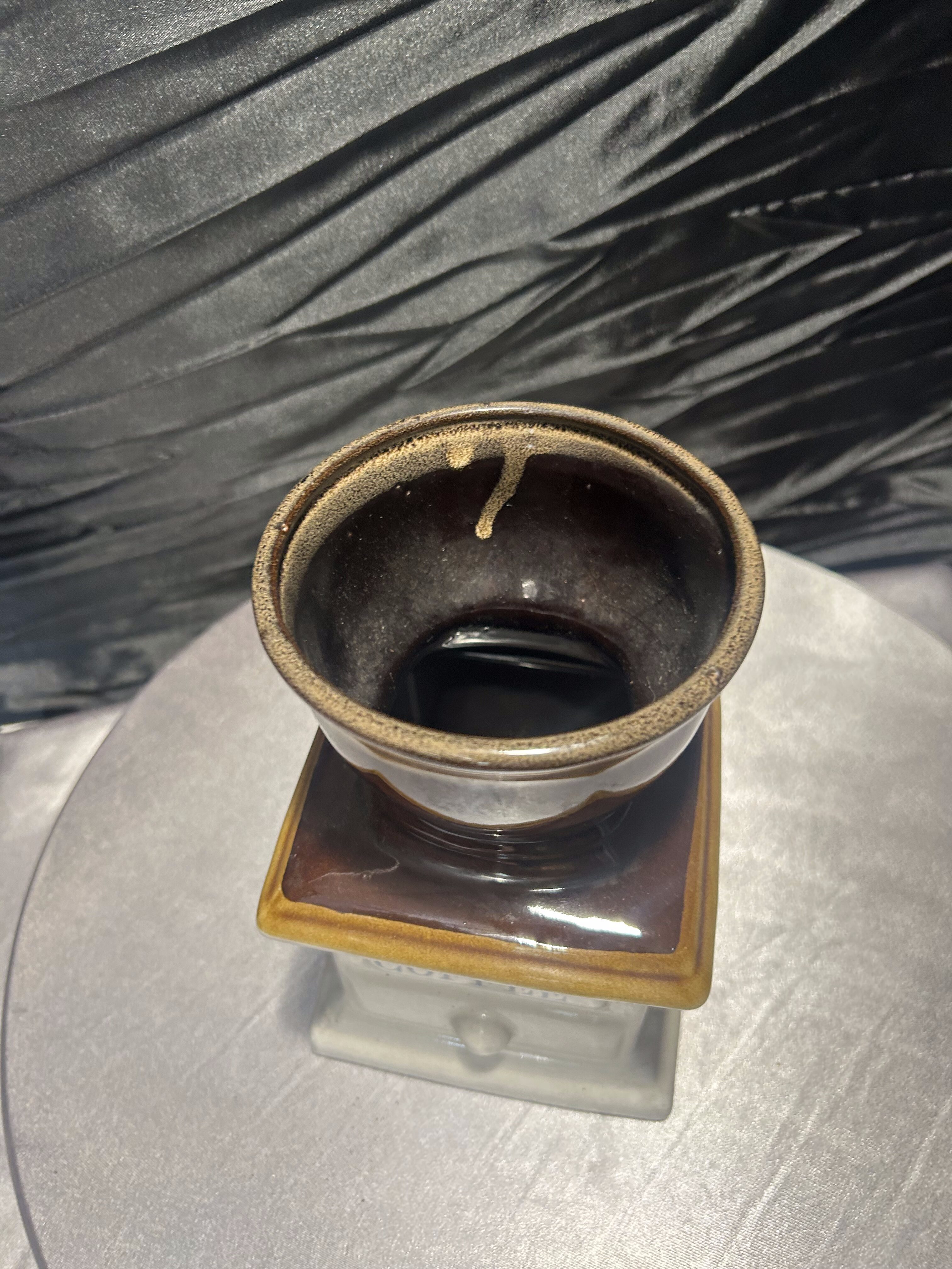 Oryginalny flakon lub wazon o niebanalnej formie, przypominającej klasyczny młynek do kawy. Wykonany z ceramiki szkliwionej w odcieniach brązu, beżu i kremu, z napisem „COFFEE” na froncie. Górna część przypomina filiżankę lub naczynie na kwiaty, co sprawia, że przedmiot łączy funkcję dekoracyjną z użytkową. Doskonale sprawdzi się jako wazon na suszki, flakon na kuchenne zioła lub po prostu jako stylowy dodatek do wnętrza z nutą retro i humoru.