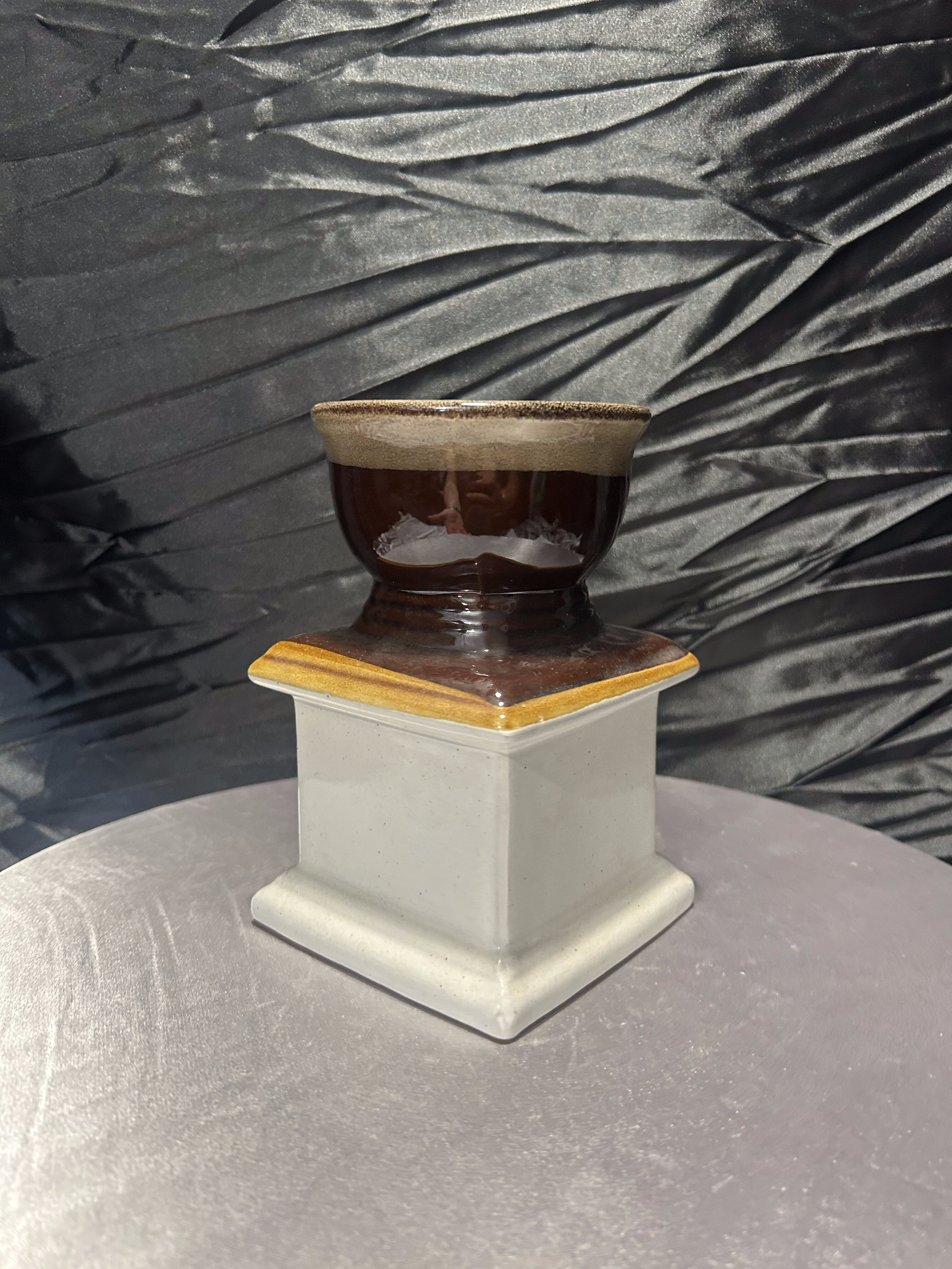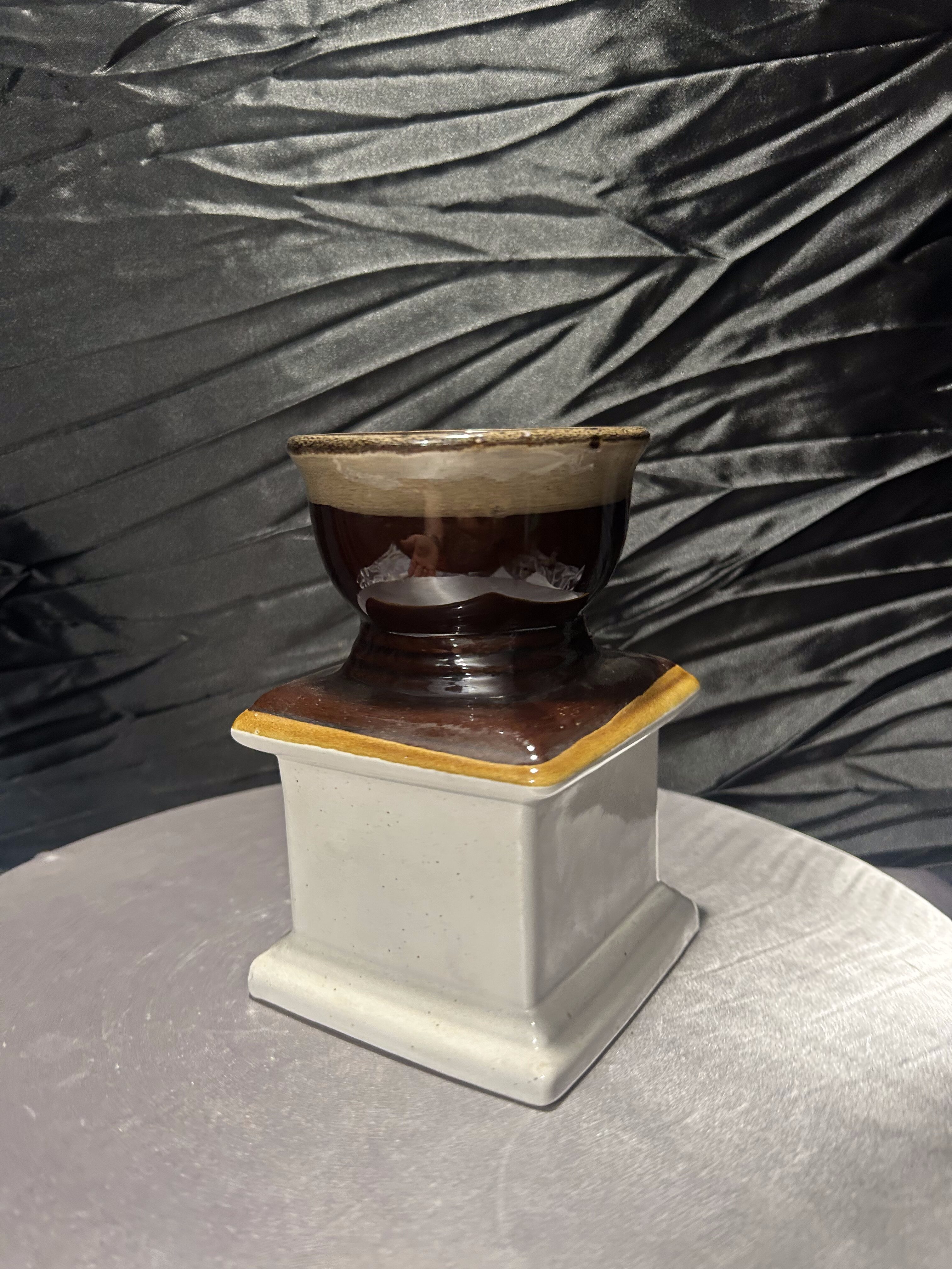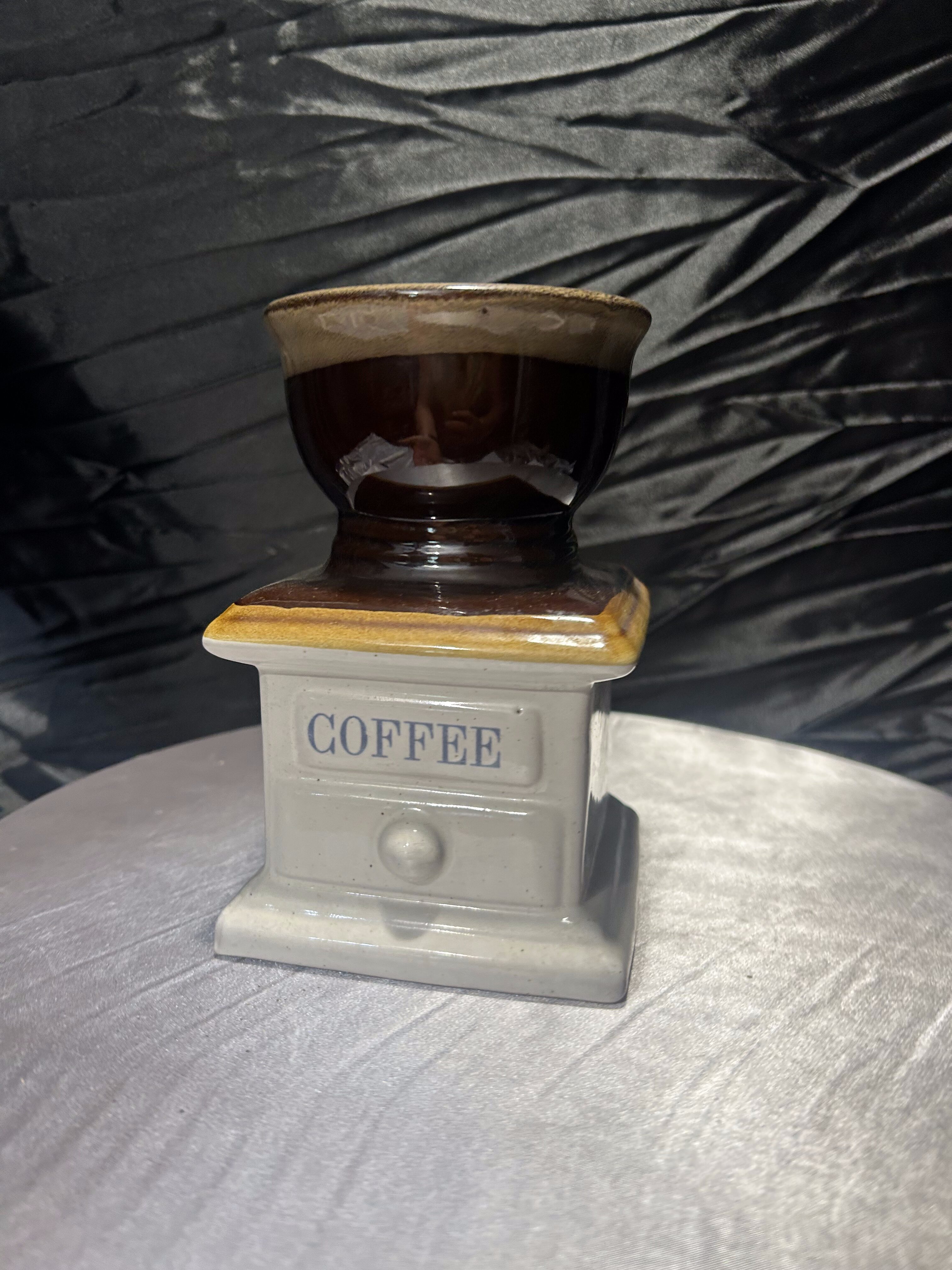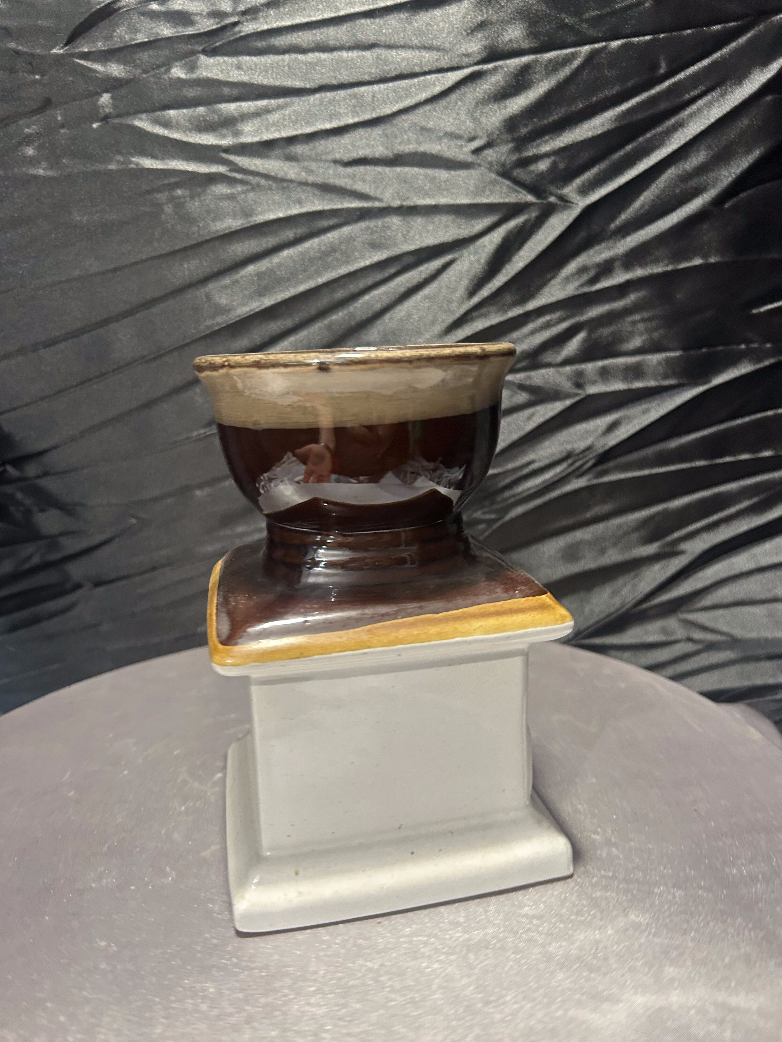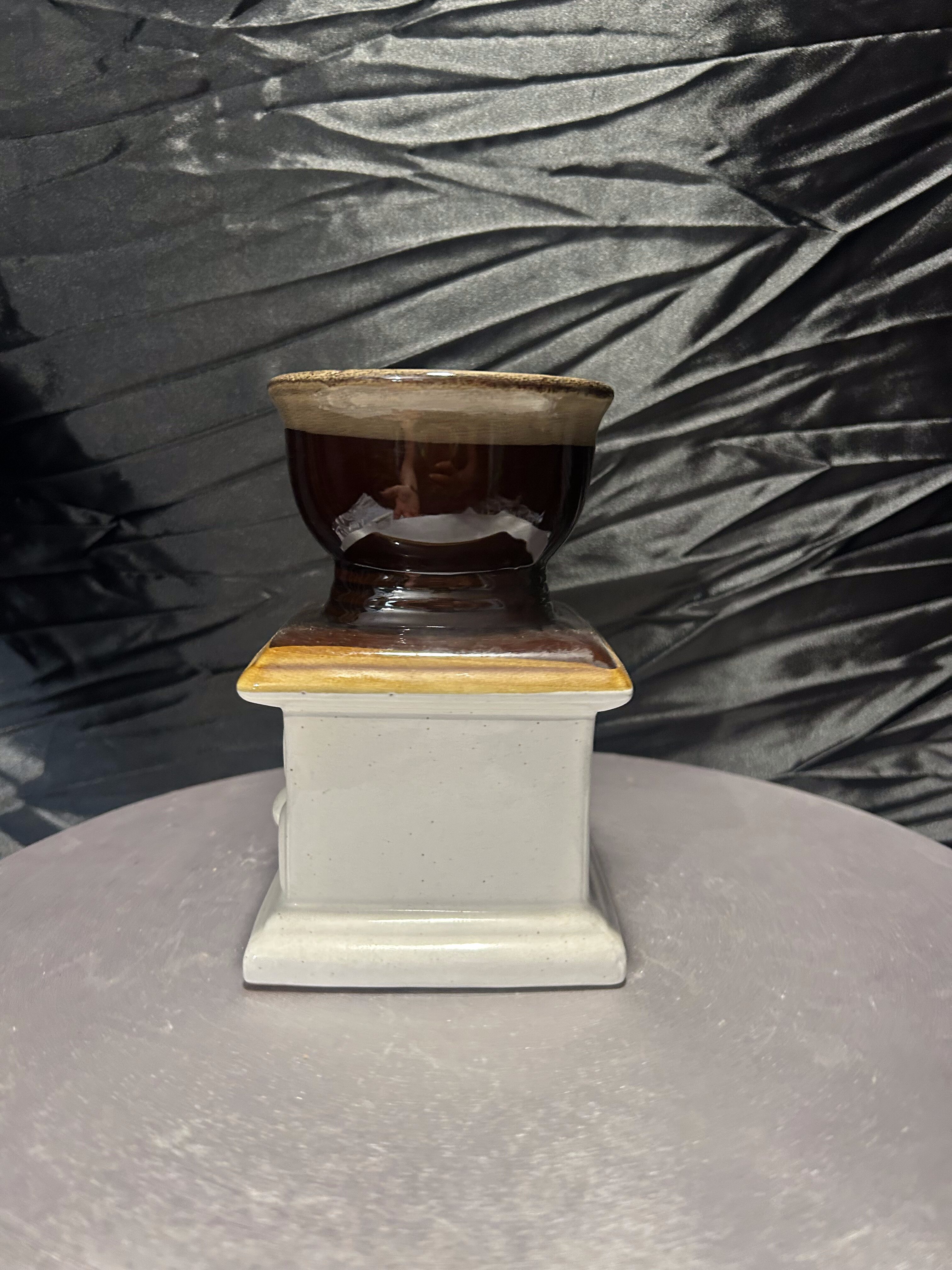 Oryginalny flakon lub wazon o niebanalnej formie, przypominającej klasyczny młynek do kawy. Wykonany z ceramiki szkliwionej w odcieniach brązu, beżu i kremu, z napisem „COFFEE” na froncie. Górna część przypomina filiżankę lub naczynie na kwiaty, co sprawia, że przedmiot łączy funkcję dekoracyjną z użytkową. Doskonale sprawdzi się jako wazon na suszki, flakon na kuchenne zioła lub po prostu jako stylowy dodatek do wnętrza z nutą retro i humoru.